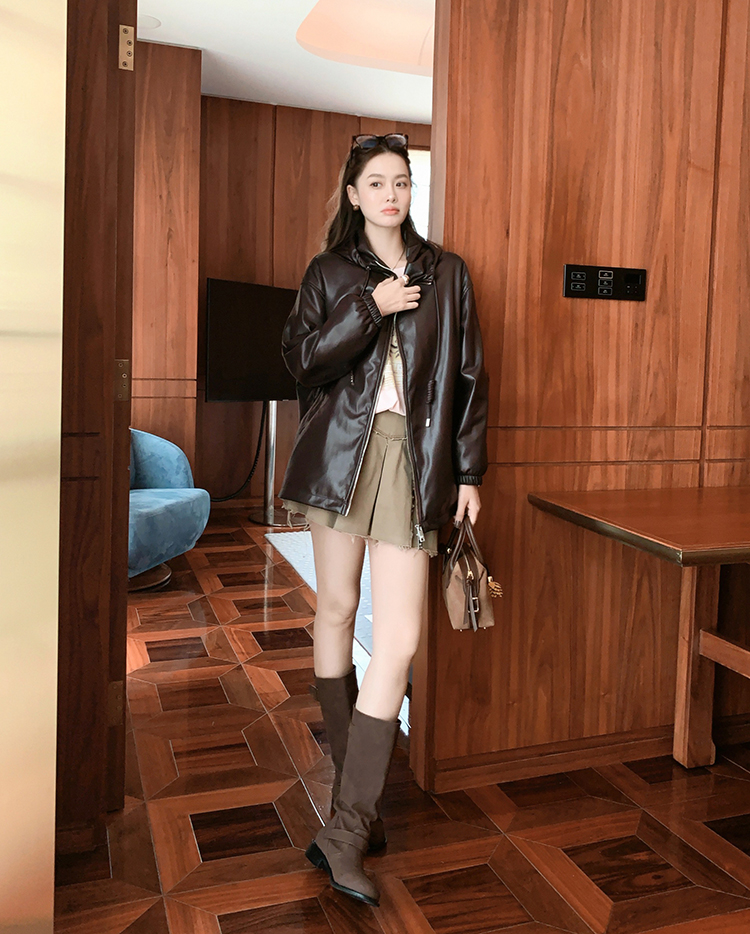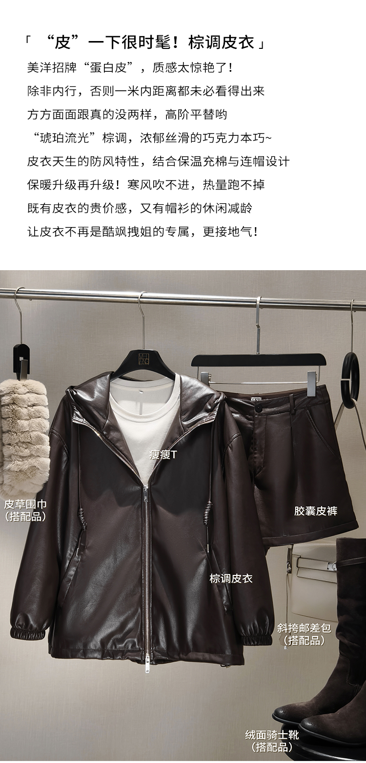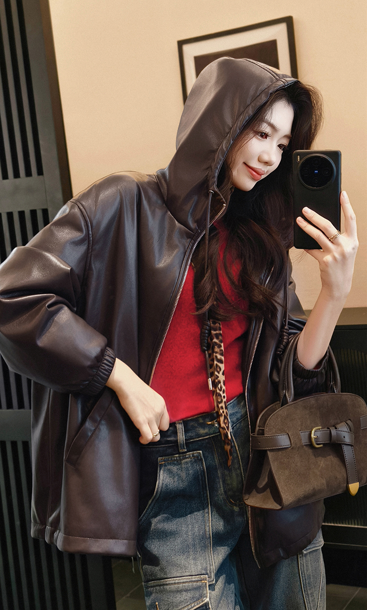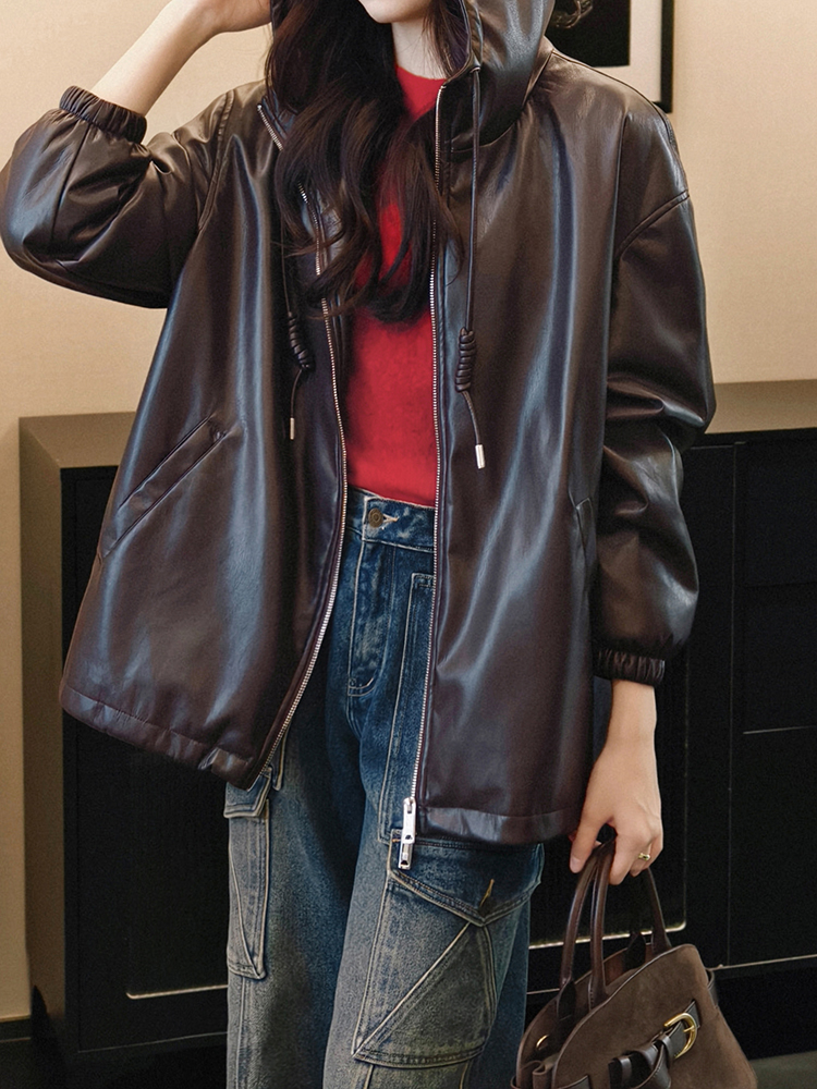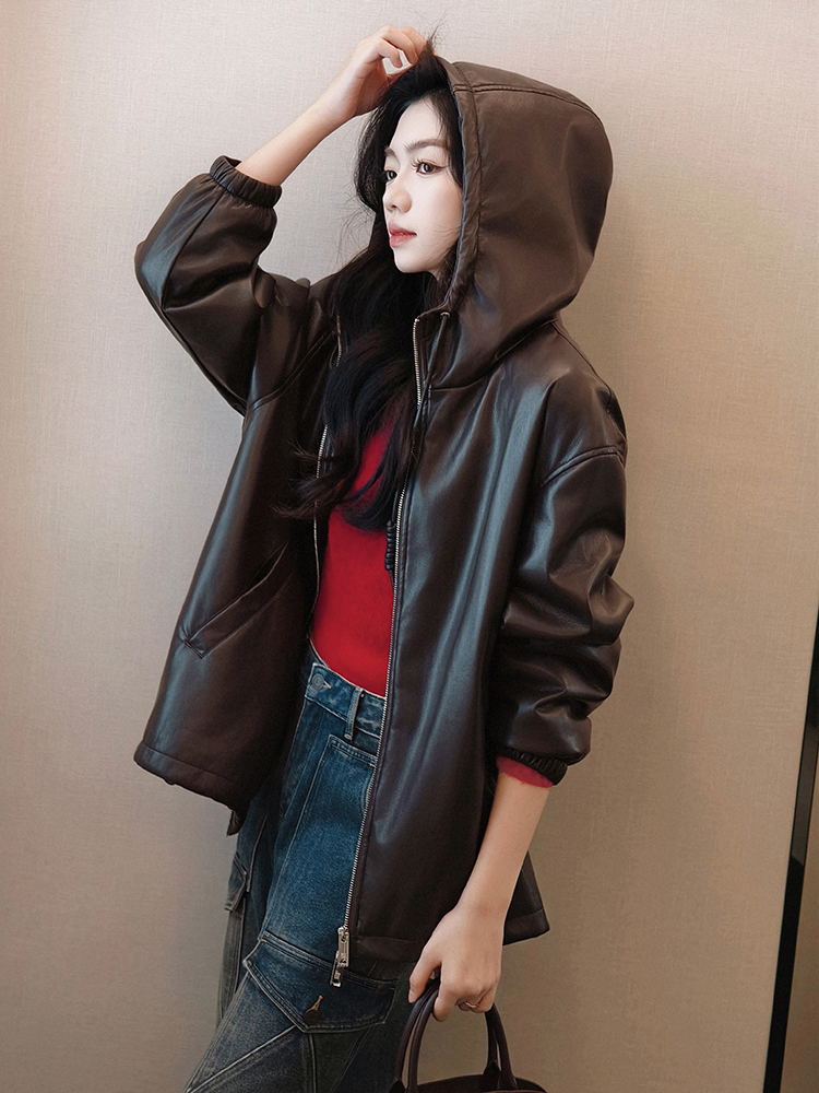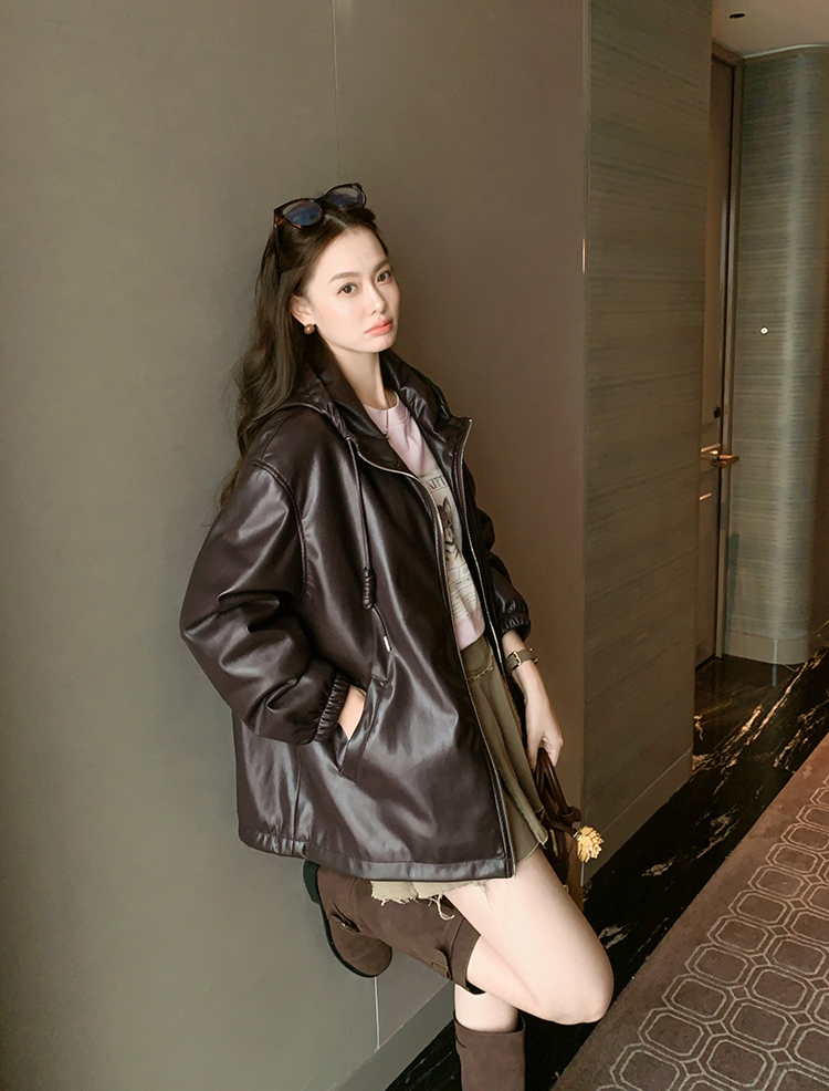 Meiyang Brown Leather Jacket Amber Flow~ Protein Leather Quilted Cotton Warm Hooded Jacket [Wide]