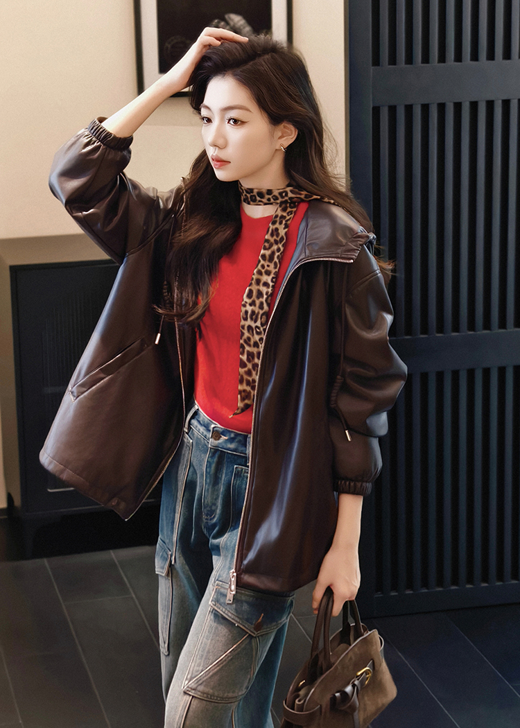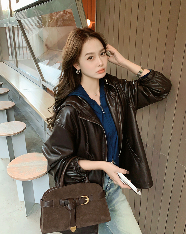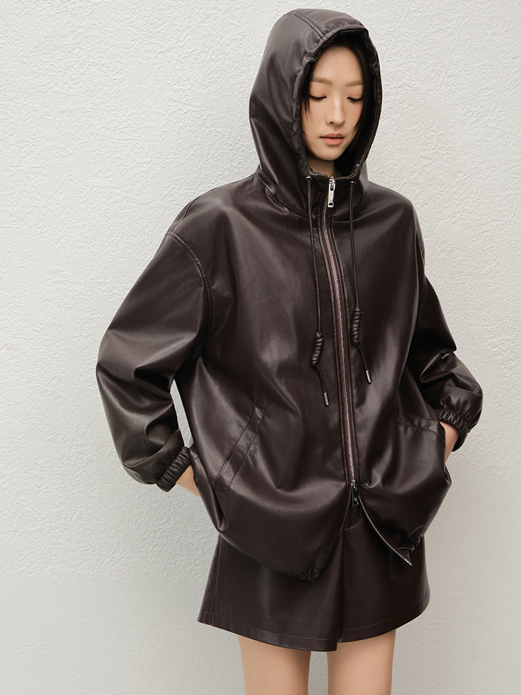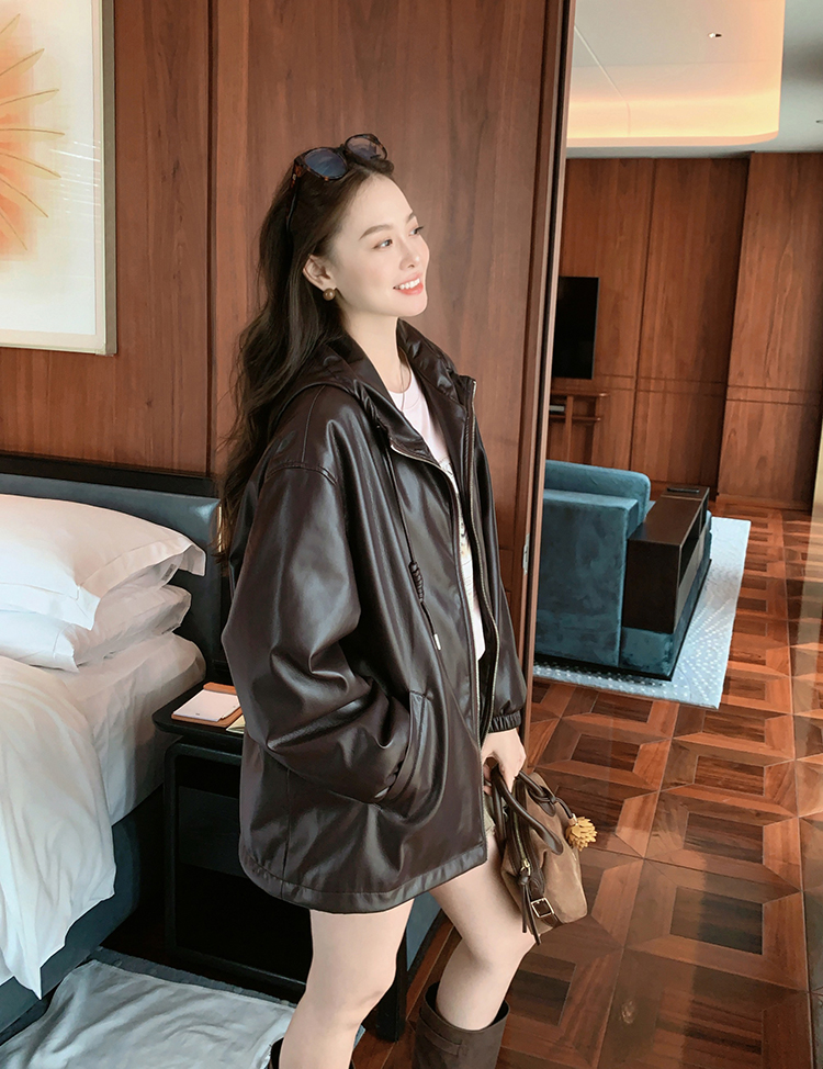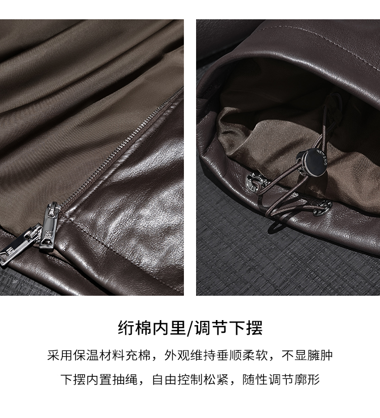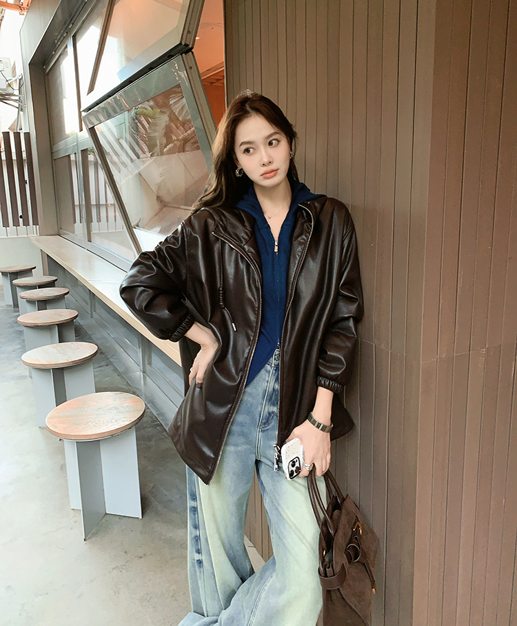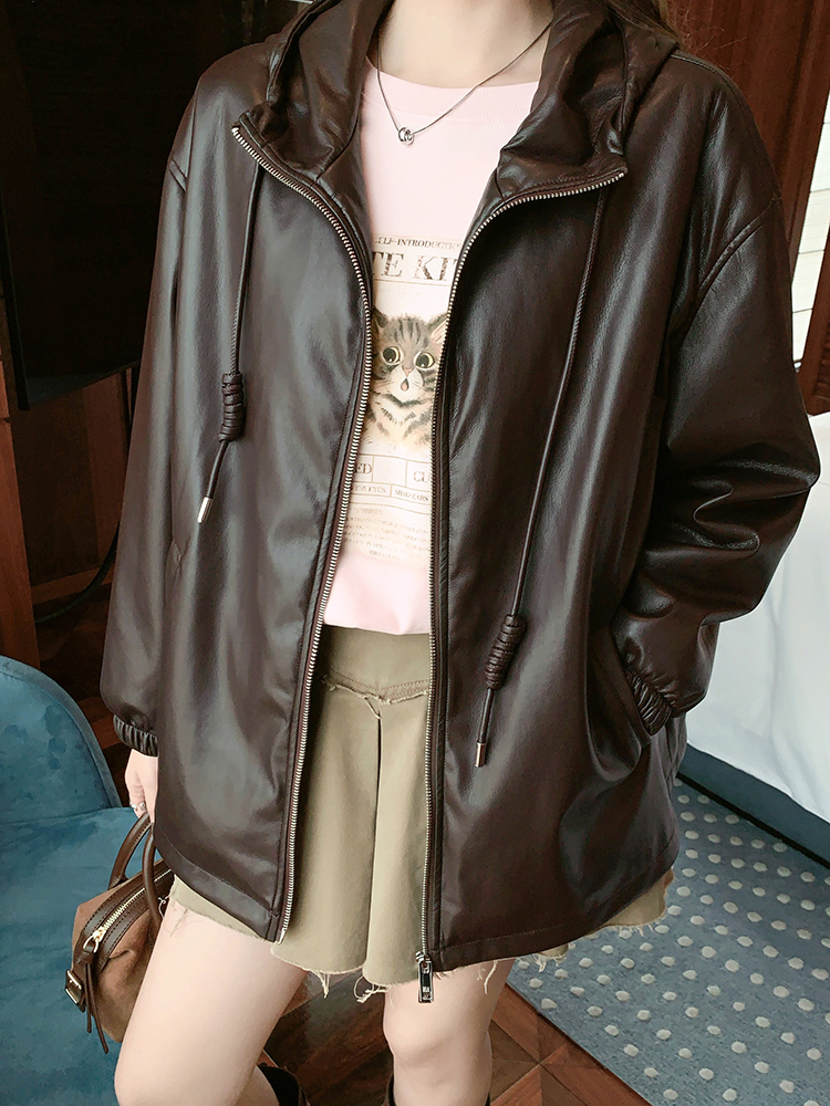 Meiyang Brown Leather Jacket Amber Flow~ Protein Leather Quilted Cotton Warm Hooded Jacket [Wide]