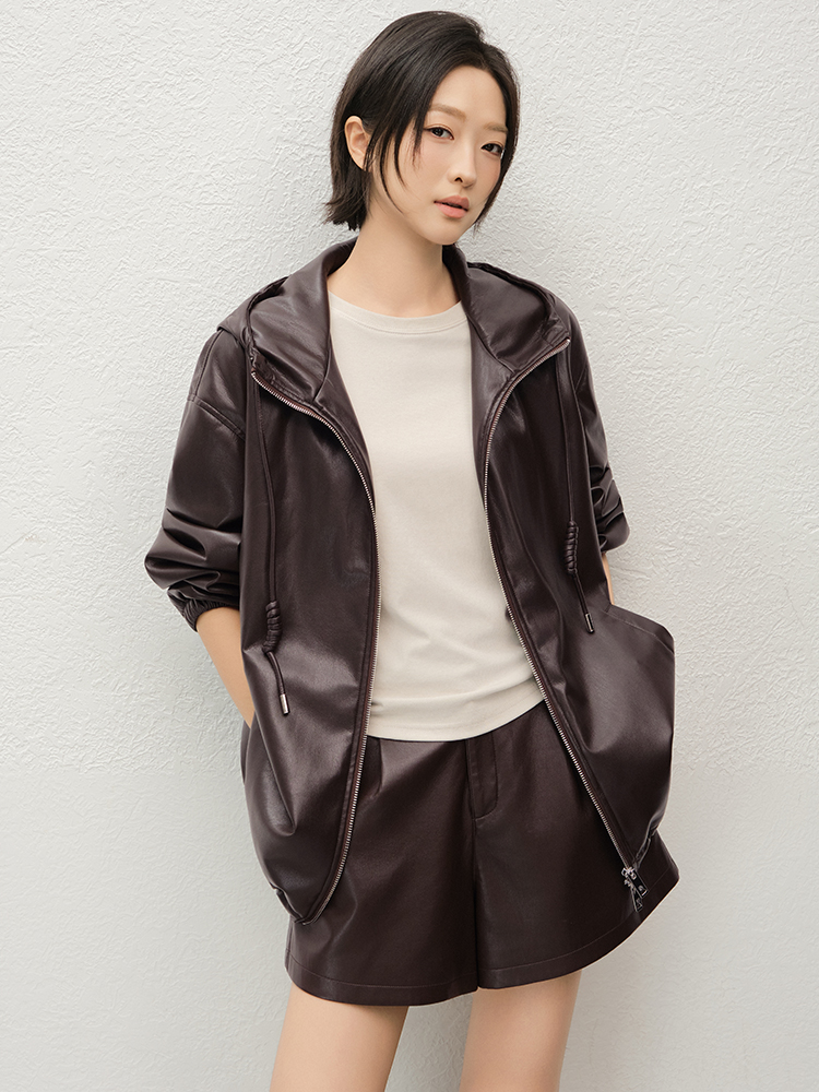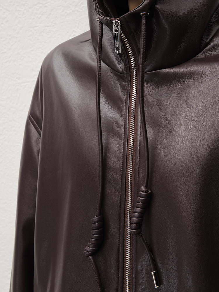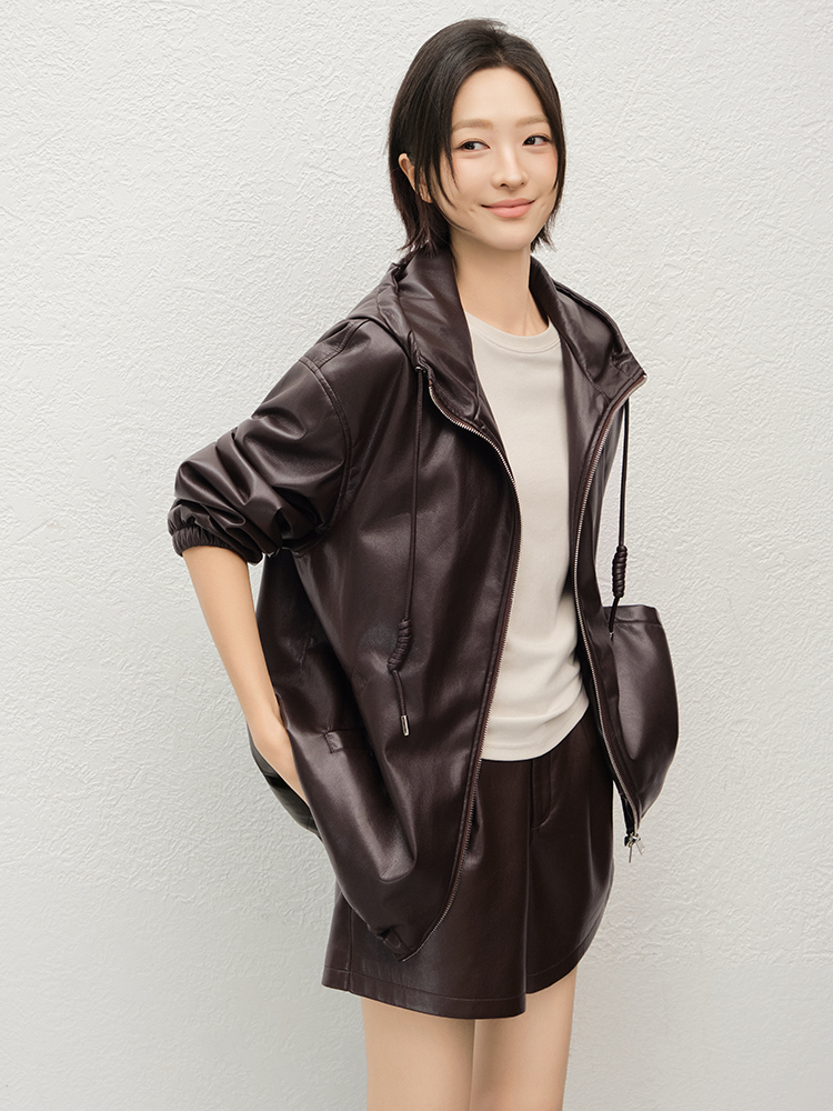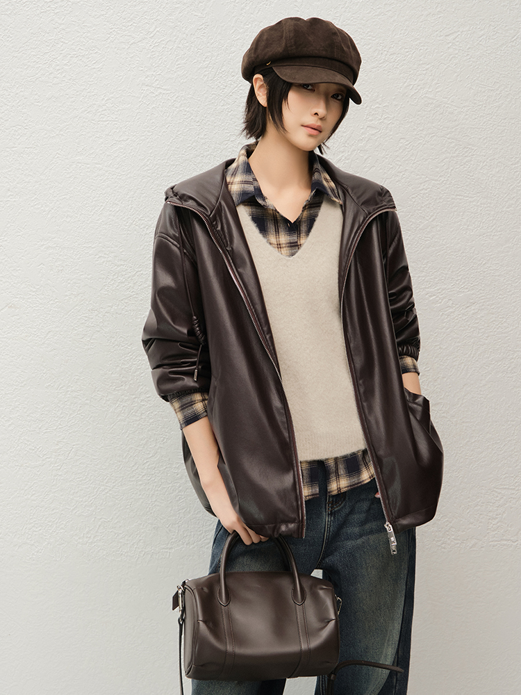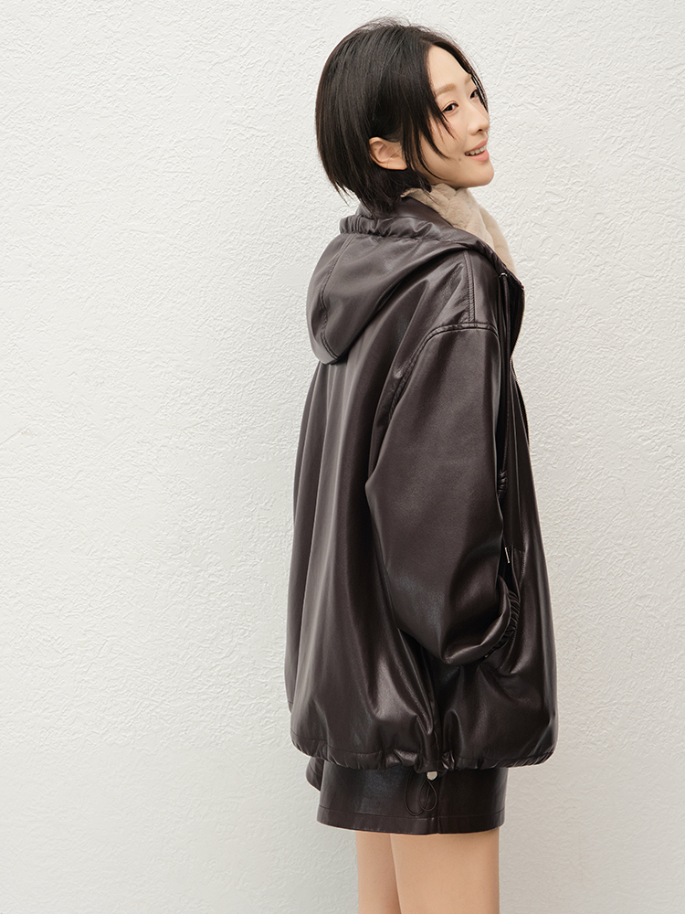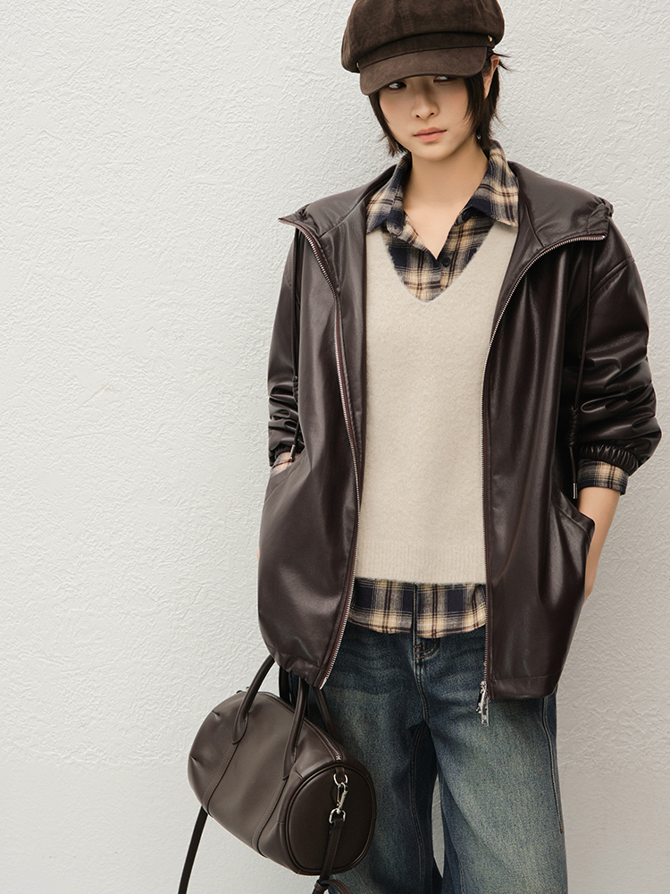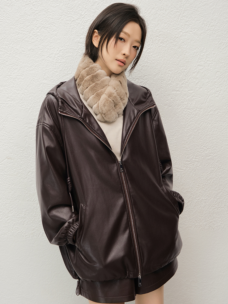 Meiyang Brown Leather Jacket Amber Flow~ Protein Leather Quilted Cotton Warm Hooded Jacket [Wide]