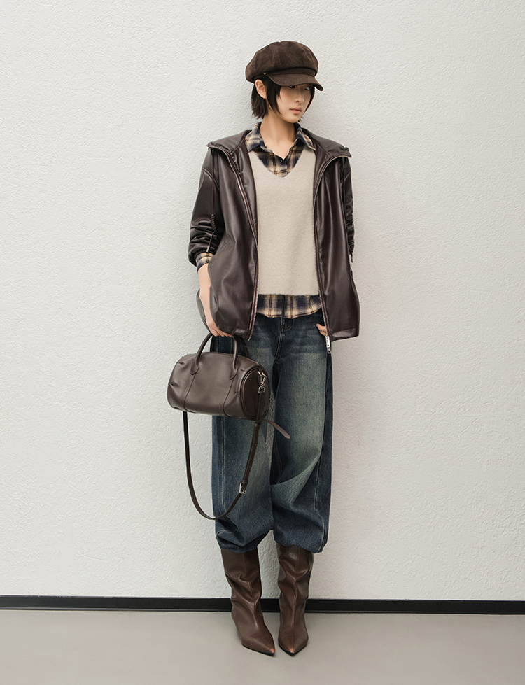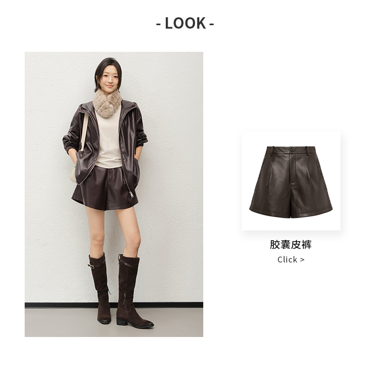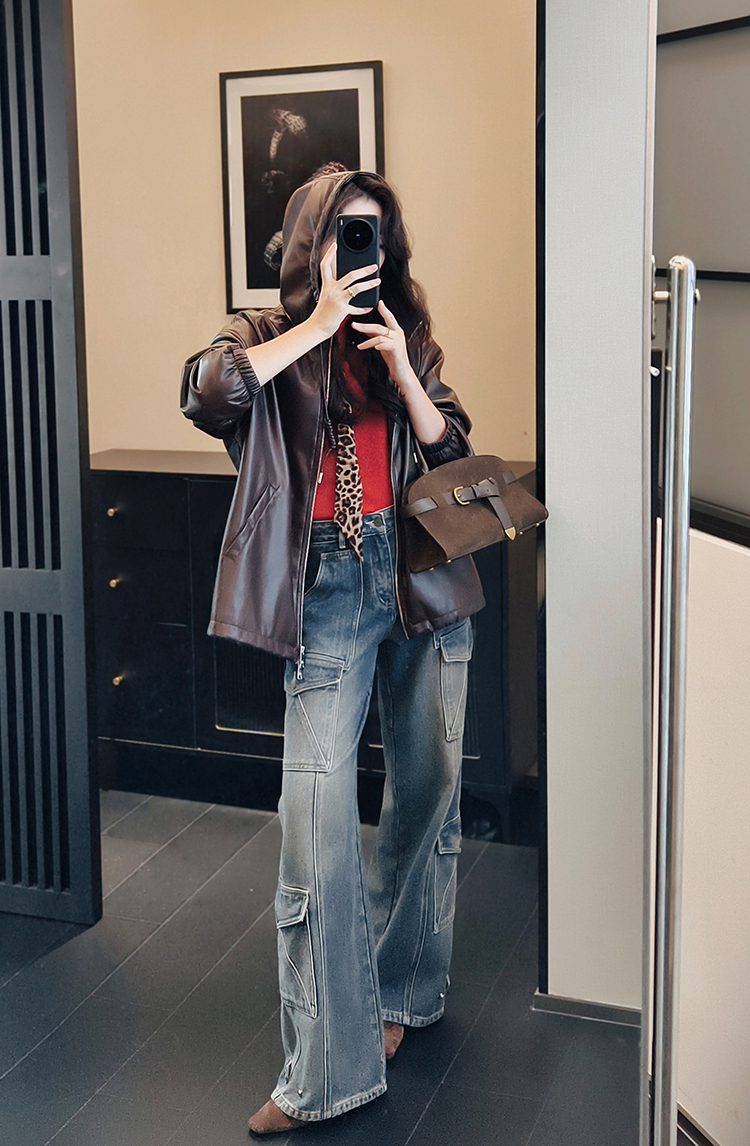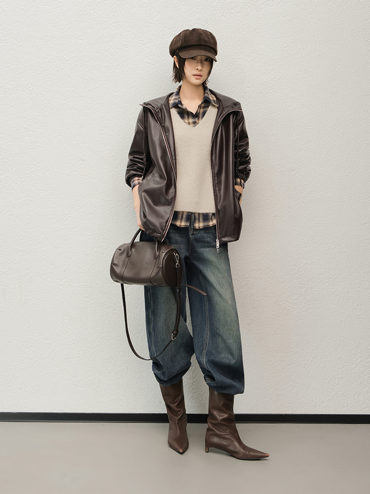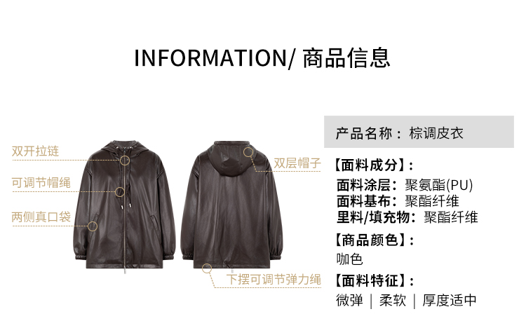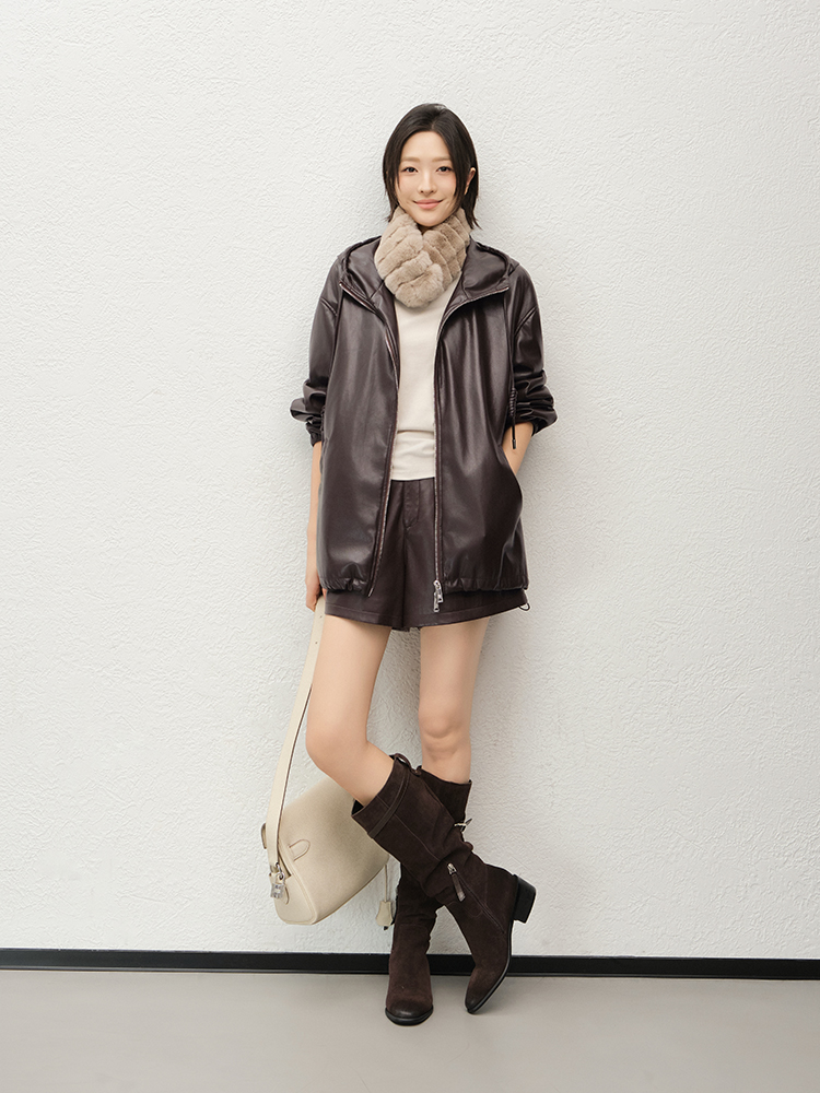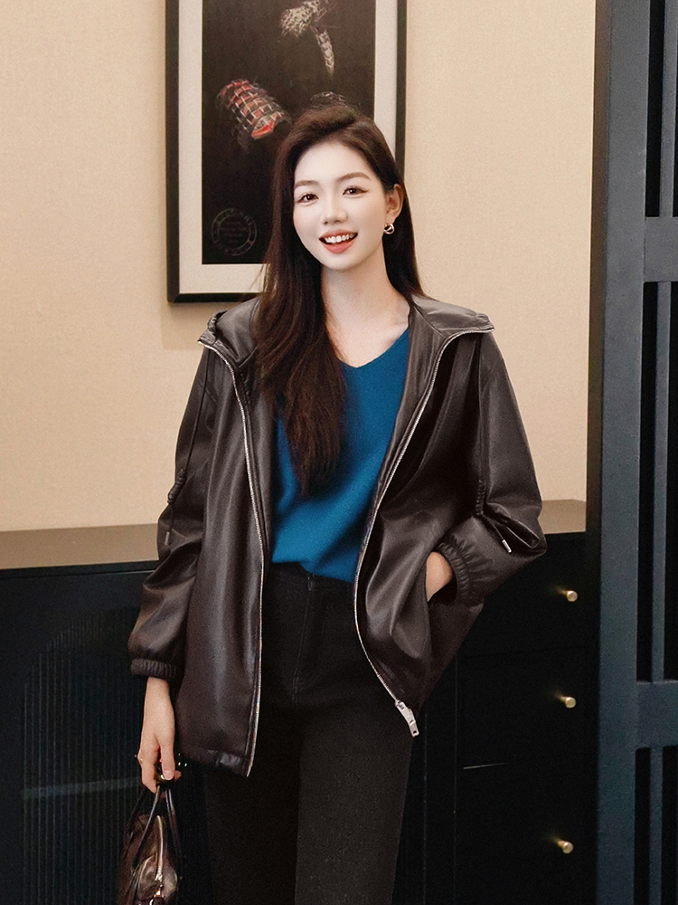 Meiyang Brown Leather Jacket Amber Flow~ Protein Leather Quilted Cotton Warm Hooded Jacket [Wide]