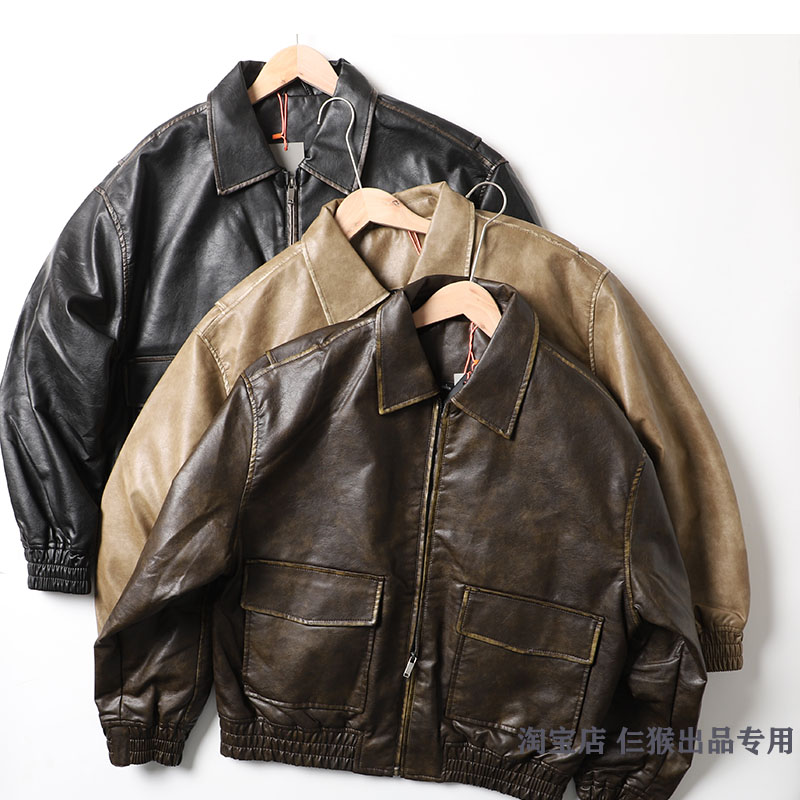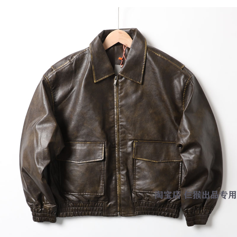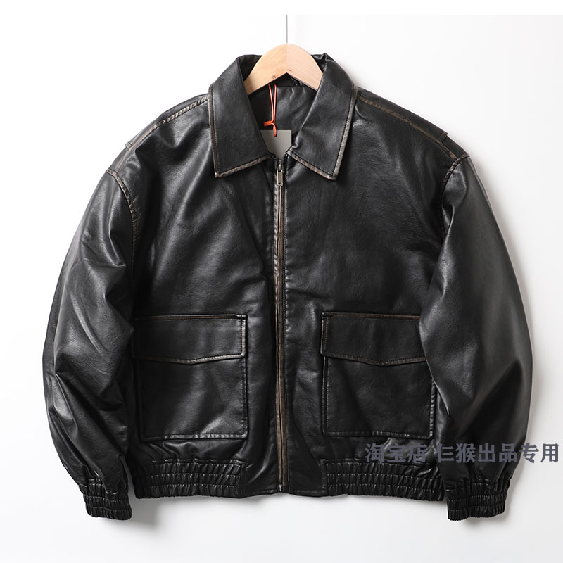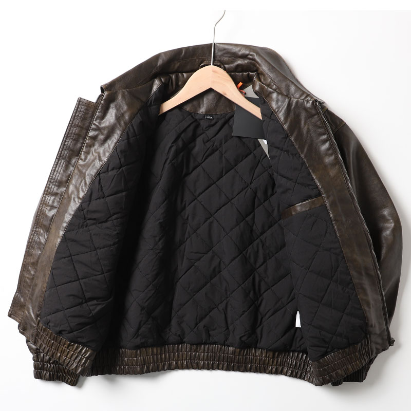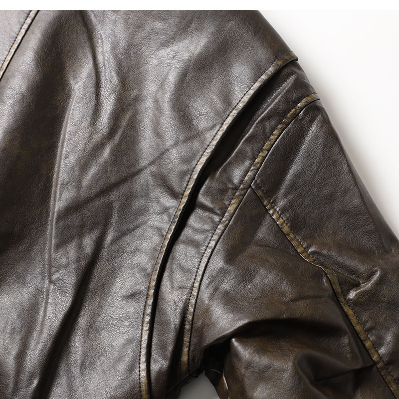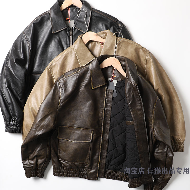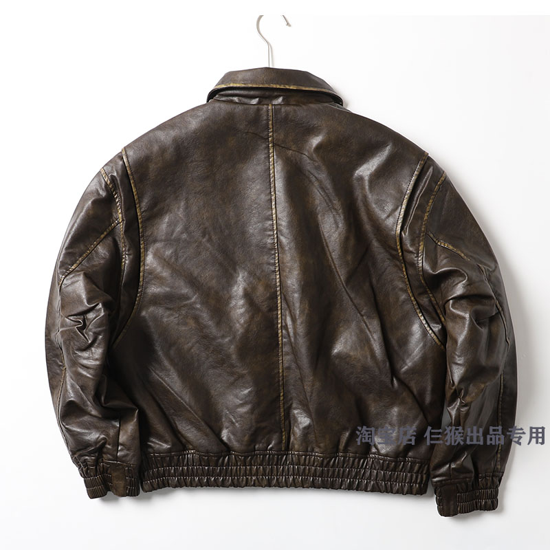 American-Style Vintage Washed Distressed Pu Leather Padded Warm Leather Jacket for Men, Loose Biker Jacket, Trendy Leather Jacket