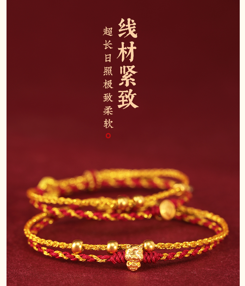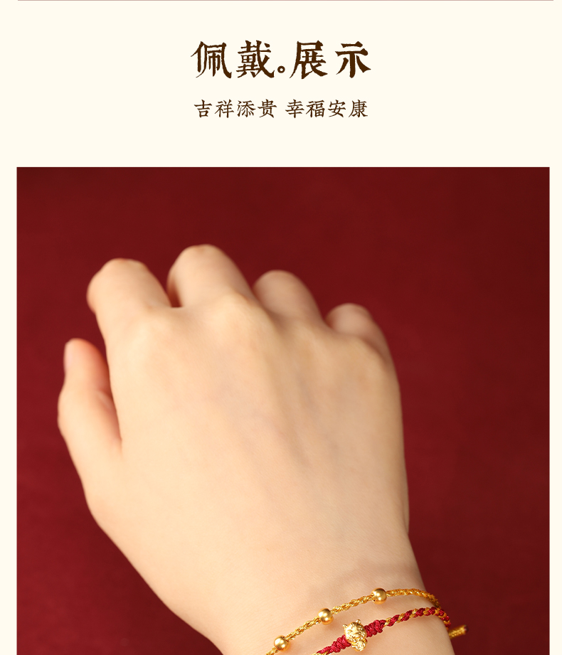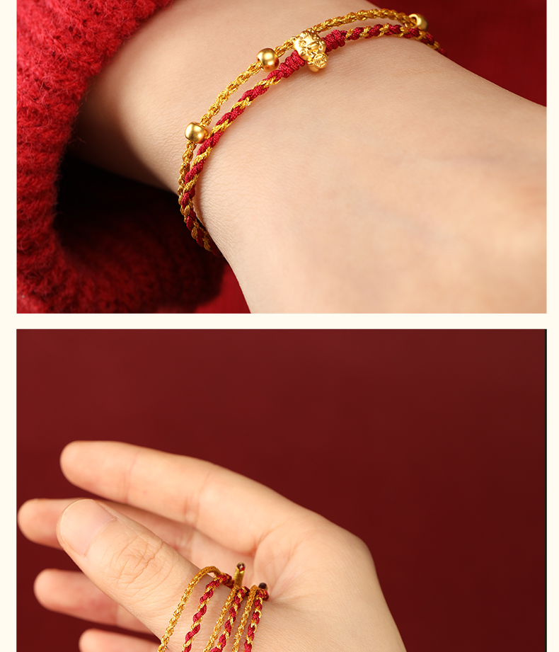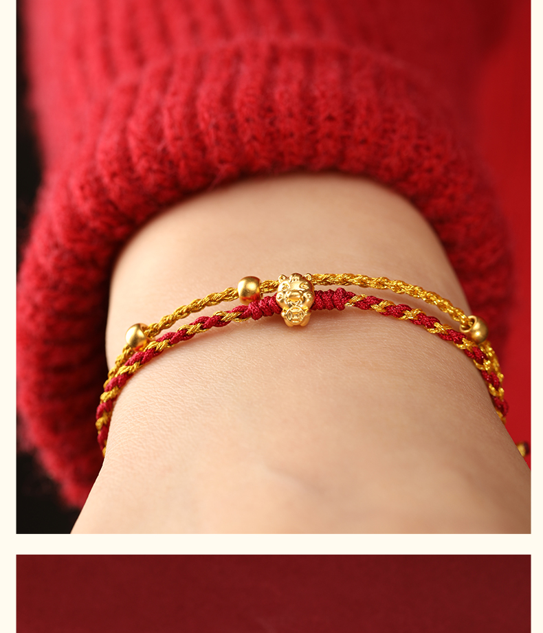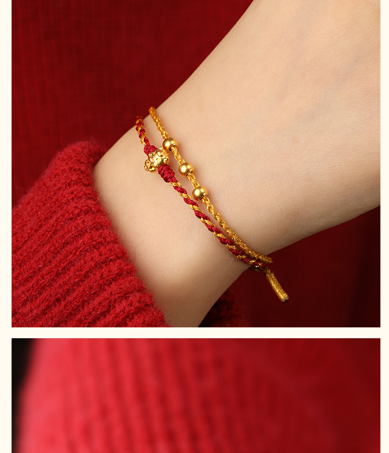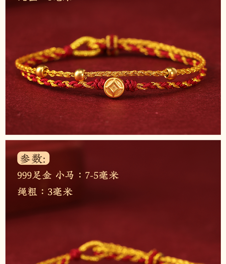 999 Pure Gold Pony Red String Bracelet with Gold Fortune Beads, Double-Circle Auspicious Bracelet for Women, High-End Zodiac Year Bracelet for Men
