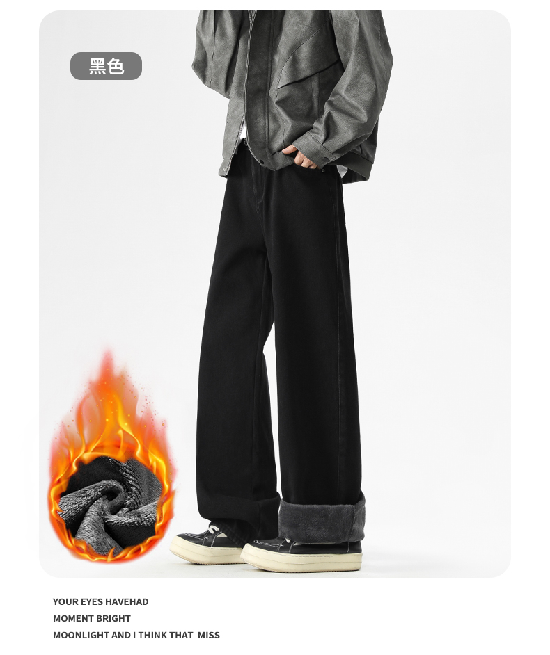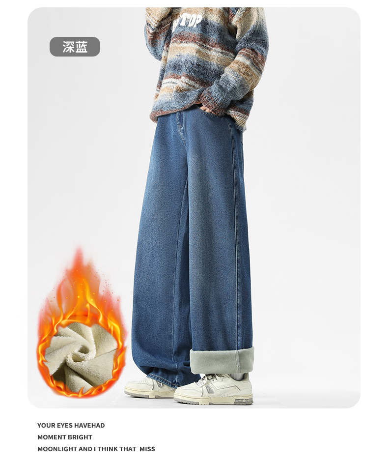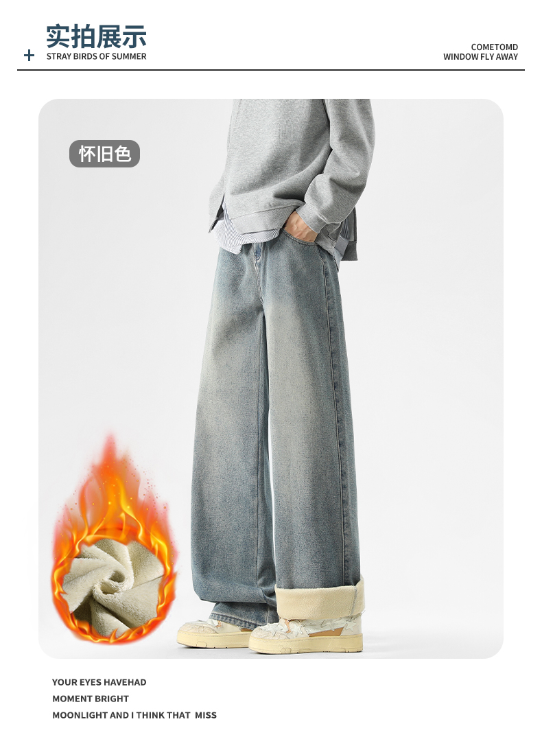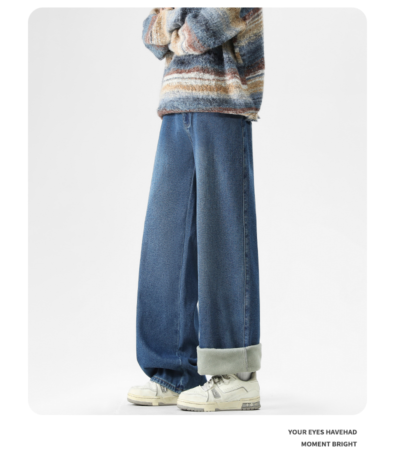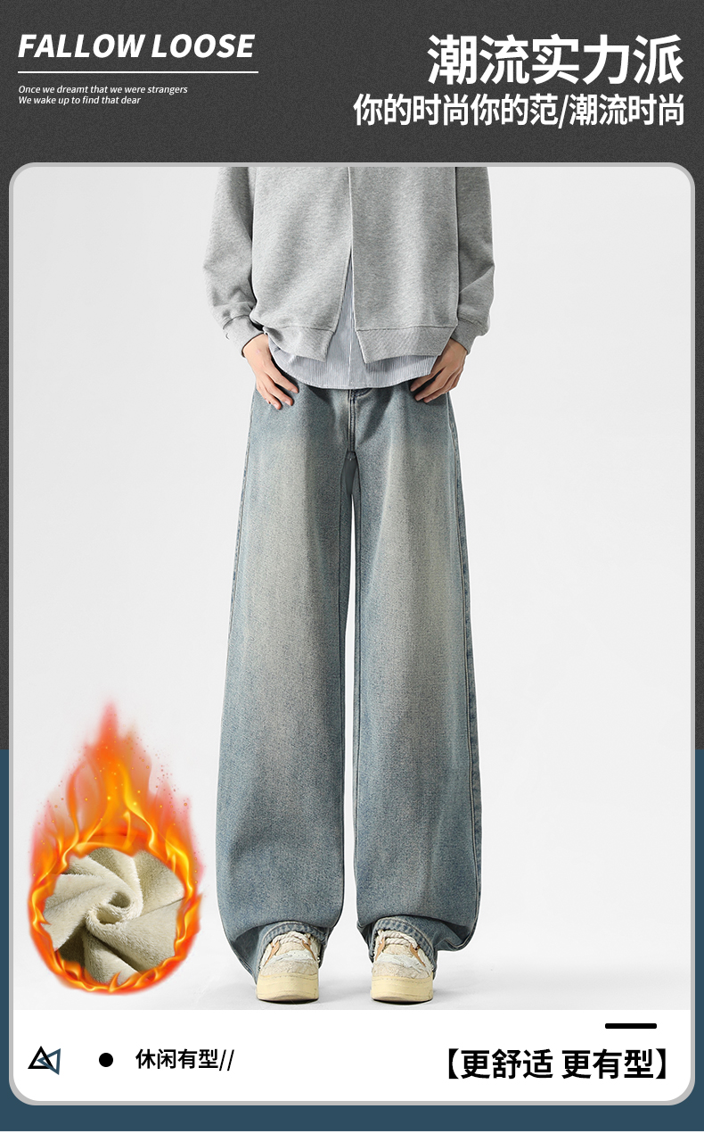 Warrior Brand Autumn and Winter 2025 New Men's Jeans, Loose Wide-Leg Straight Pants with Fleece Lining and Thickened Long Trousers for Men