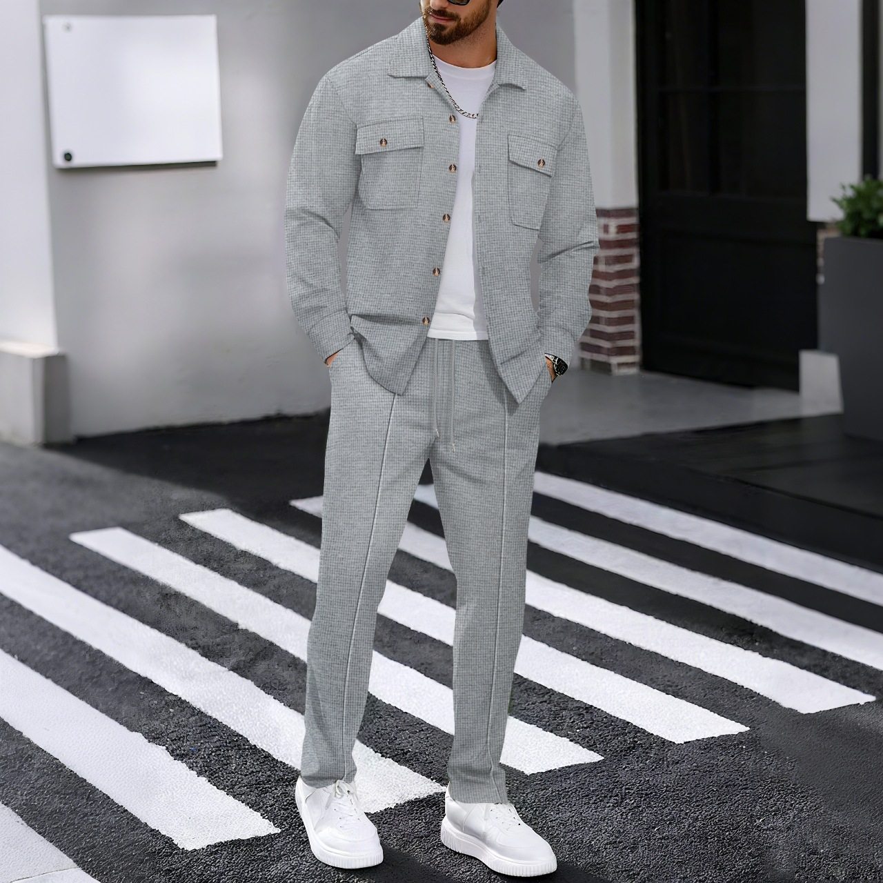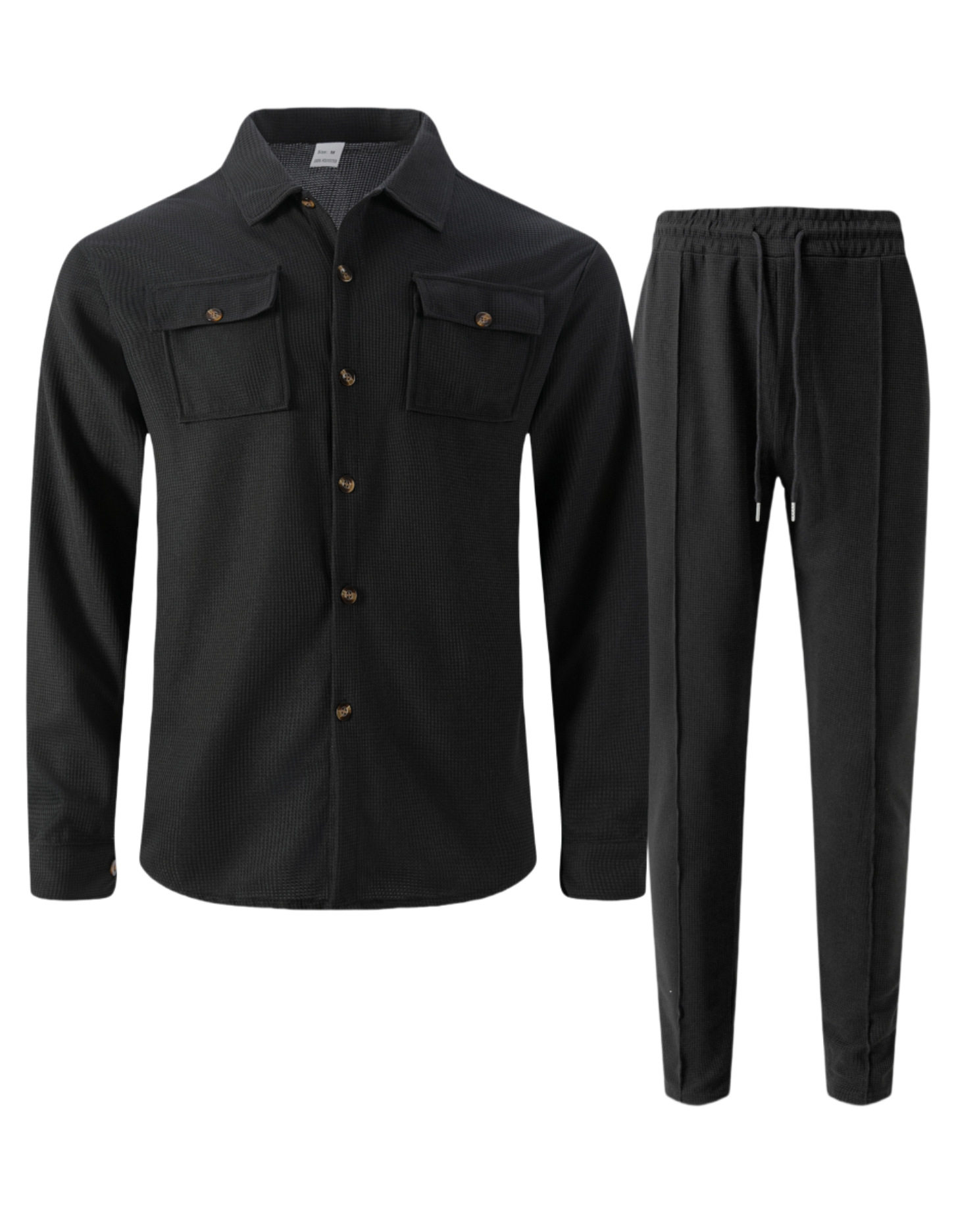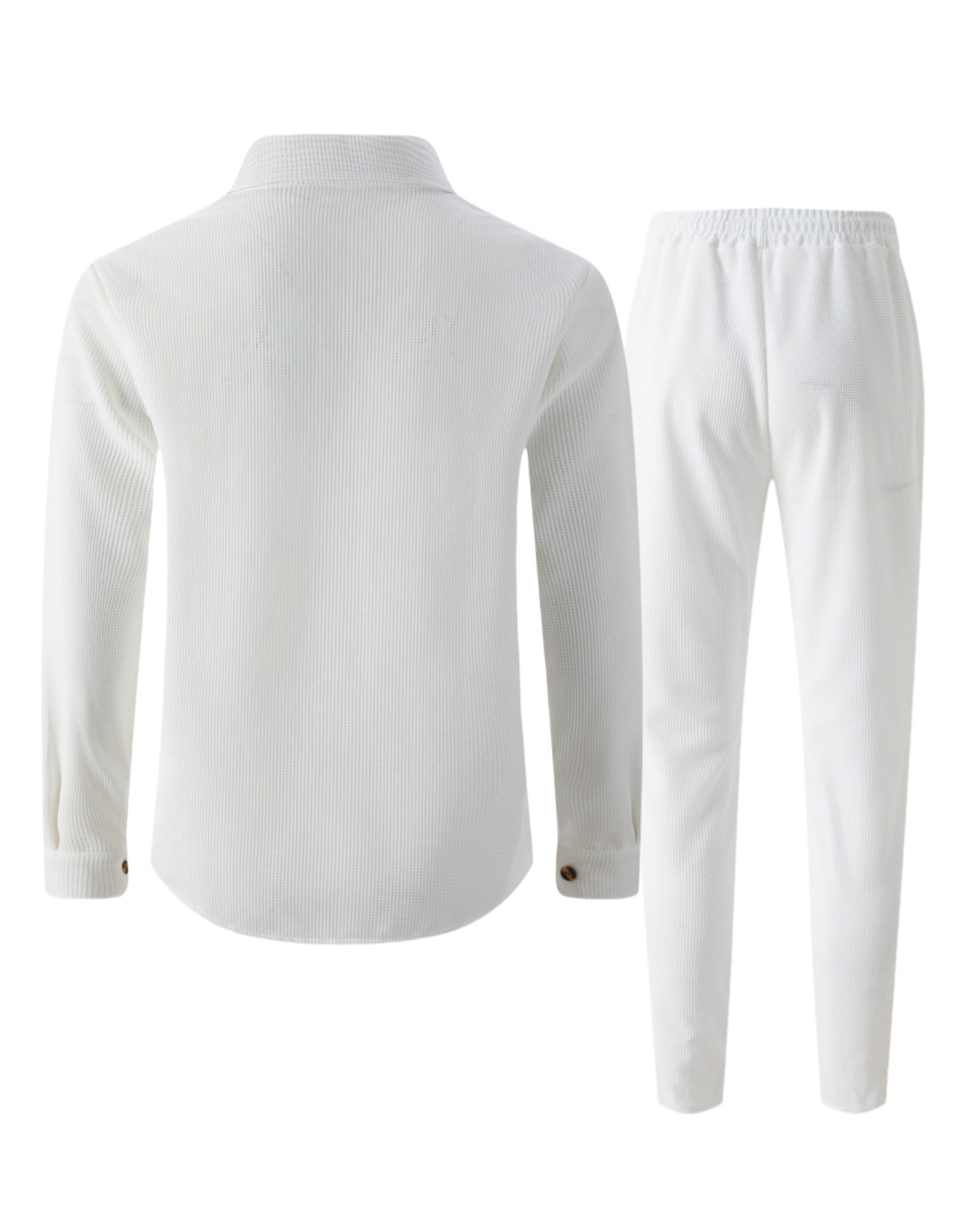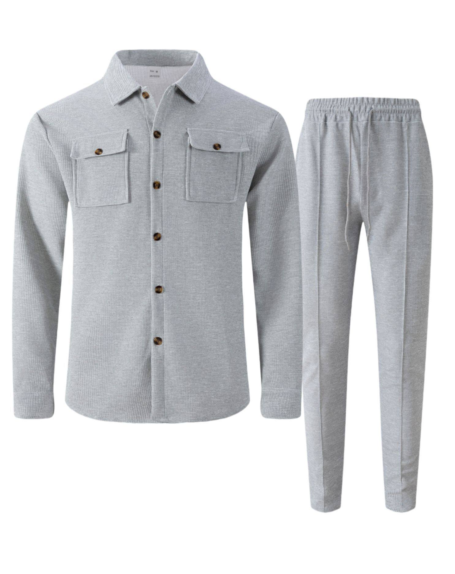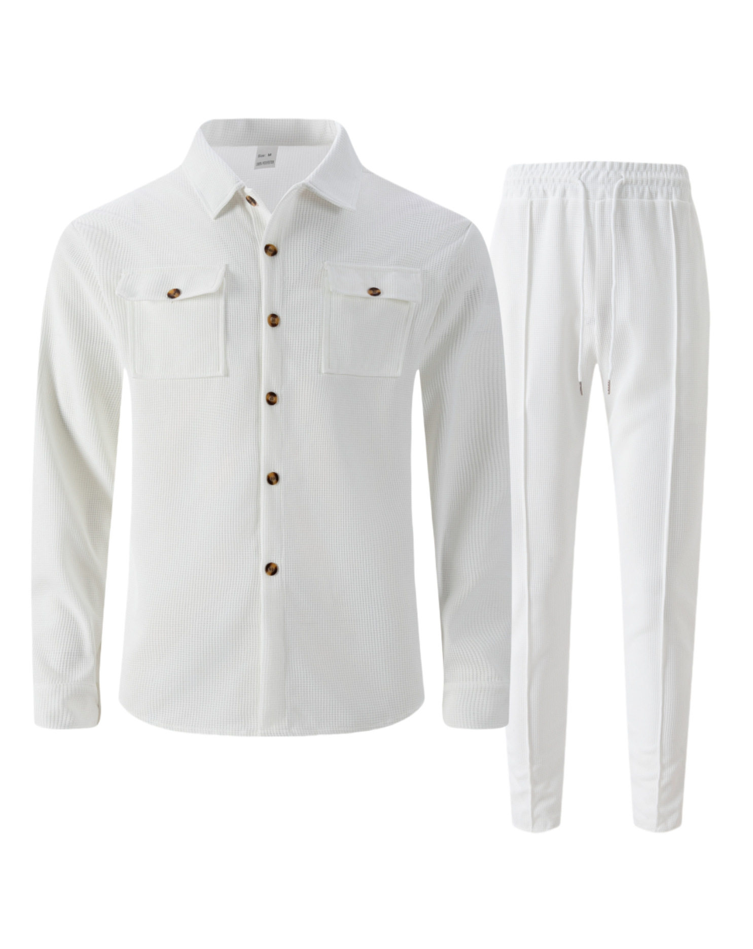 Cross-Border European and American Autumn Waffle Knit Long-Sleeve Long Pants Two-Piece Set Solid Color Double Pocket Workwear Cardigan Shirt Suit for Men
