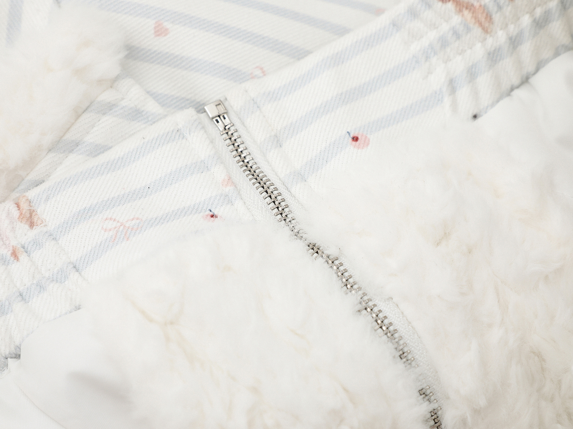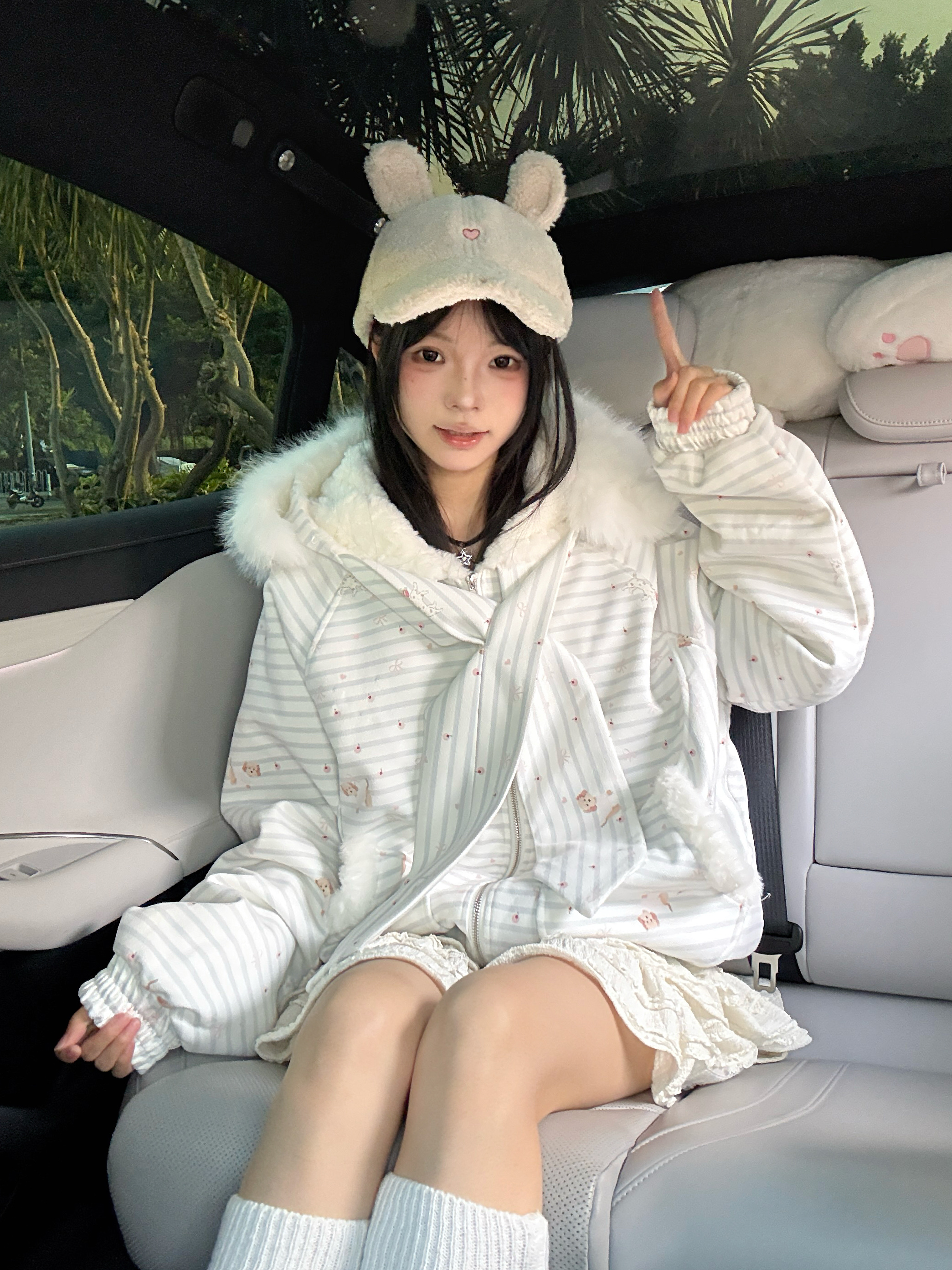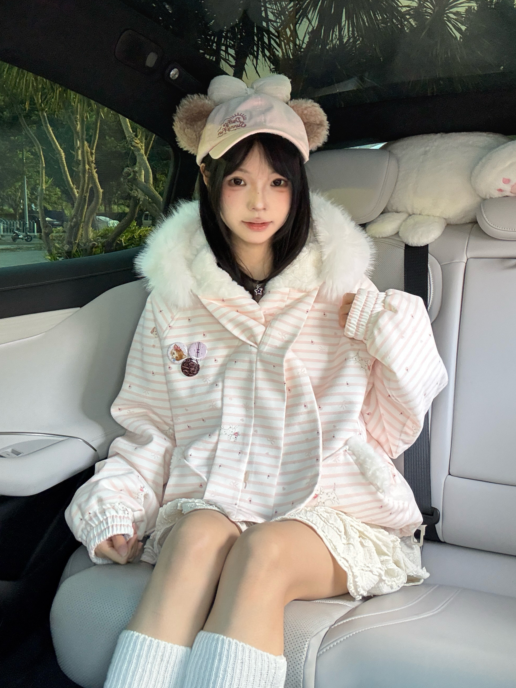 Dream Special Talent Original Korean Style Sweet Striped Cotton Jacket with Tie, Furry, Warm, Loose, Short Top