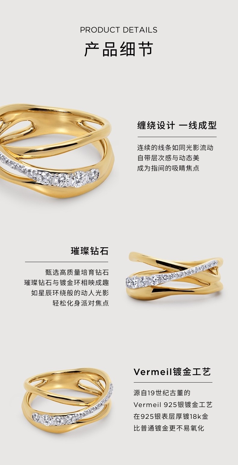 Monica Vinader Metal Winding Flowing Light and Shadow Ring Sculpture-Like Layered Gold-Plated Women's Ring Vintage