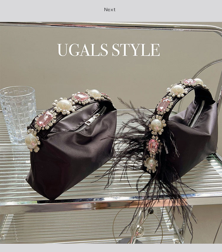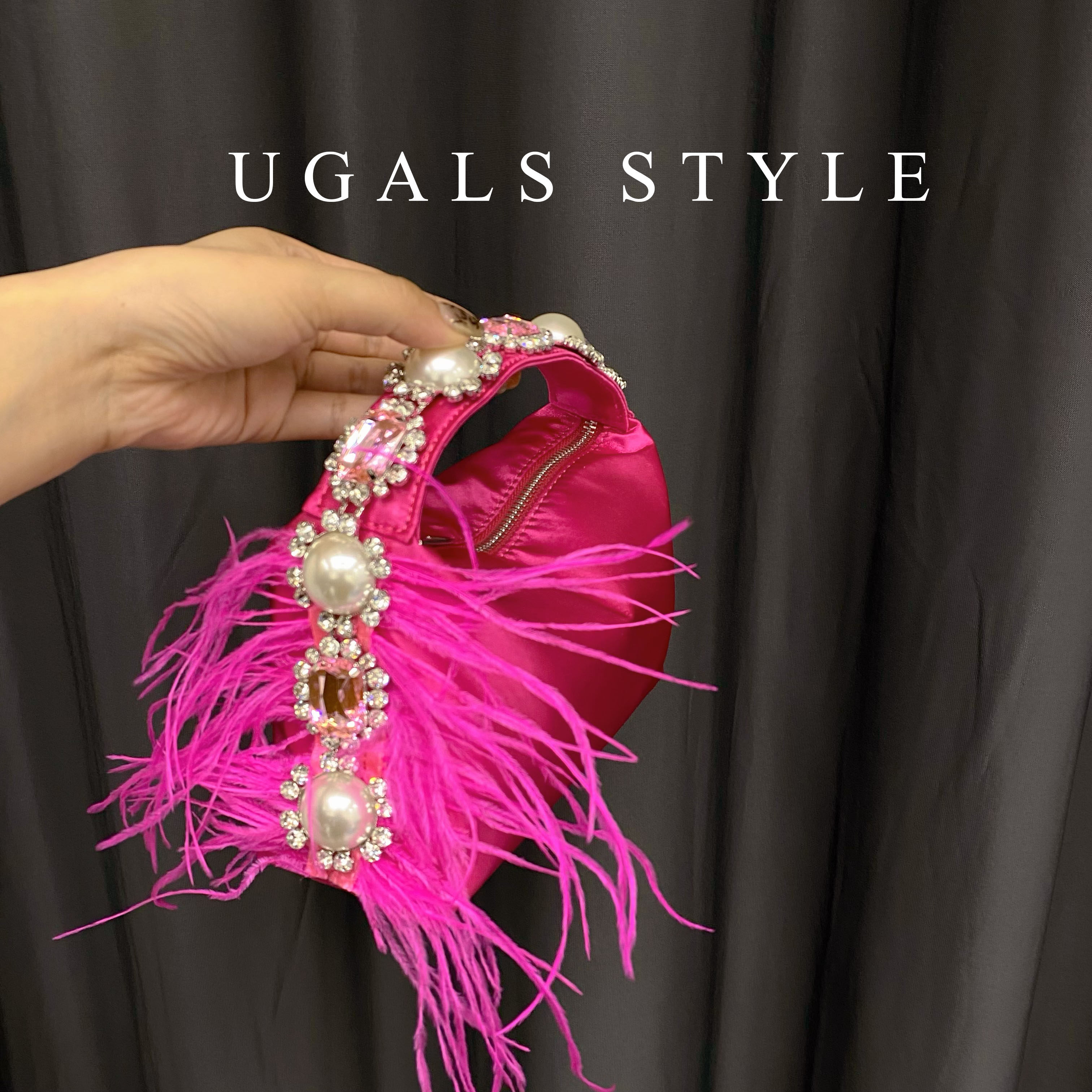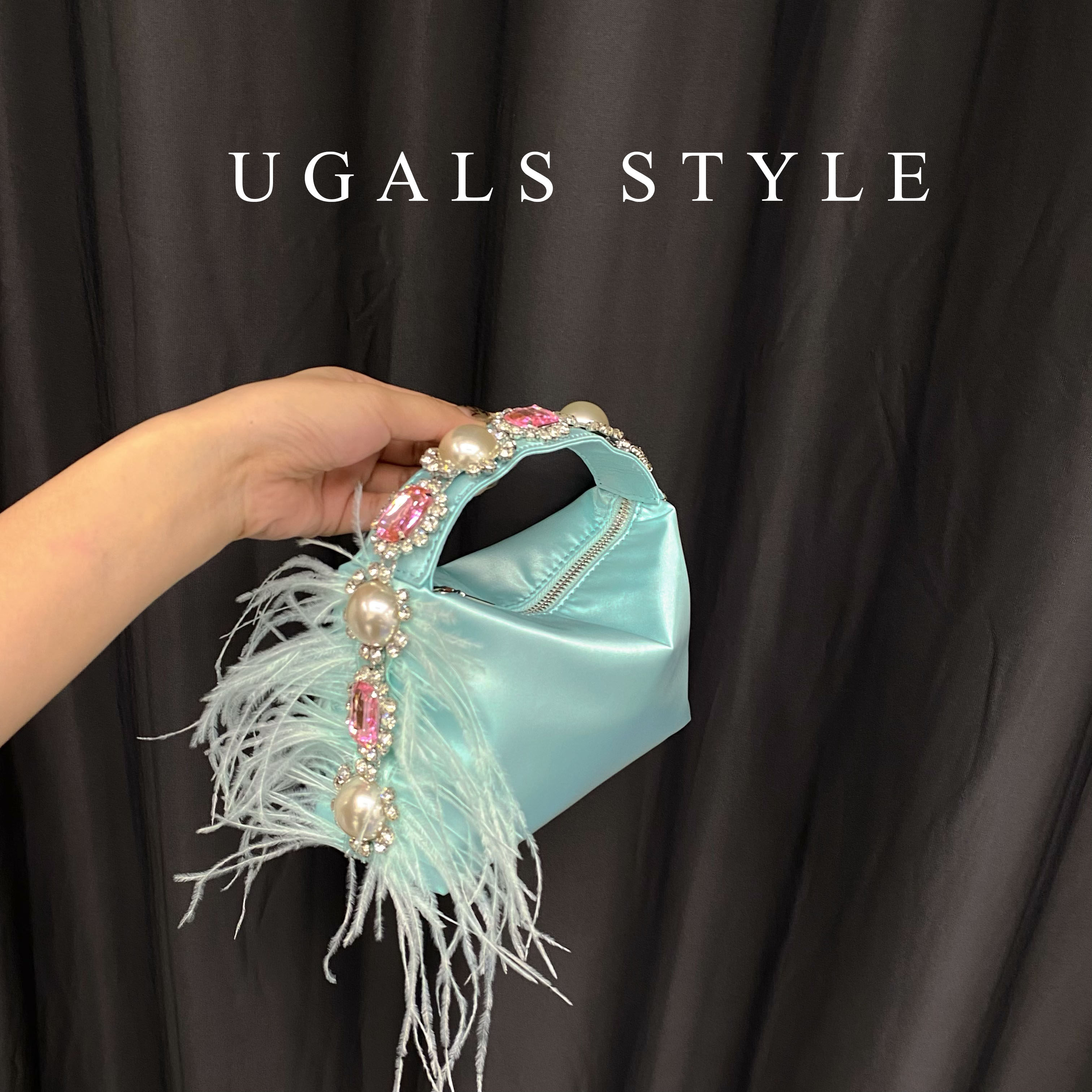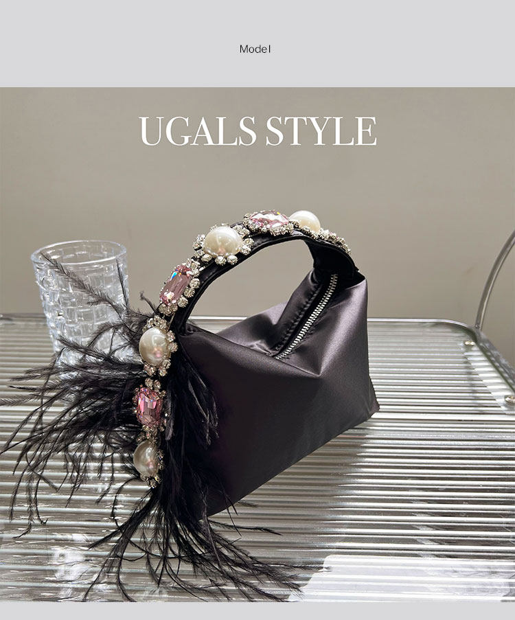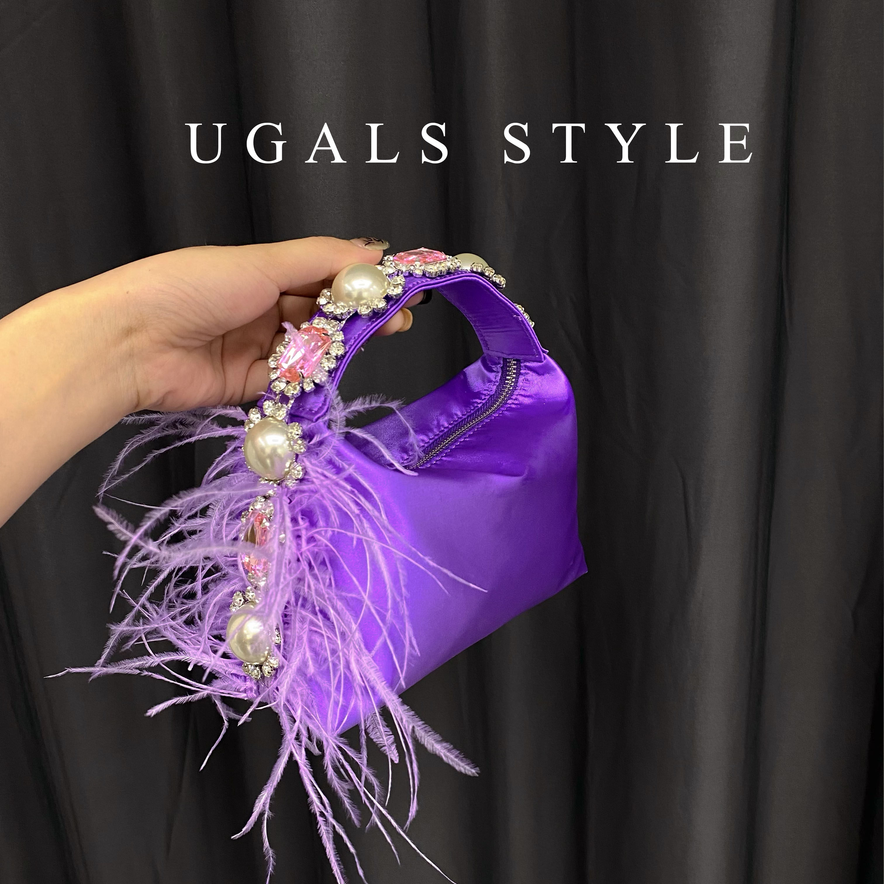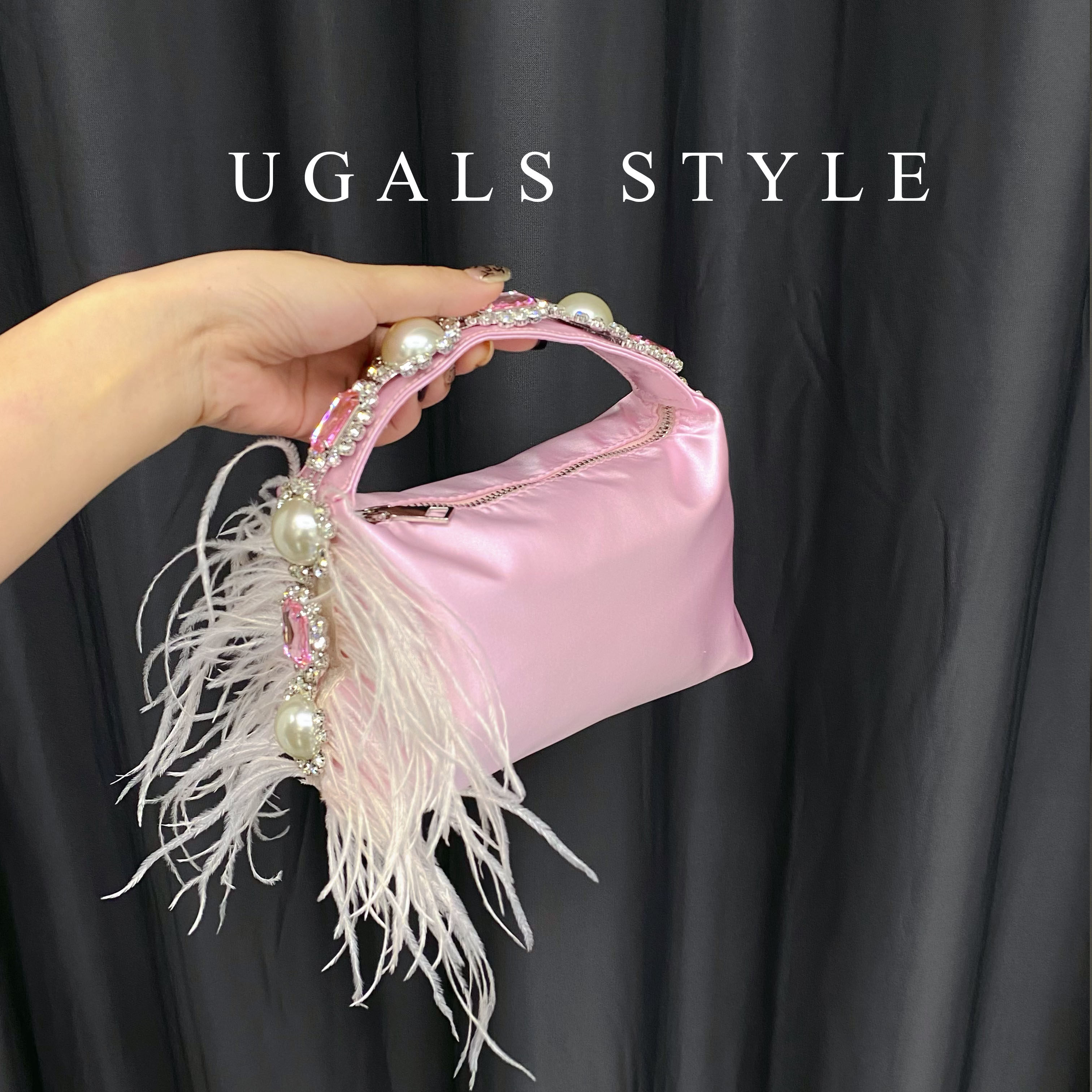 Ugals French-Style Evening Ostrich Feather Lunch Box Bag, Hand-Embellished with Diamonds, Flowers, Gemstones, Silk Satin Clutch Phone Bag