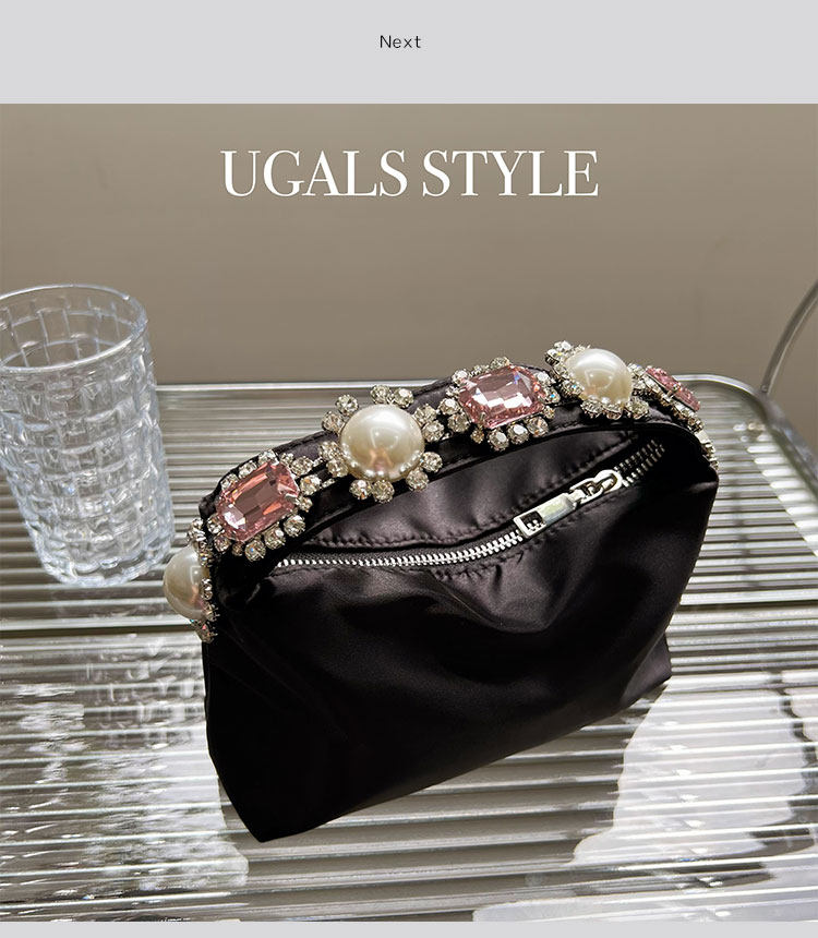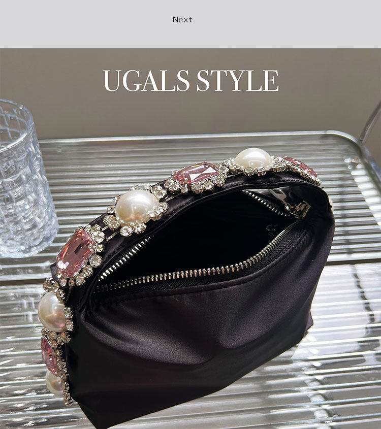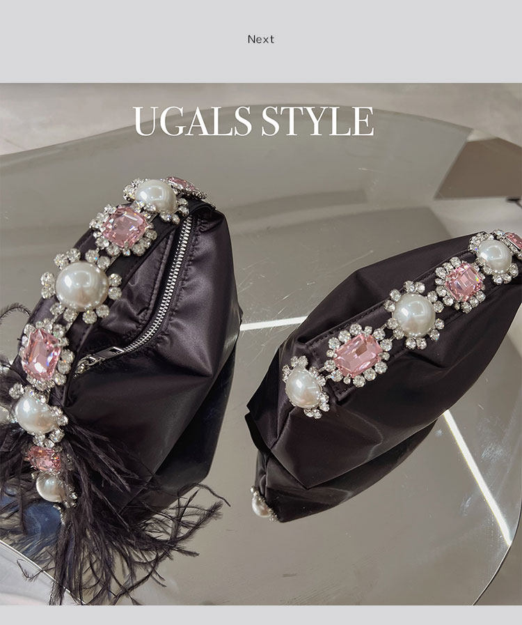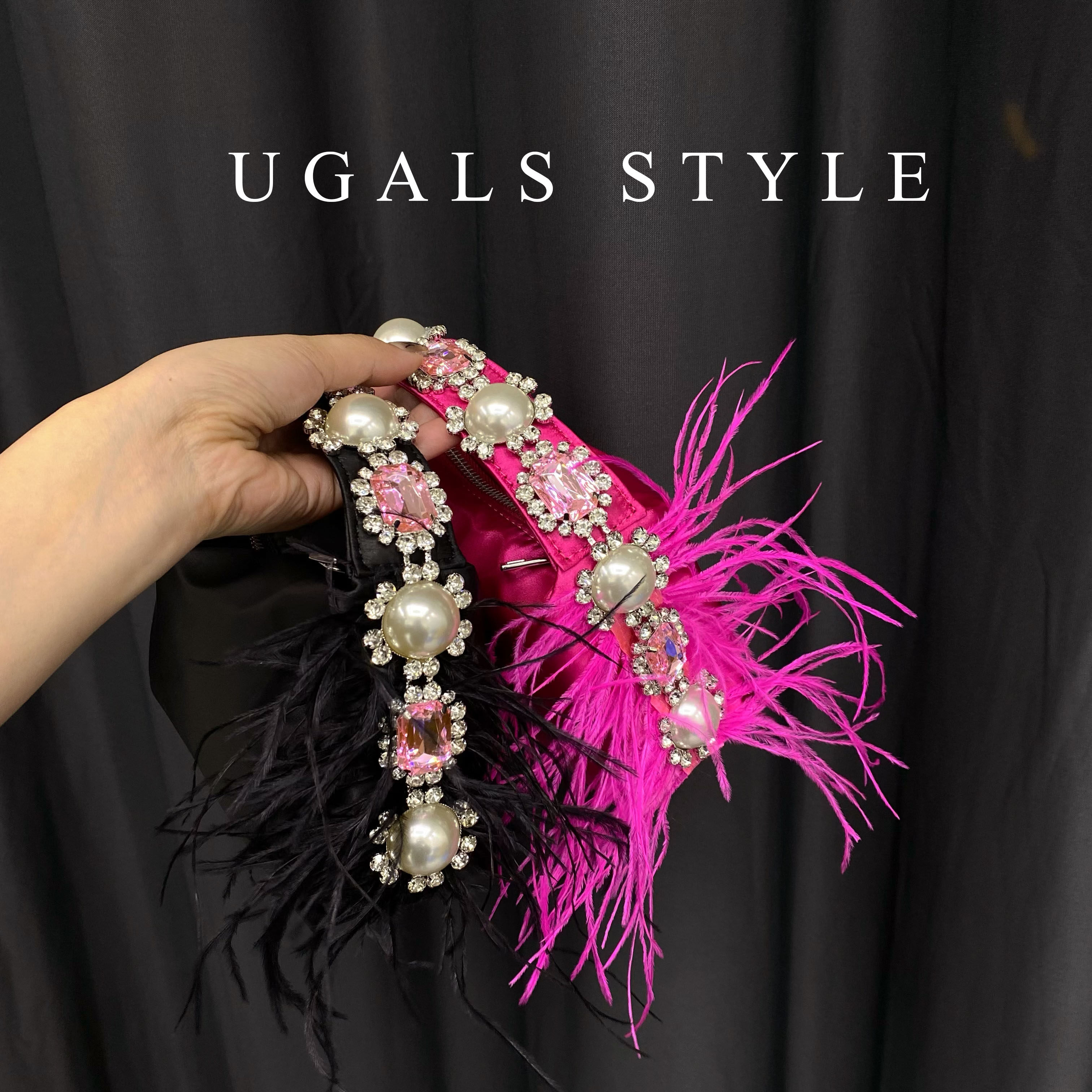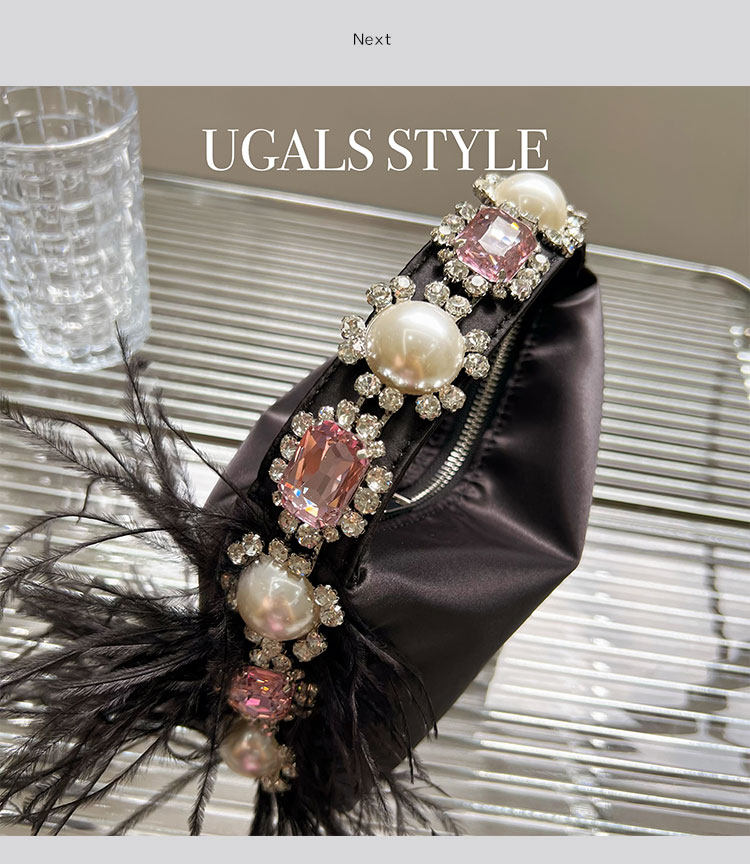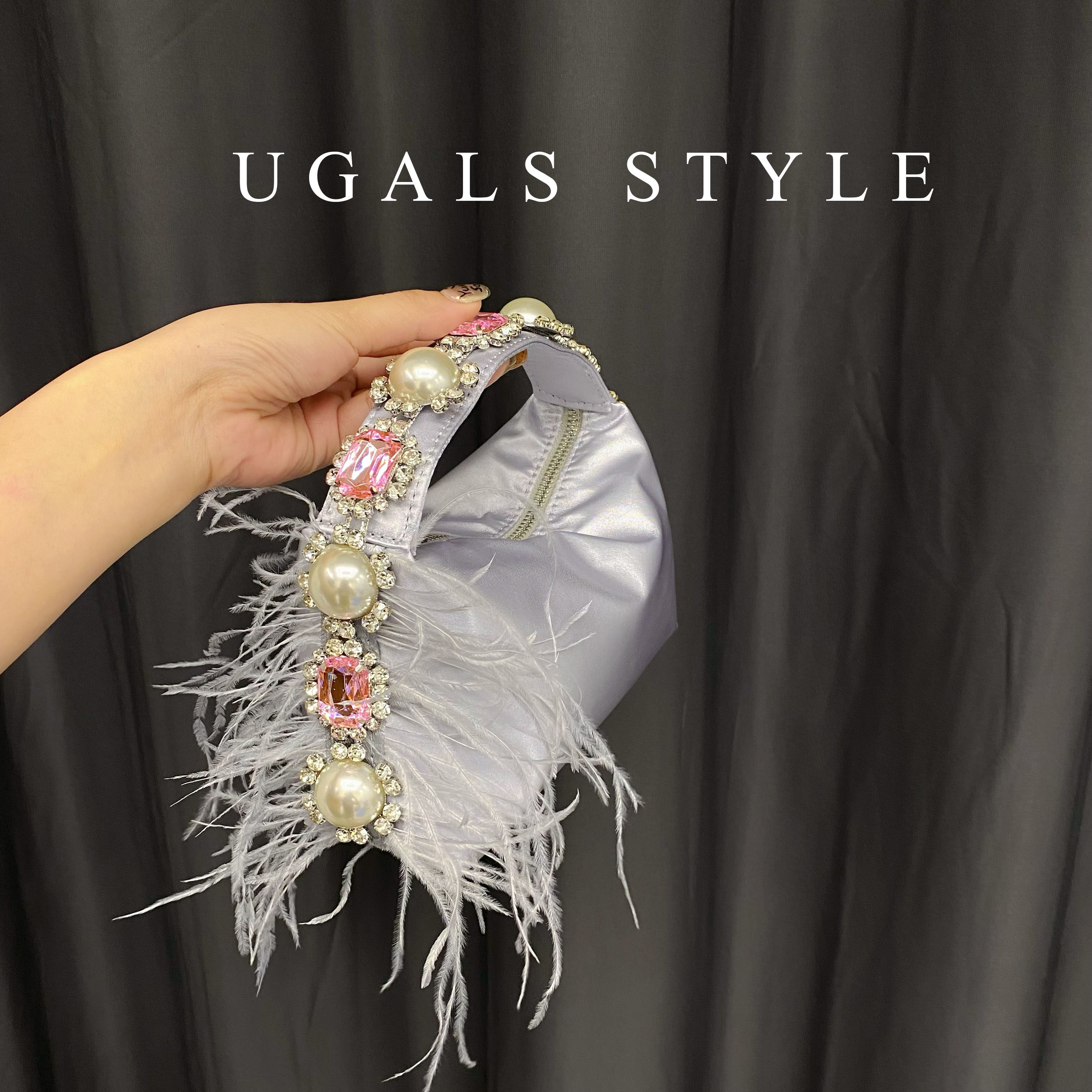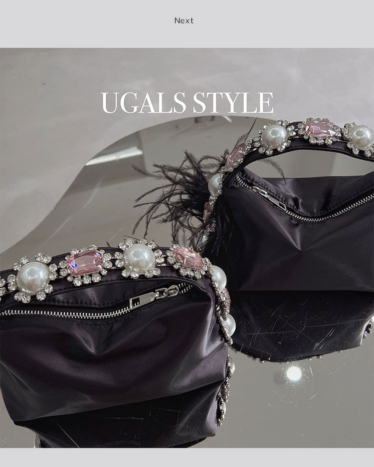 Ugals French-Style Evening Ostrich Feather Lunch Box Bag, Hand-Embellished with Diamonds, Flowers, Gemstones, Silk Satin Clutch Phone Bag