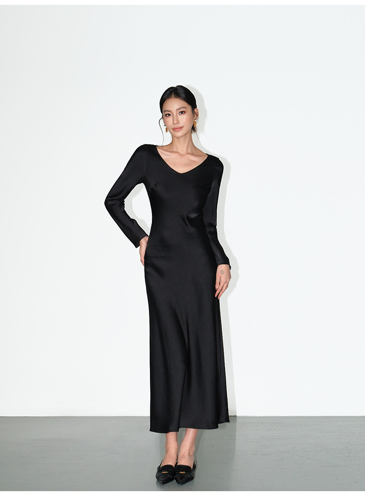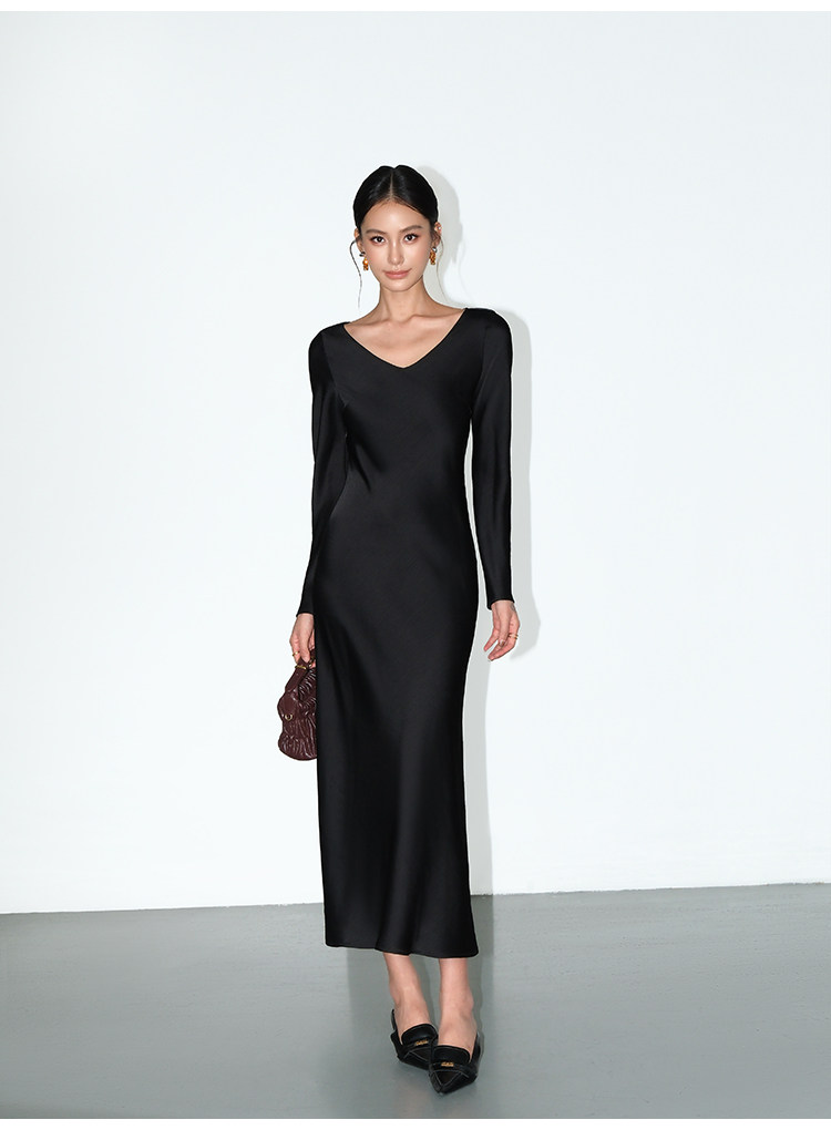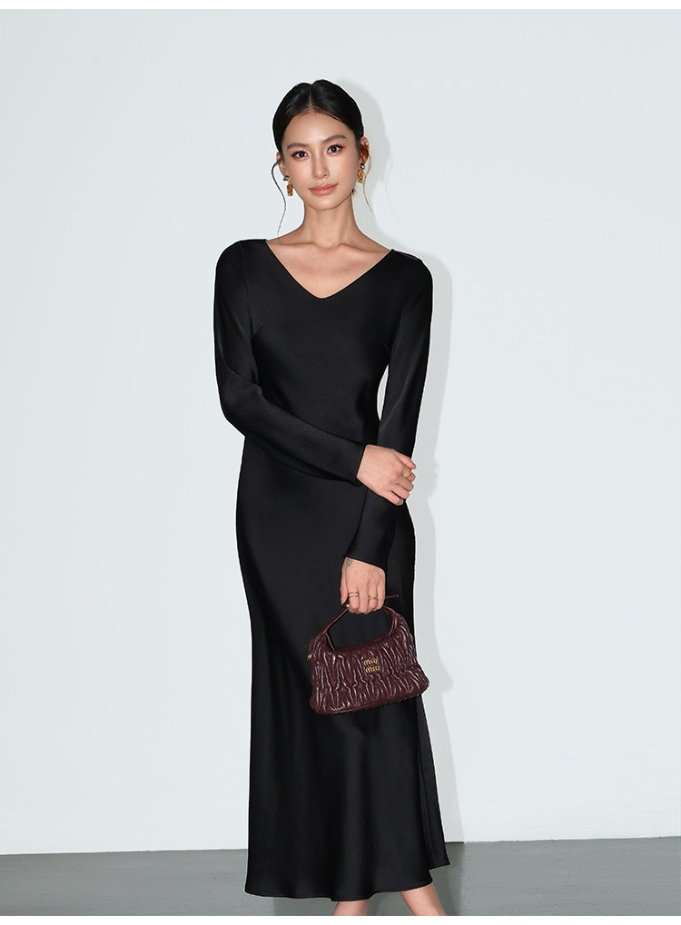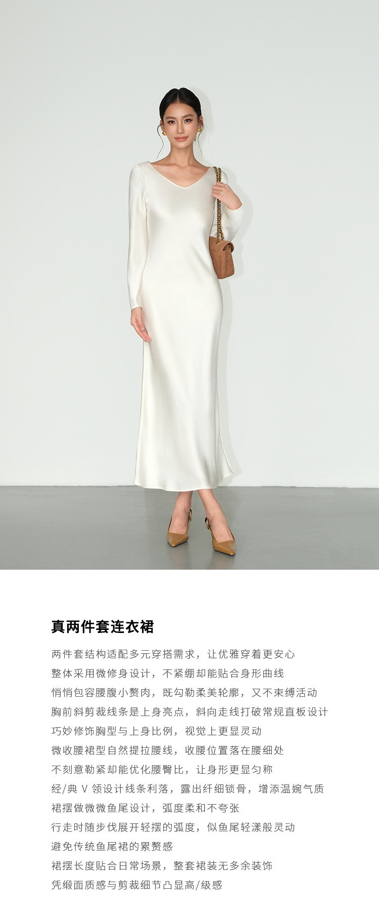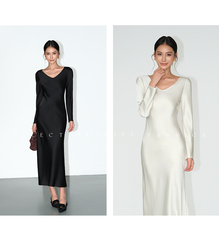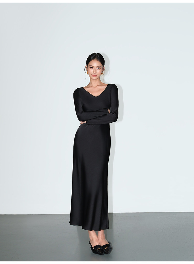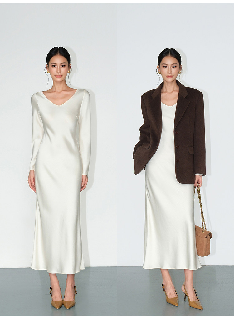 Neva Hu Flamenco Elegant V-Neck Satin Long Sleeve Dress Women's Slim Fit Suspender Dress Two-Piece Set