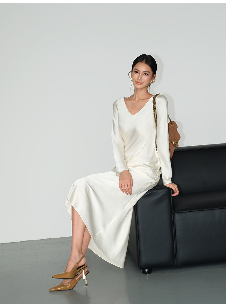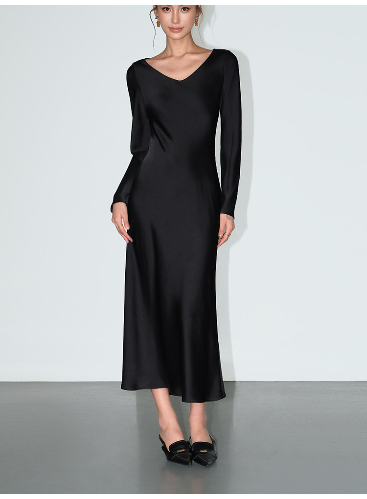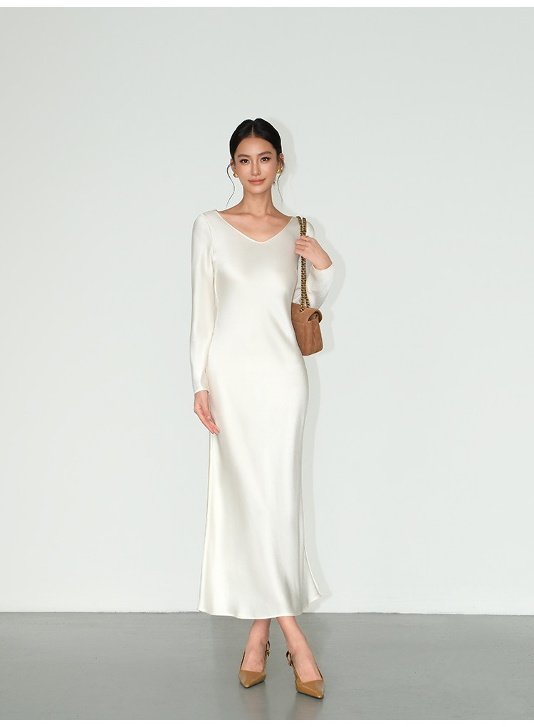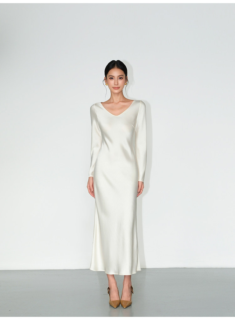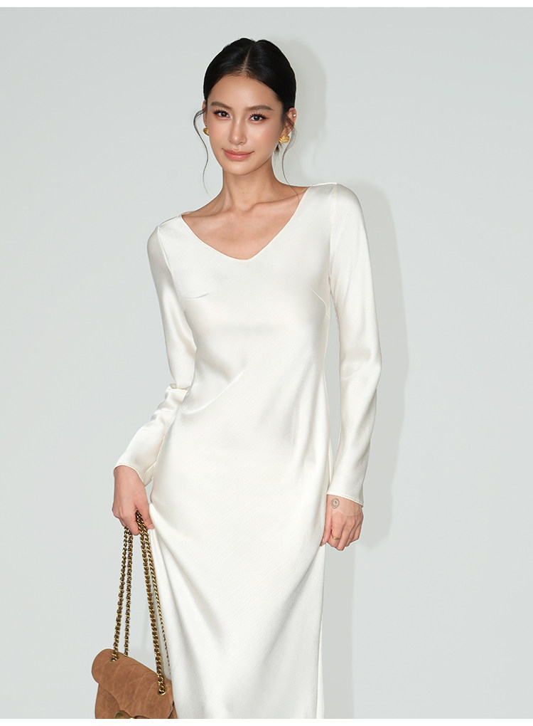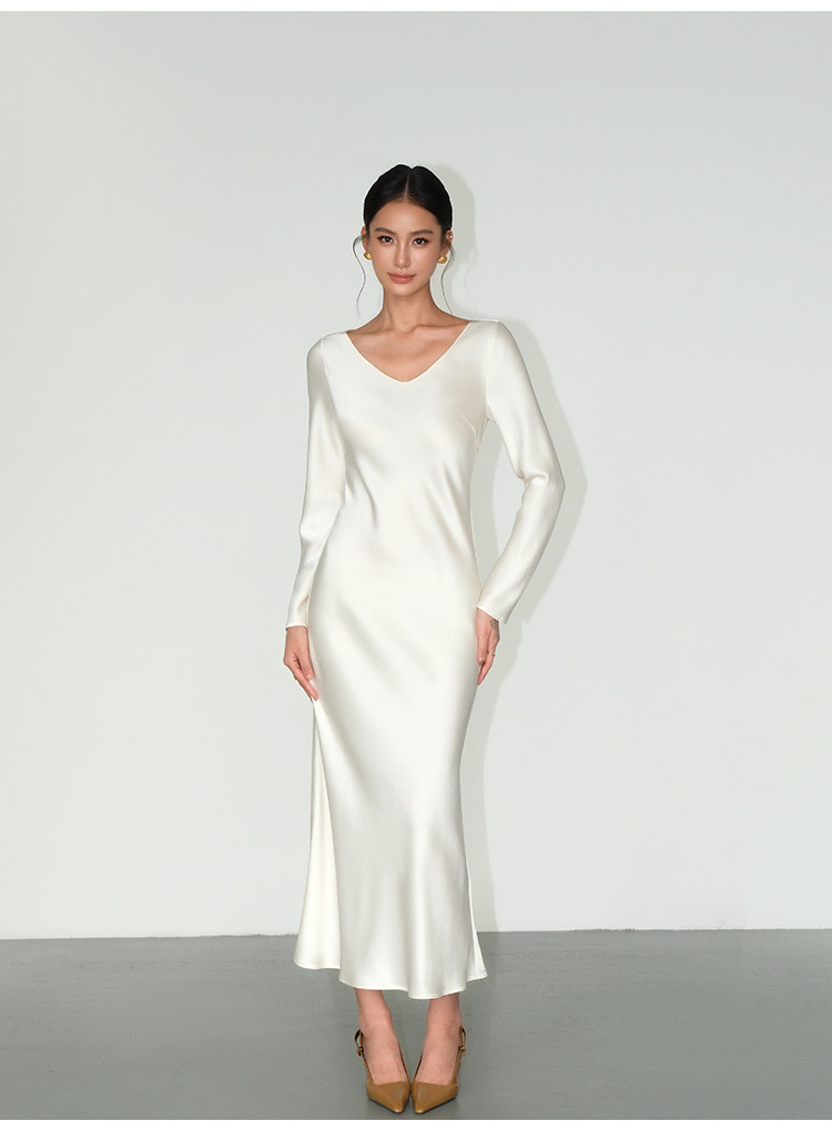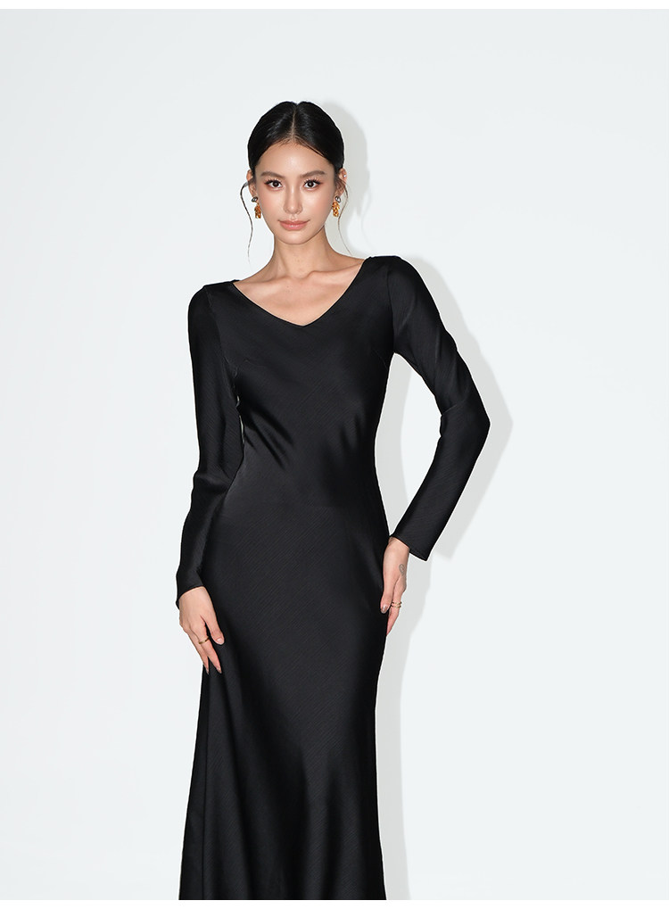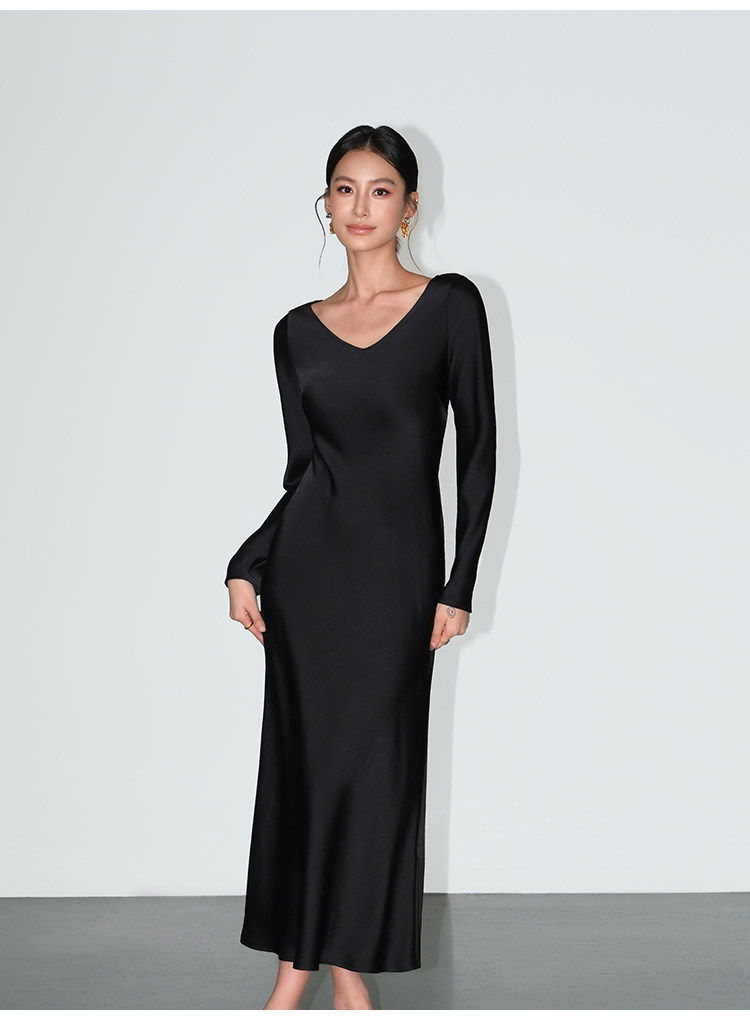 Neva Hu Flamenco Elegant V-Neck Satin Long Sleeve Dress Women's Slim Fit Suspender Dress Two-Piece Set