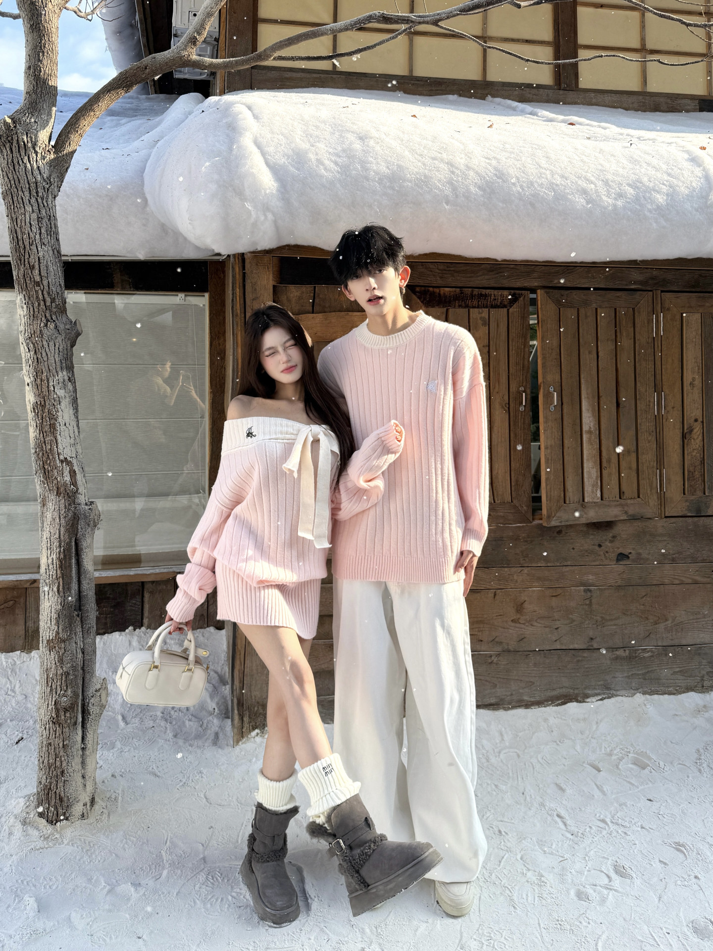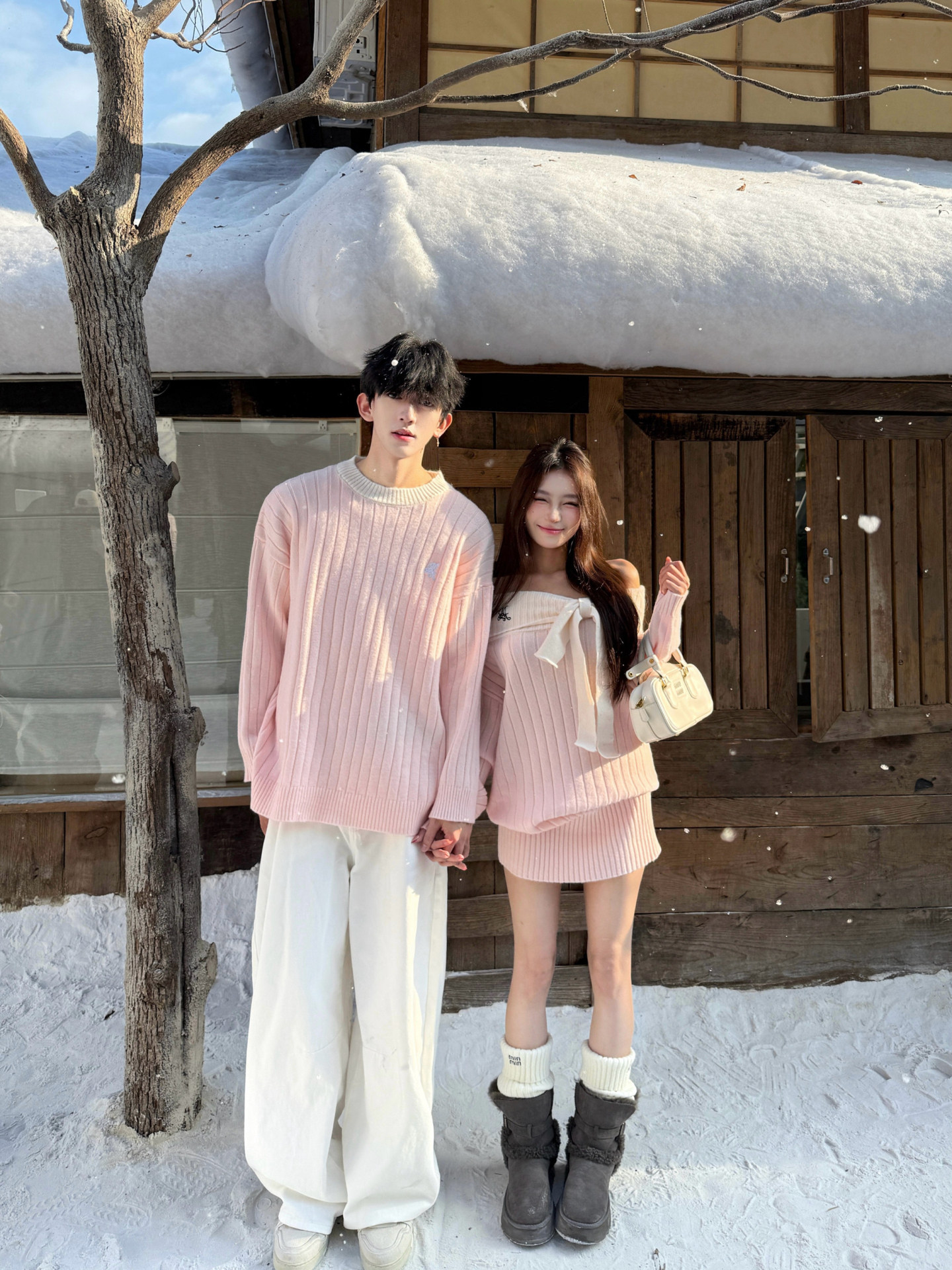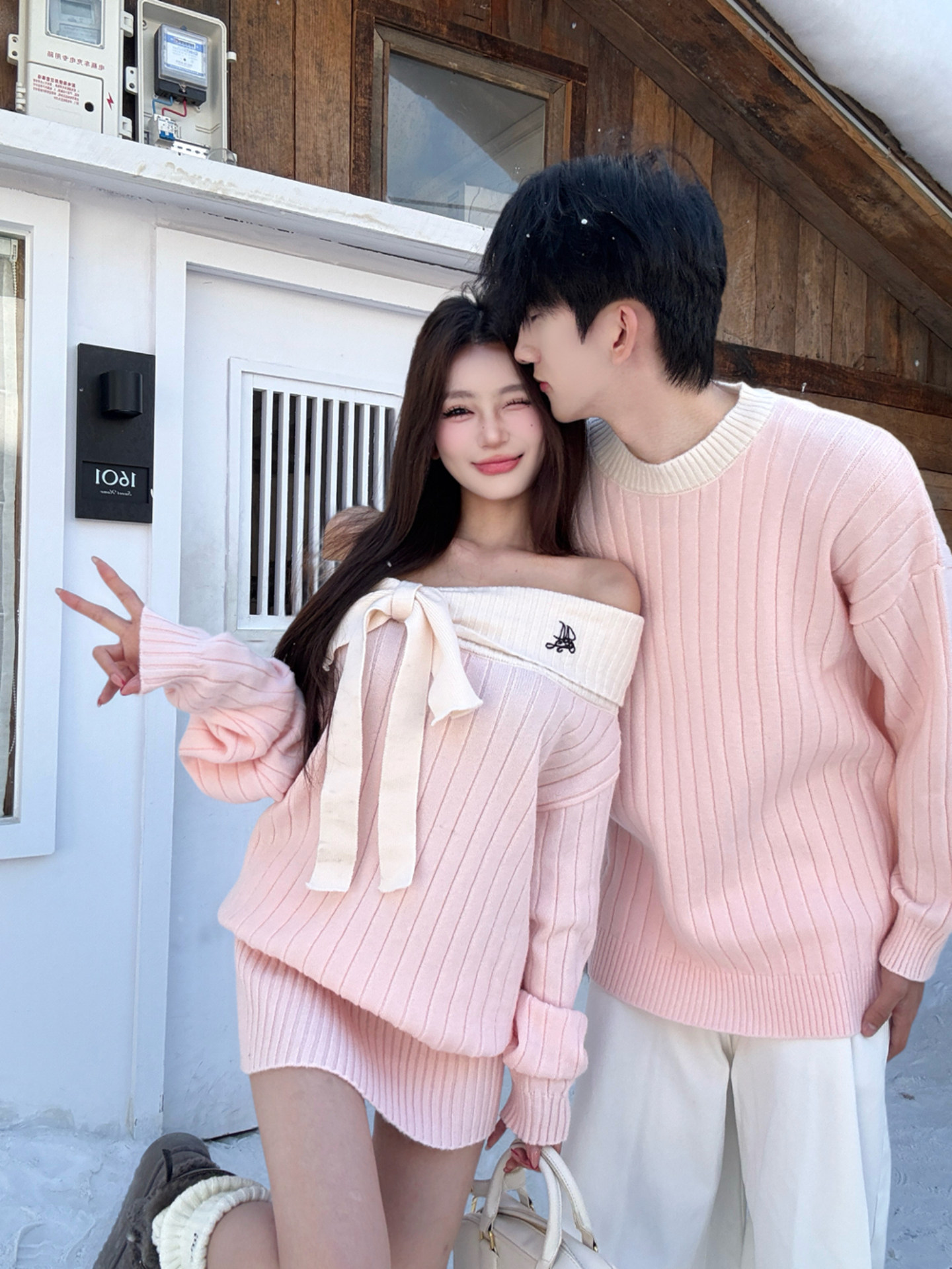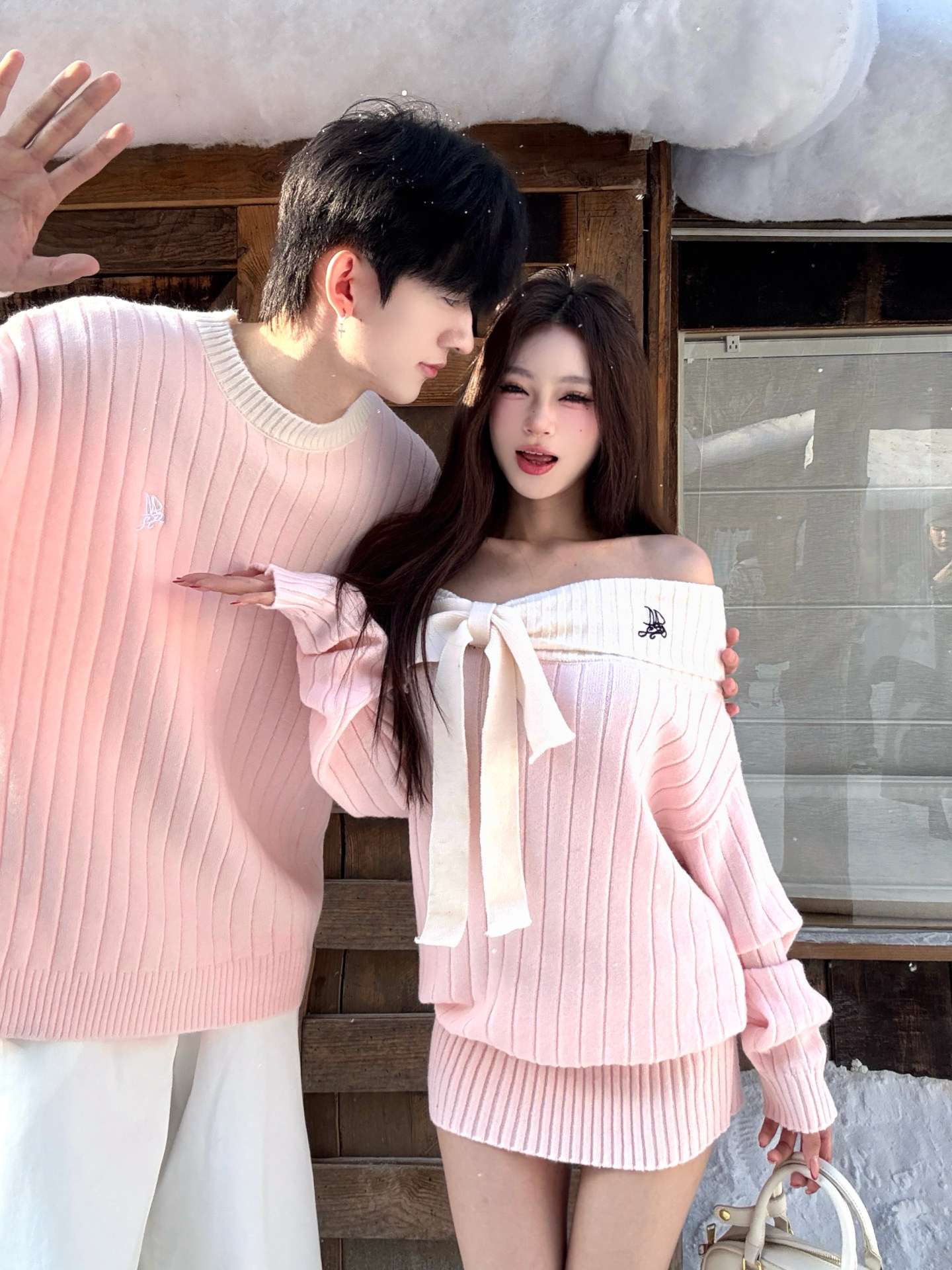 Niche Design Couple's Sweater, Autumn and Winter Off-Shoulder Bow-Tie Waist-Cinching Slim-Fit Bodycon Knit Dress