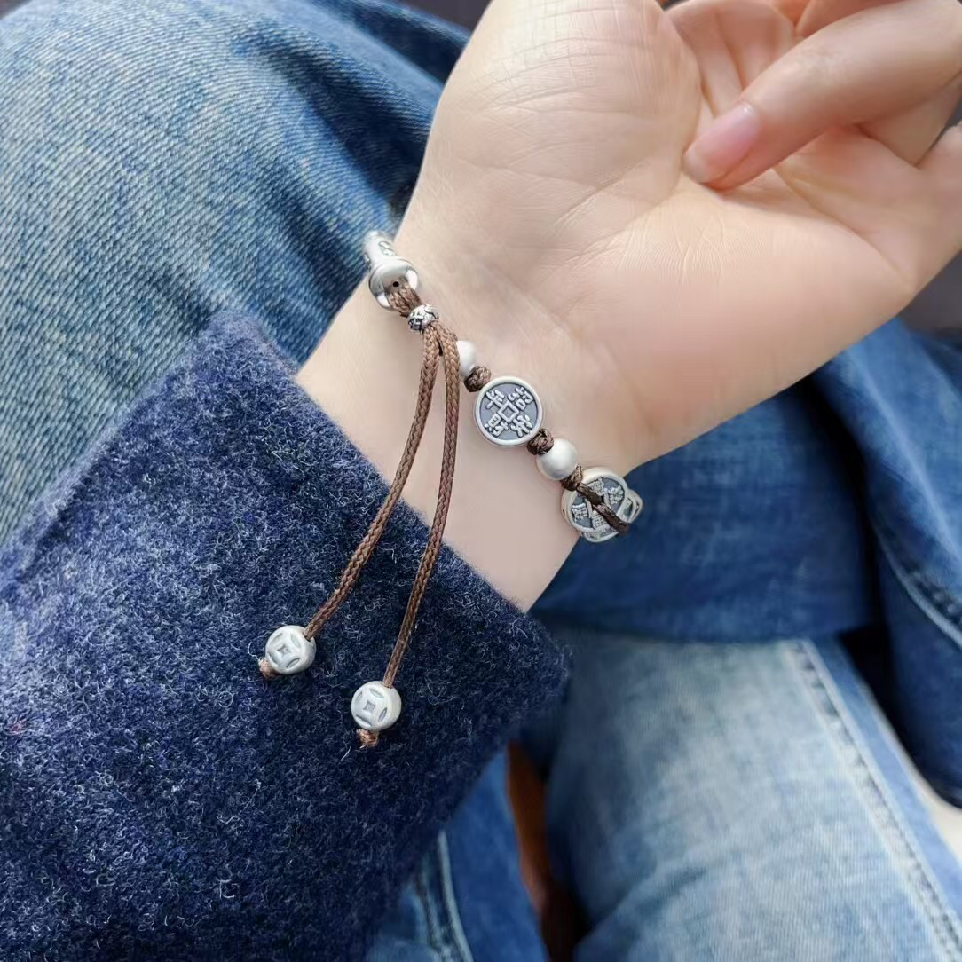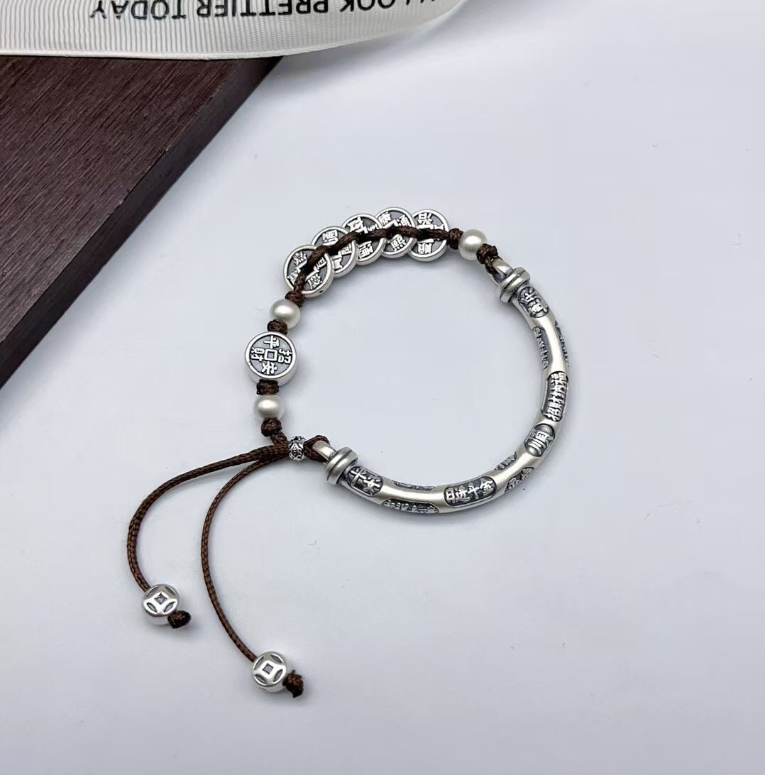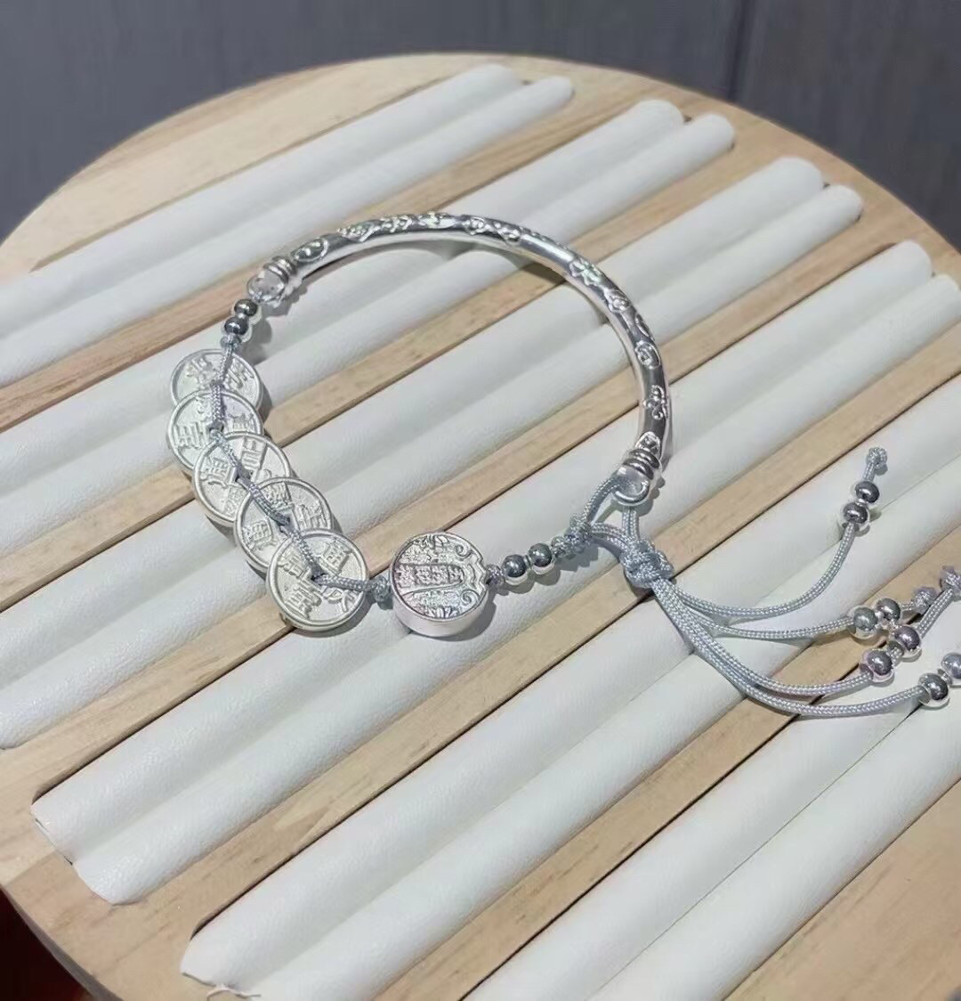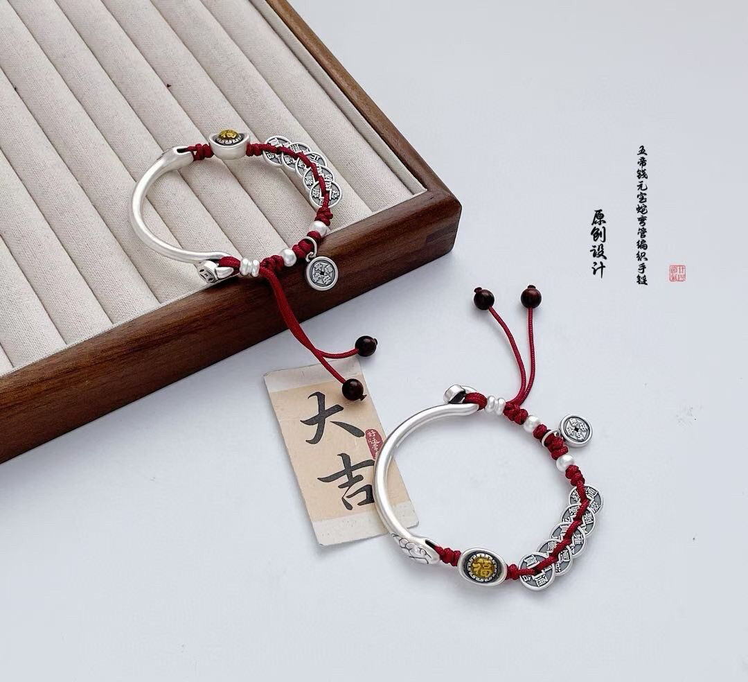 999 Pure Silver Half Bracelet with Five Emperors' Coins and Five Gods of Wealth, Handmade DIY Woven Women's Bracelet, National Trend, Ethnic Style, Fashionable and Unique