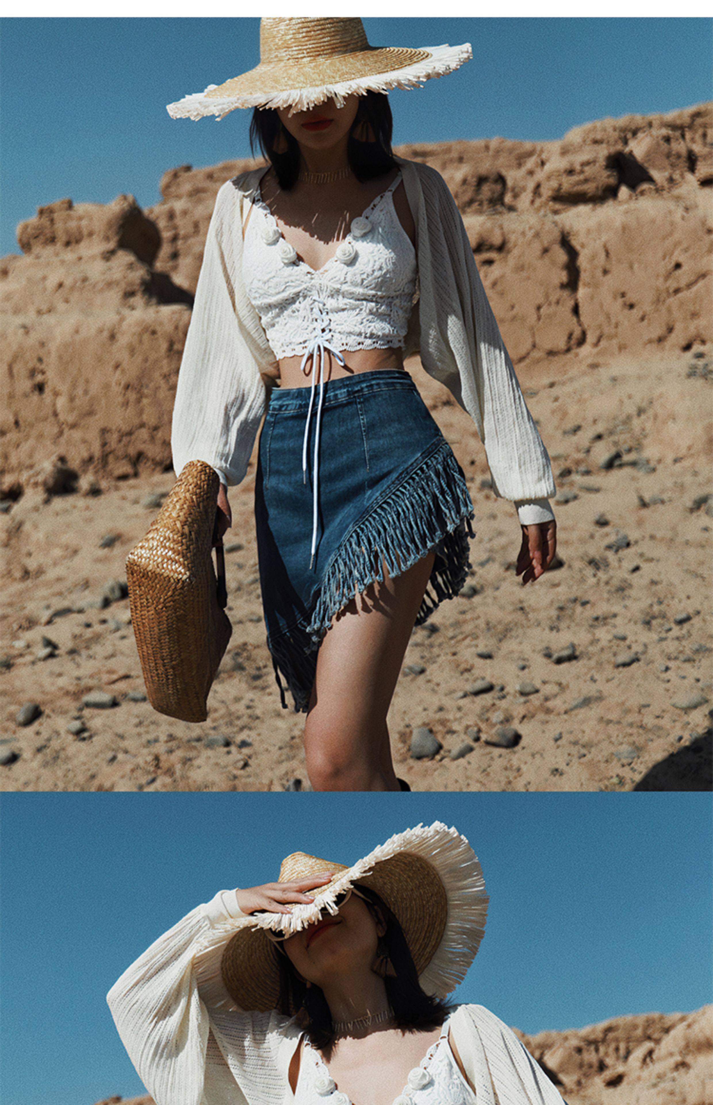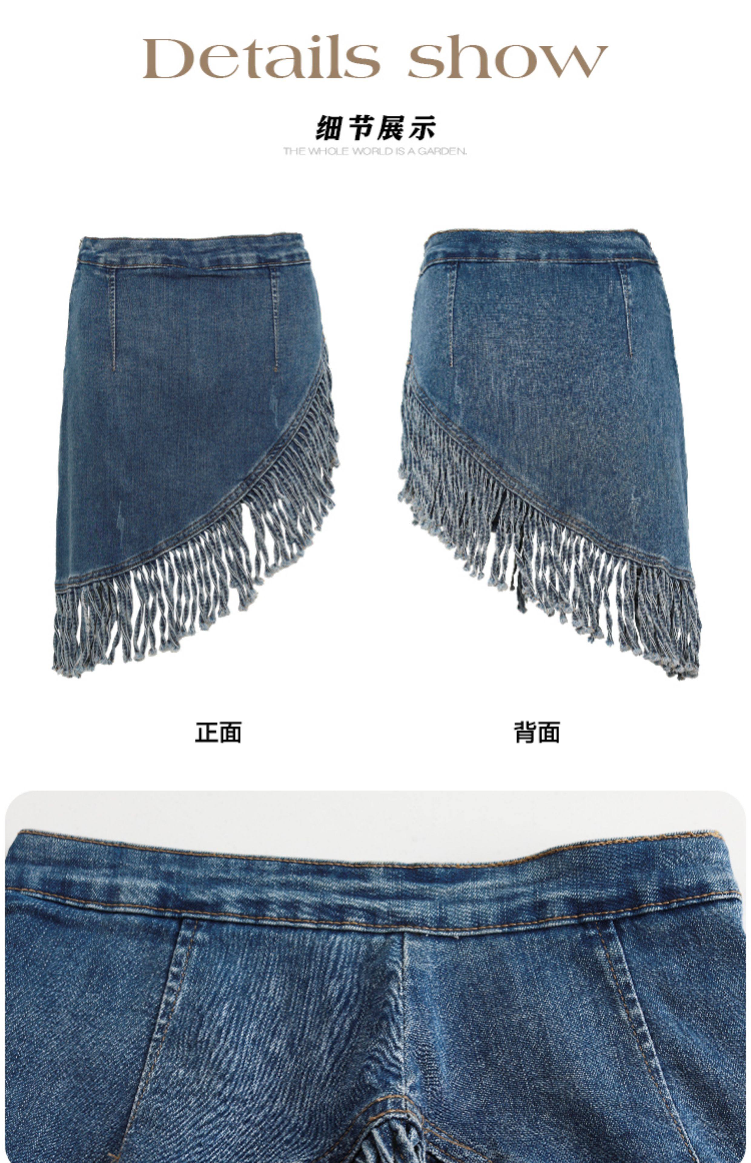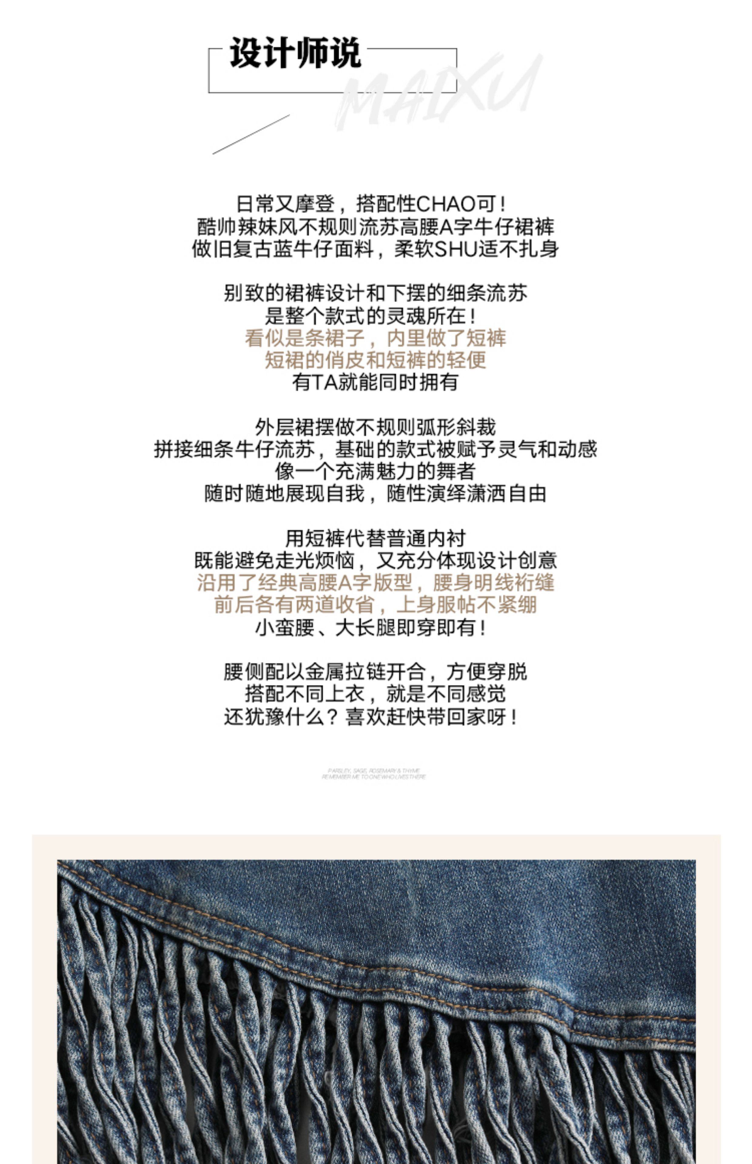 Mai Xu's Retro Irregular Tassel Denim Short Skirt, Women's Spring and Summer High-Waisted A-Line Skirt Pants