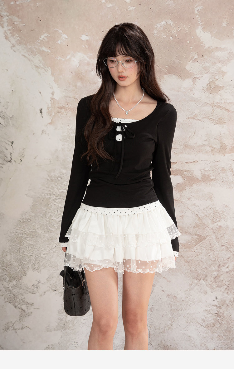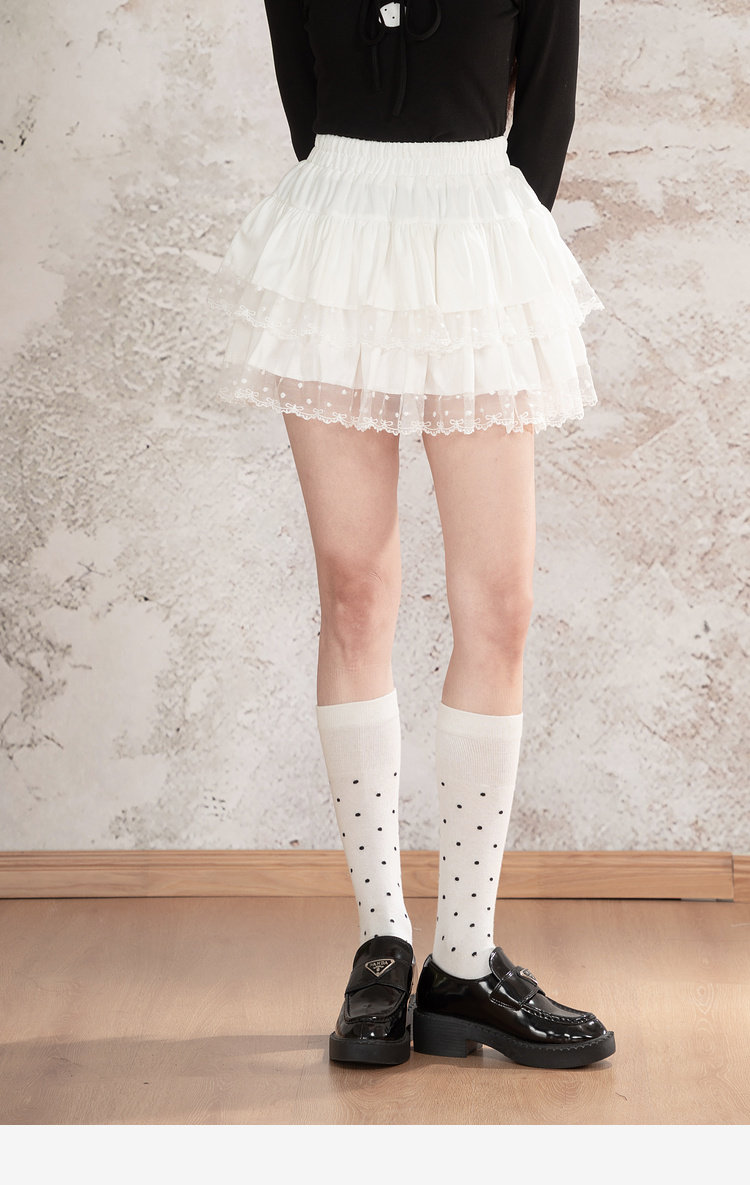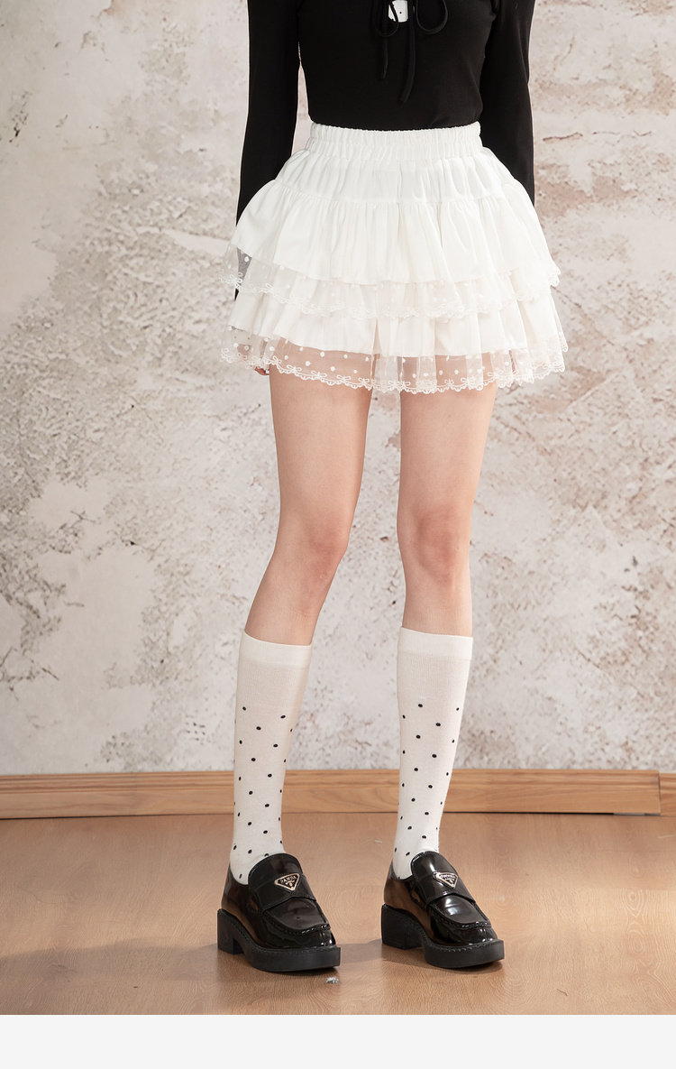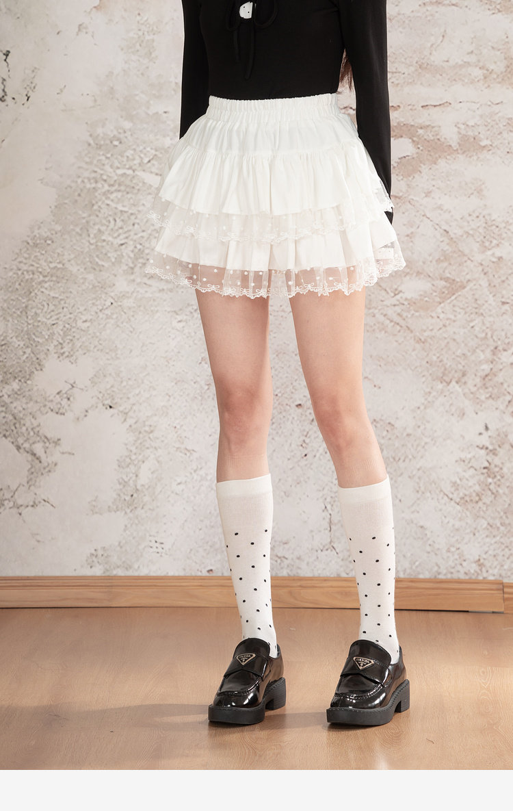 Loveheynew White Sweet Bow Lace-Trimmed Puffy Cake Skirt for Women, Spring and Autumn Slimming A-Line Skirt