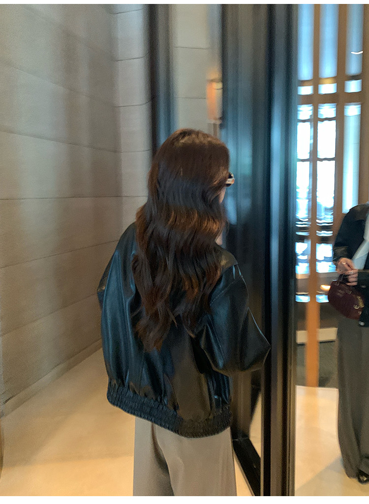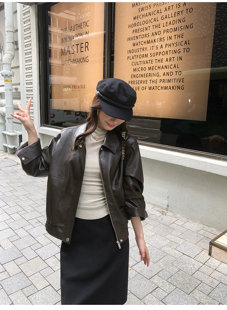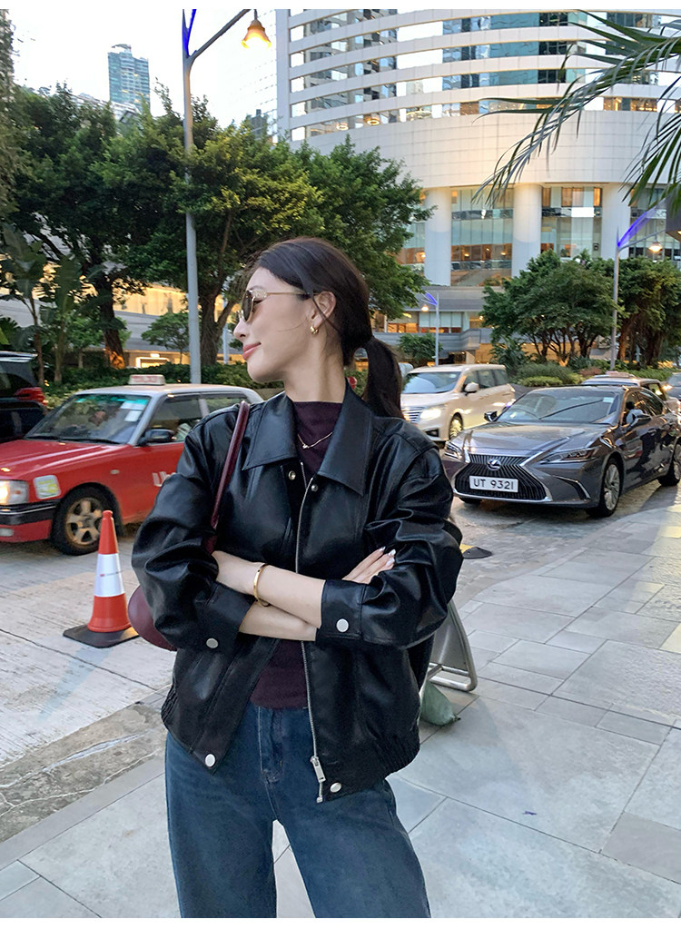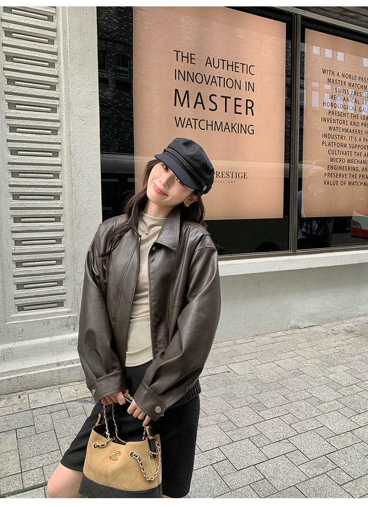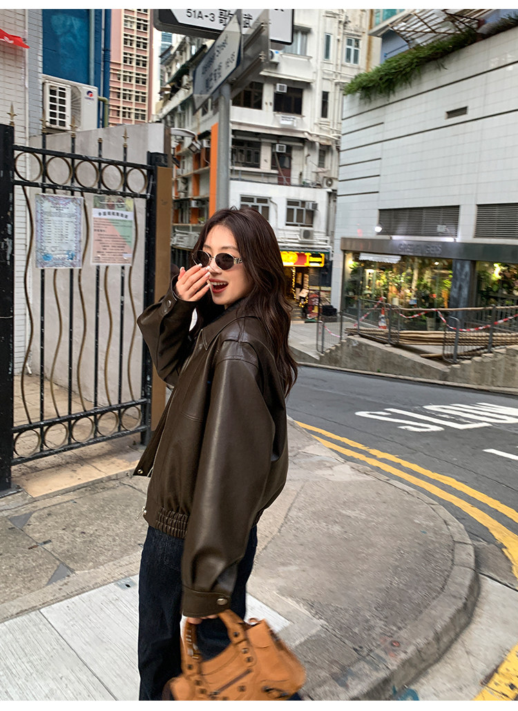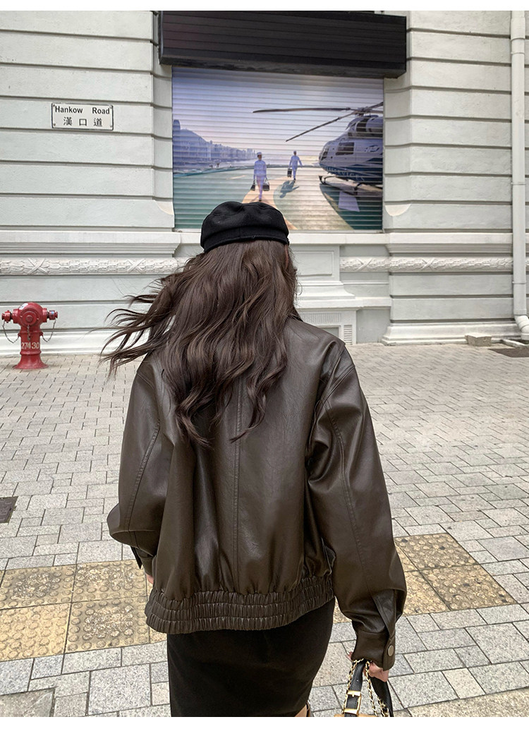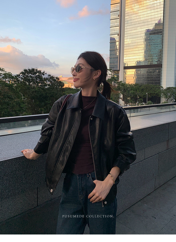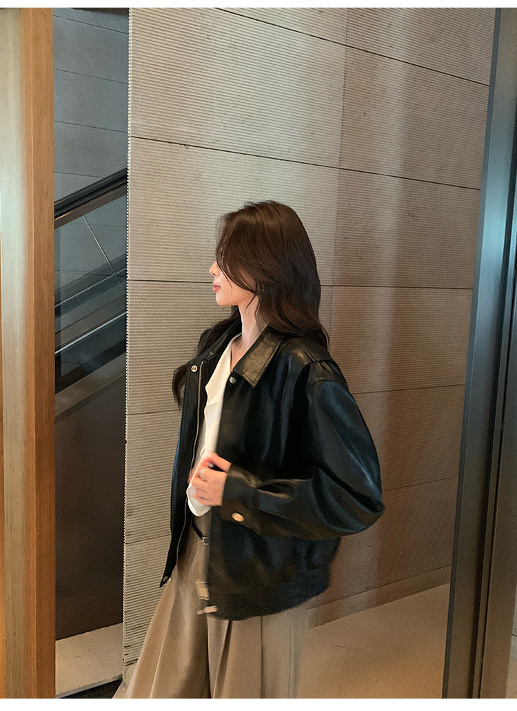 Pusumede Niche Player Retro Lapel Short Pu Leather Jacket for Women, Loose and High-End Silhouette Coat