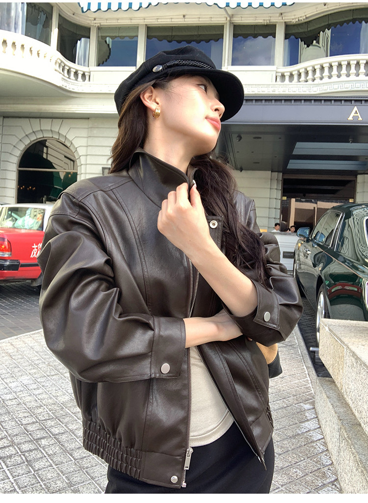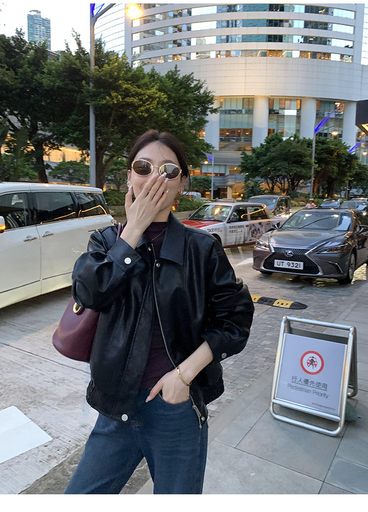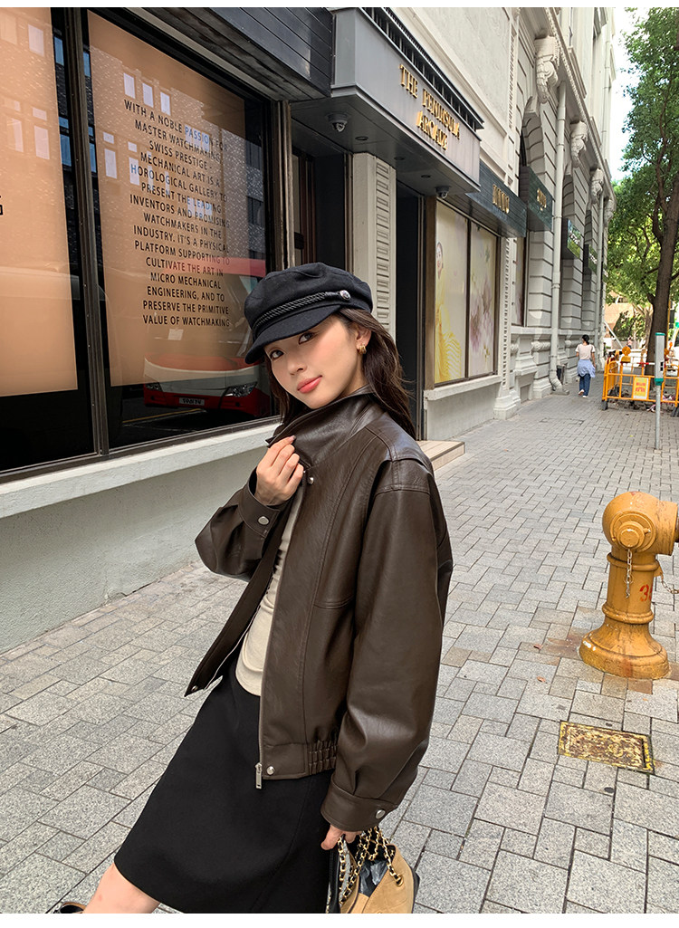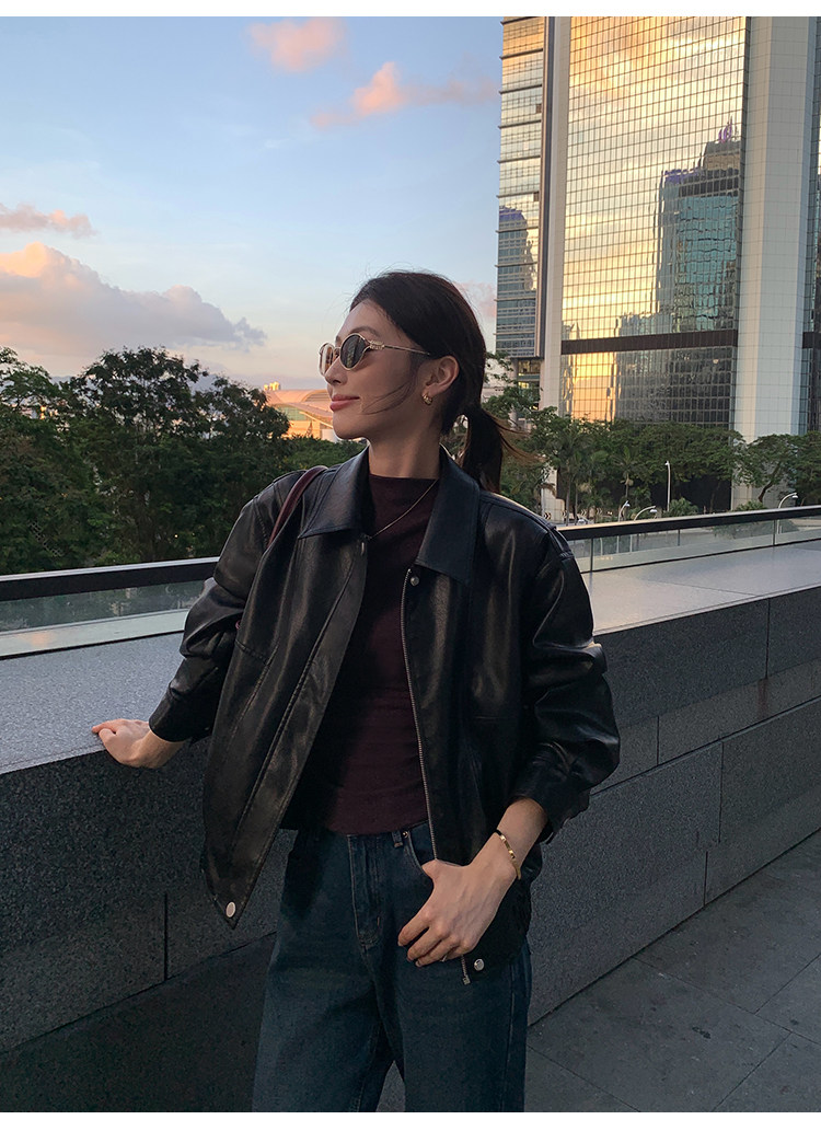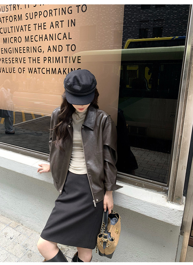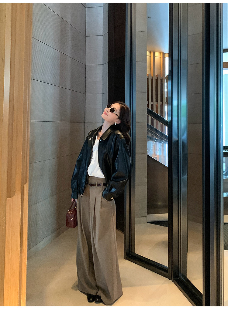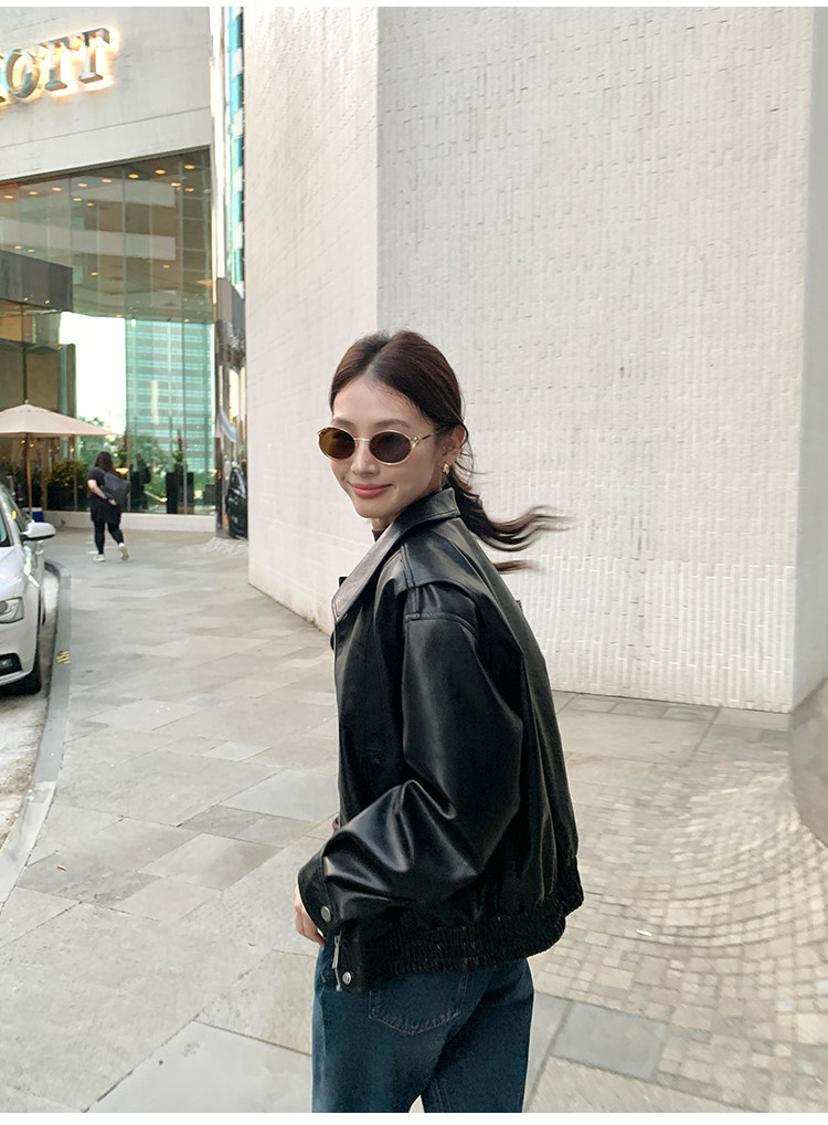 Pusumede Niche Player Retro Lapel Short Pu Leather Jacket for Women, Loose and High-End Silhouette Coat