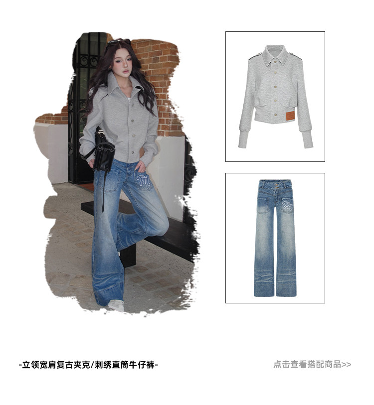 Hytemoly Wide-Shoulder Stand-Up Collar Ribbed Waist-Cinching Hem Vintage Loose Jacket Slimming Casual Versatile Coat Top