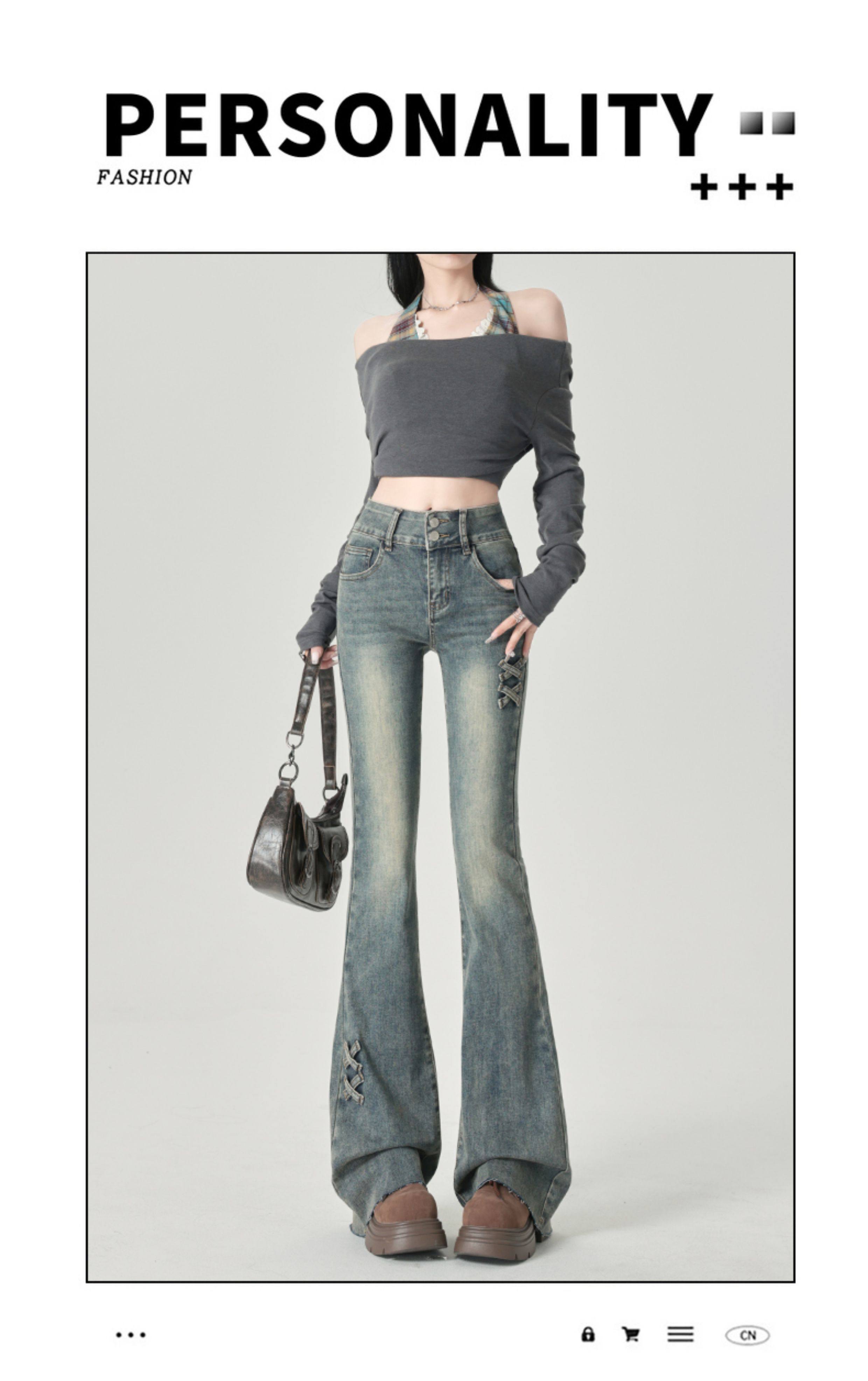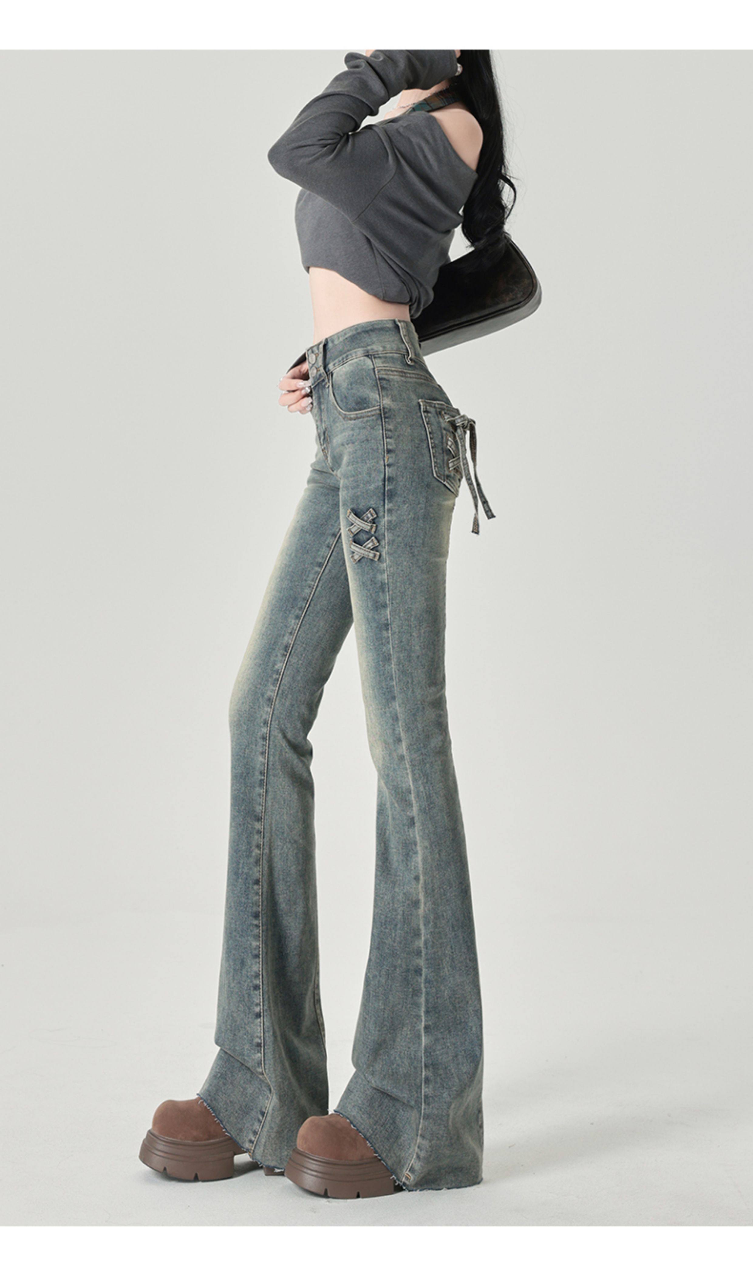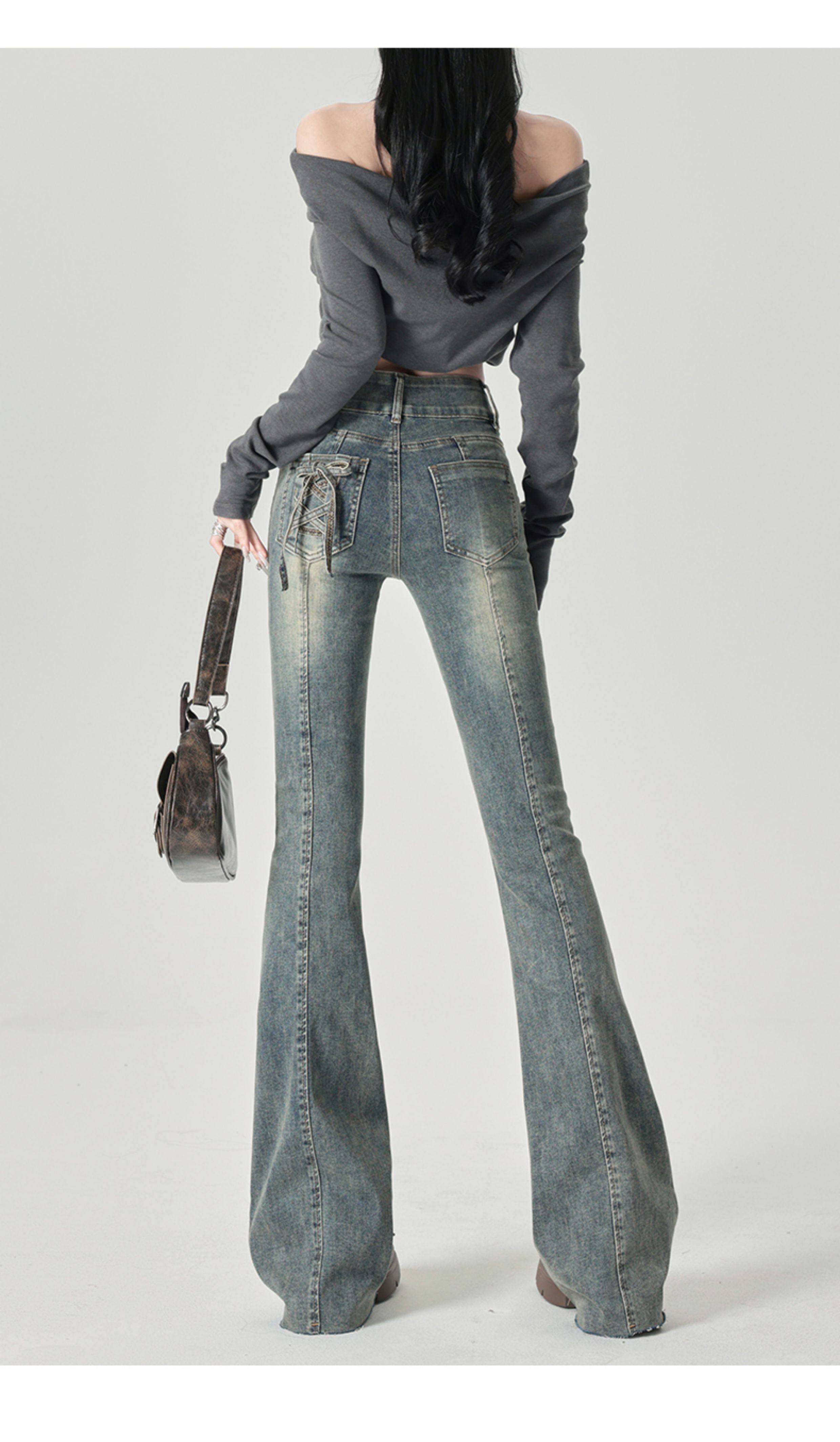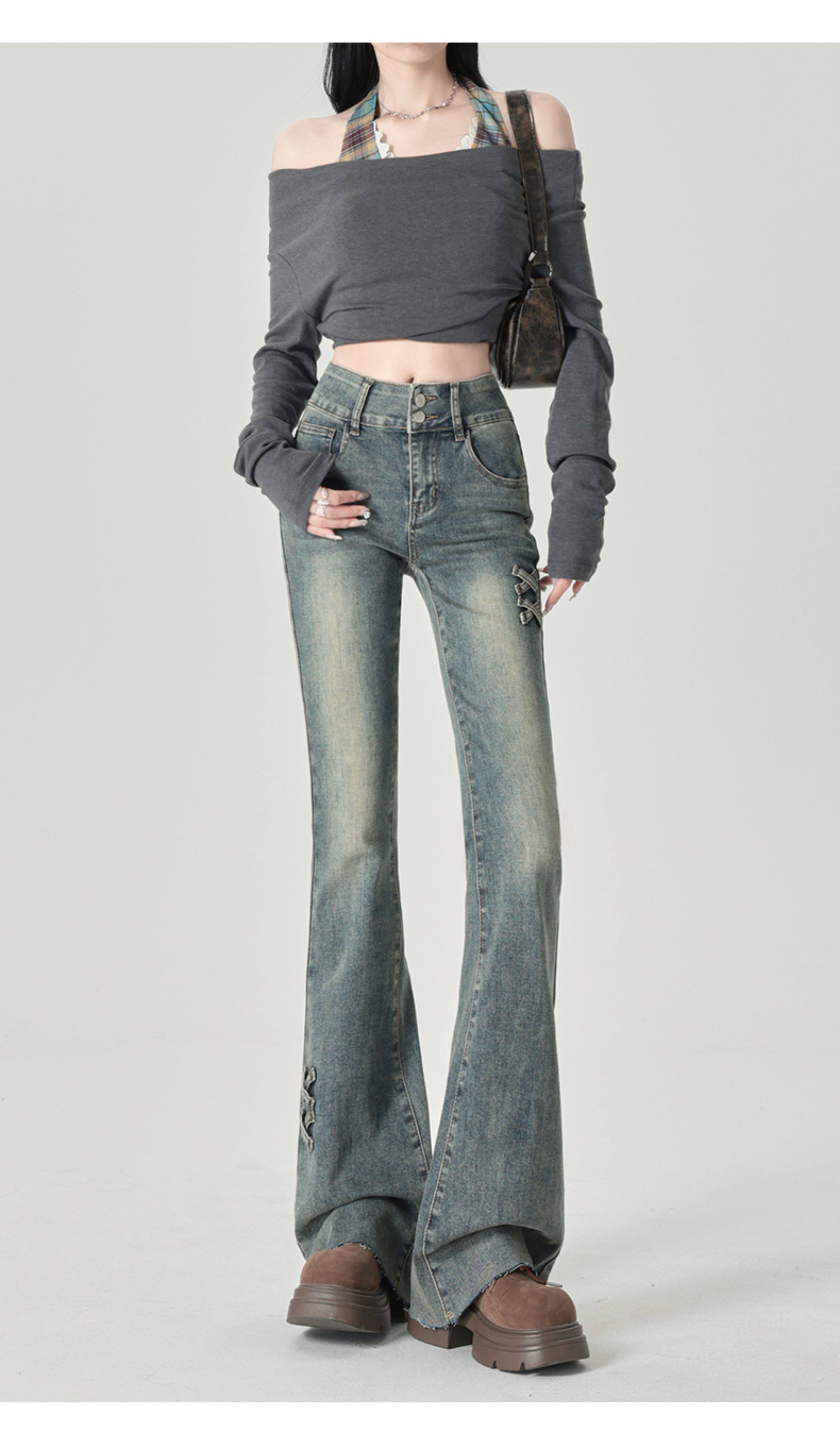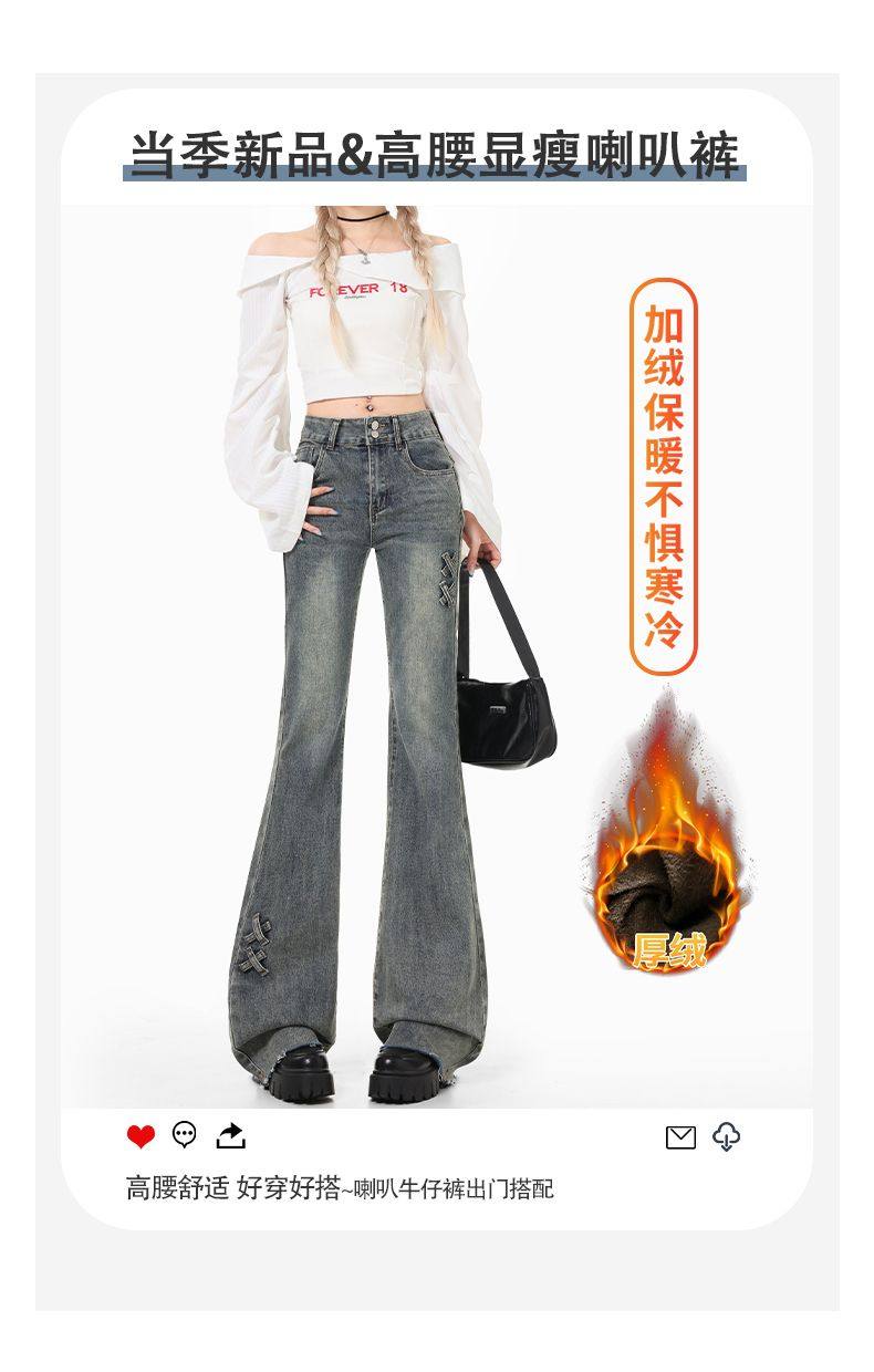 La Chapelle Retro Blue Flared Jeans for Women, Autumn and Winter 2025 New Style, Bow High-Waisted Fleece-Lined Bell-Bottom Pants