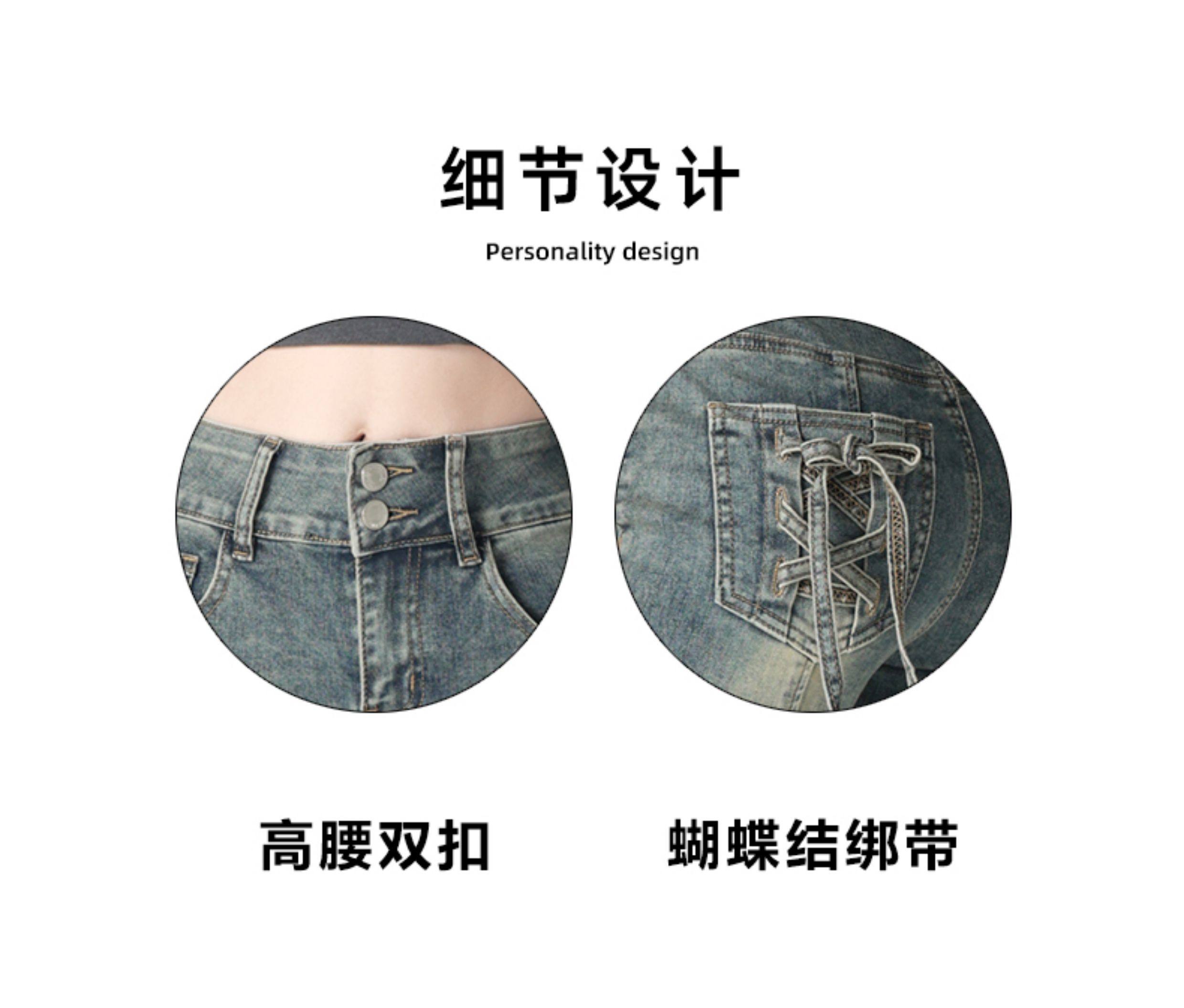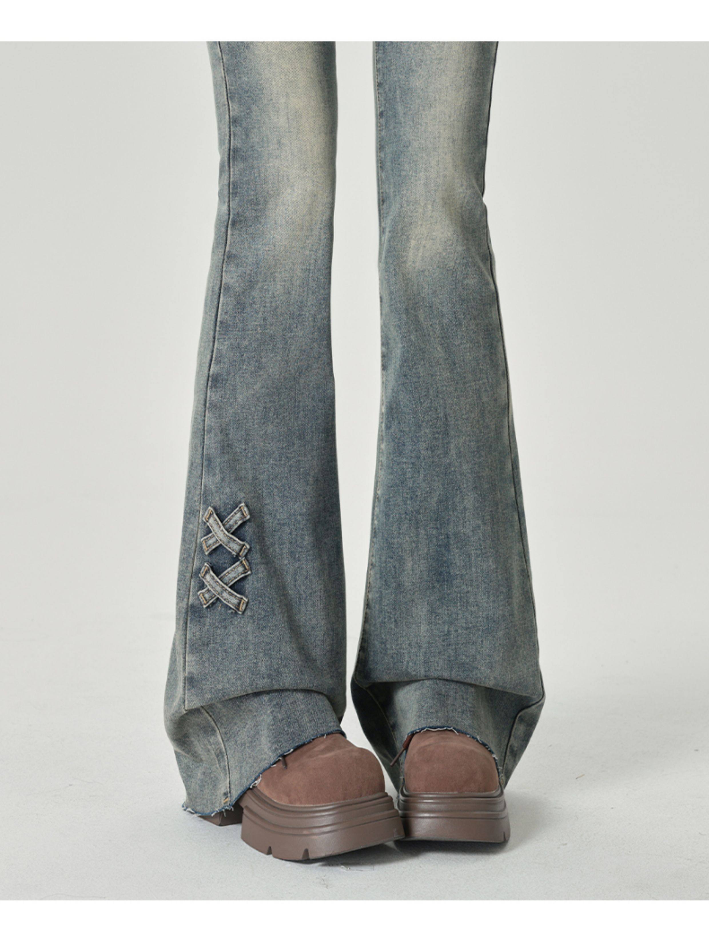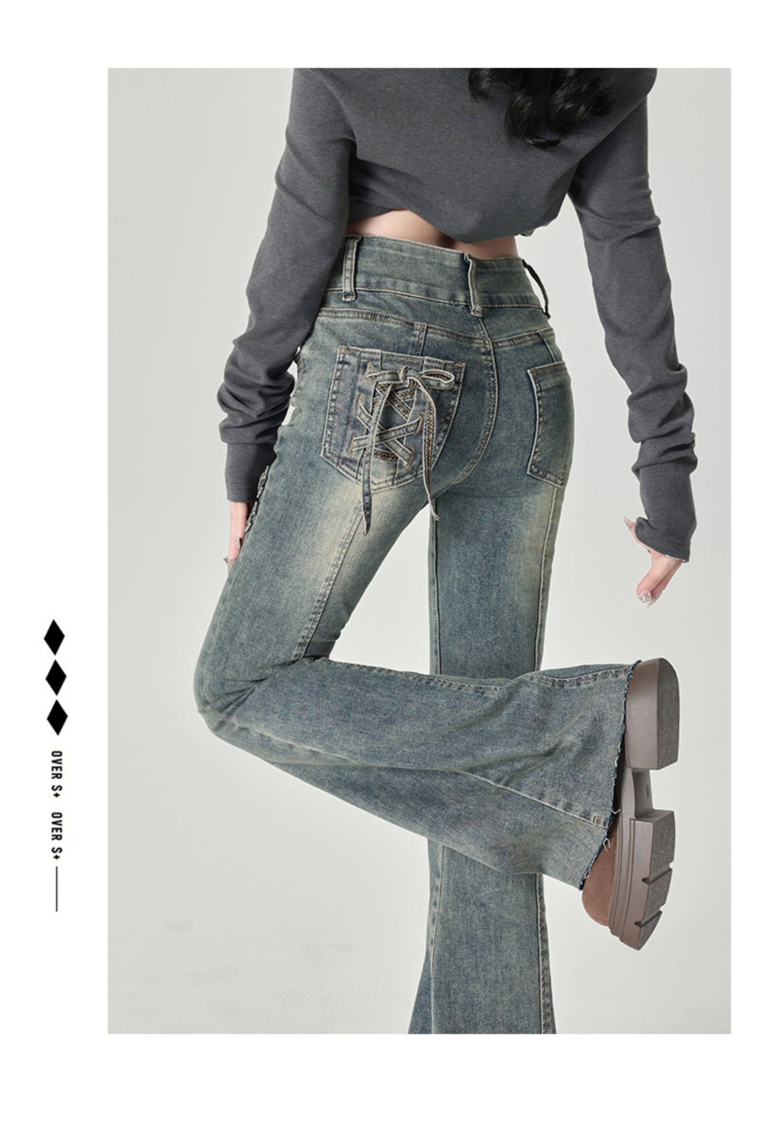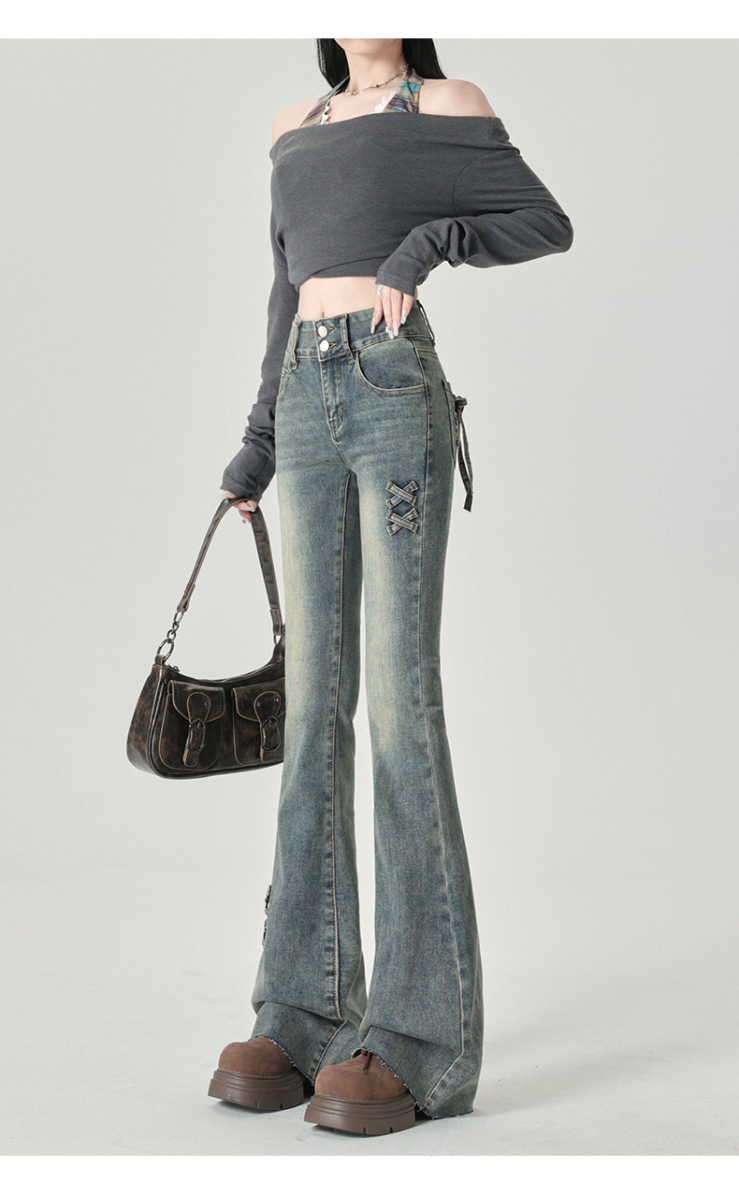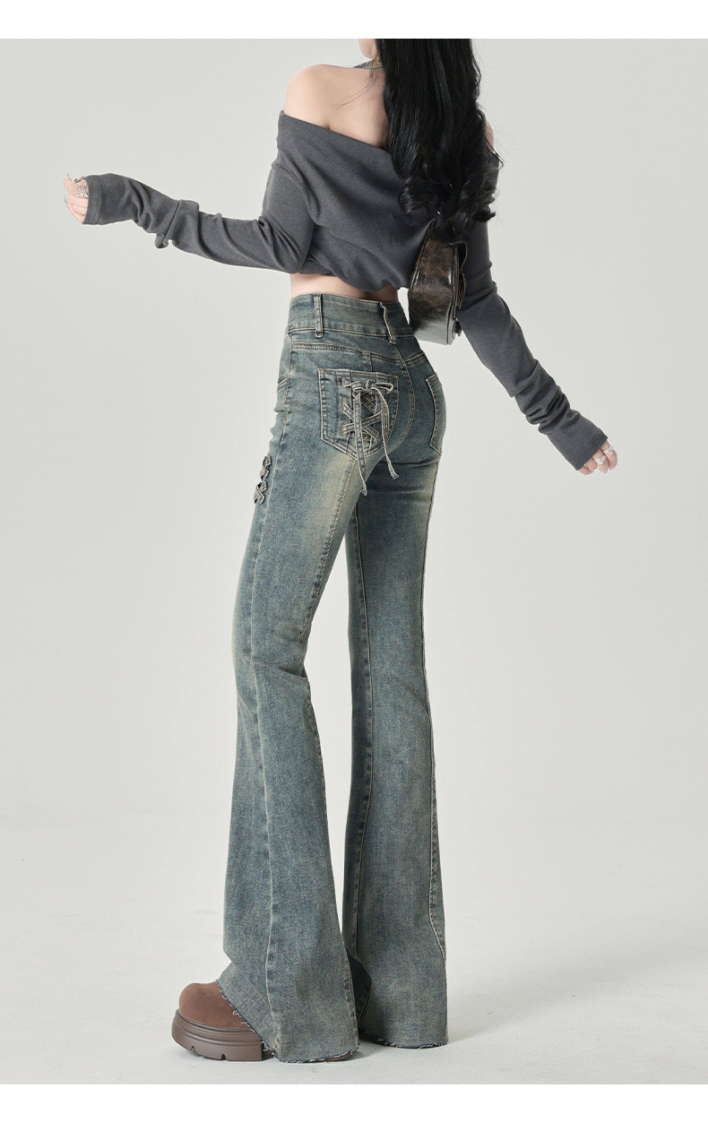 La Chapelle Retro Blue Flared Jeans for Women, Autumn and Winter 2025 New Style, Bow High-Waisted Fleece-Lined Bell-Bottom Pants