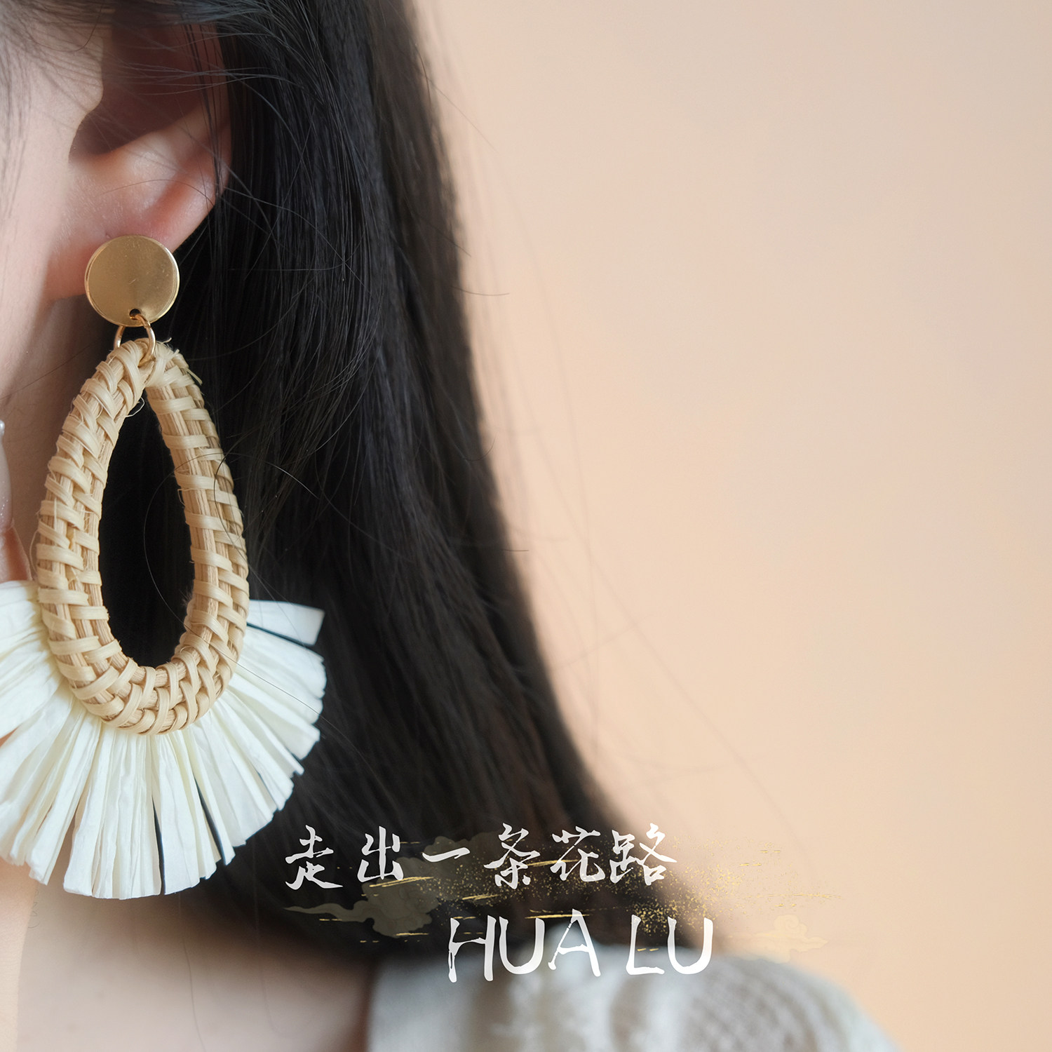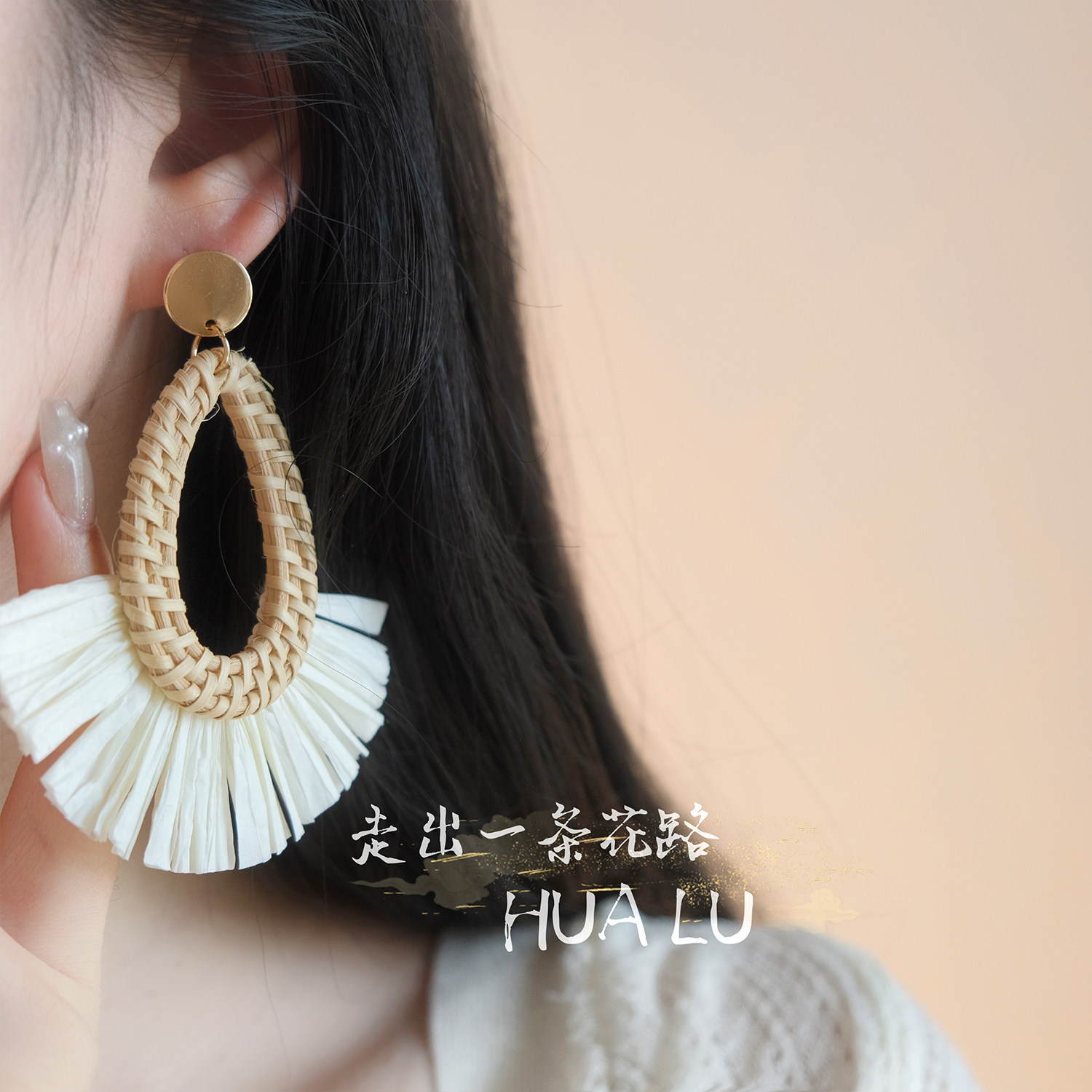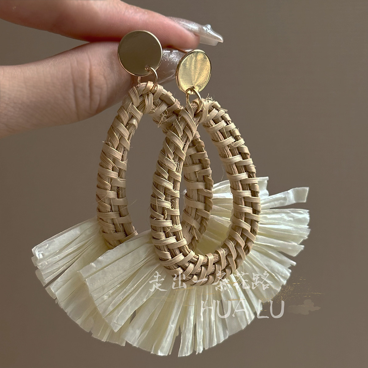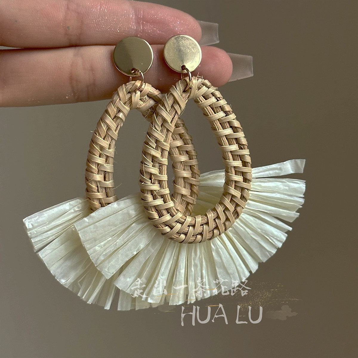 Hualu-Rattan Skirt~ Exaggerated Fan-Shaped Holiday Ethnic Style Beach Retro Seaside Earrings Mosquito Coil Ear Clips