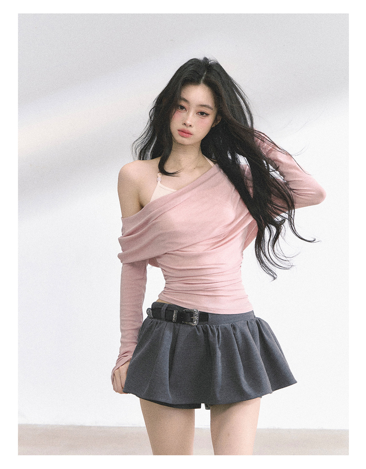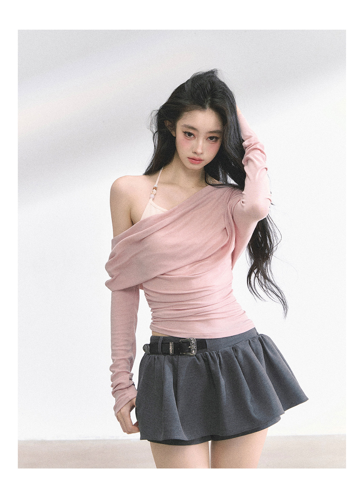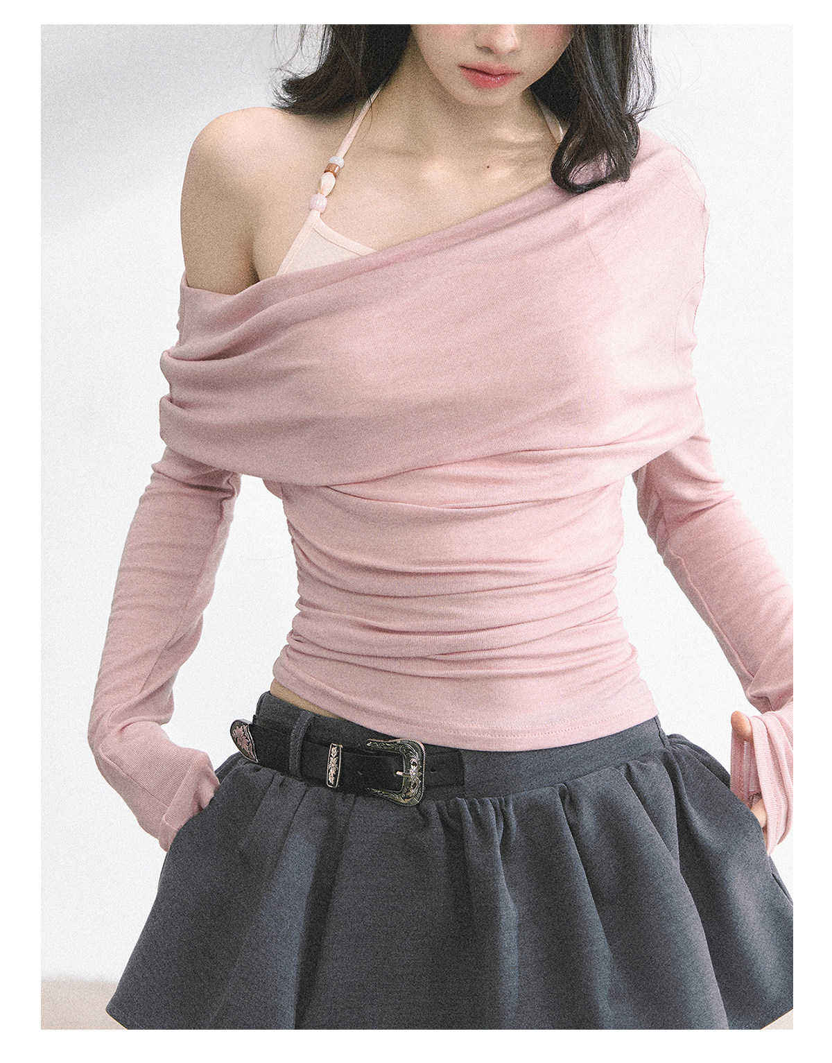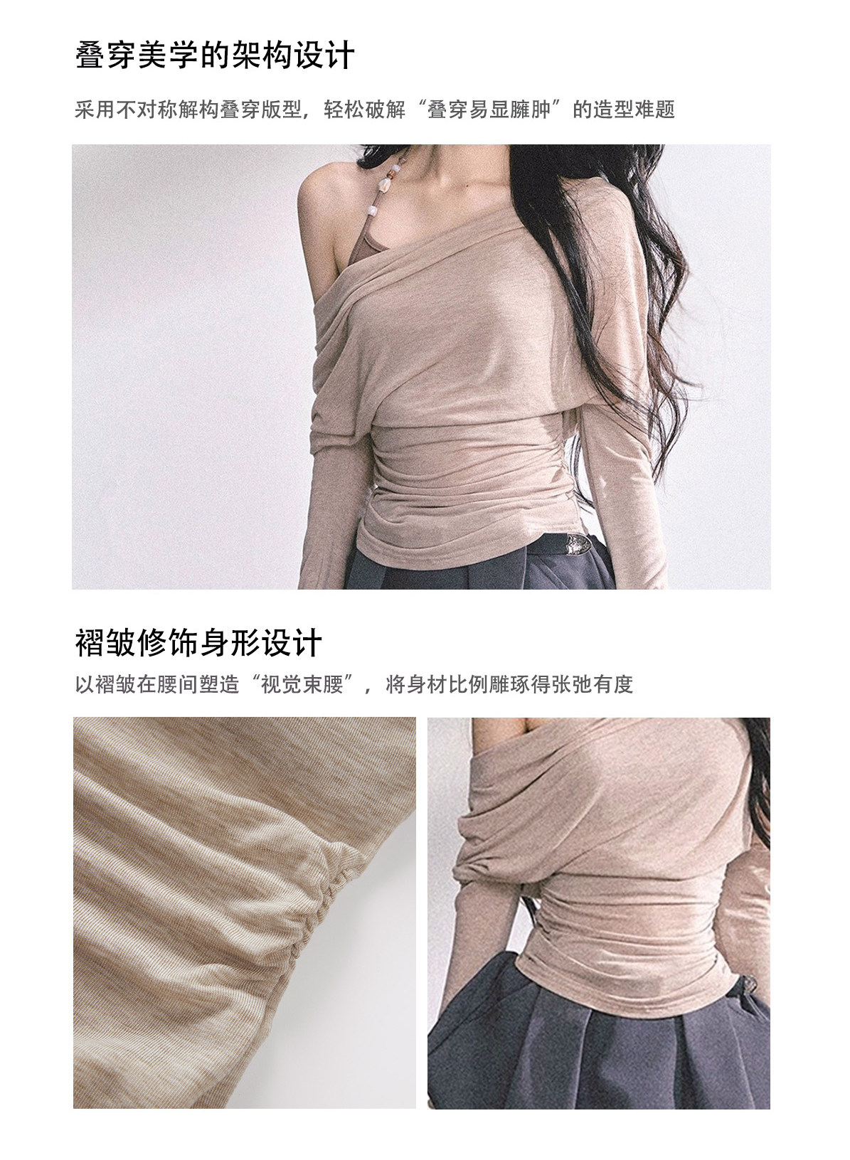 Aomalm Youthful and Soft Whispering Style % Fake Two-Piece Korean Style Off-Shoulder Spicy Girl T-Shirt for Women, Summer Long-Sleeve Commuter Top