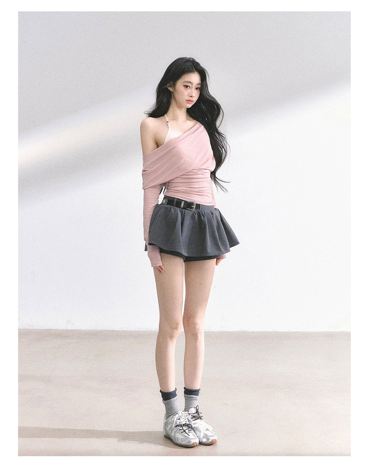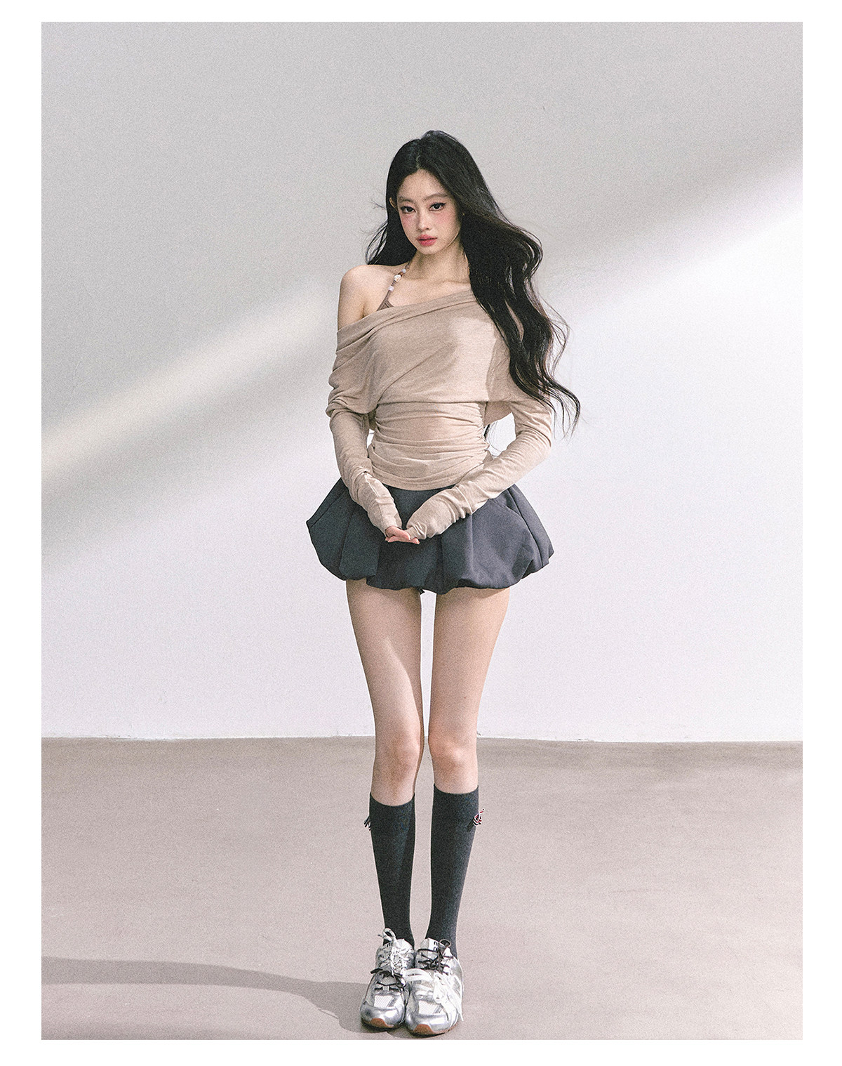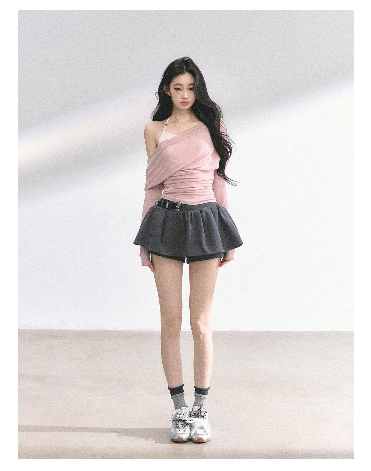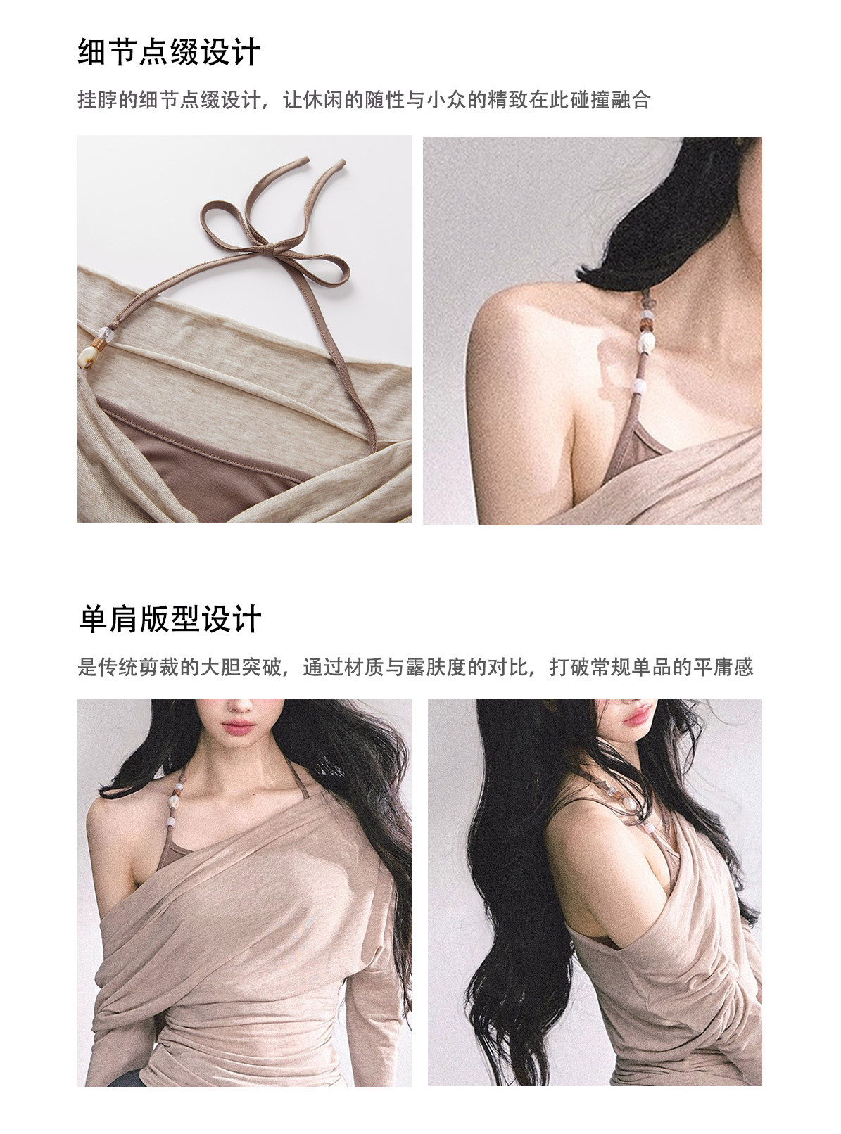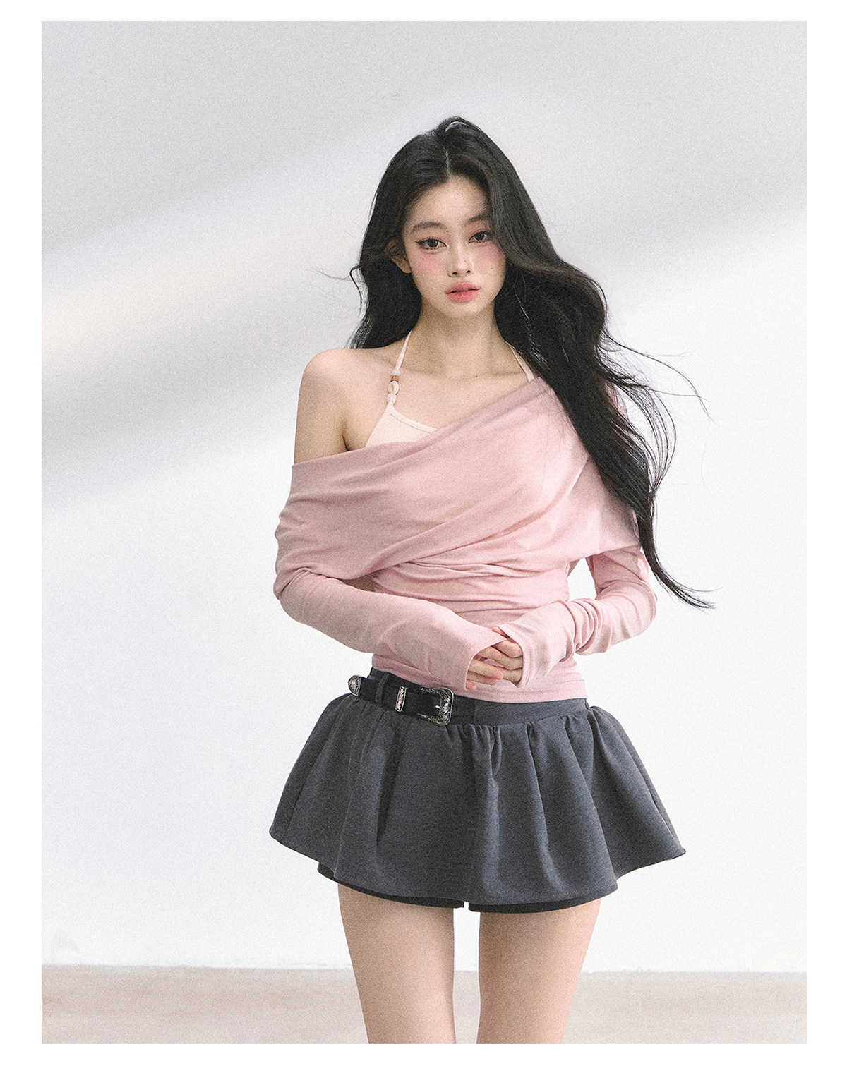 Aomalm Youthful and Soft Whispering Style % Fake Two-Piece Korean Style Off-Shoulder Spicy Girl T-Shirt for Women, Summer Long-Sleeve Commuter Top