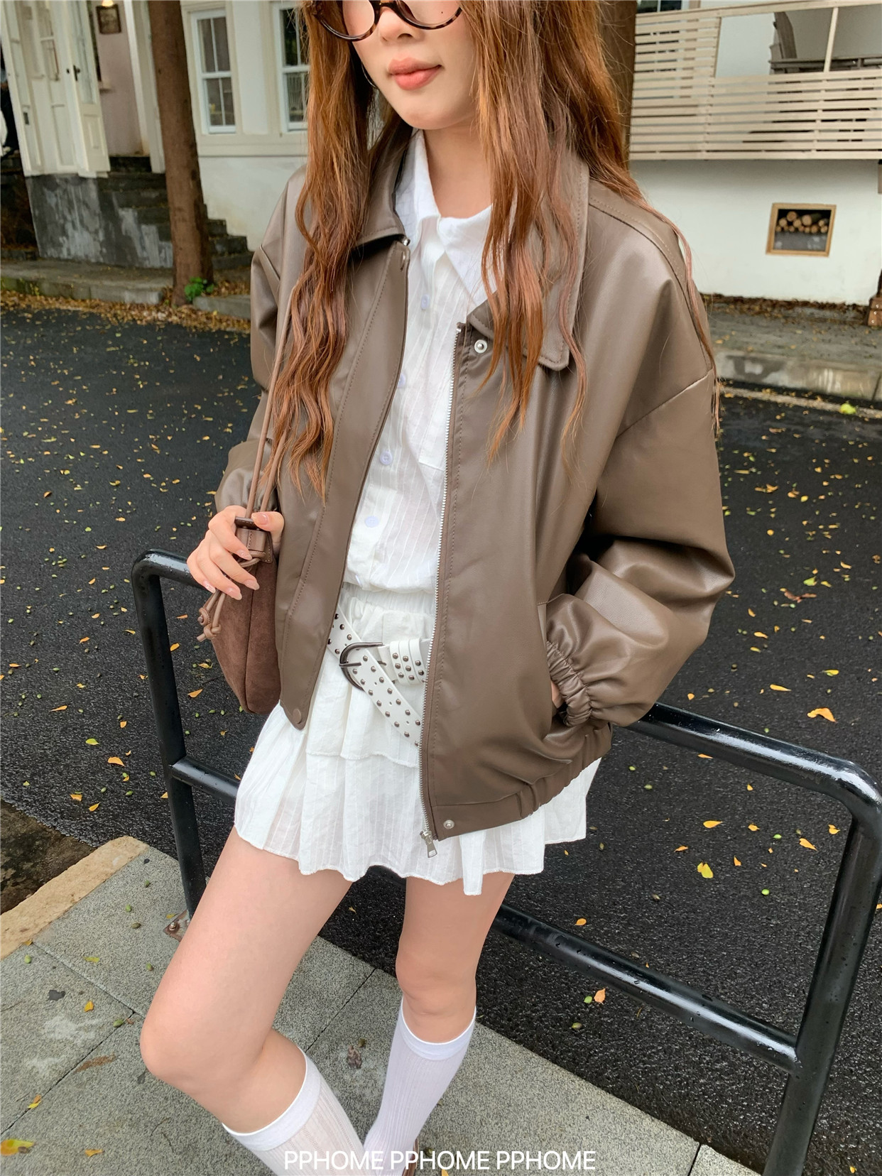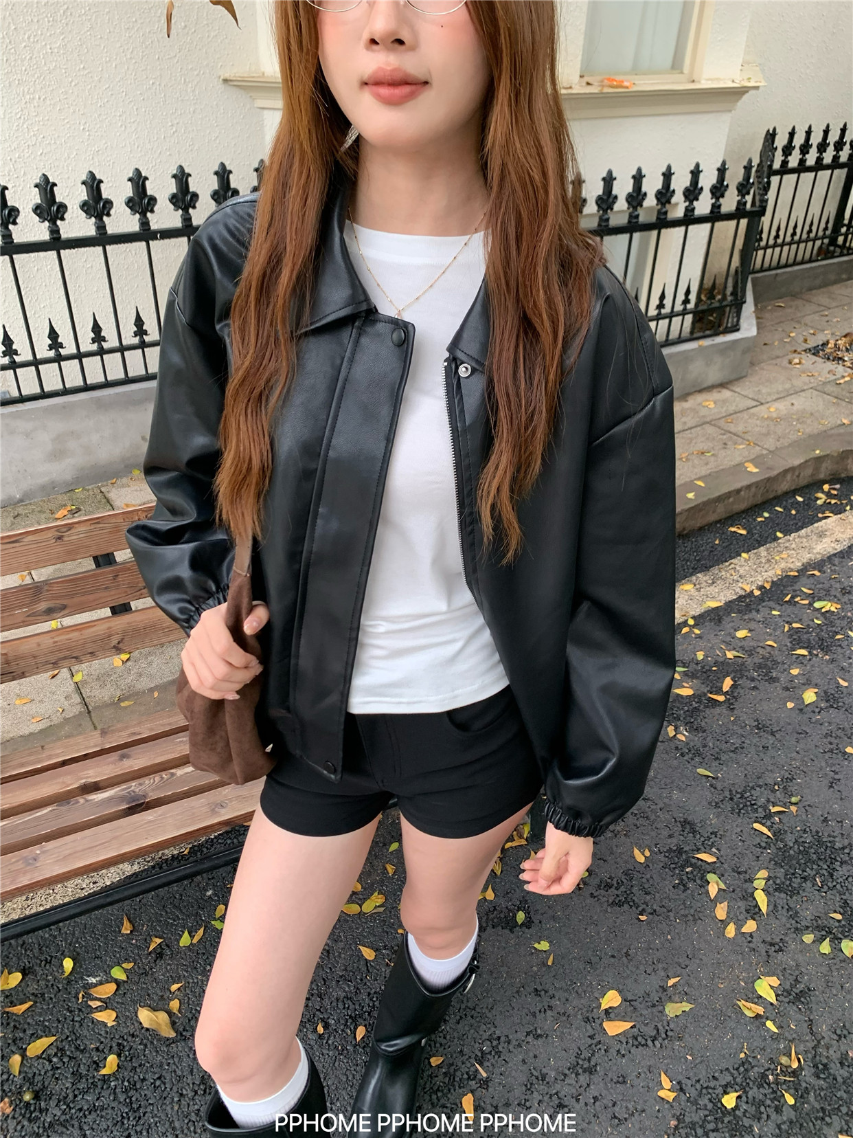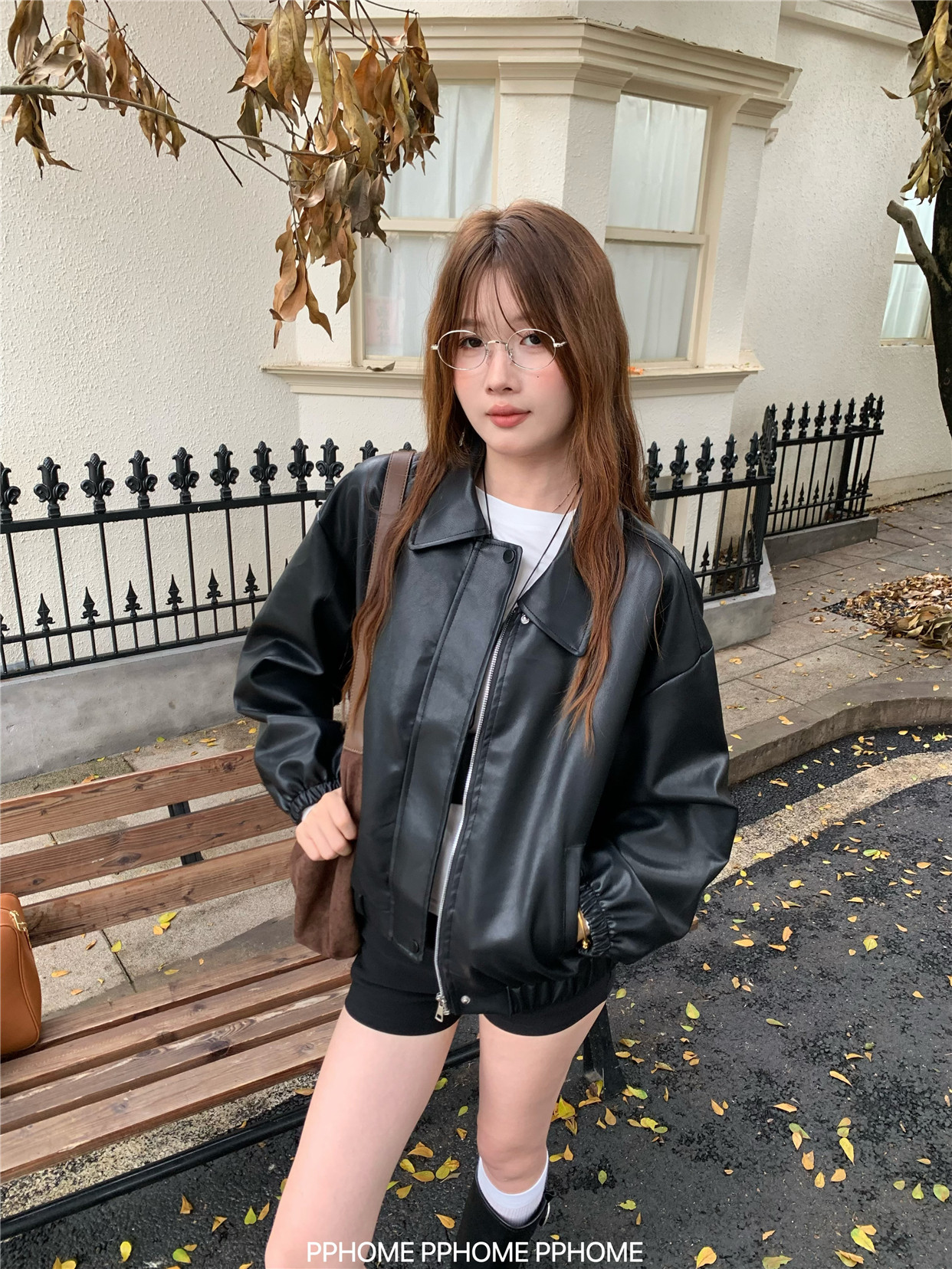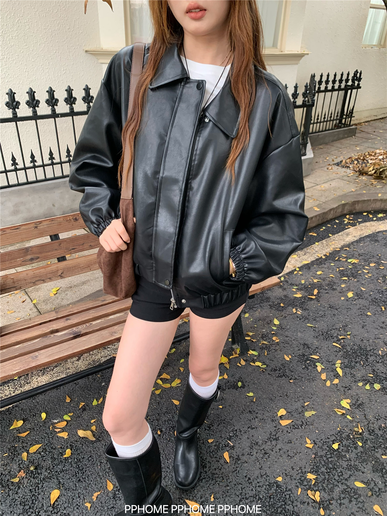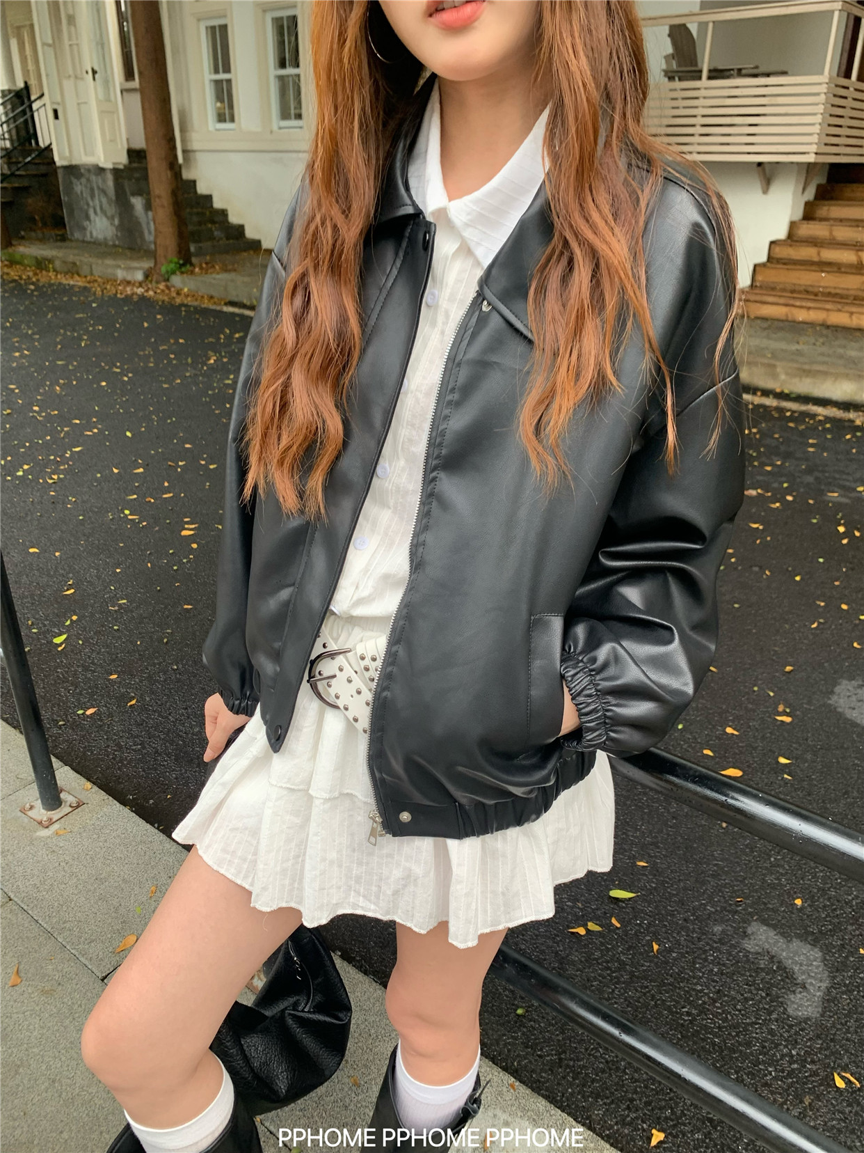 Pphome LAOSHU ~ American Style Girl Retro Leather Jacket Women's Autumn and Winter Pu Leather Loose Long-Sleeved Top
