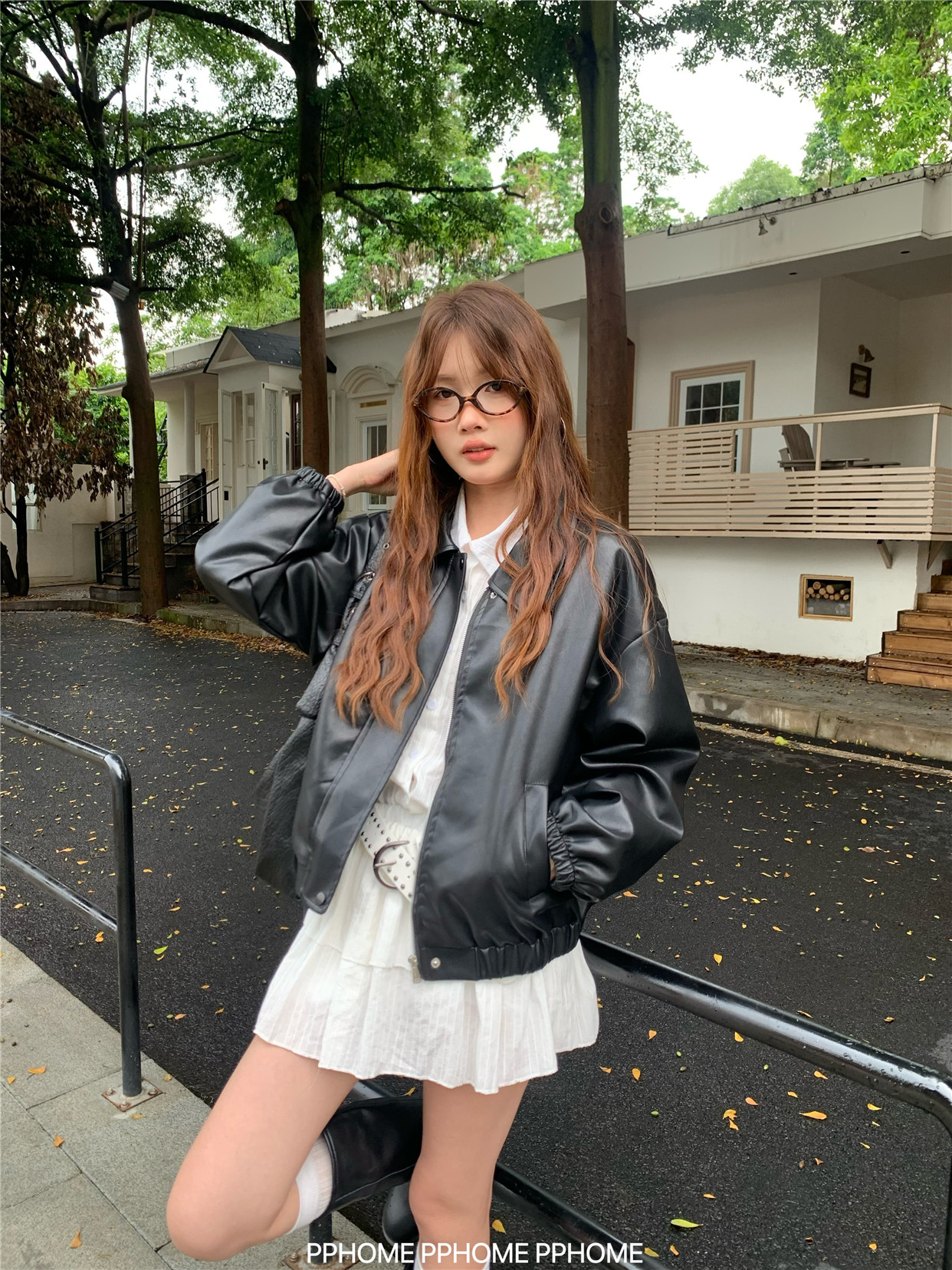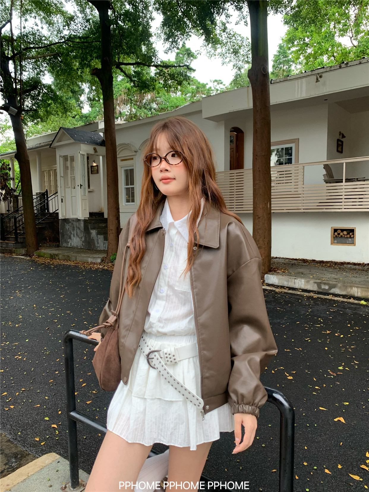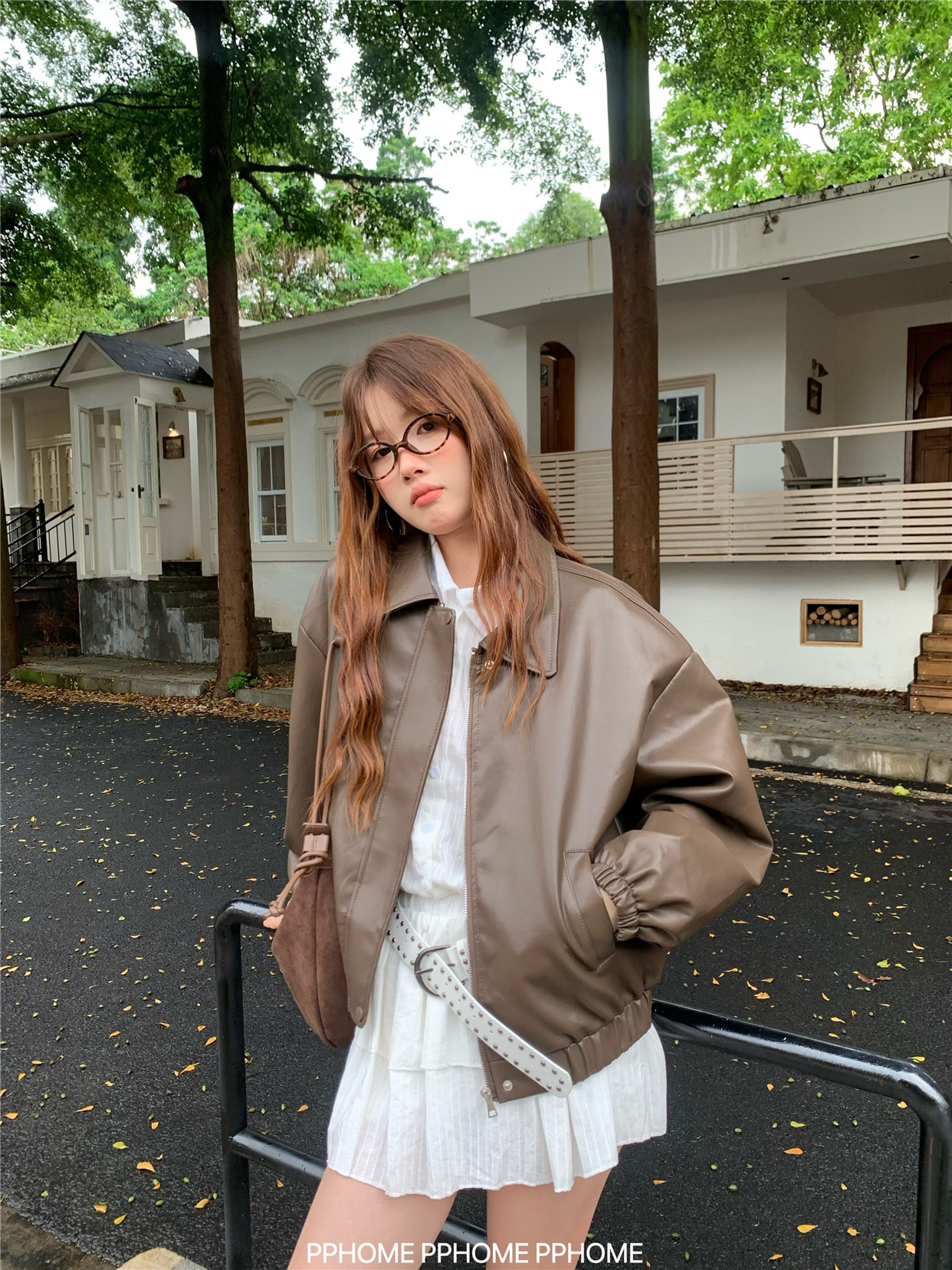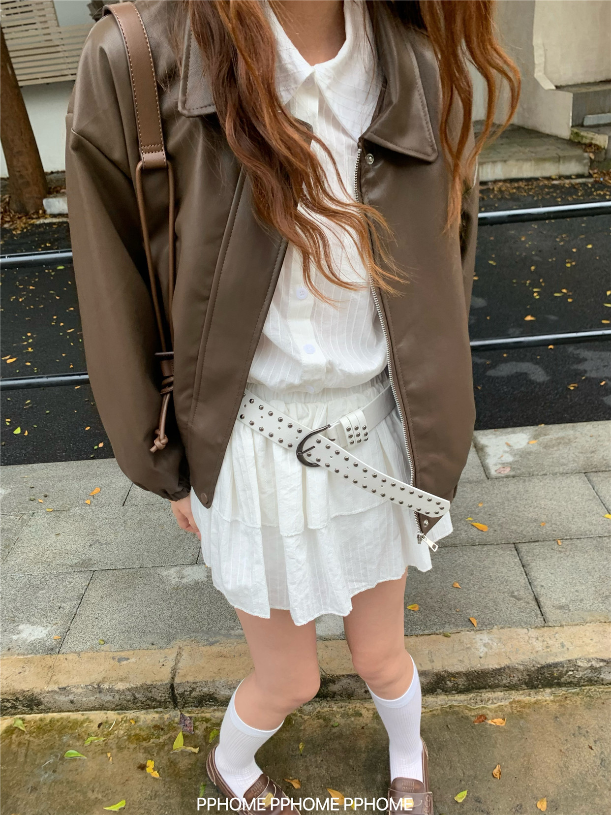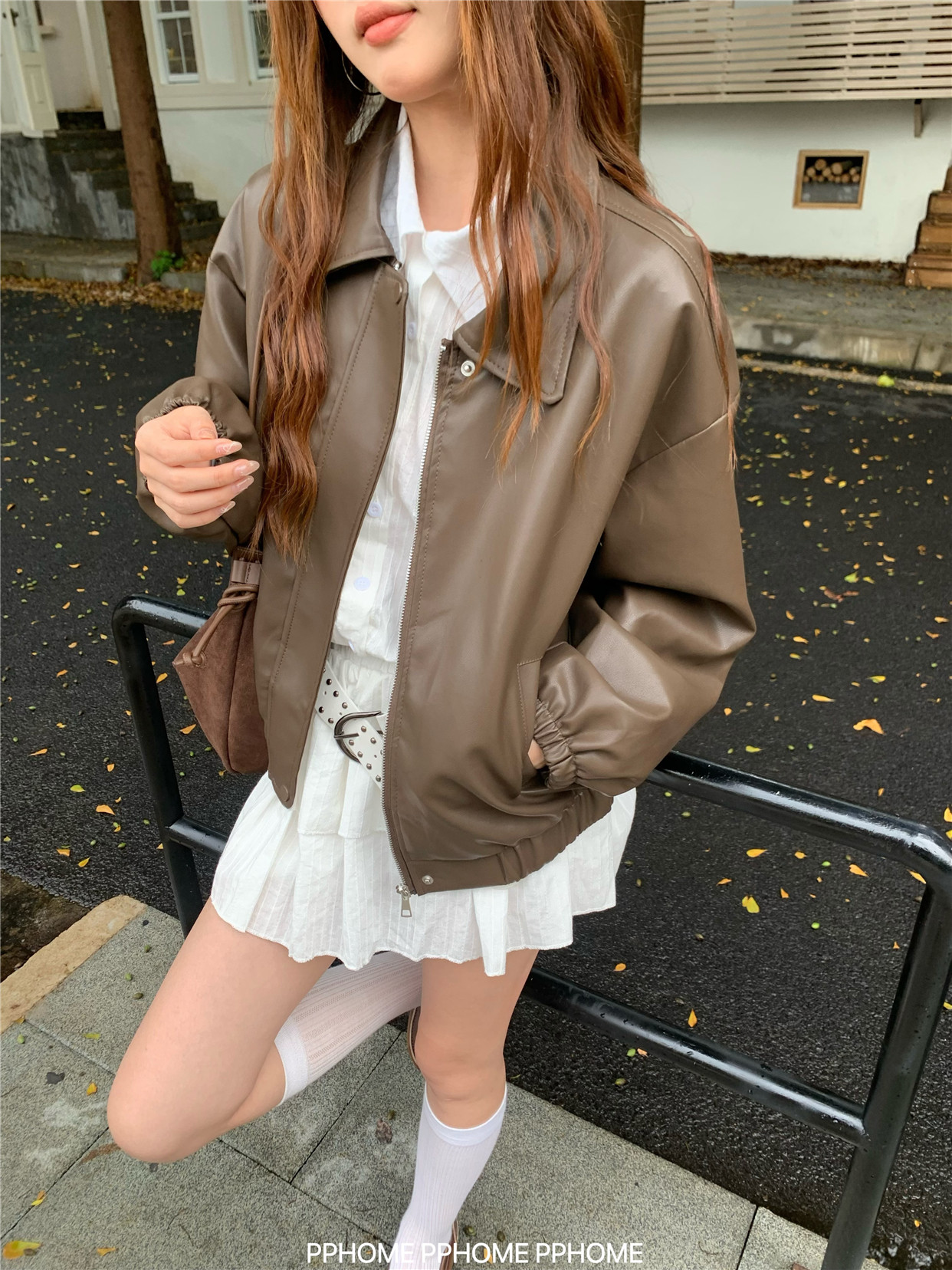 Pphome LAOSHU ~ American Style Girl Retro Leather Jacket Women's Autumn and Winter Pu Leather Loose Long-Sleeved Top