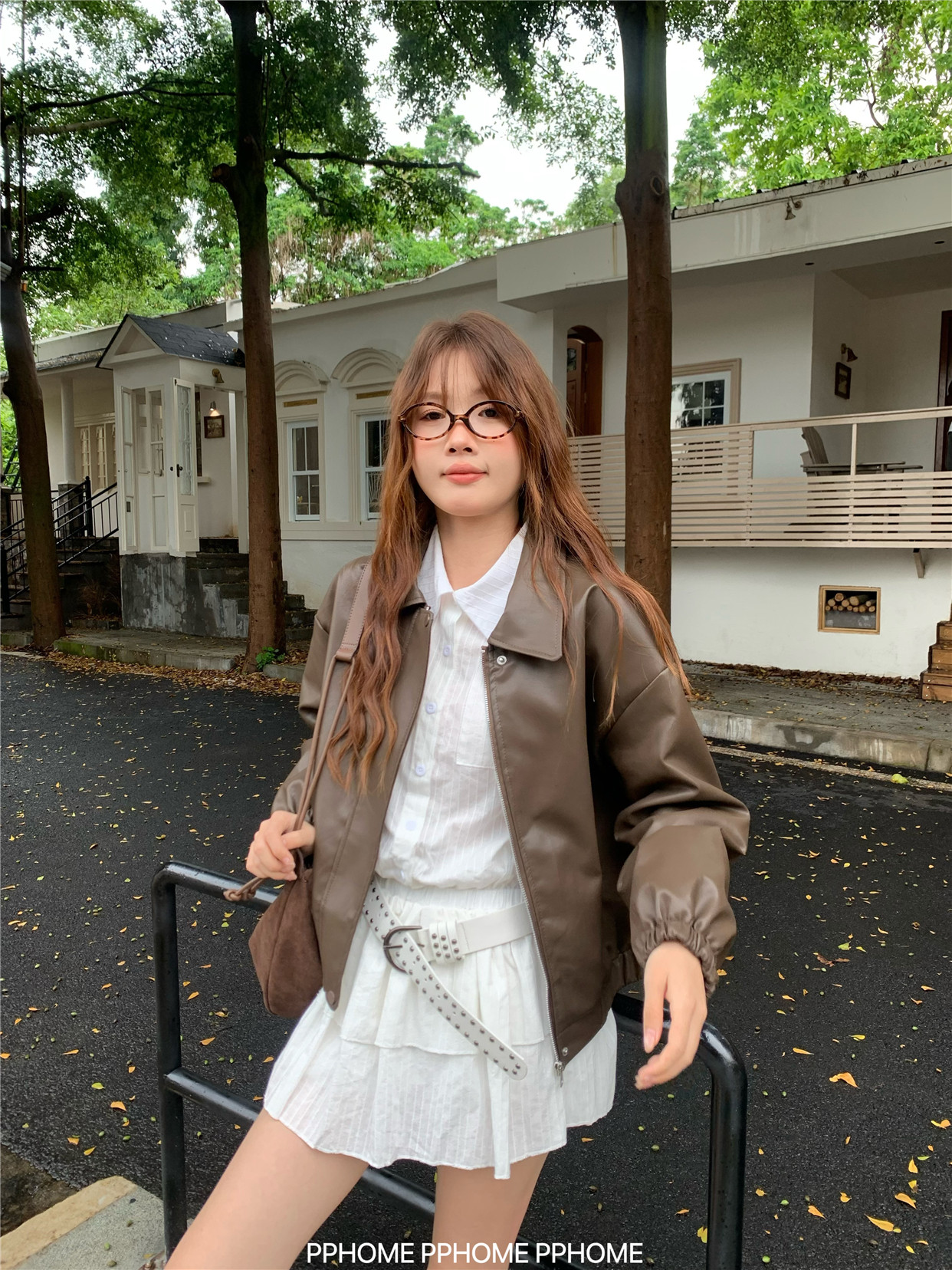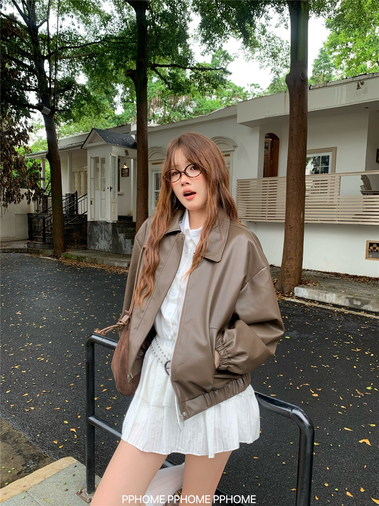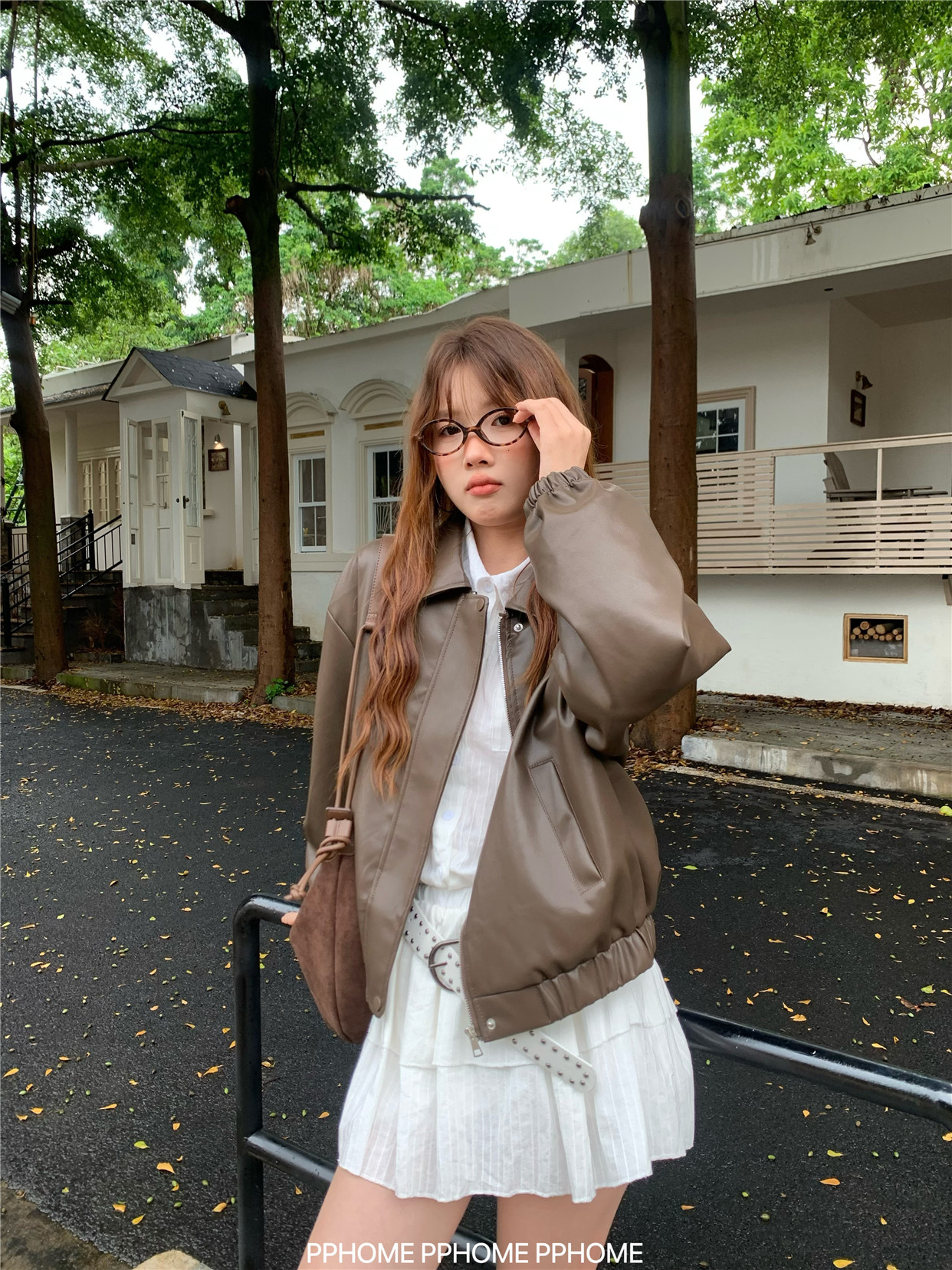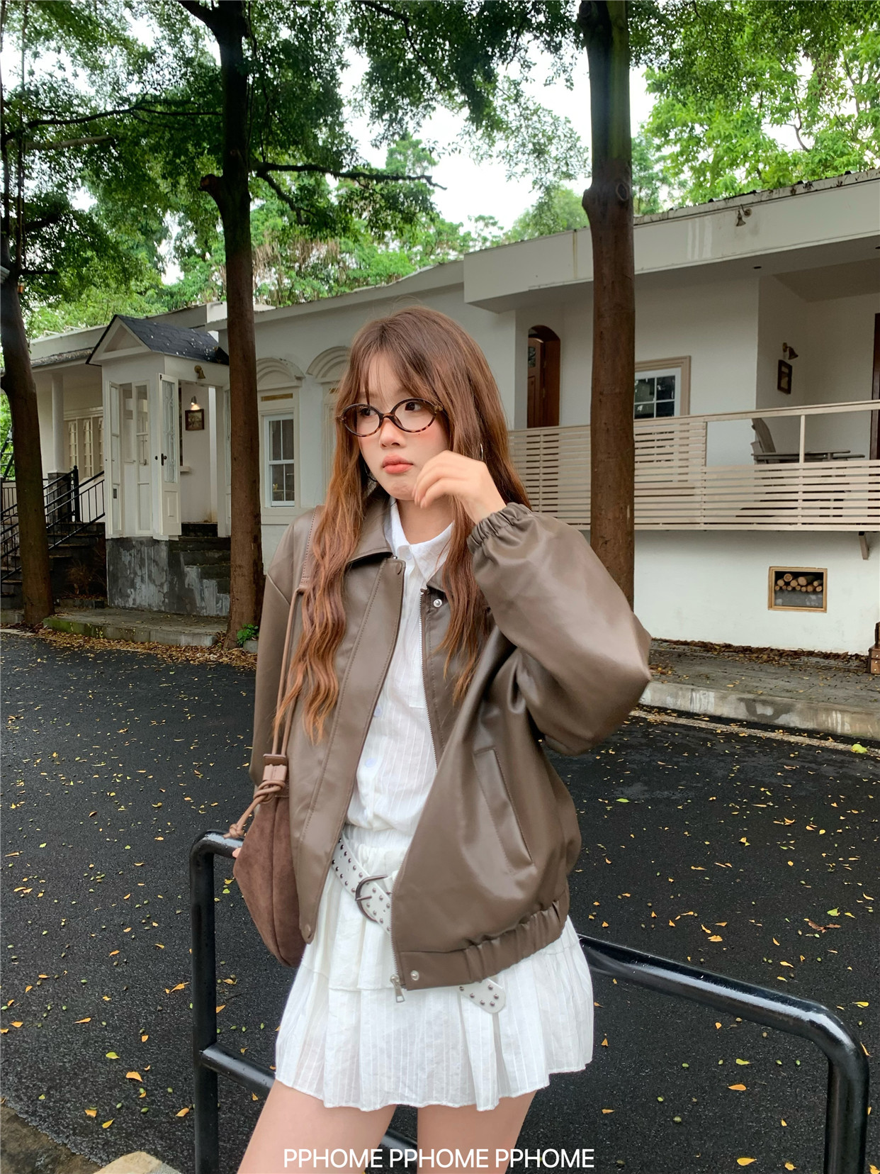 Pphome LAOSHU ~ American Style Girl Retro Leather Jacket Women's Autumn and Winter Pu Leather Loose Long-Sleeved Top