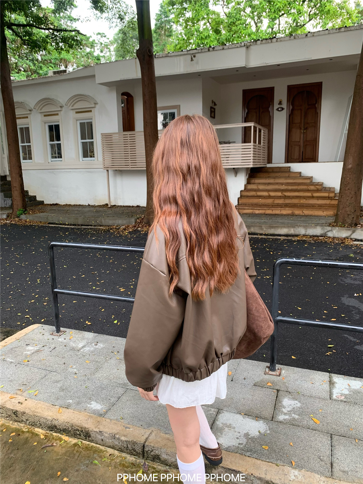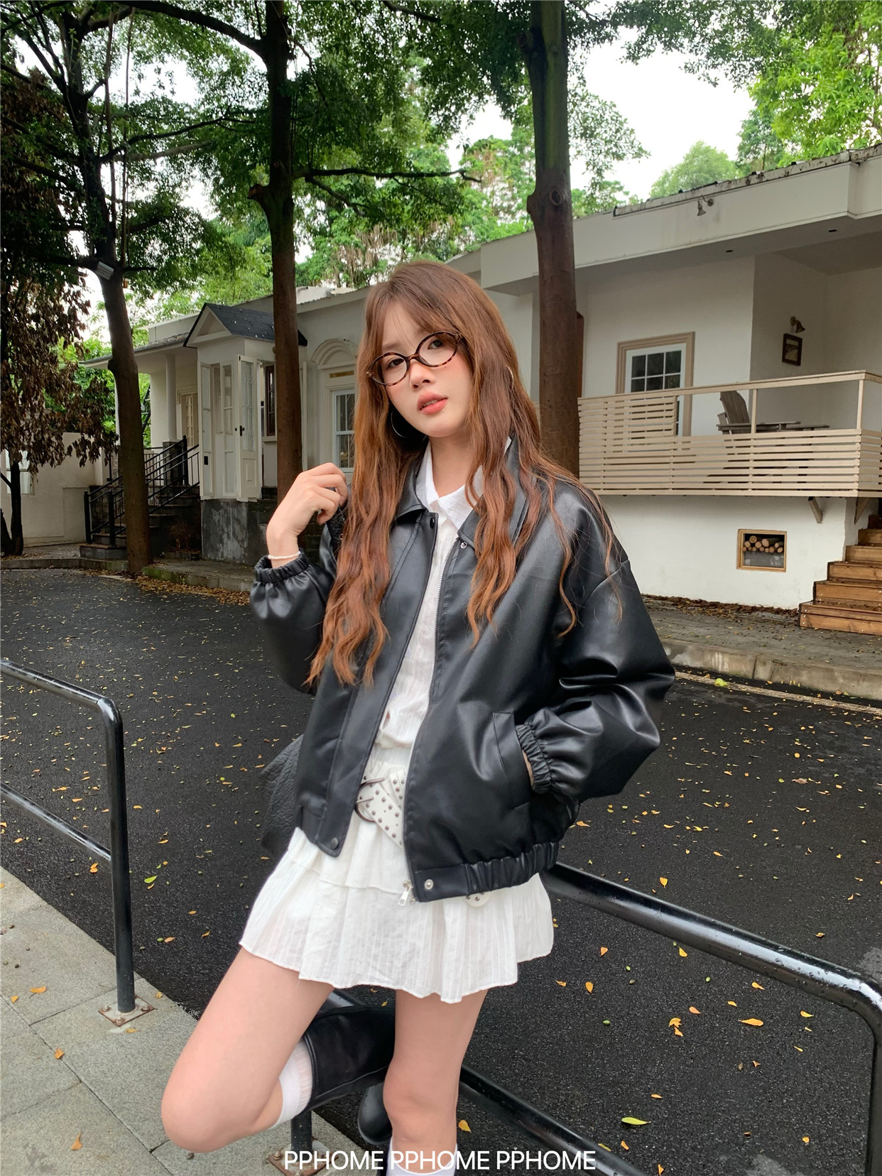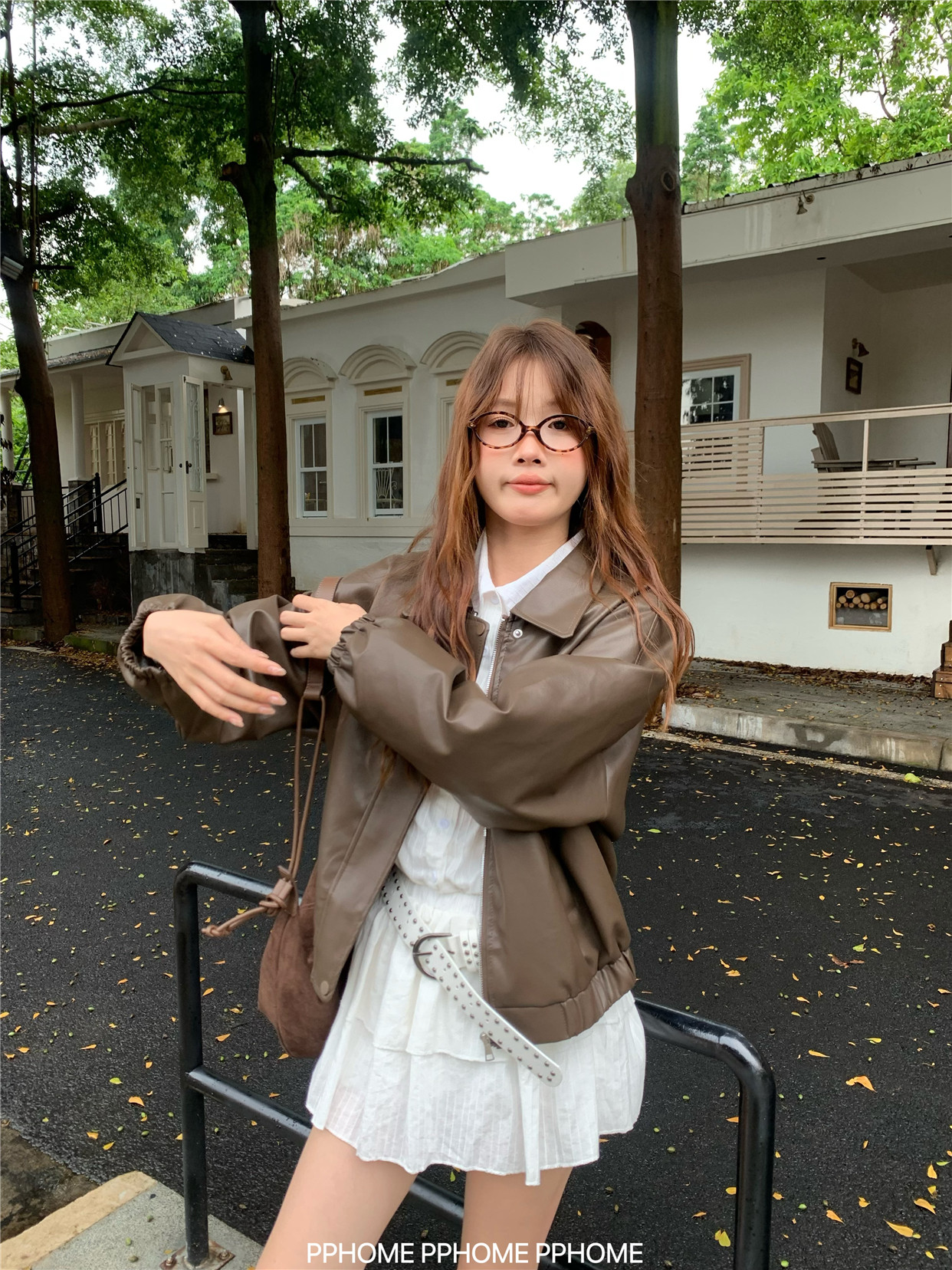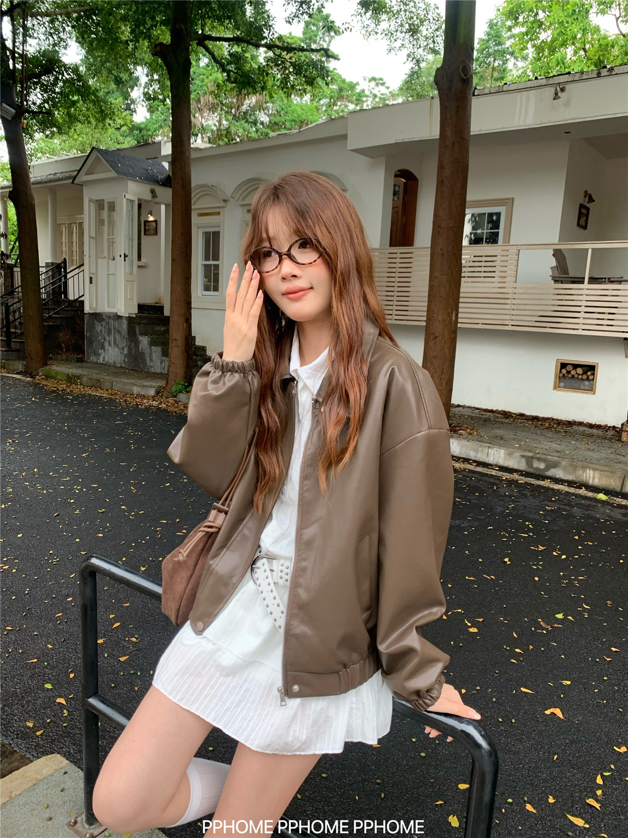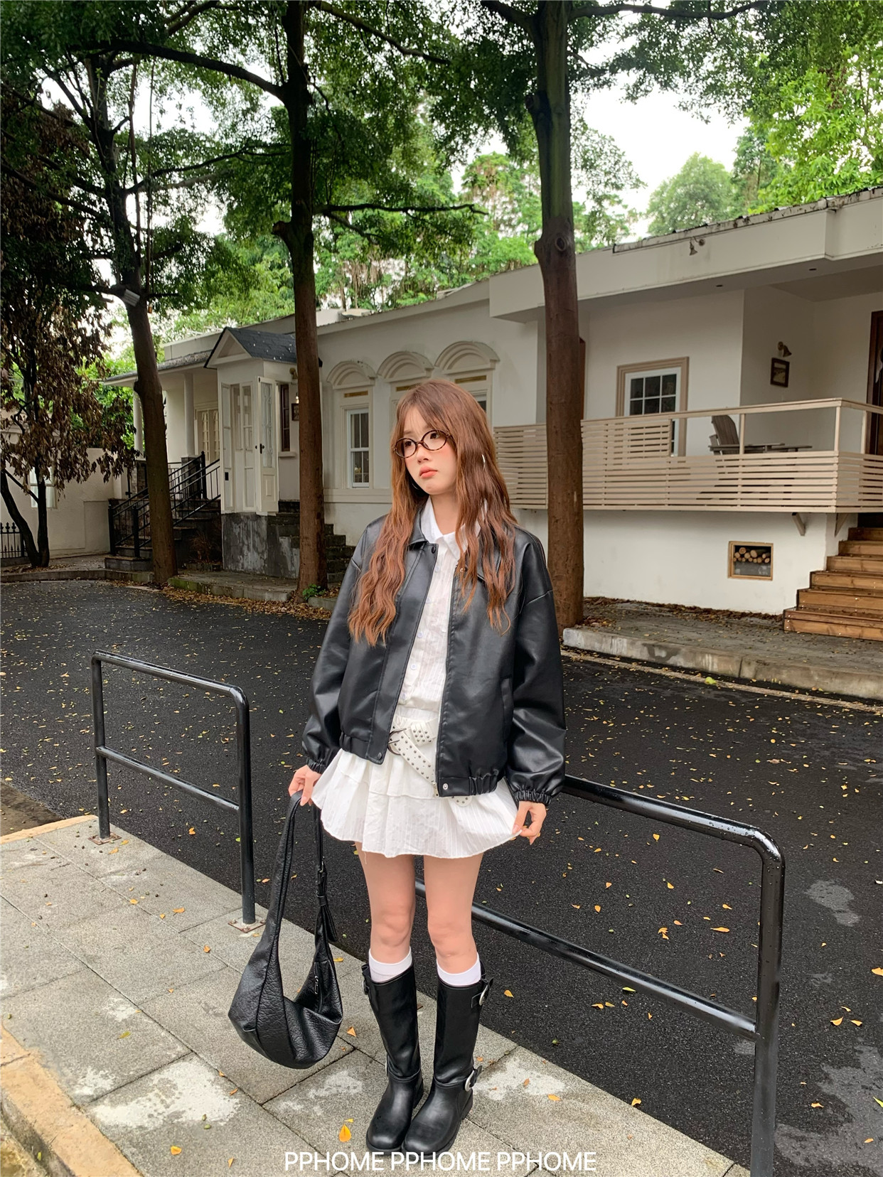 Pphome LAOSHU ~ American Style Girl Retro Leather Jacket Women's Autumn and Winter Pu Leather Loose Long-Sleeved Top
