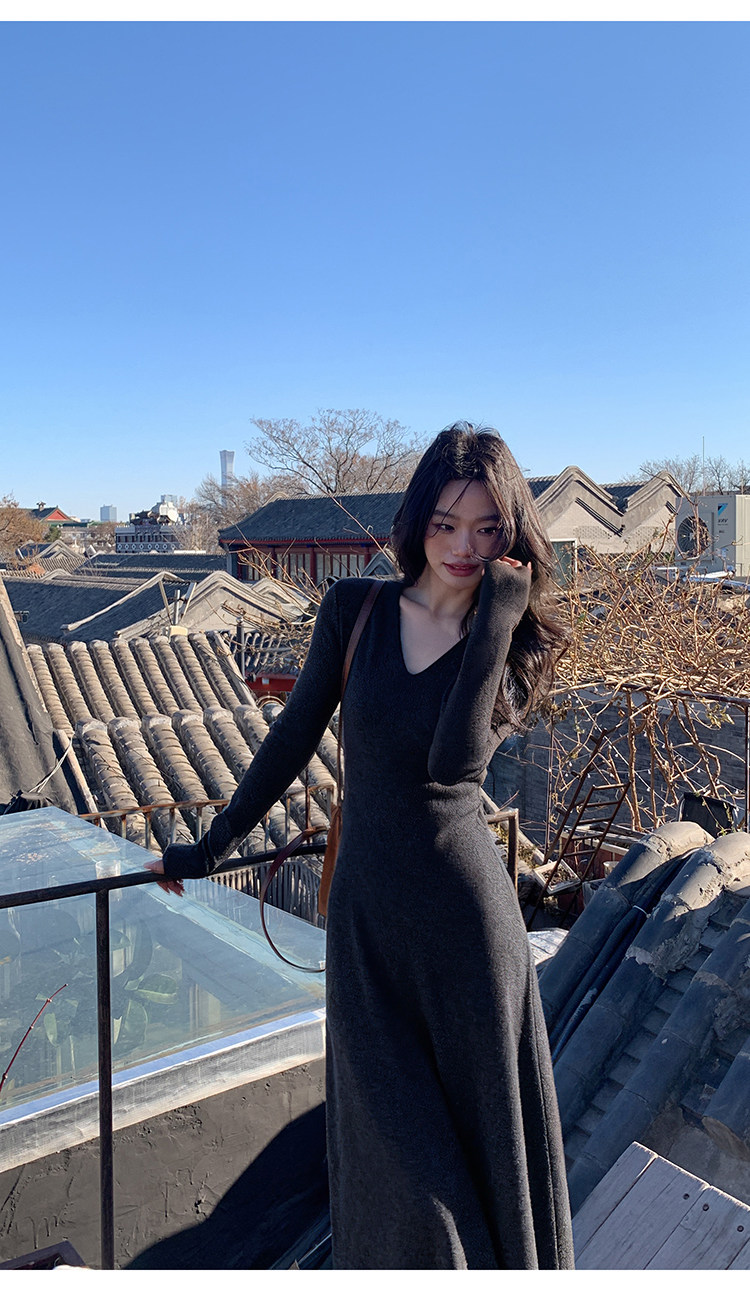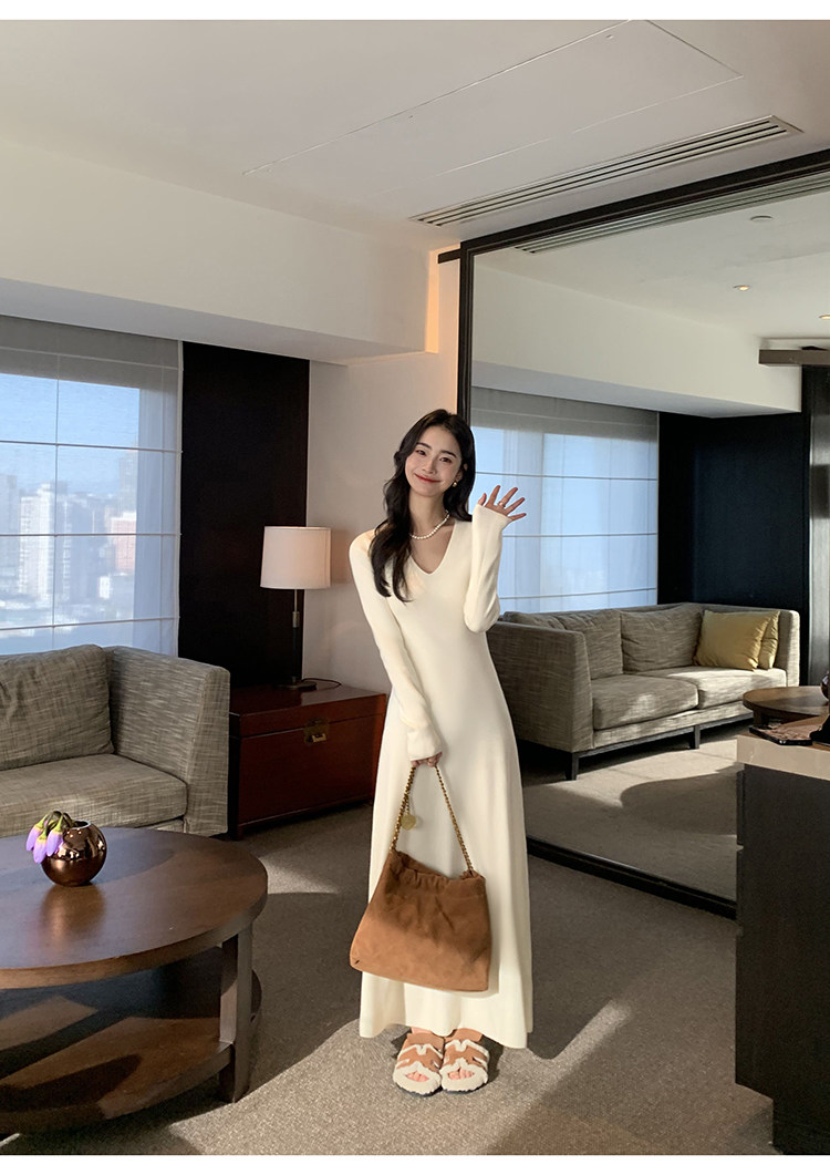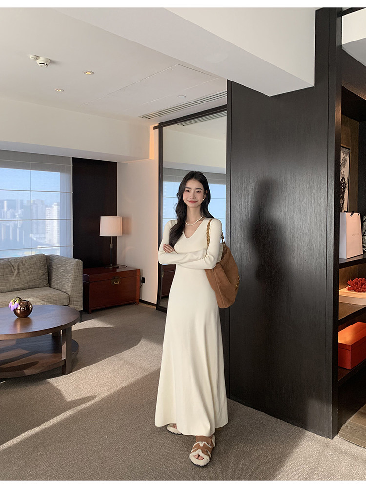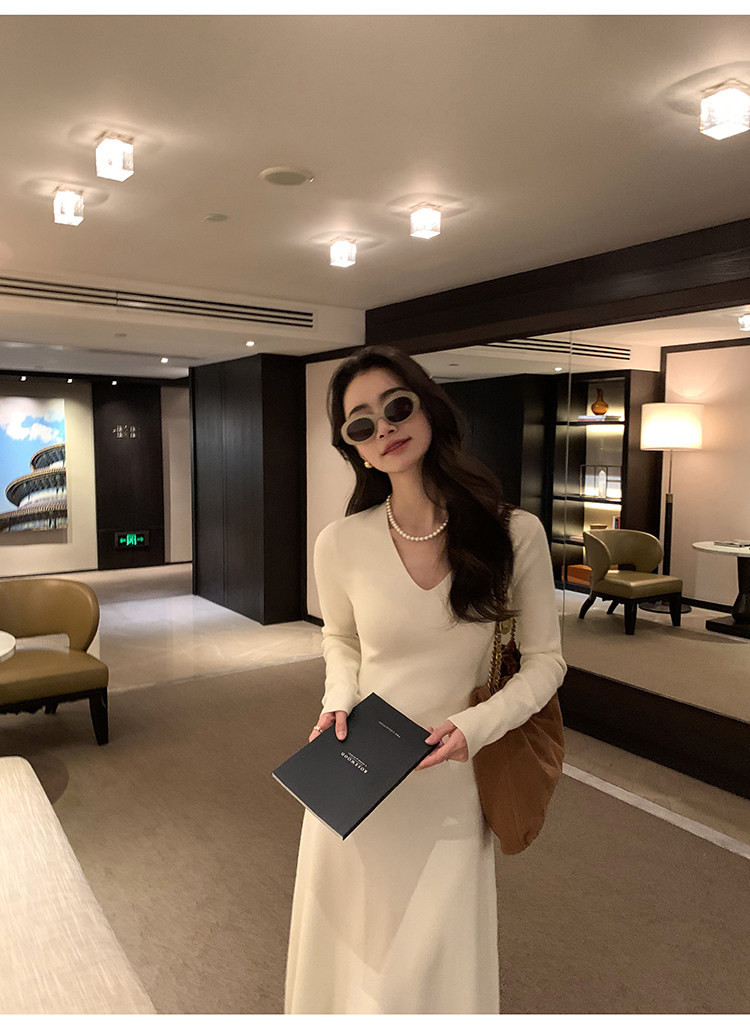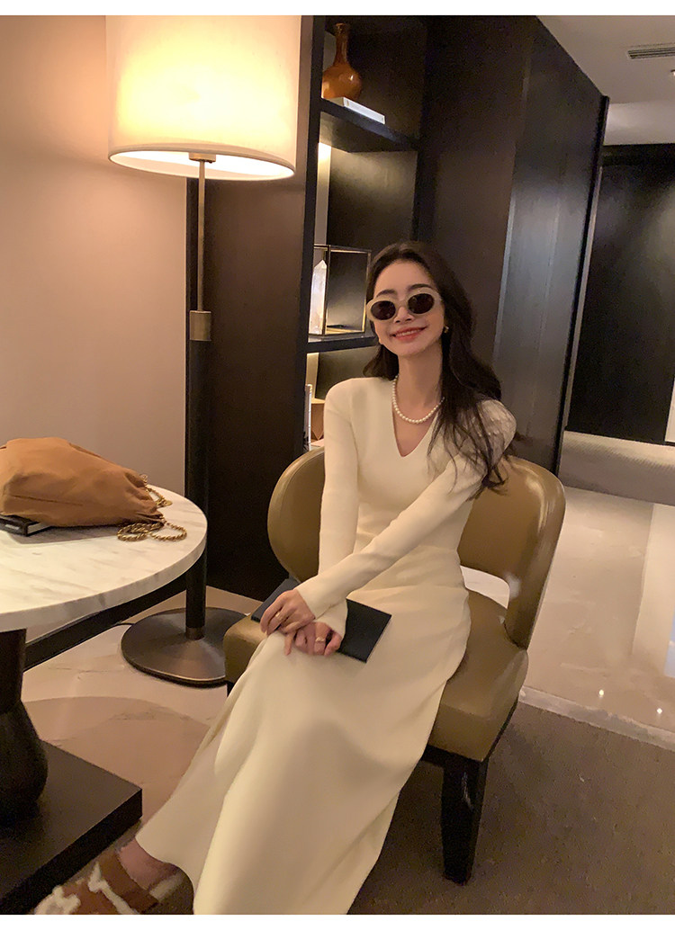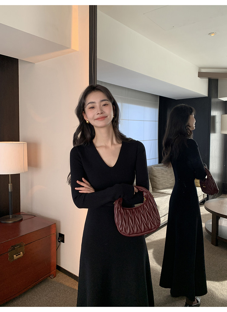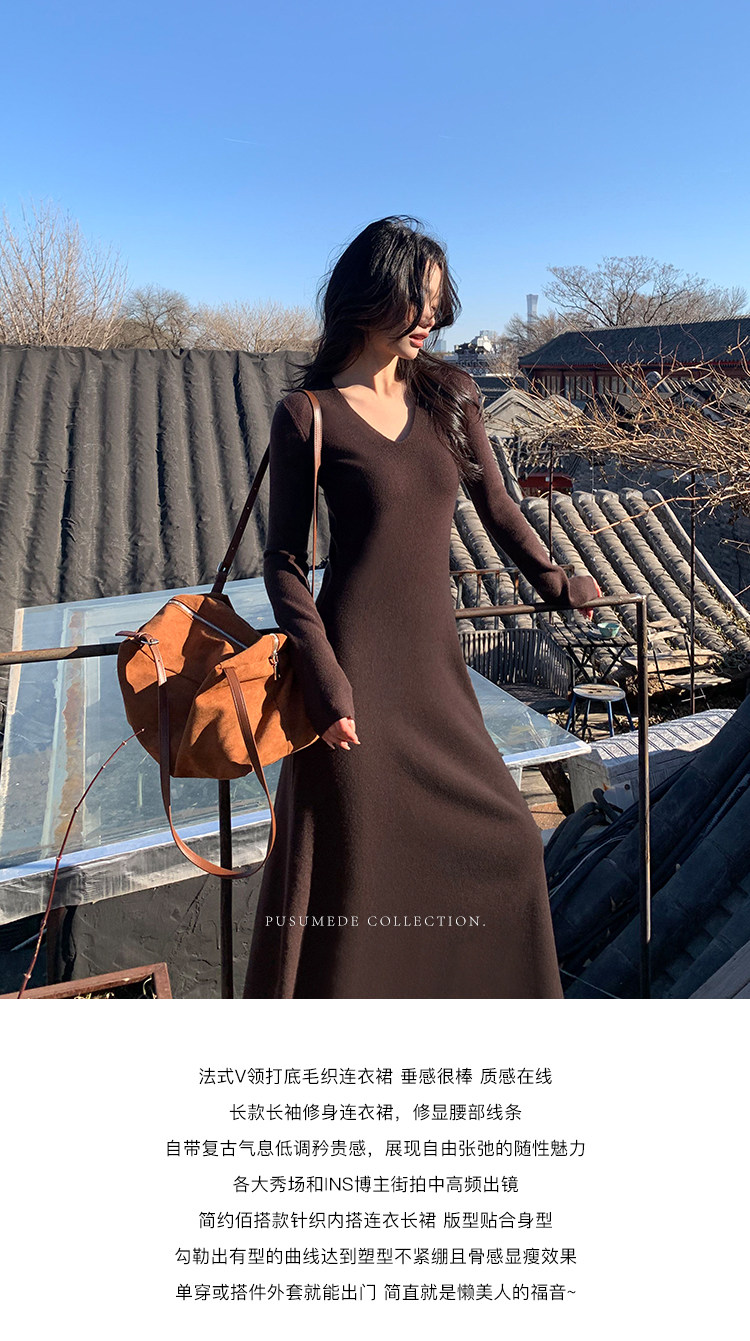 Pusumede Bonus Series V-Neck Knitted Dress for Women, Long-Sleeved, Waist-Cinching, Inner Layering Dress, Elegant Long Dress