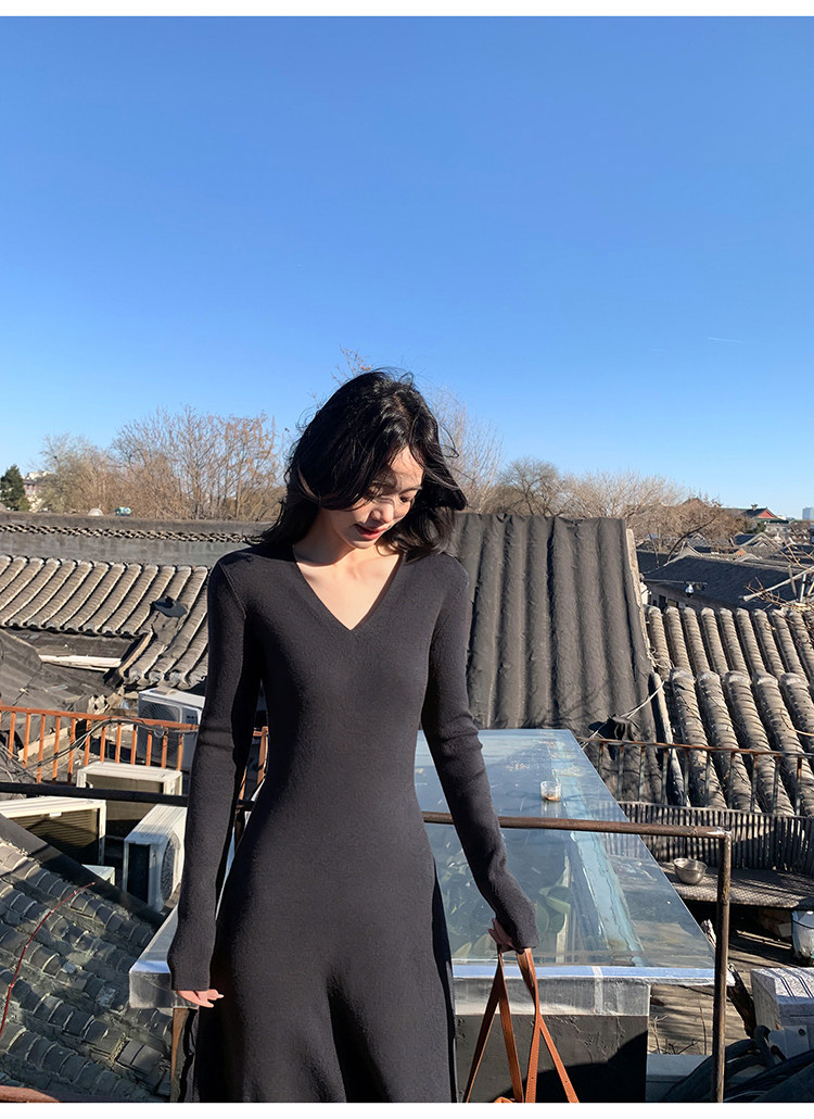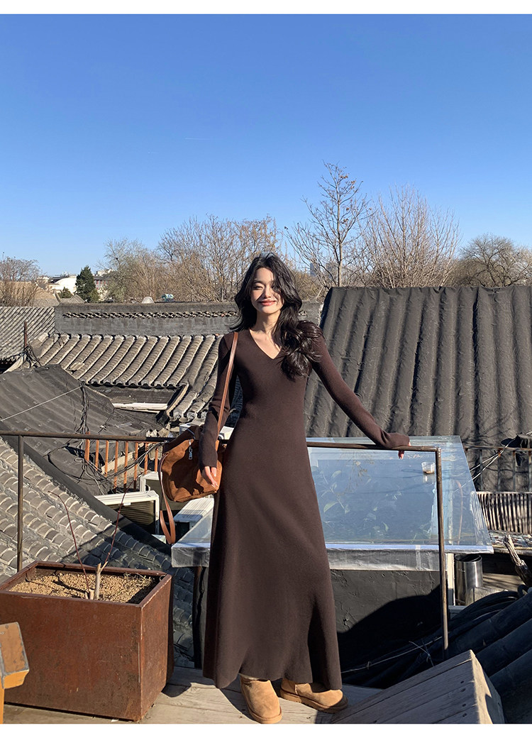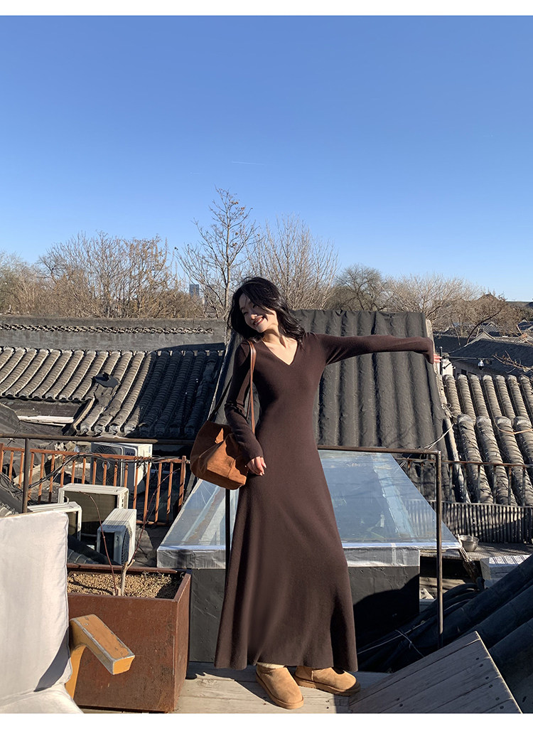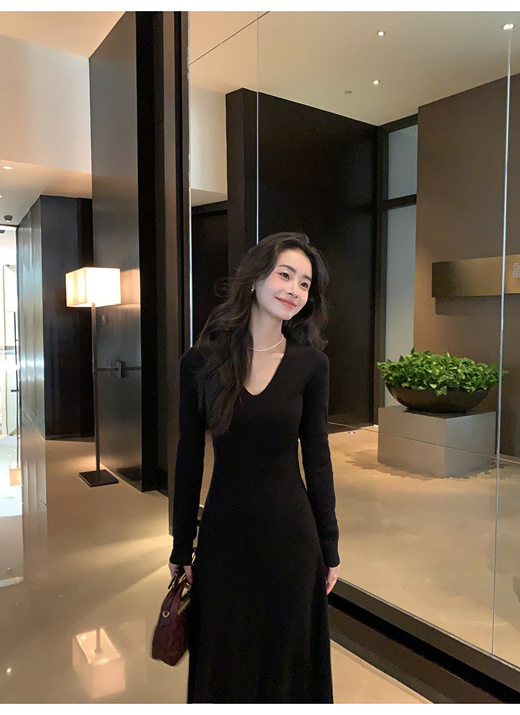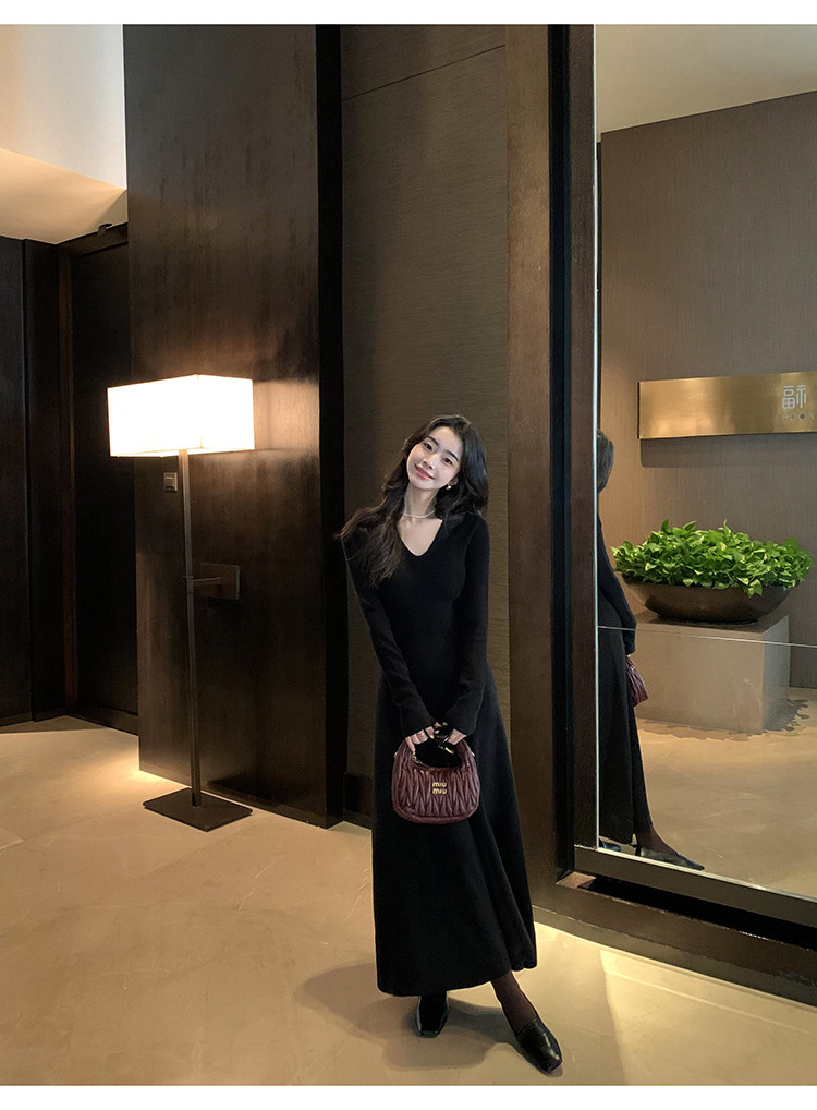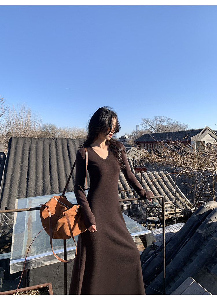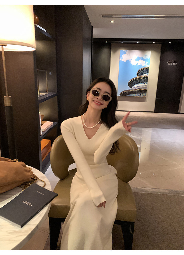 Pusumede Bonus Series V-Neck Knitted Dress for Women, Long-Sleeved, Waist-Cinching, Inner Layering Dress, Elegant Long Dress