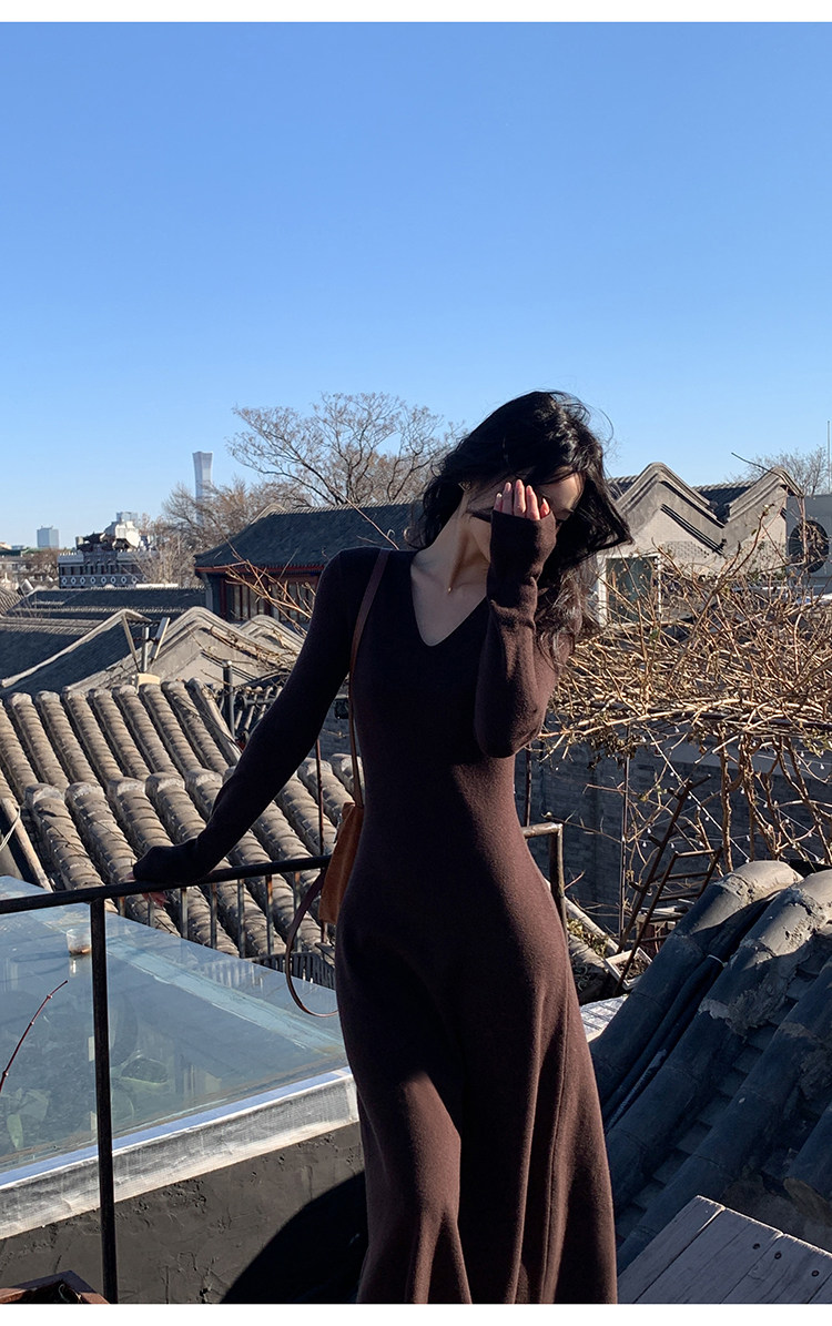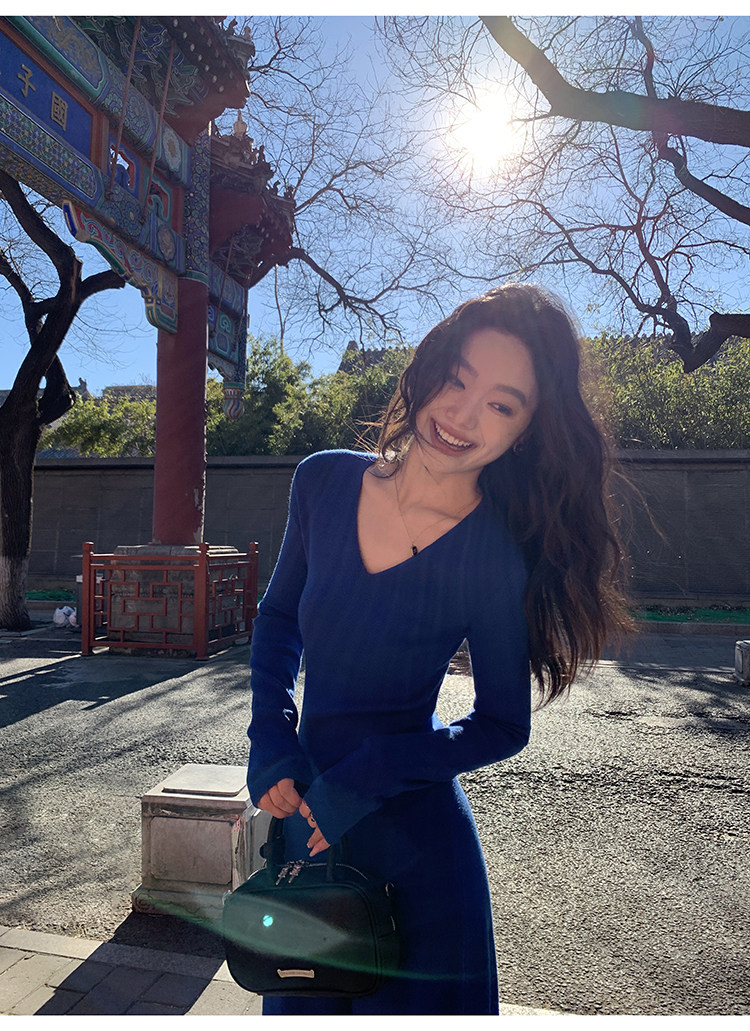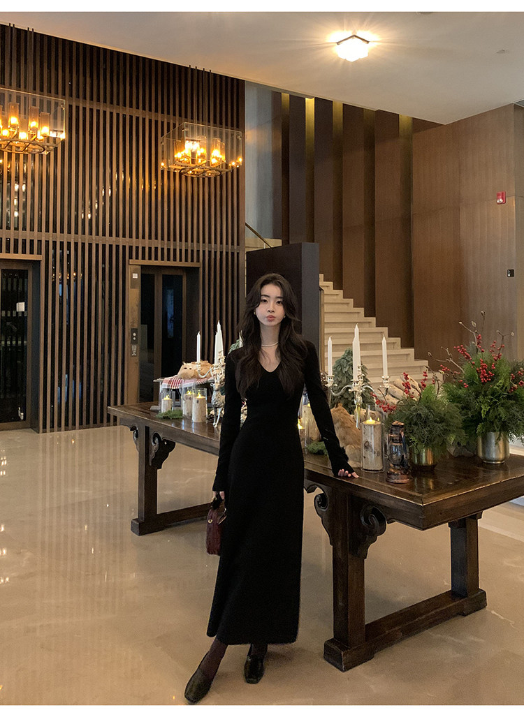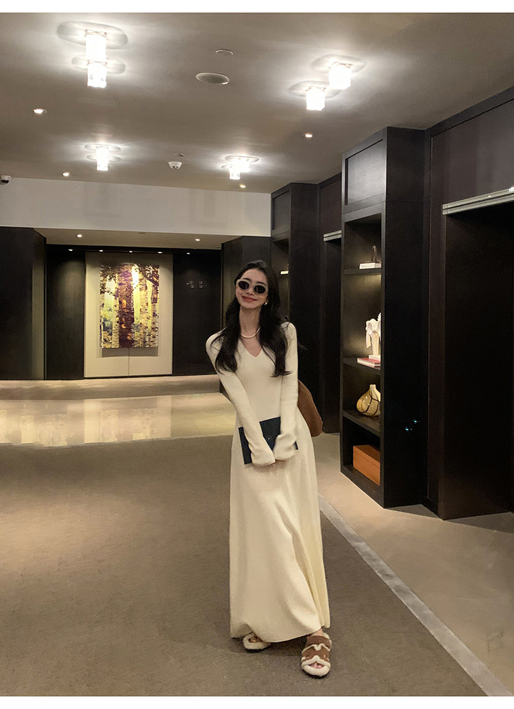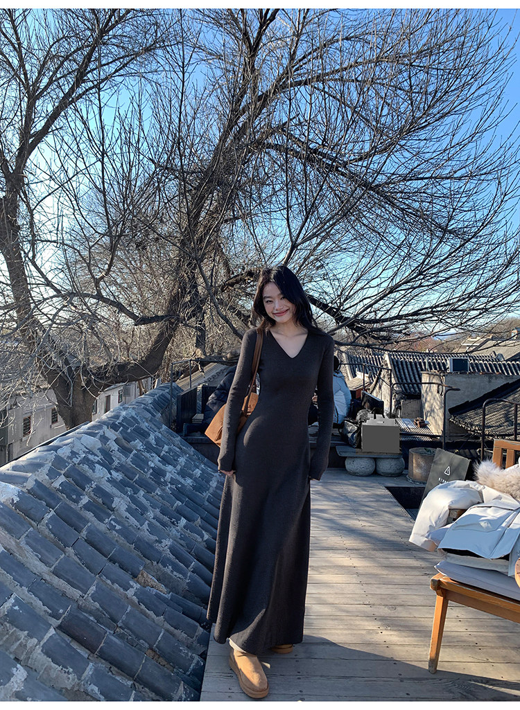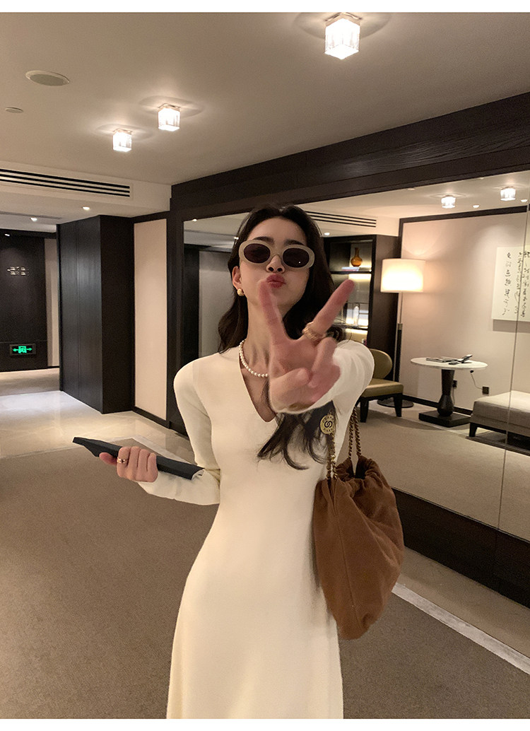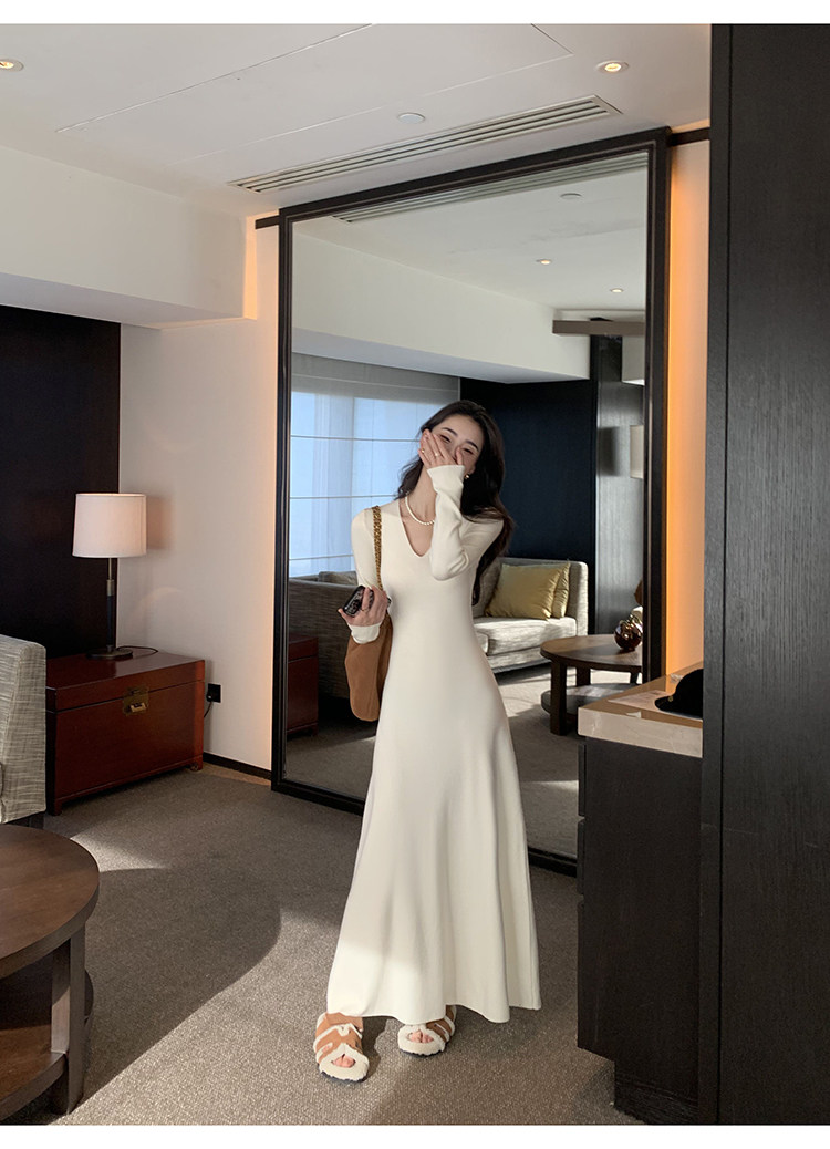 Pusumede Bonus Series V-Neck Knitted Dress for Women, Long-Sleeved, Waist-Cinching, Inner Layering Dress, Elegant Long Dress