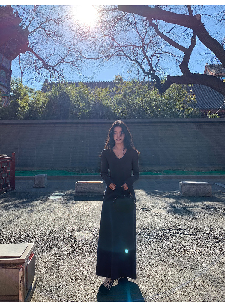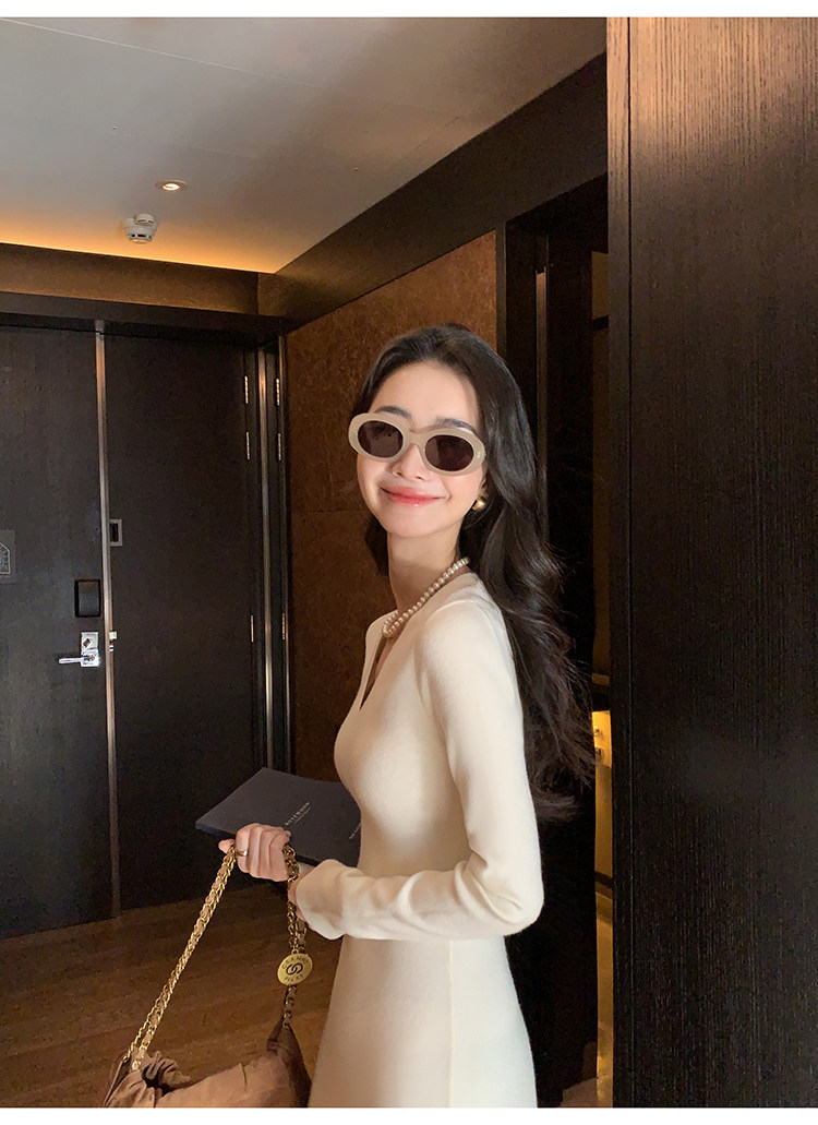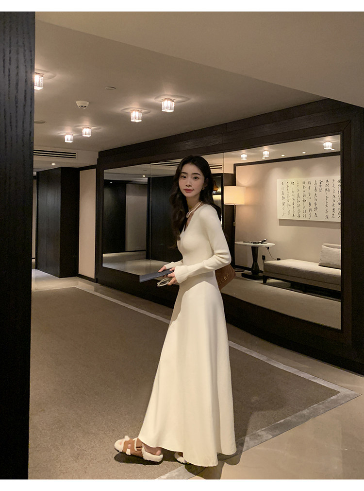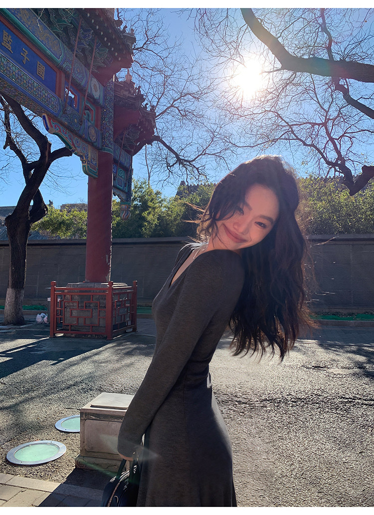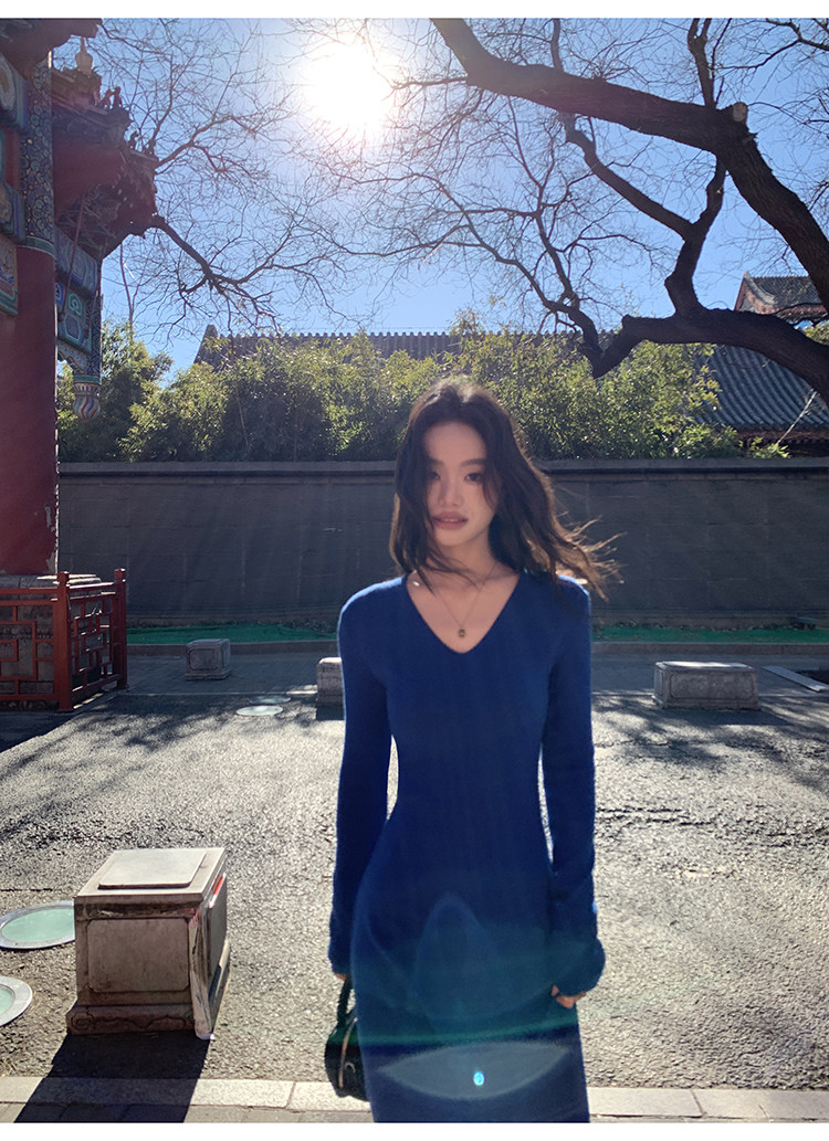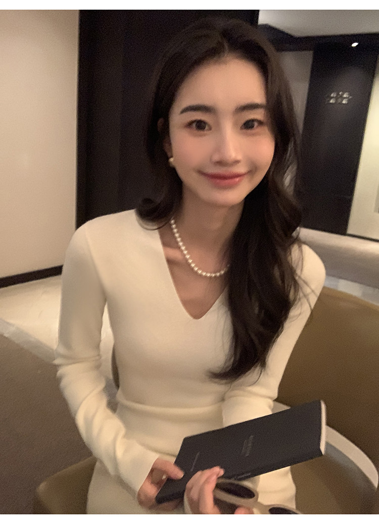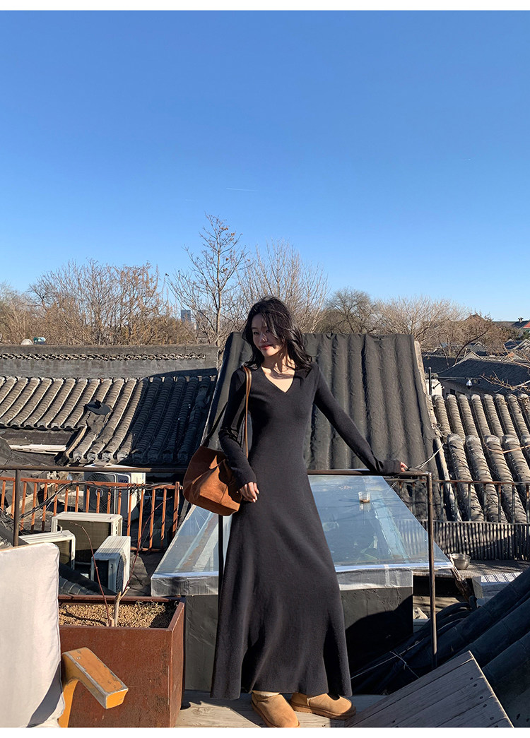 Pusumede Bonus Series V-Neck Knitted Dress for Women, Long-Sleeved, Waist-Cinching, Inner Layering Dress, Elegant Long Dress