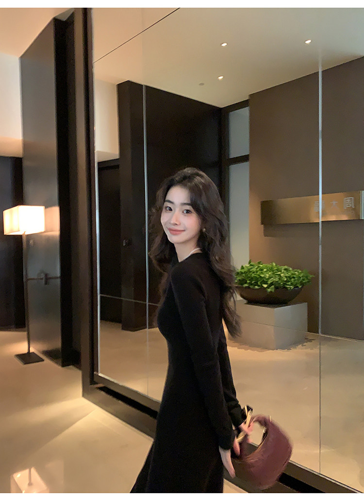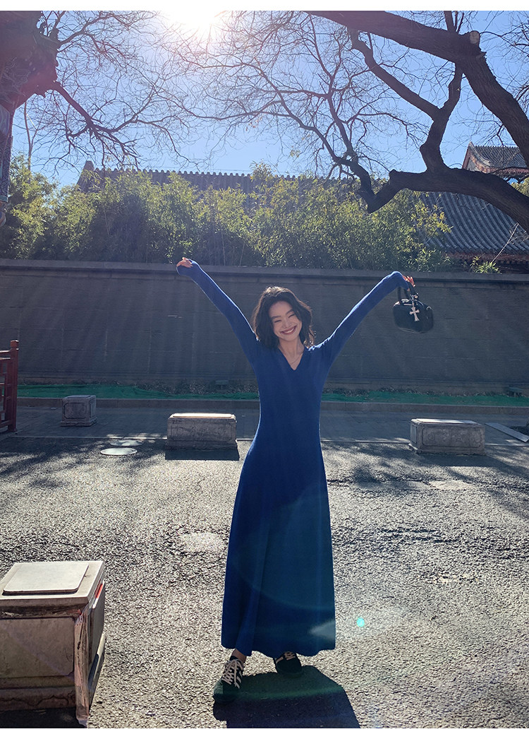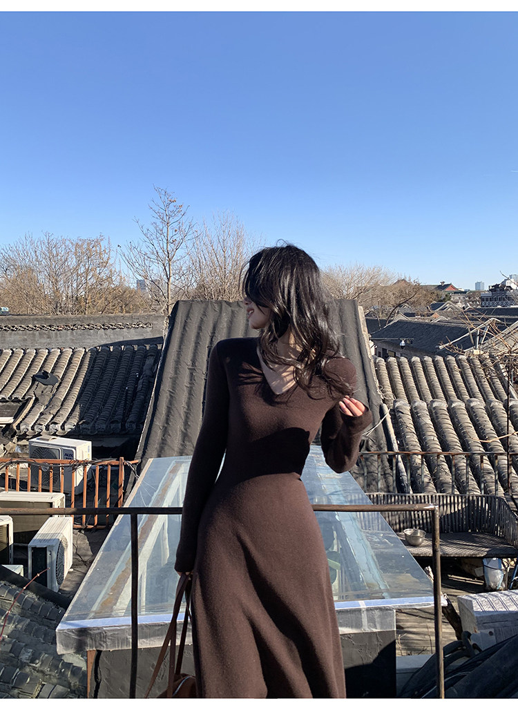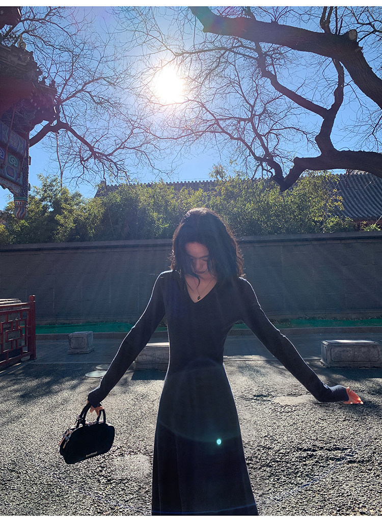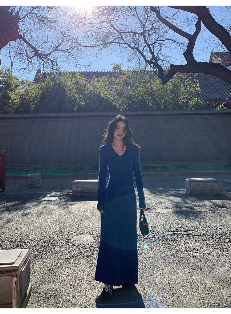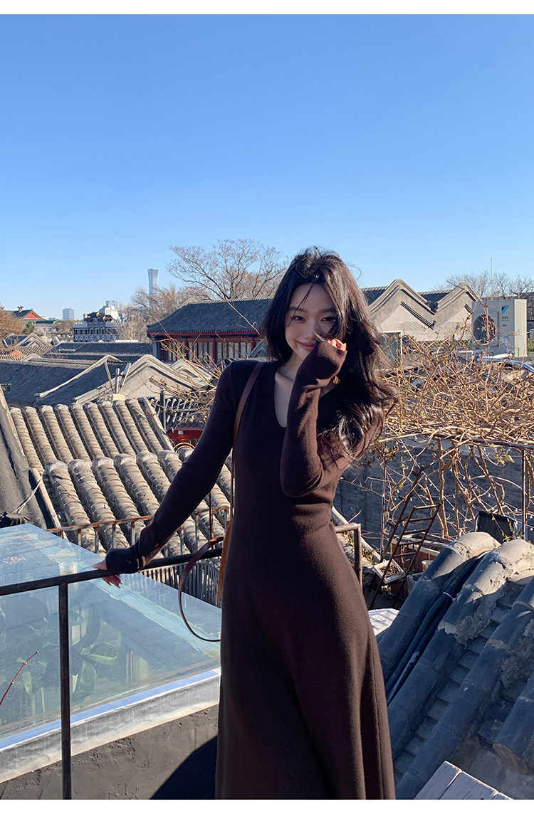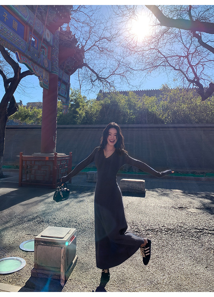 Pusumede Bonus Series V-Neck Knitted Dress for Women, Long-Sleeved, Waist-Cinching, Inner Layering Dress, Elegant Long Dress