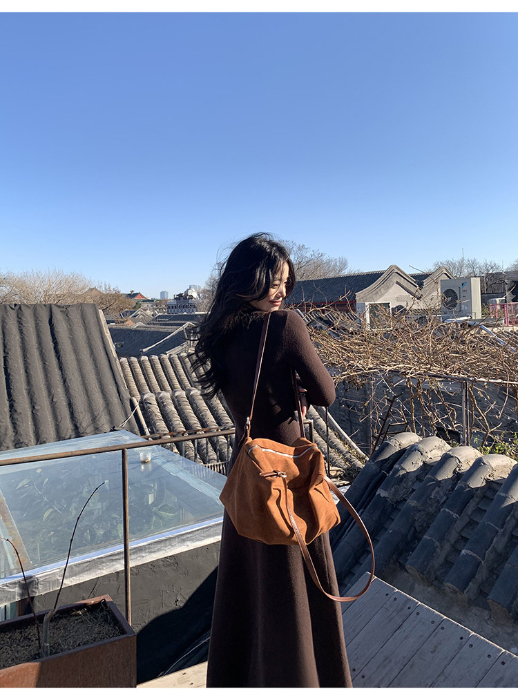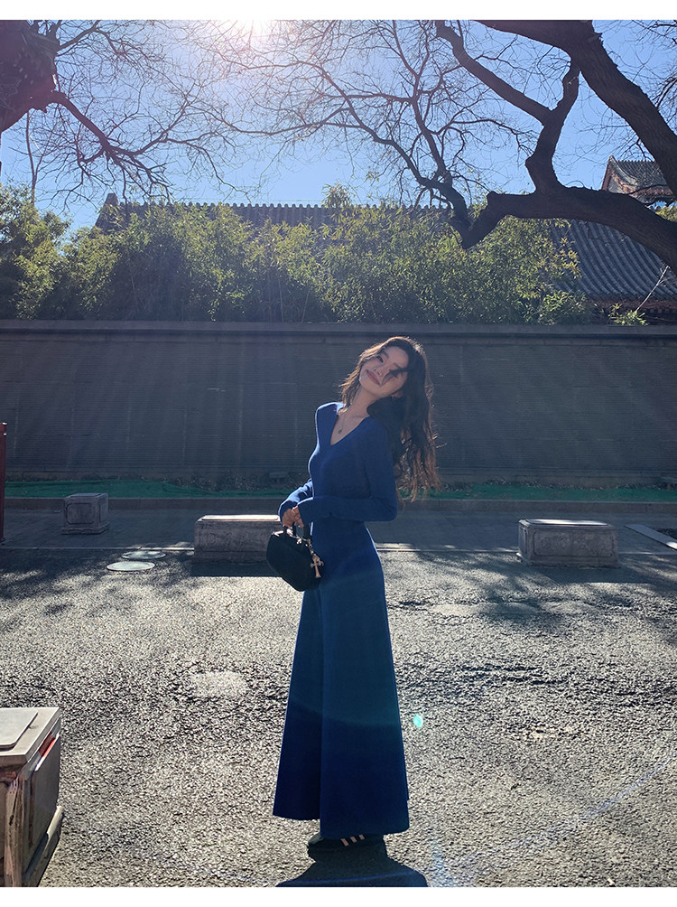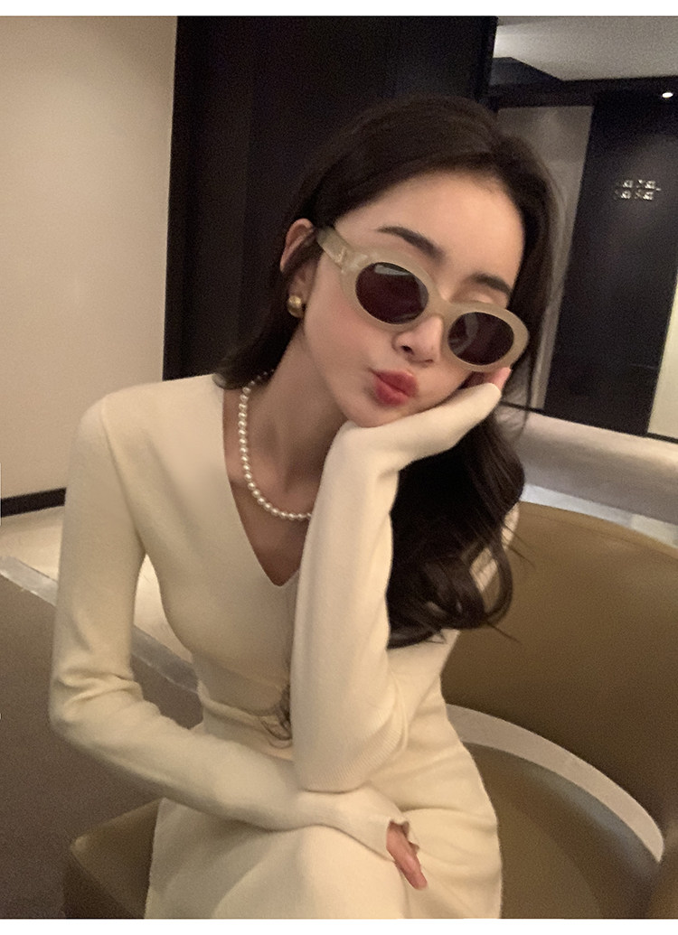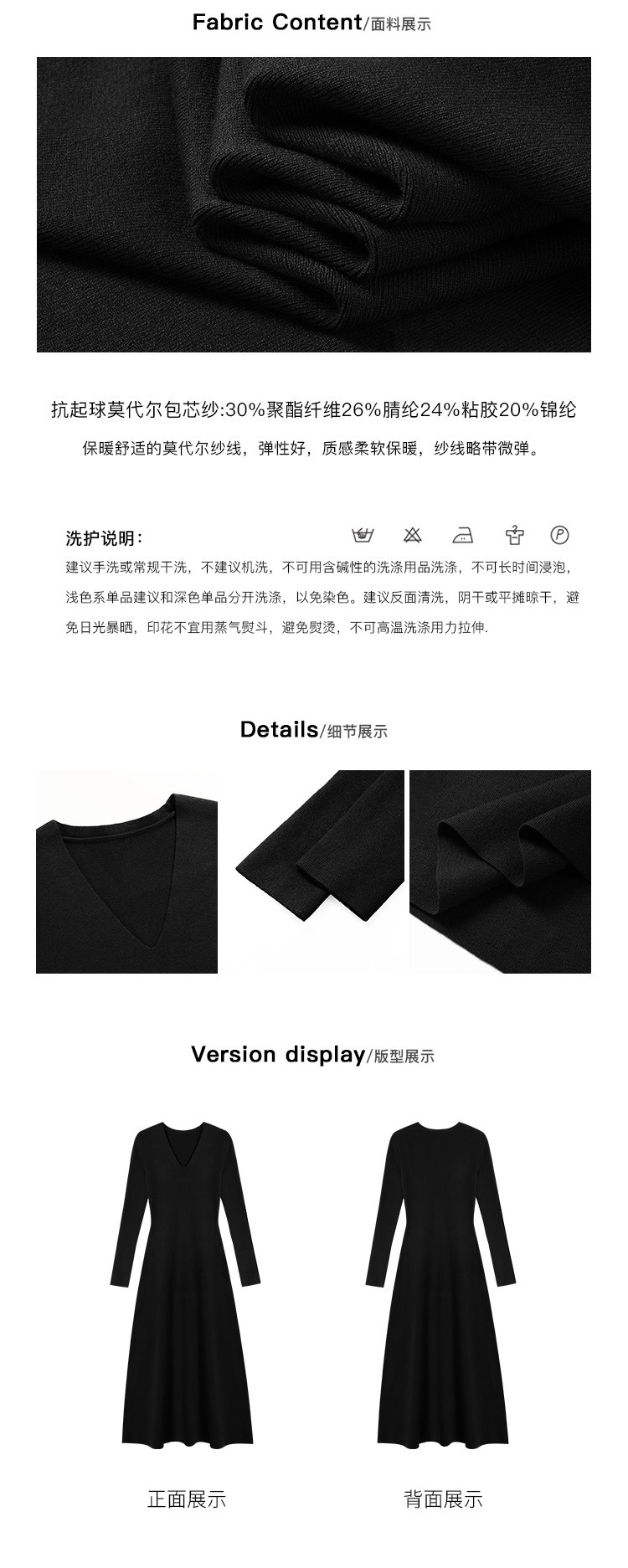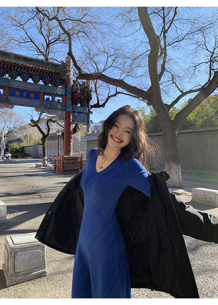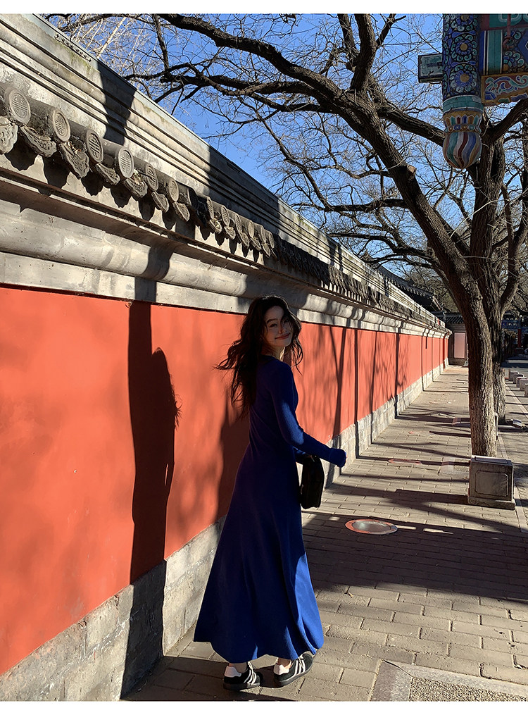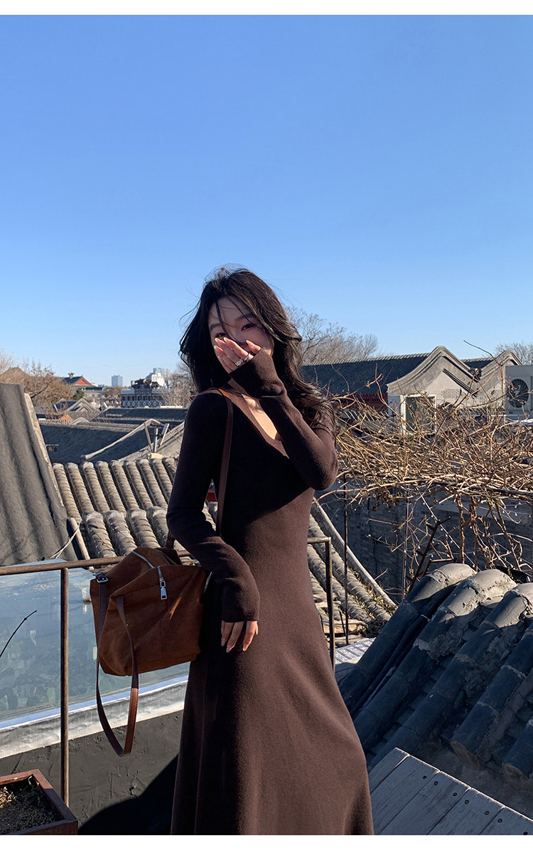 Pusumede Bonus Series V-Neck Knitted Dress for Women, Long-Sleeved, Waist-Cinching, Inner Layering Dress, Elegant Long Dress