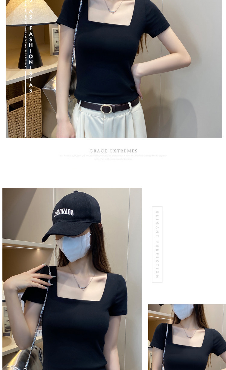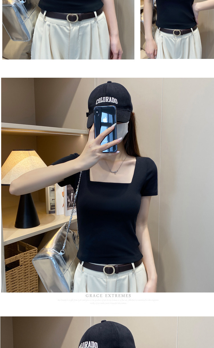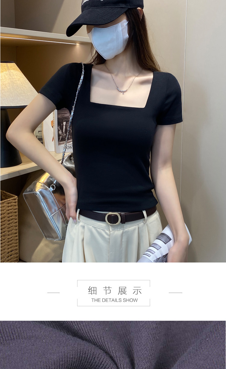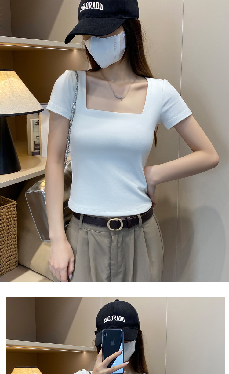 Pure Cotton White Square-Neck Short-Sleeve T-Shirt for Women, Spring and Summer Low-Neck Slim-Fit Collarbone-Revealing Base Shirt, Tight-Fitting U-Neck Top