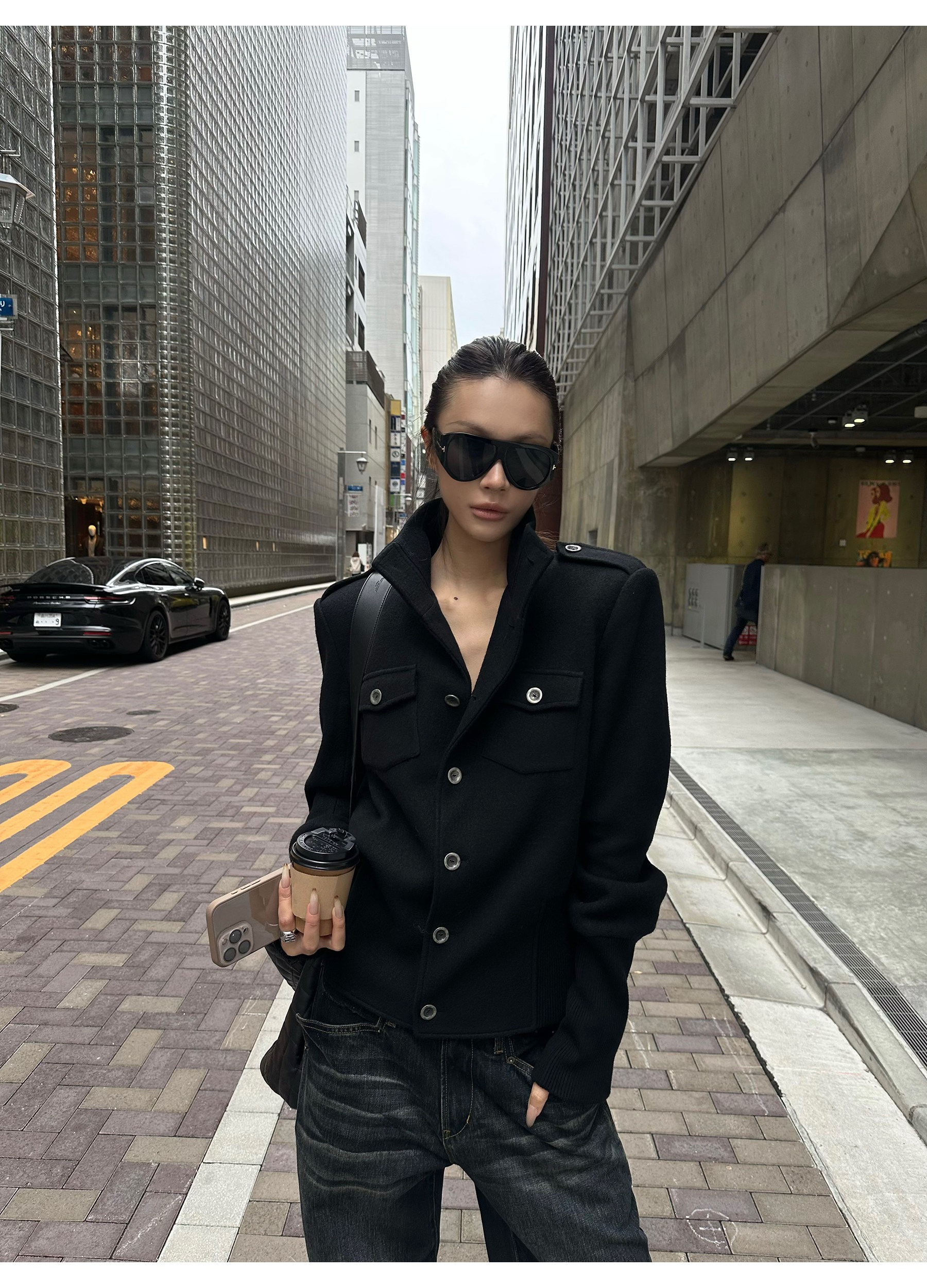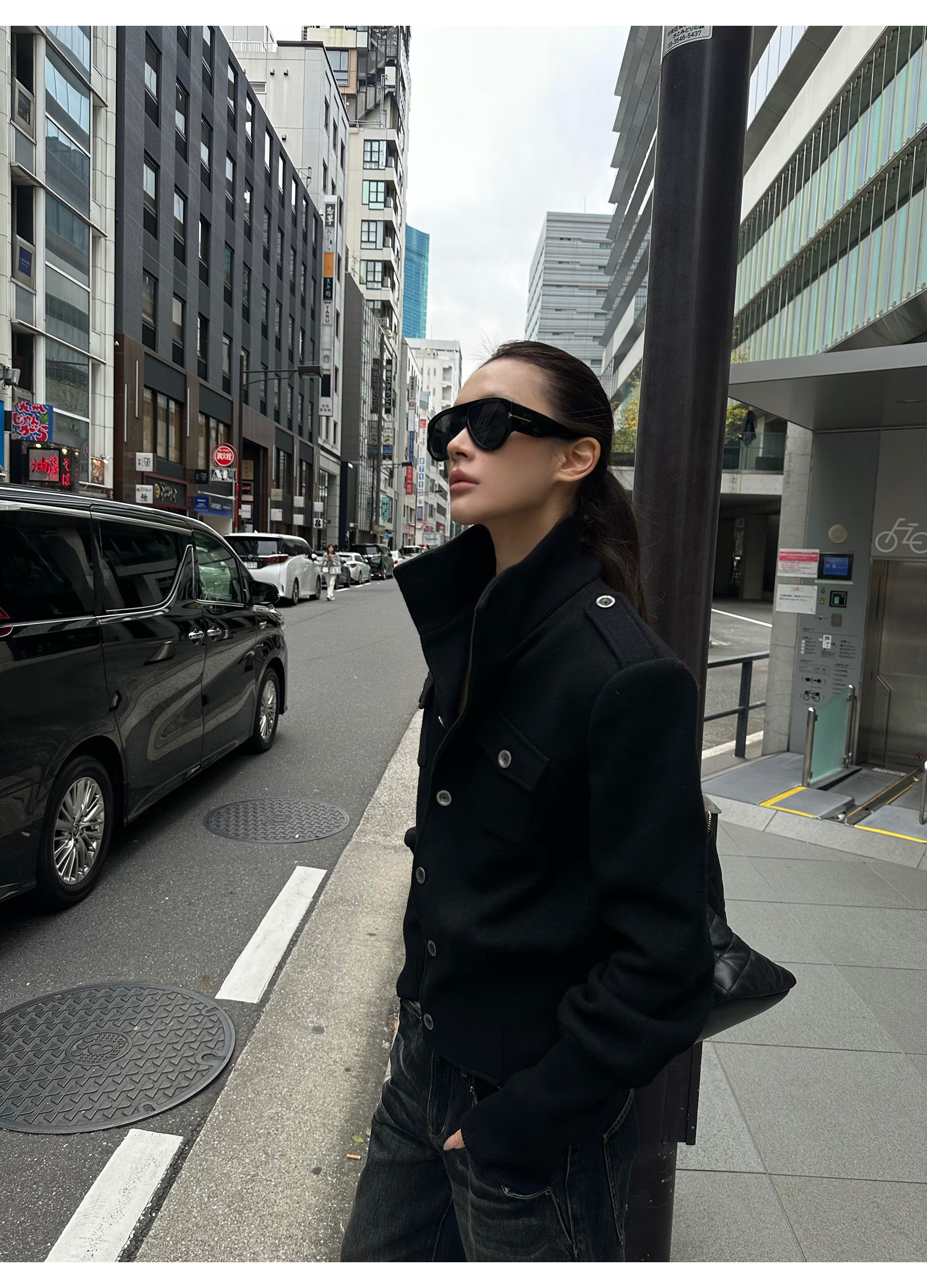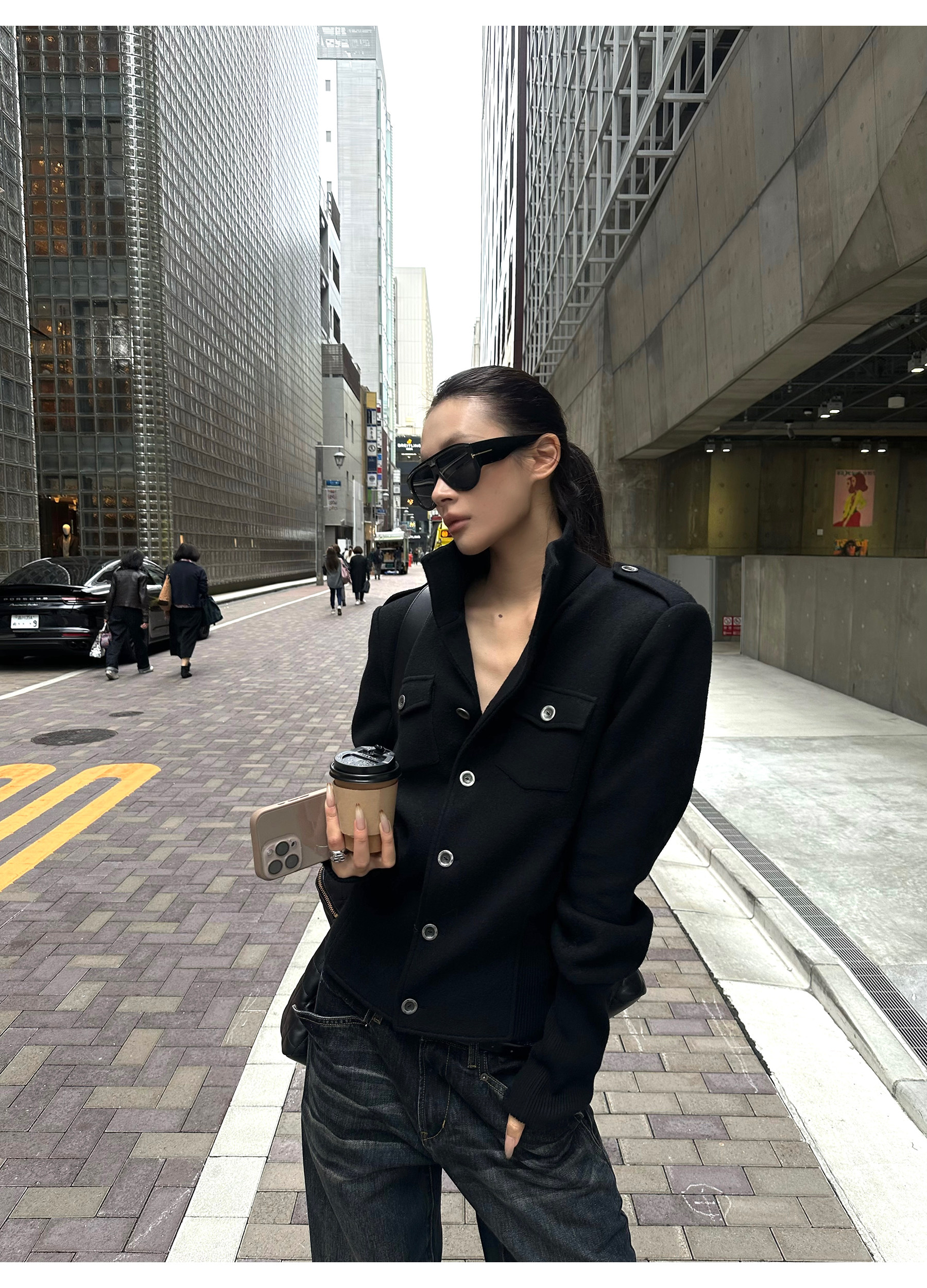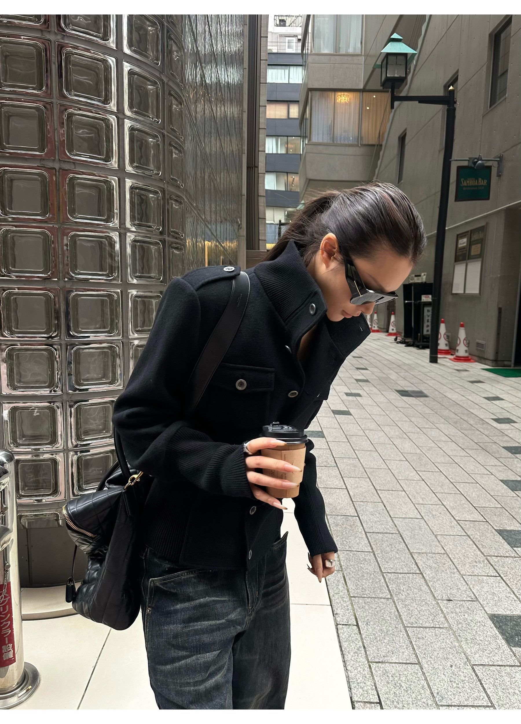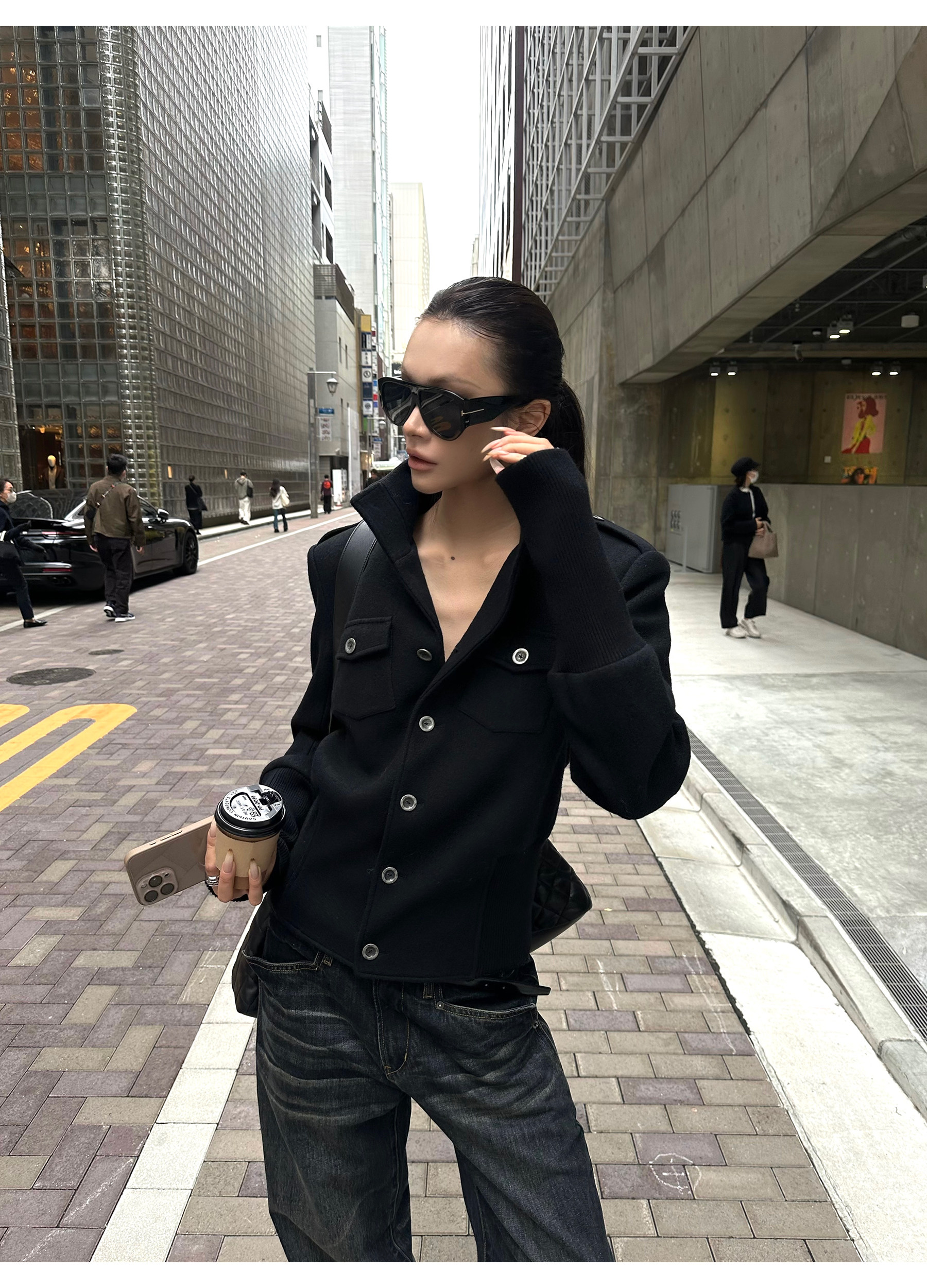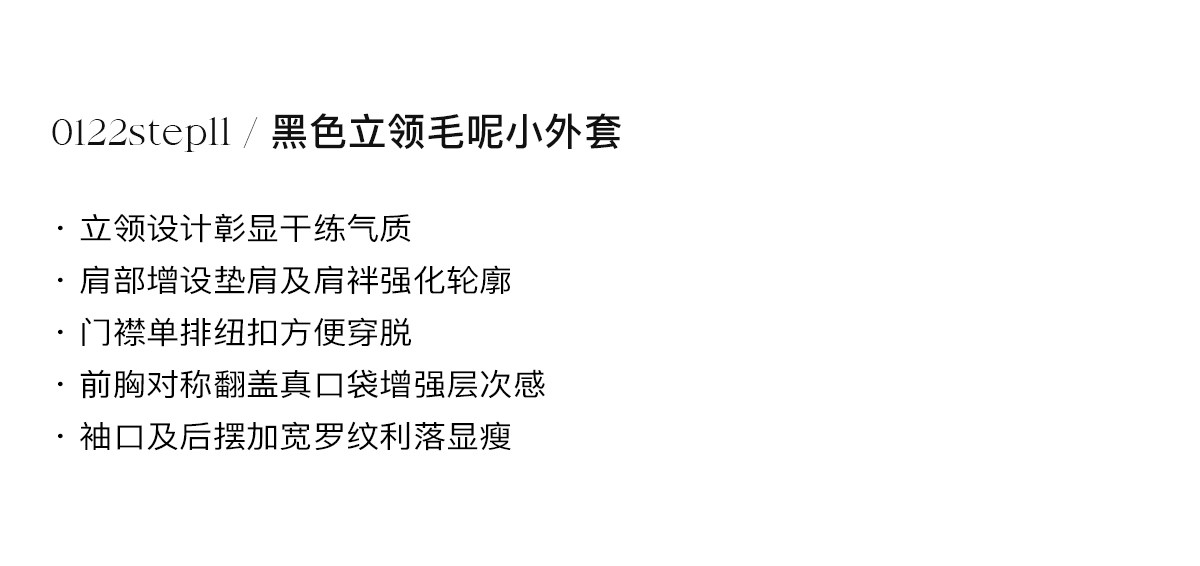 0122Stepll Modern Tokyo Black Woolen Coat for Women Vintage Waist-Cinching Stand Collar Padded Shoulder Woolen Short Jacket