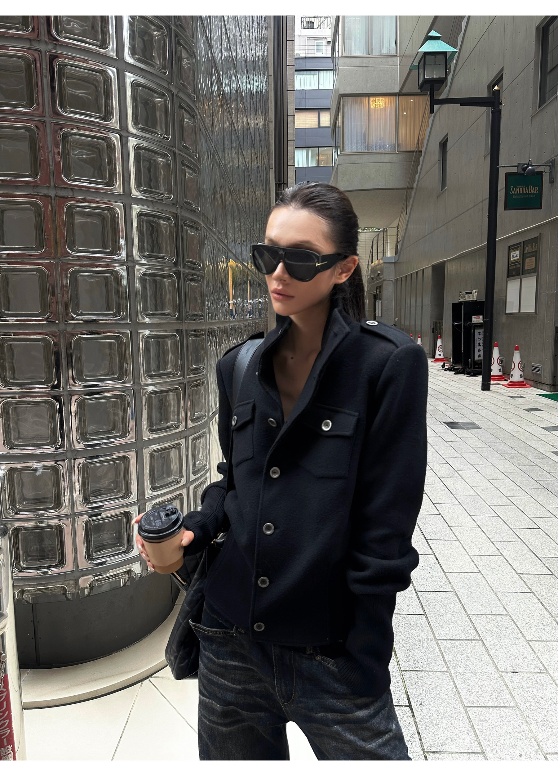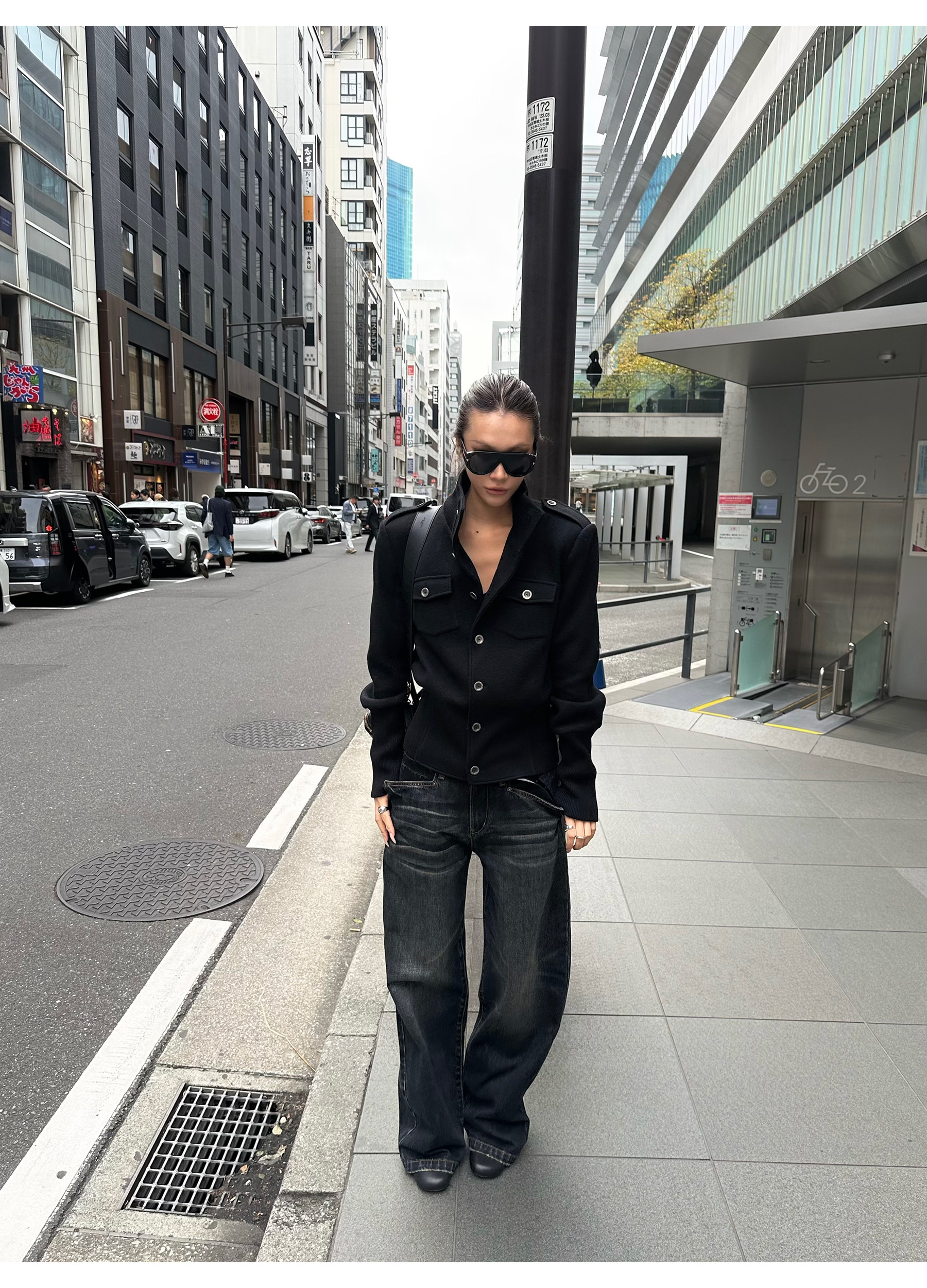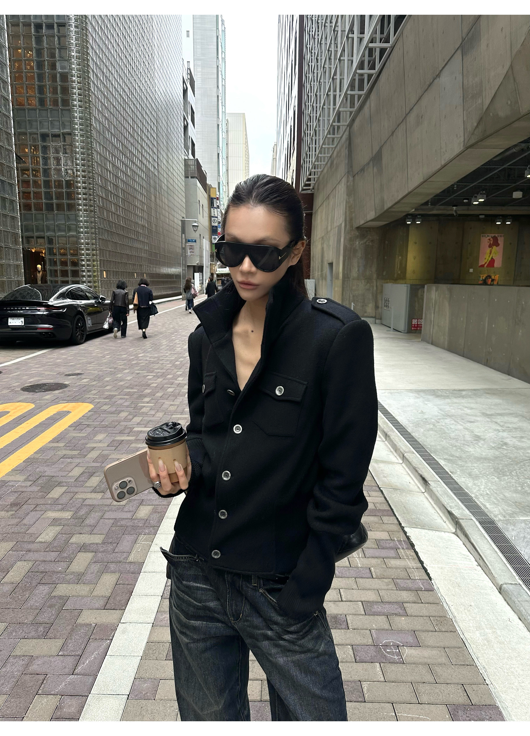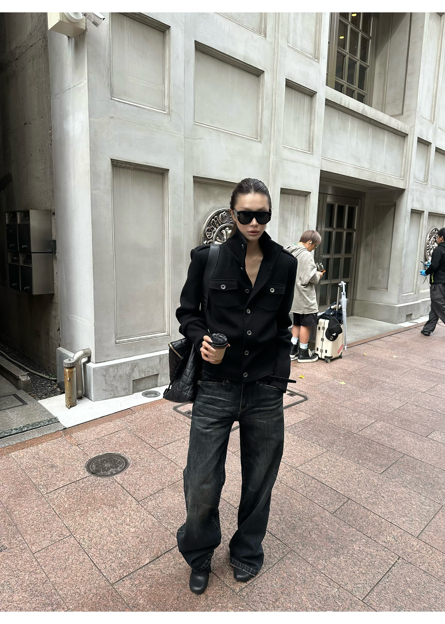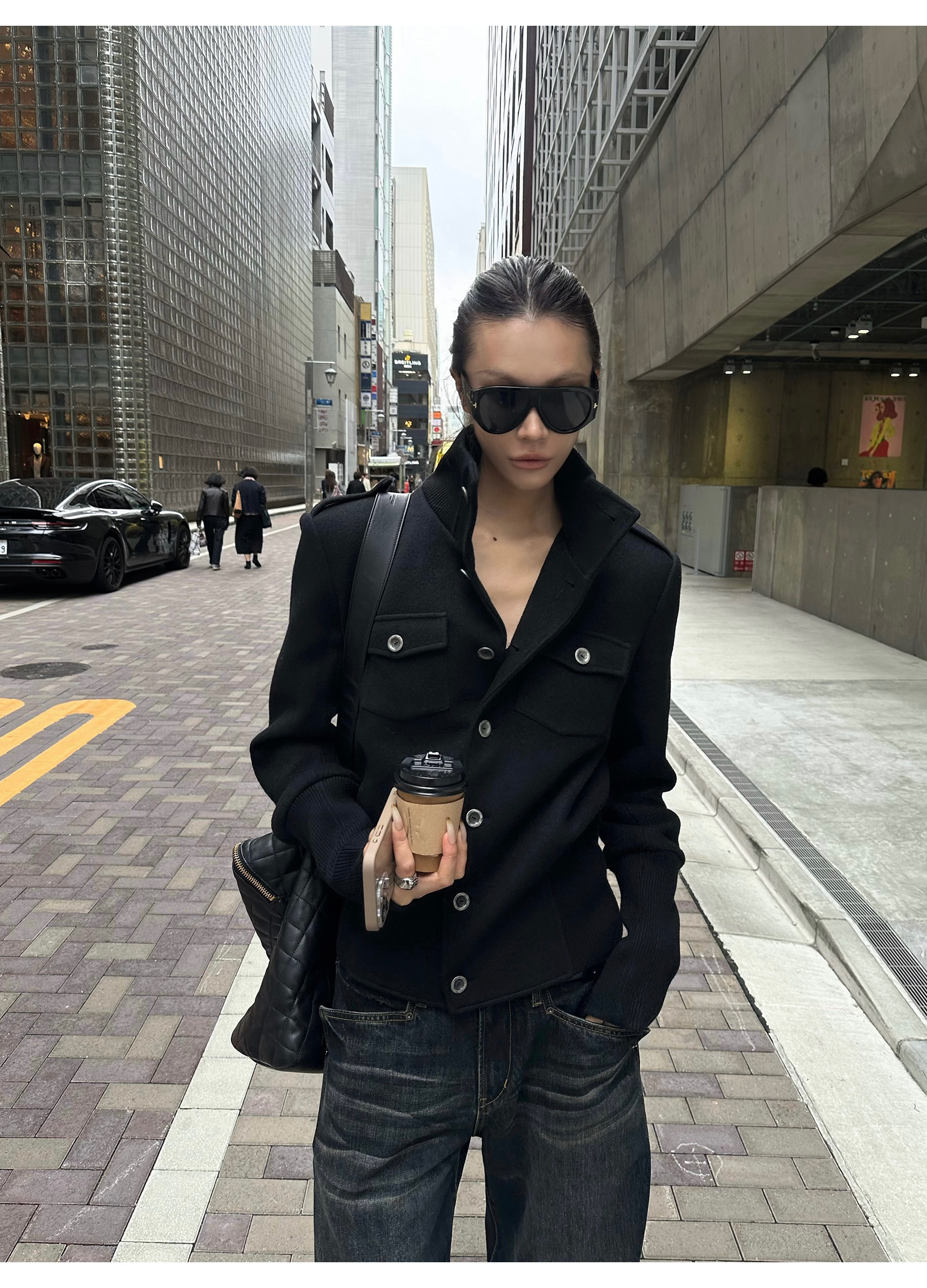 0122Stepll Modern Tokyo Black Woolen Coat for Women Vintage Waist-Cinching Stand Collar Padded Shoulder Woolen Short Jacket