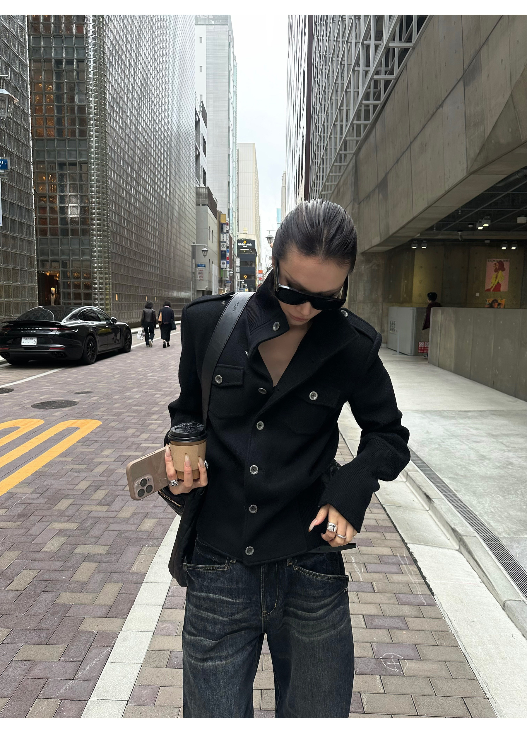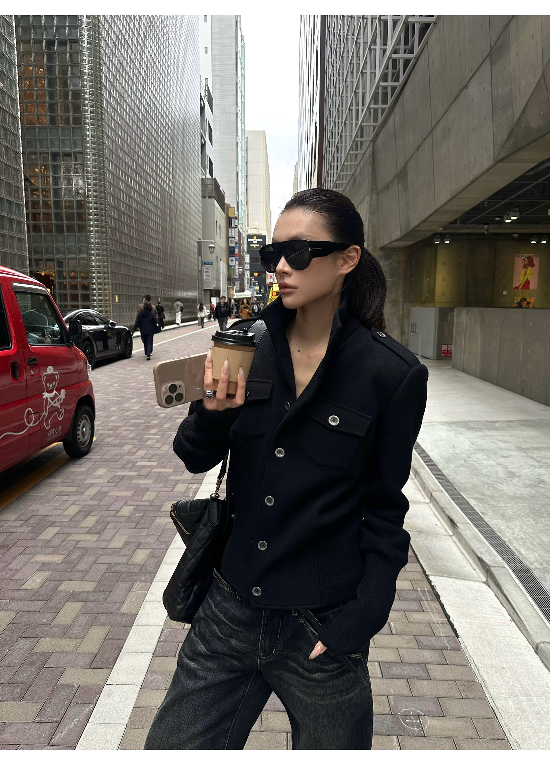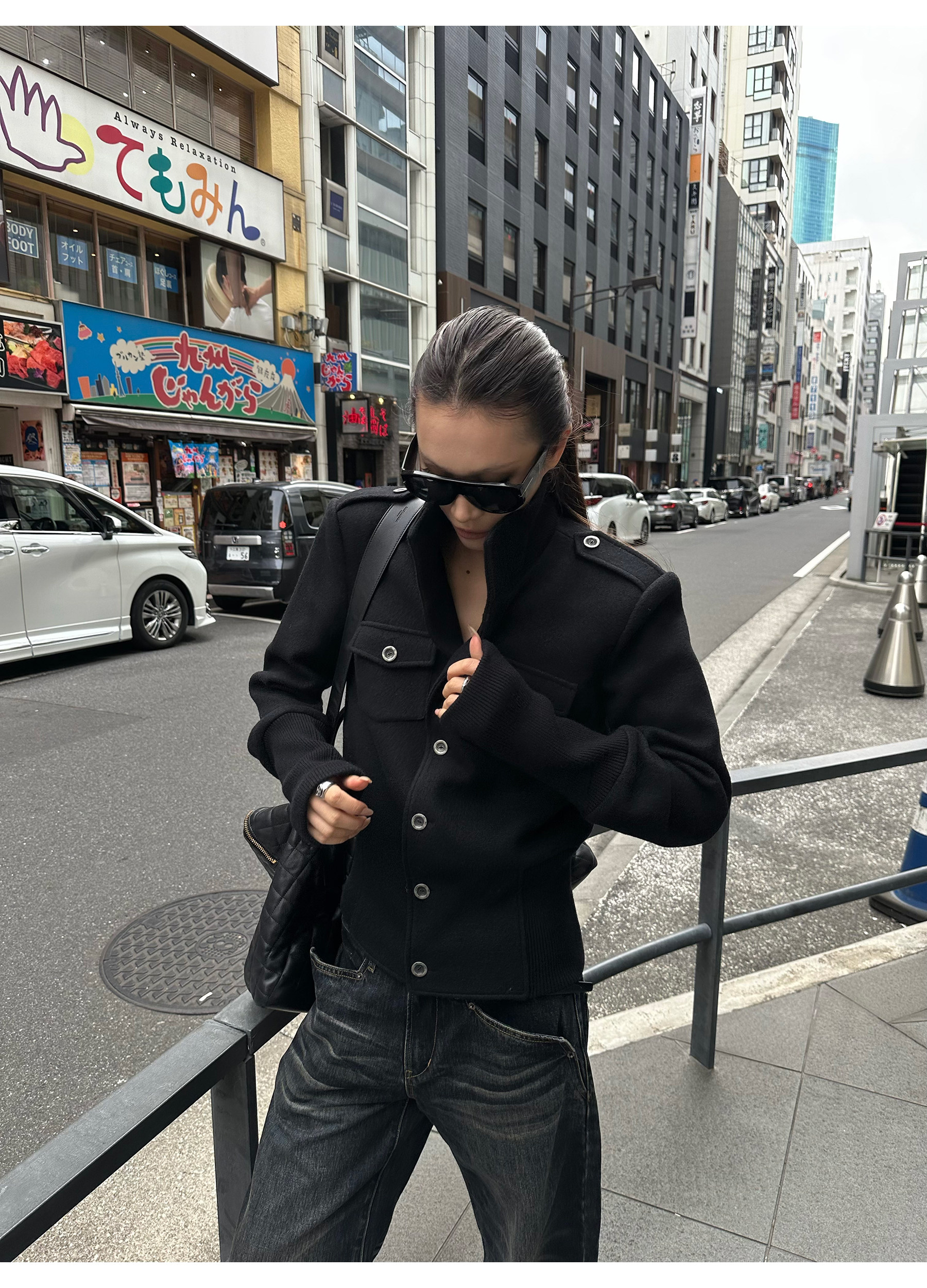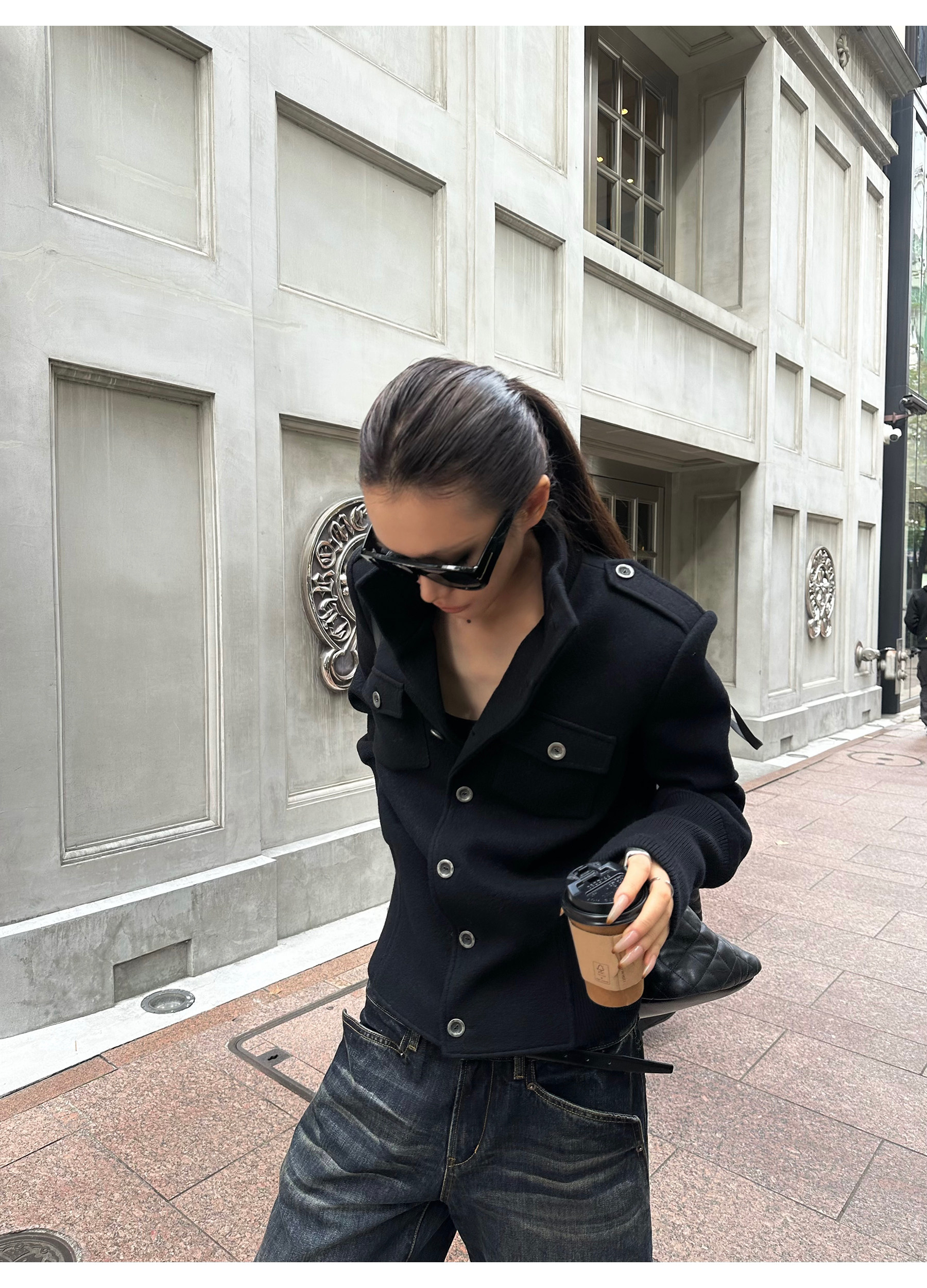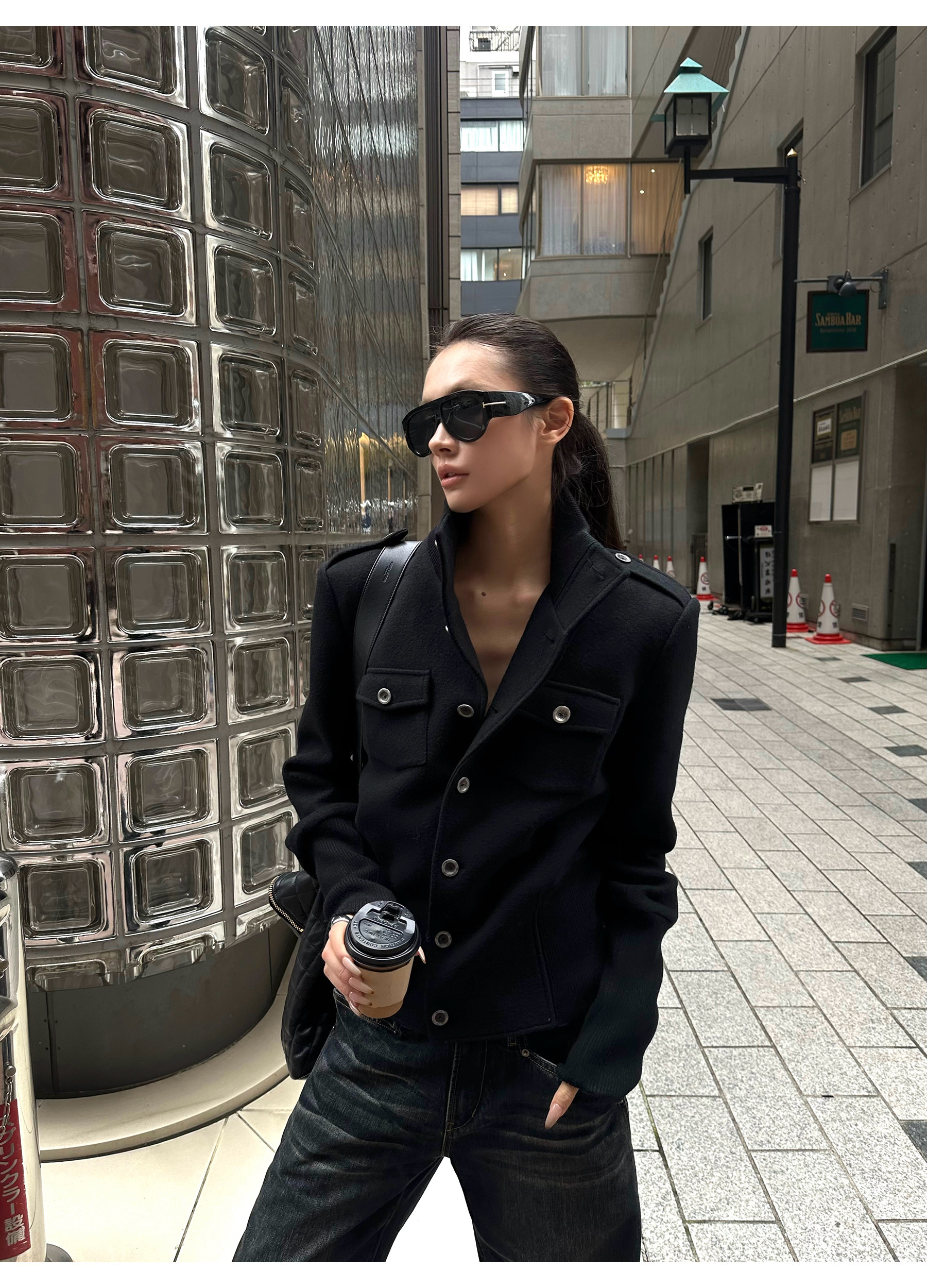 0122Stepll Modern Tokyo Black Woolen Coat for Women Vintage Waist-Cinching Stand Collar Padded Shoulder Woolen Short Jacket