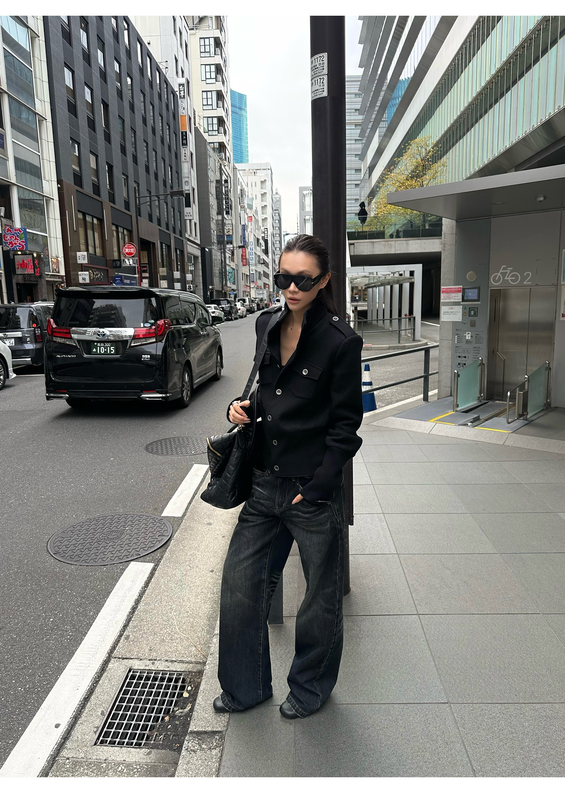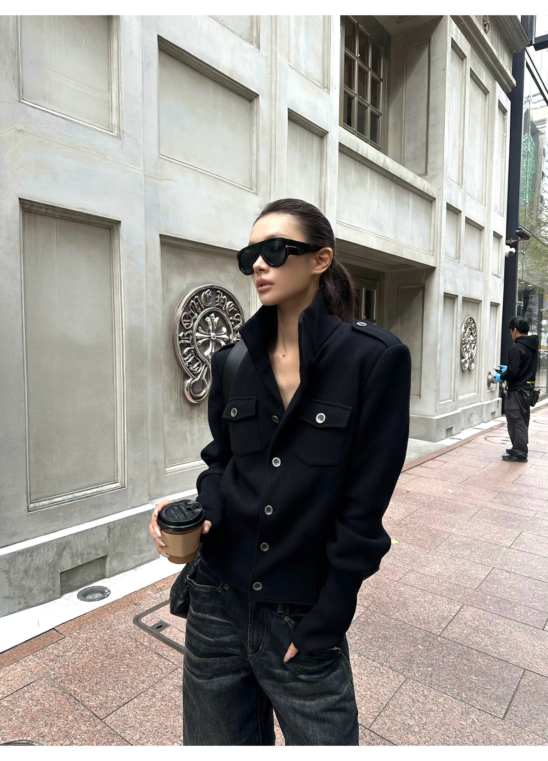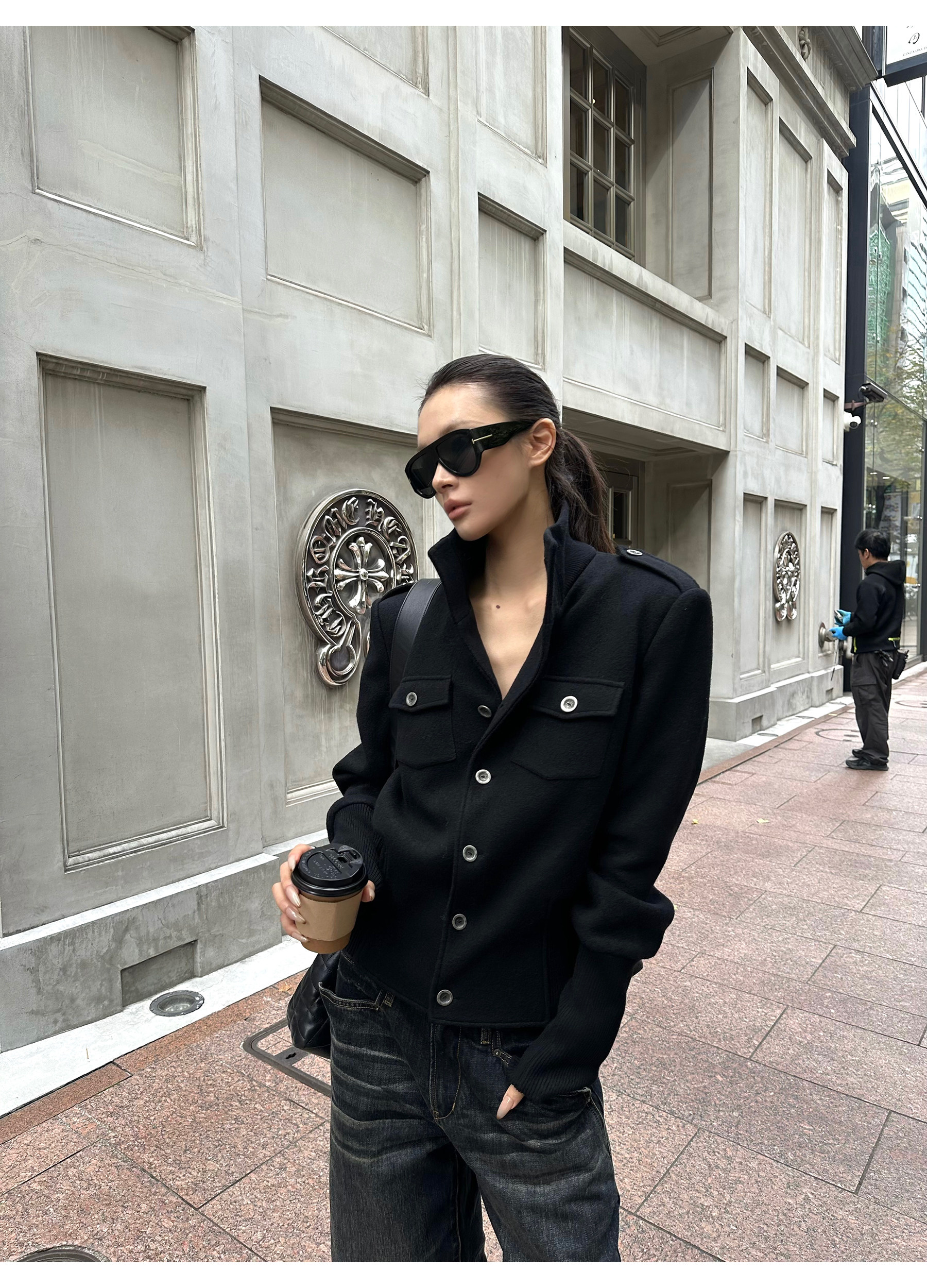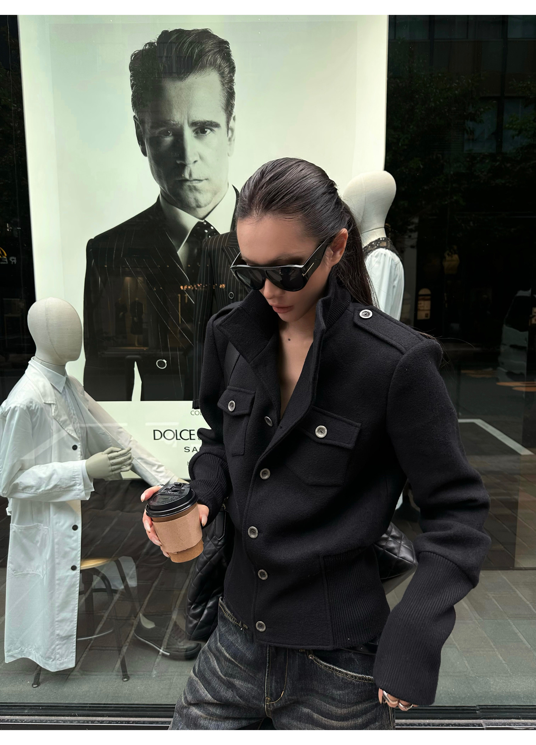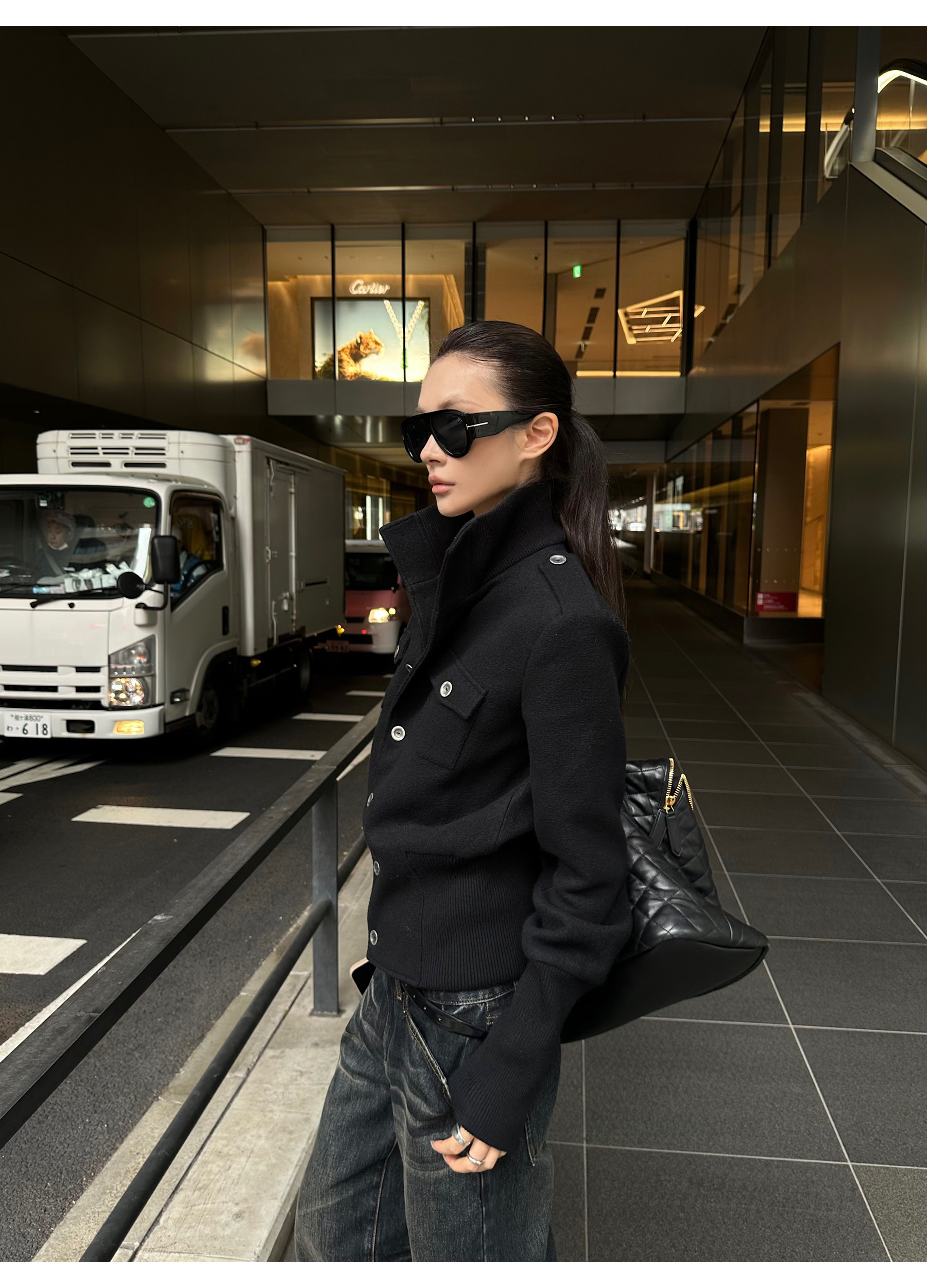0122Stepll Modern Tokyo Black Woolen Coat for Women Vintage Waist-Cinching Stand Collar Padded Shoulder Woolen Short Jacket