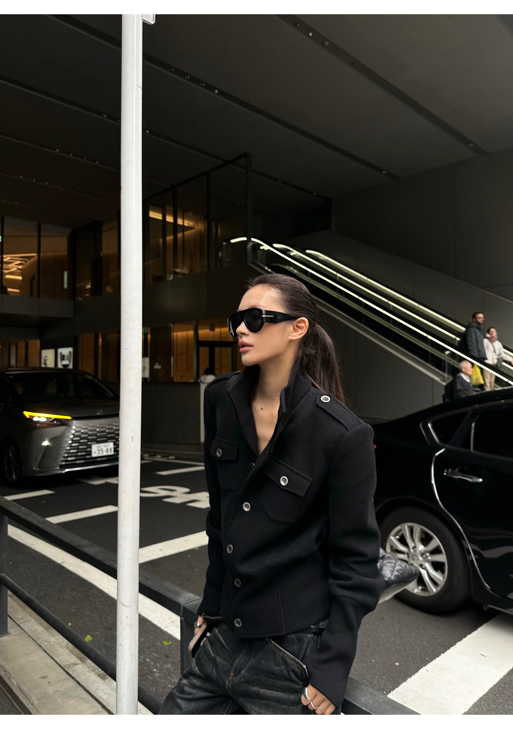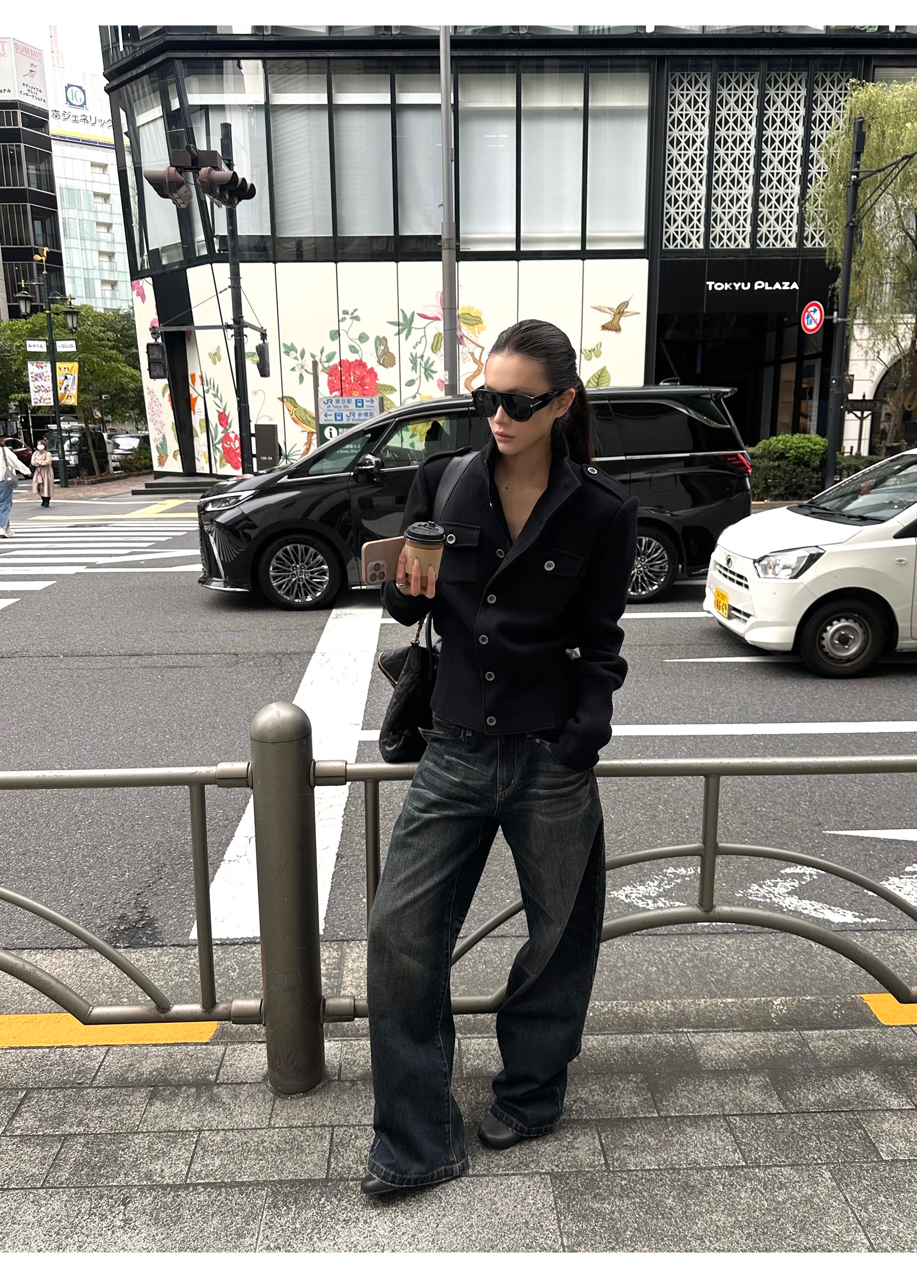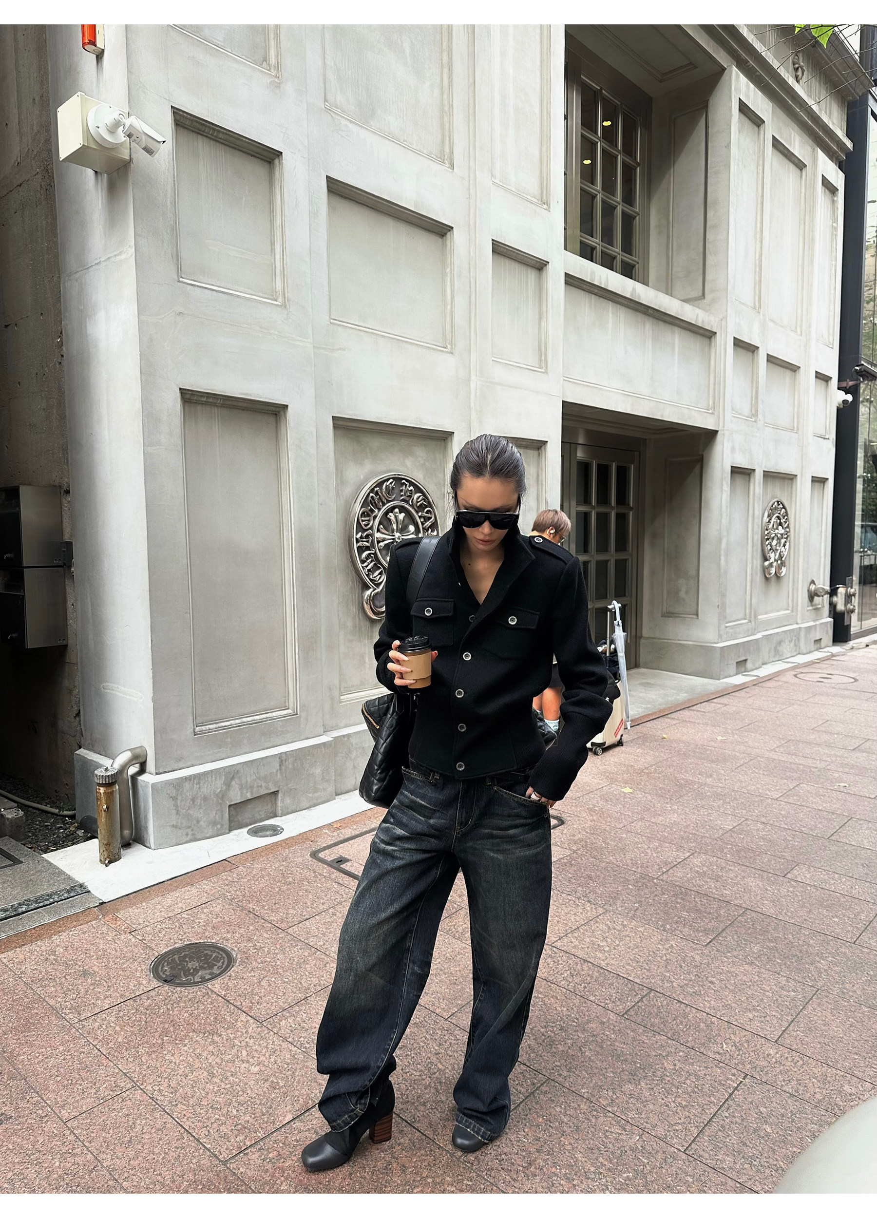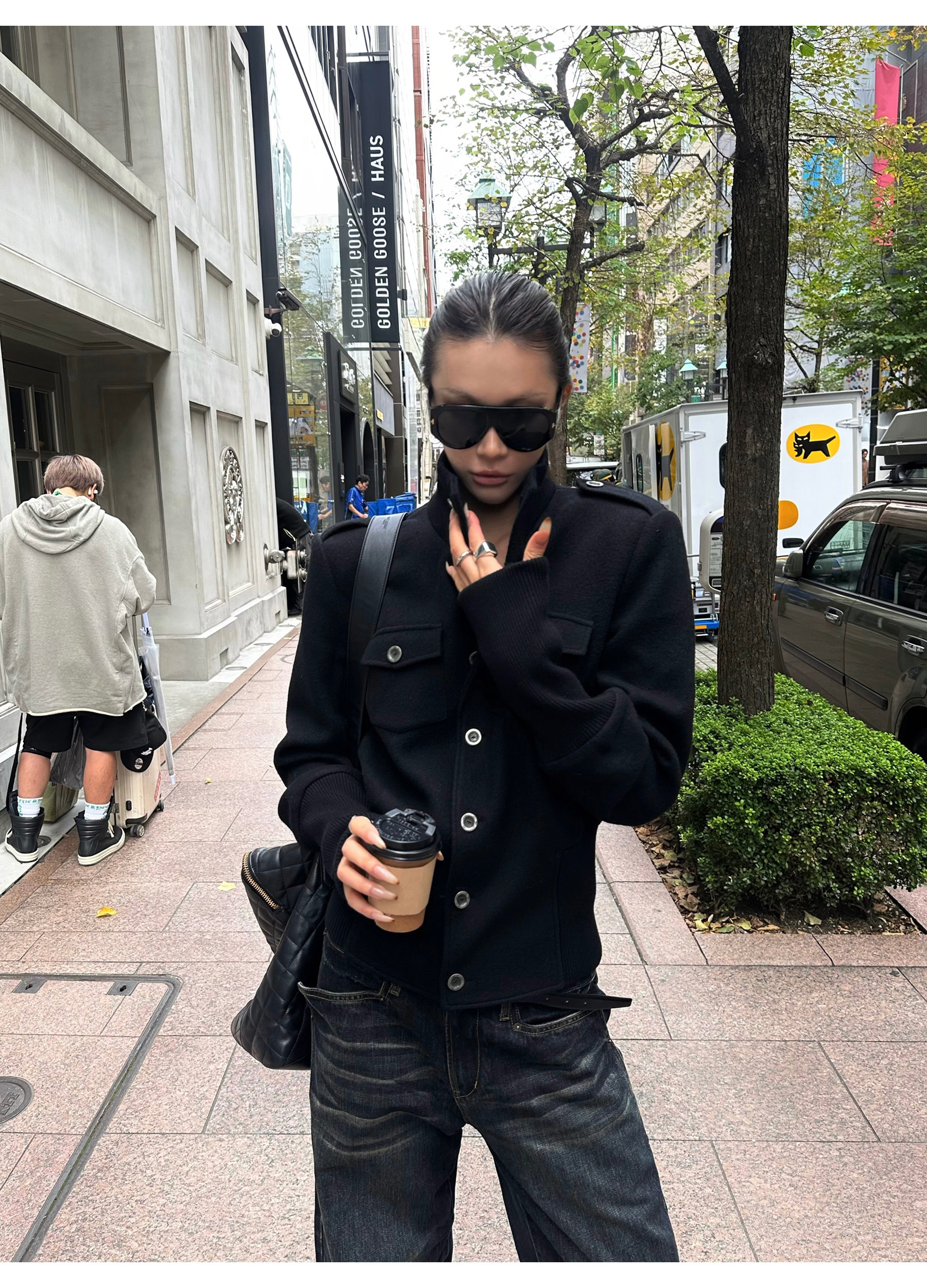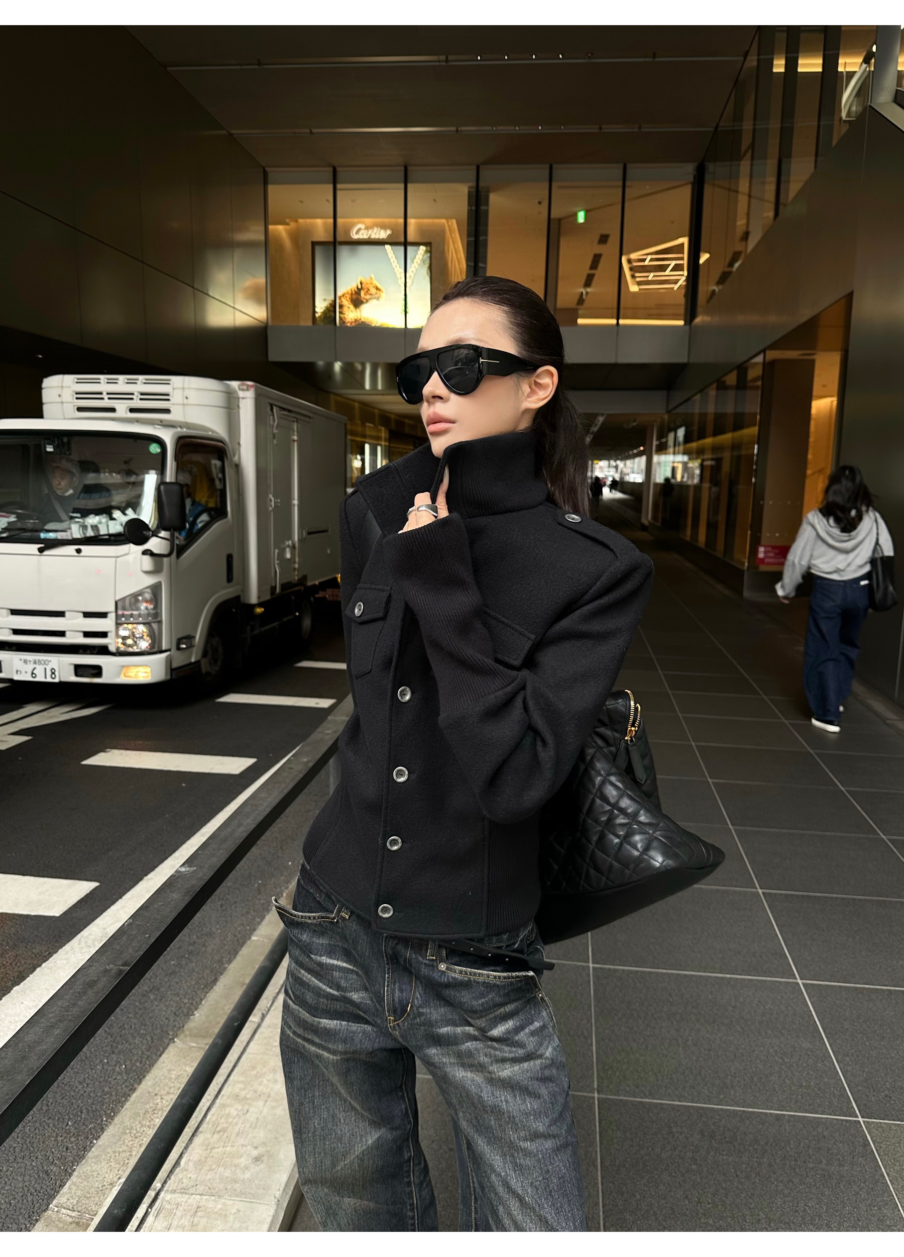 0122Stepll Modern Tokyo Black Woolen Coat for Women Vintage Waist-Cinching Stand Collar Padded Shoulder Woolen Short Jacket