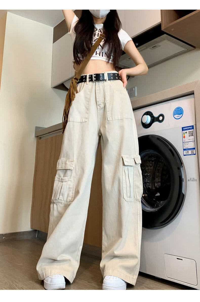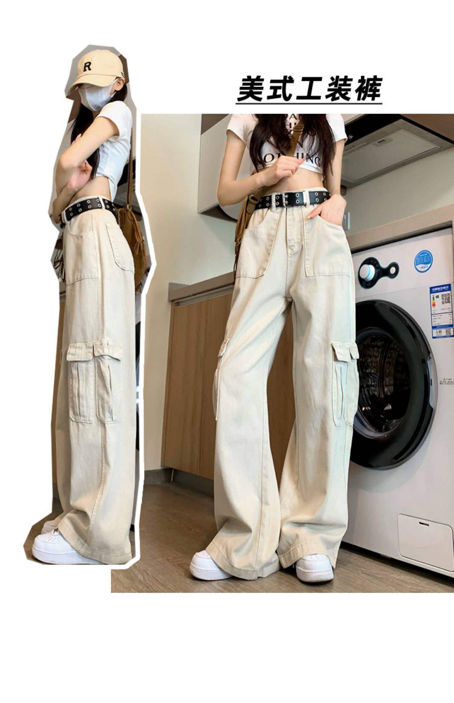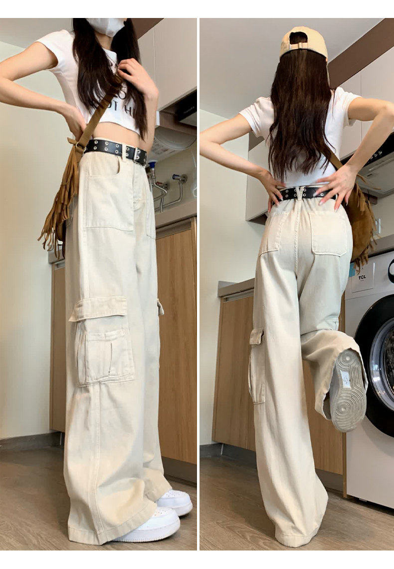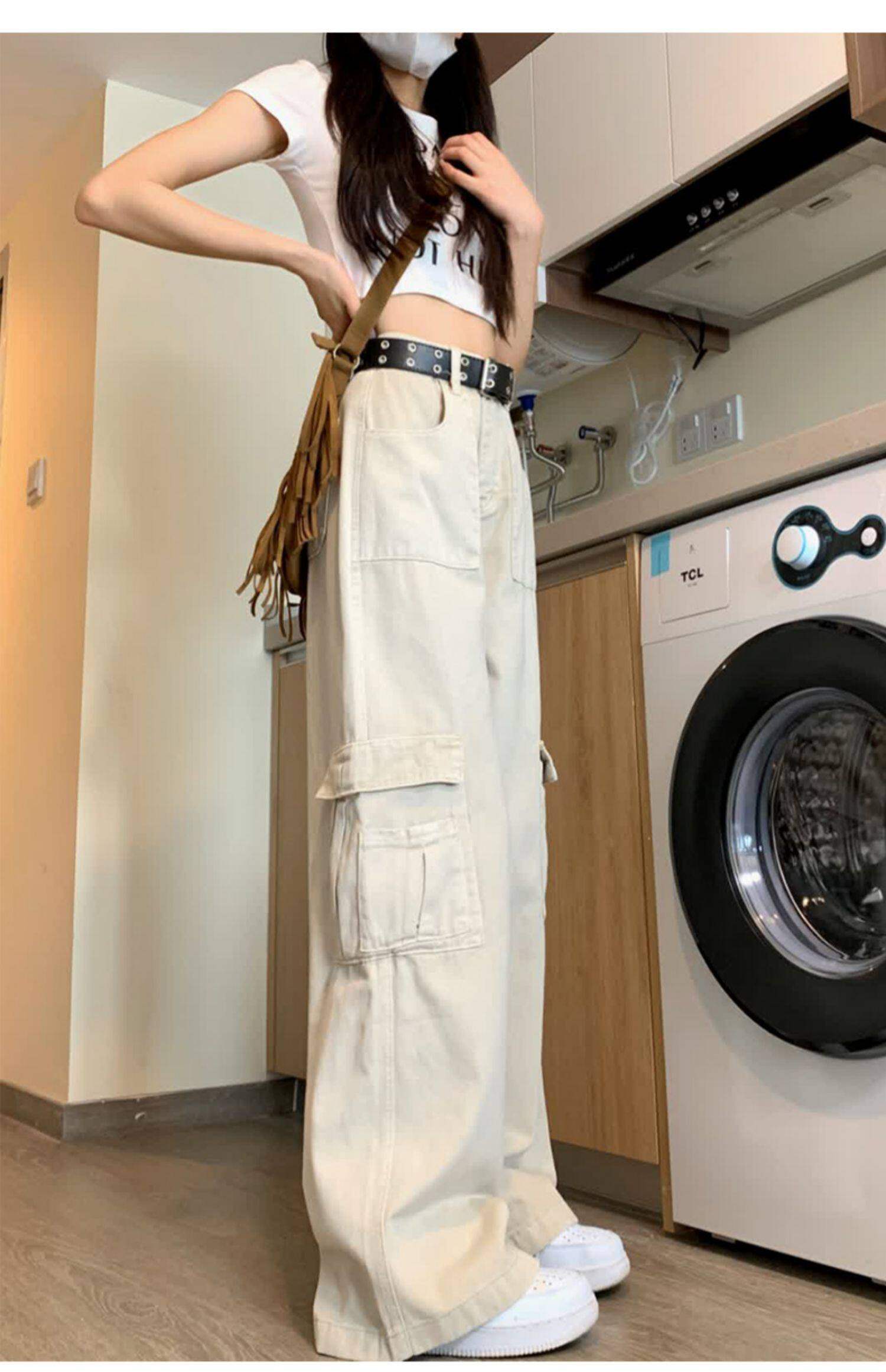 La Chapelle White American-Style Cargo Pants for Women, Cool and Stylish, 2025 New Fleece-Lined Autumn and Winter Wide-Leg Pants for Petite Figures