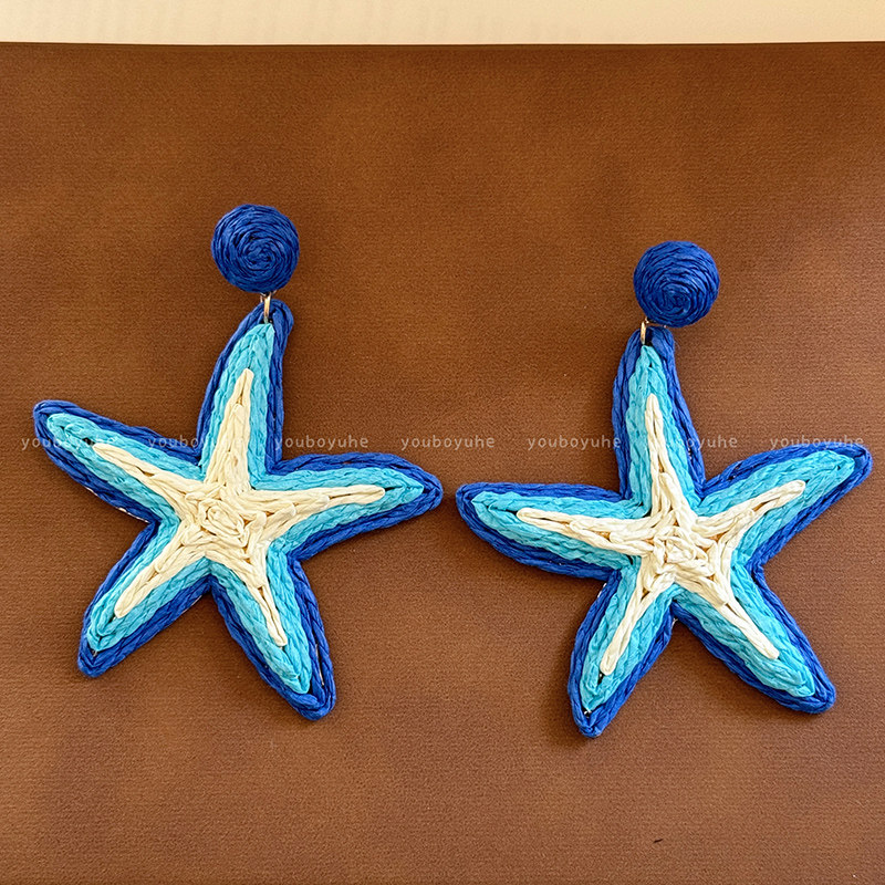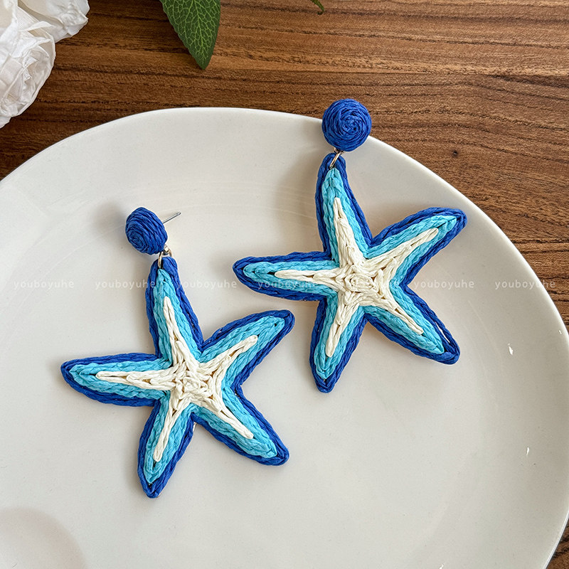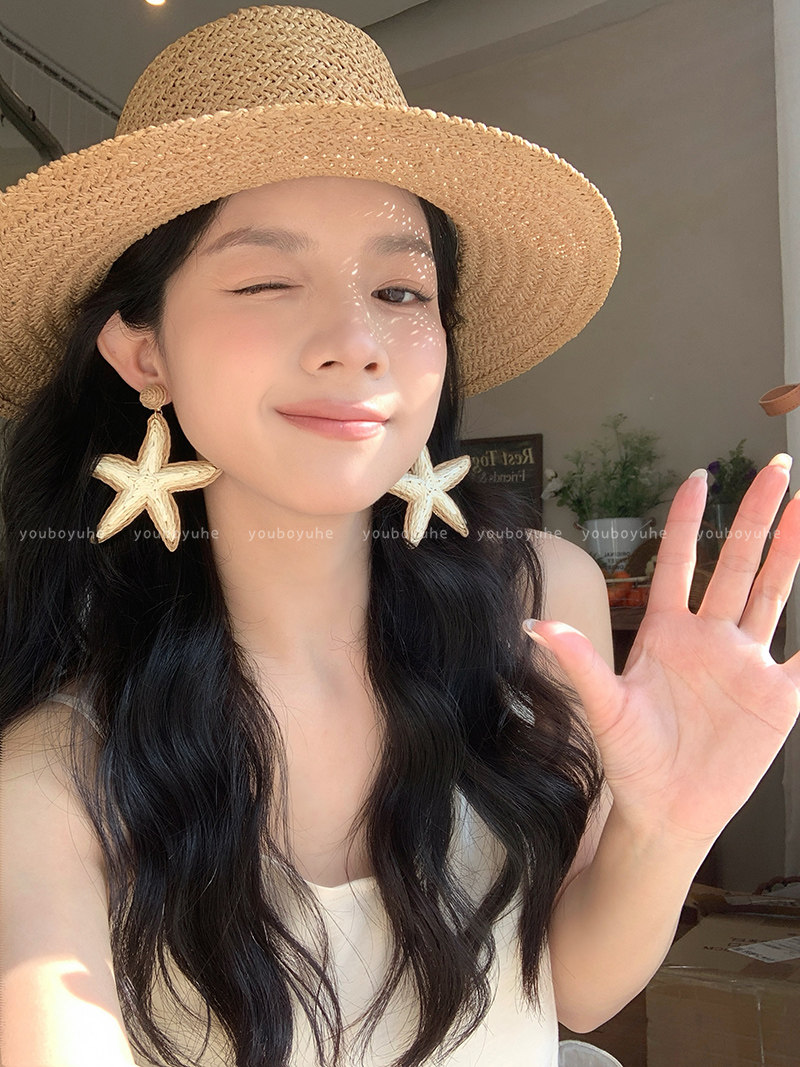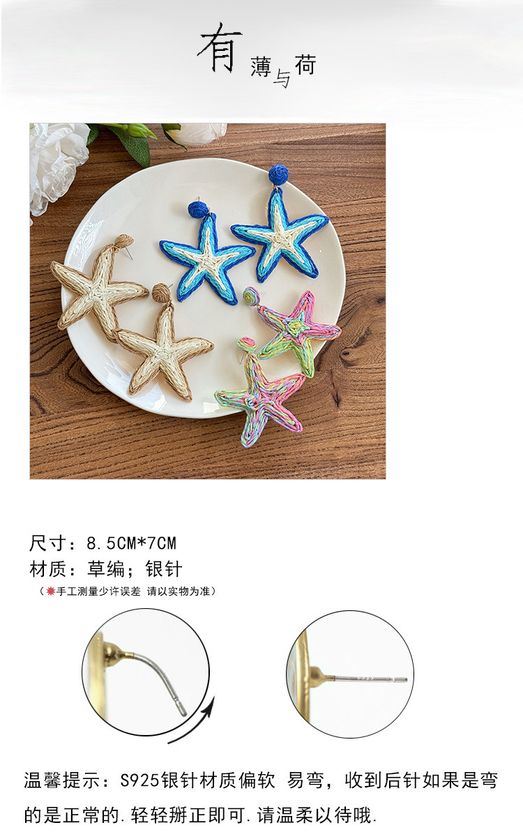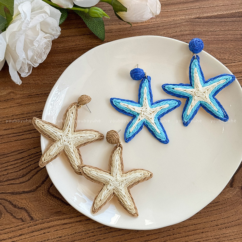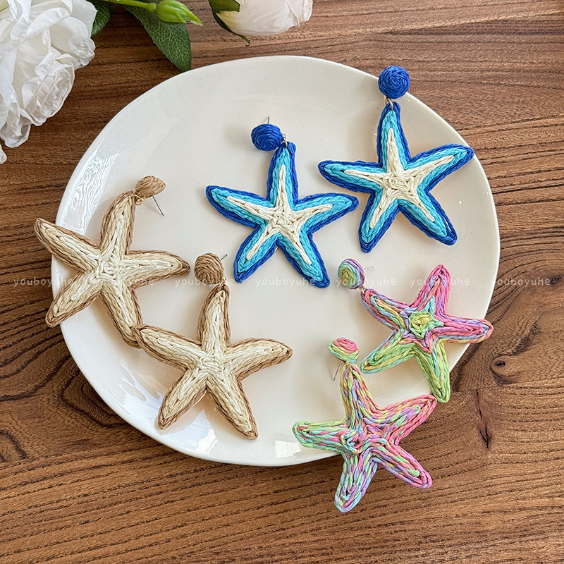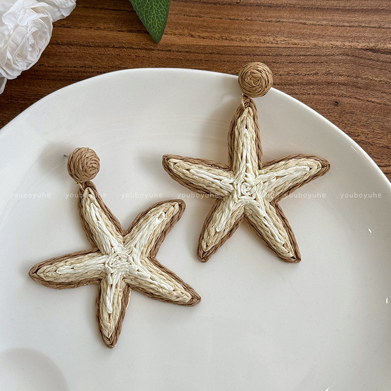 There Are Thin and Lotus-Like~ Exaggerated Straw Starfish Earrings for Women, Seaside Vacation Style Ear Studs, Non-Pierced Ear Clips, Island Earrings