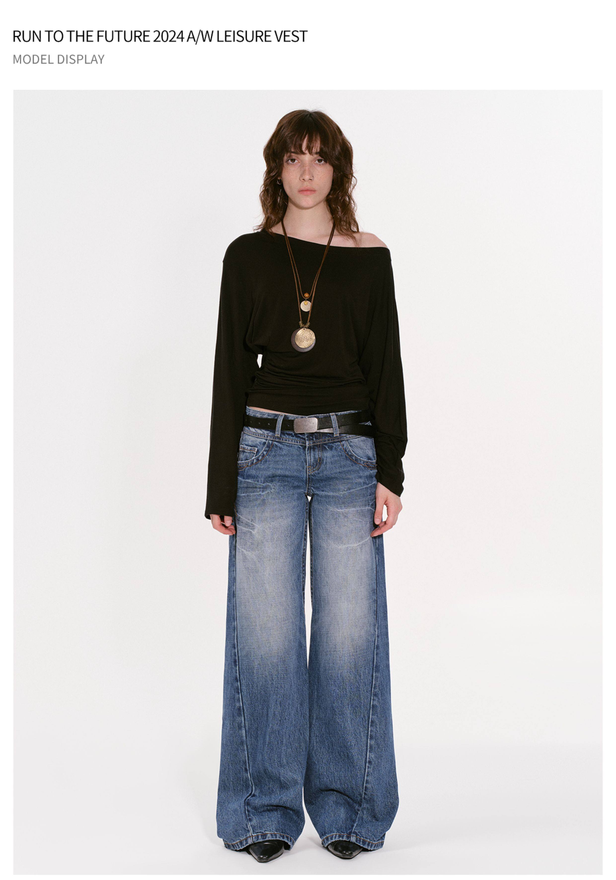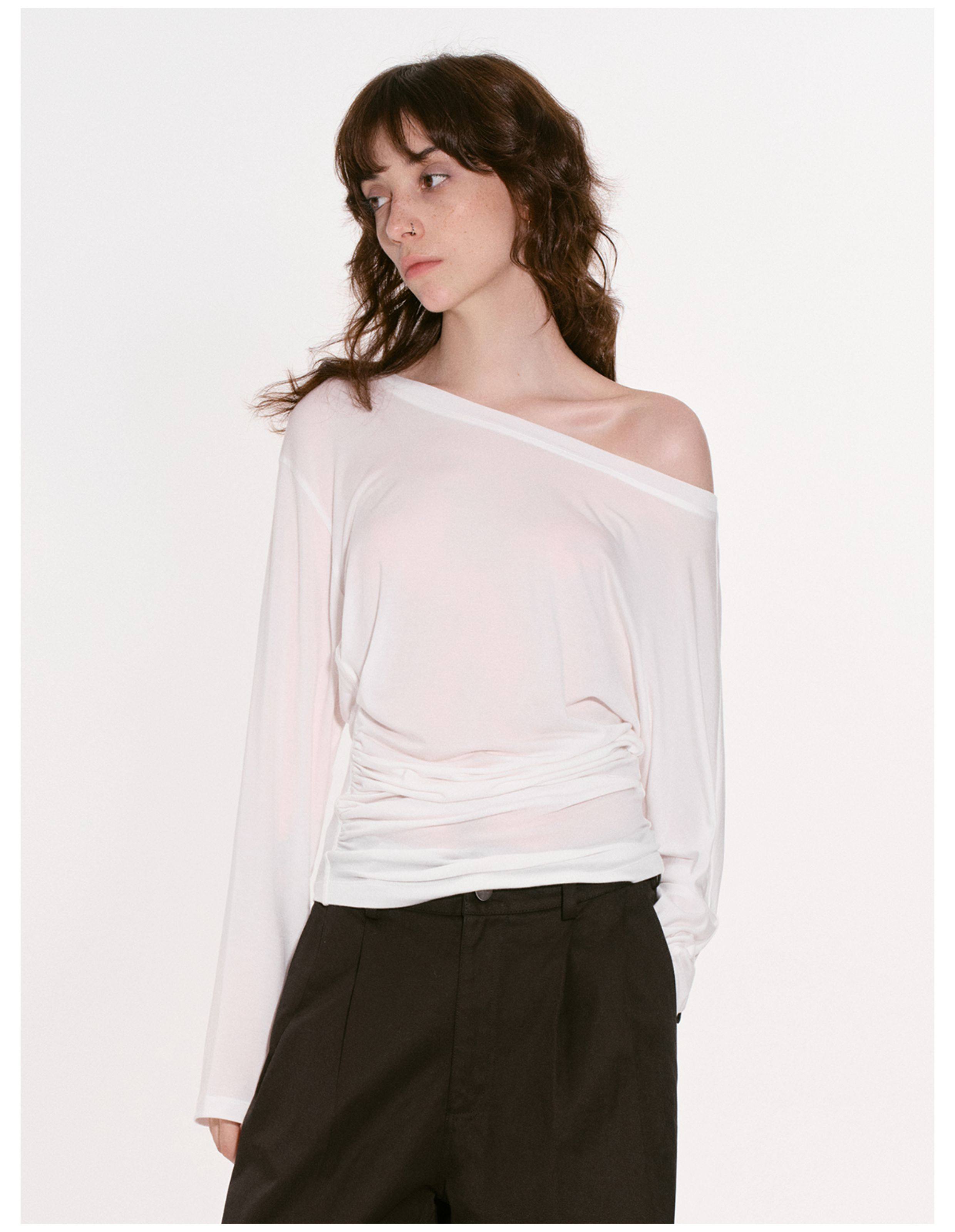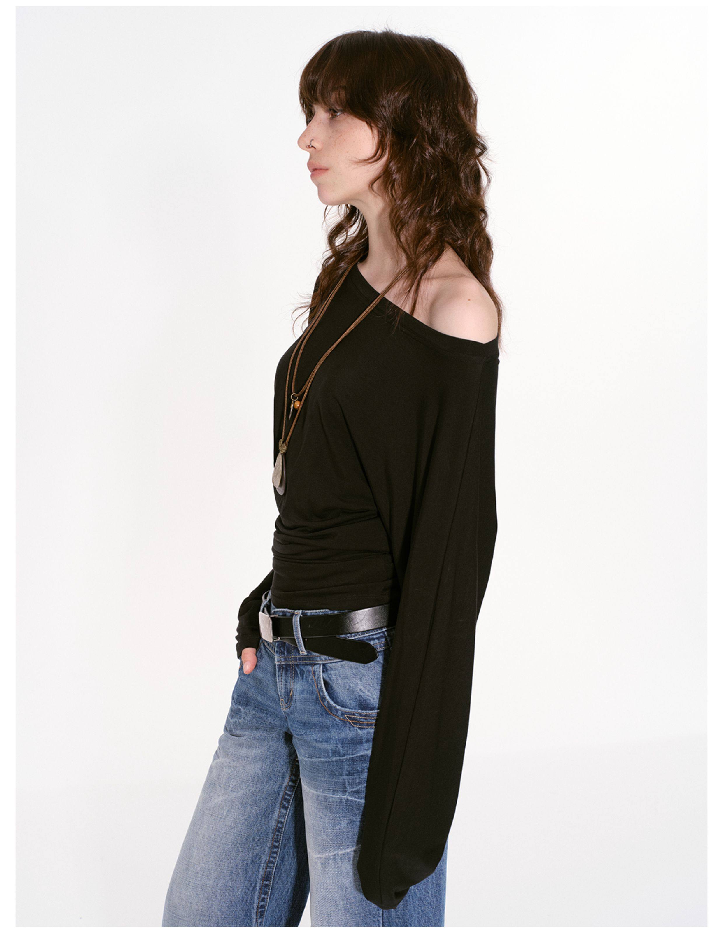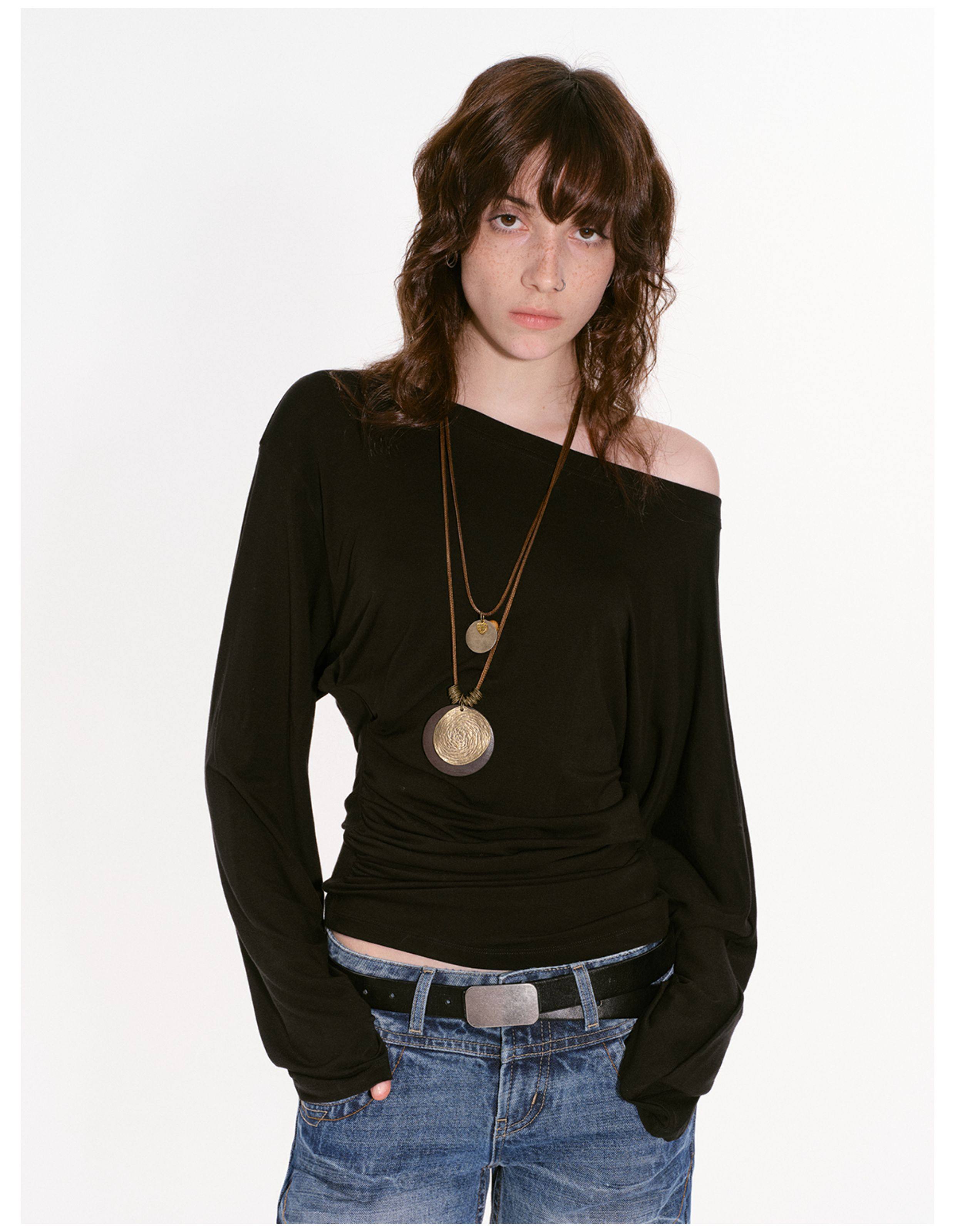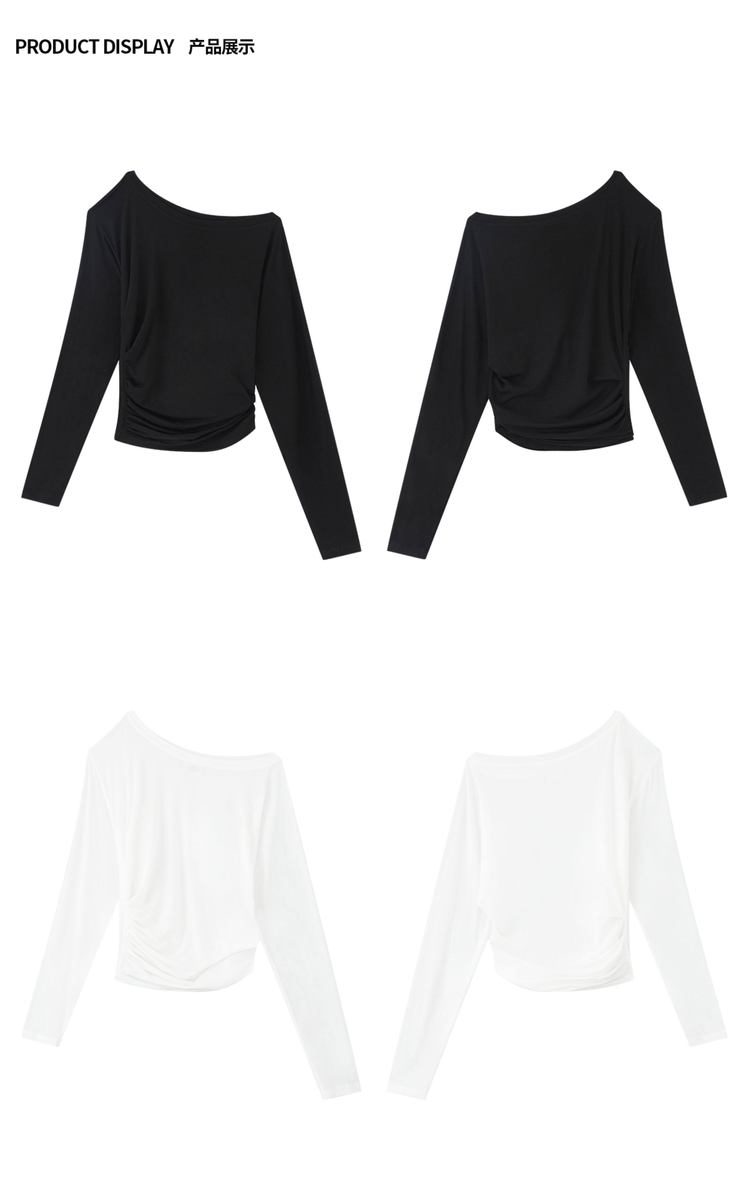 Escape from Chigang West Lyocell Tencel Long-Sleeve T-Shirt for Women with Irregular Pleats and Stacked Effect, Off-Shoulder and Asymmetrical Shoulder Top