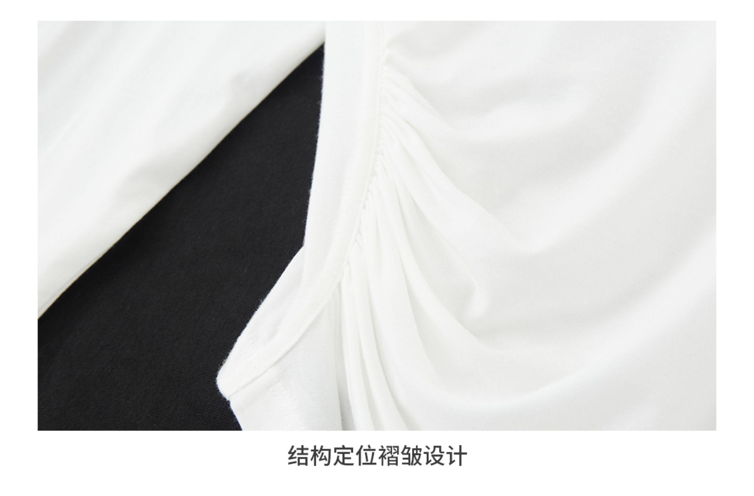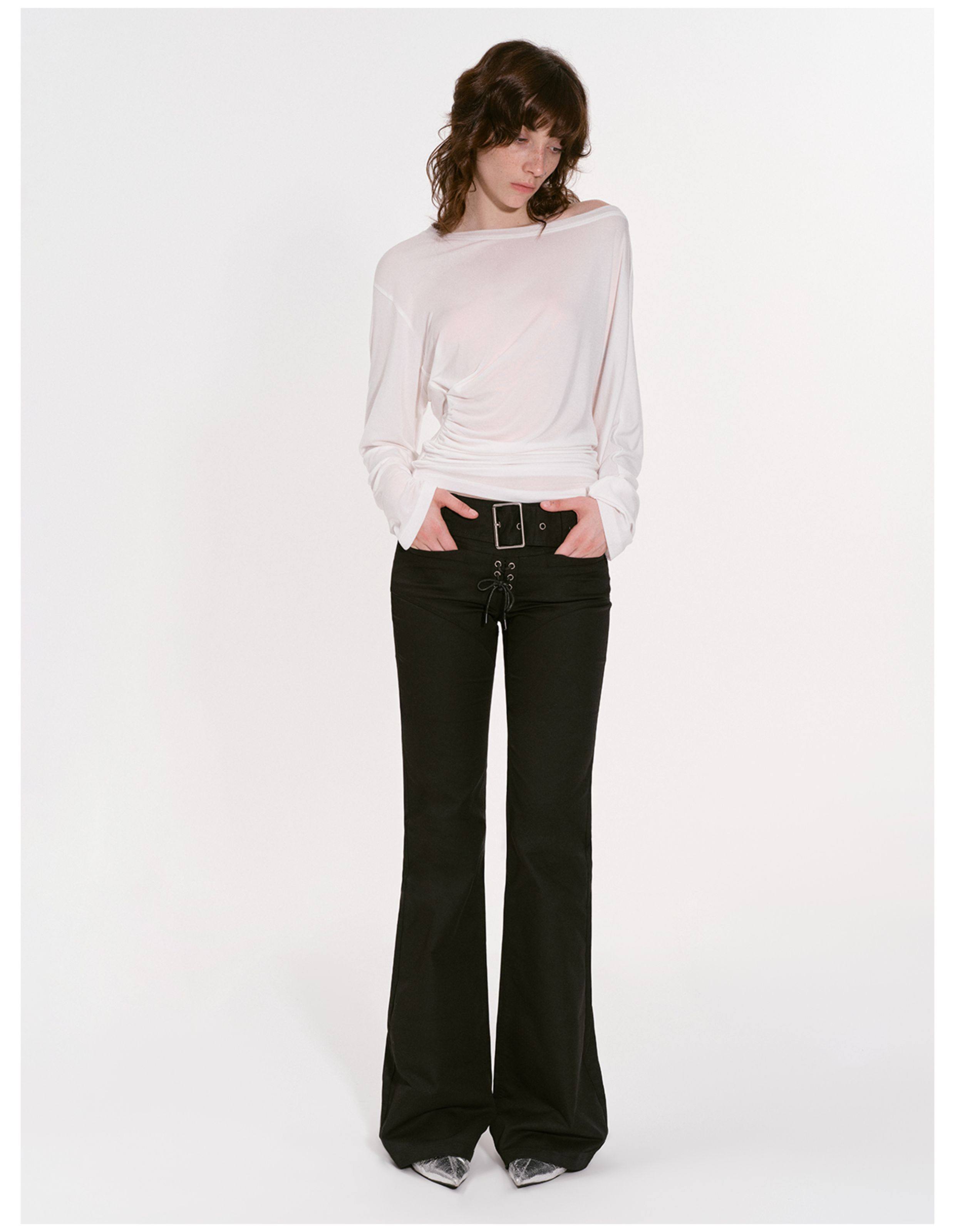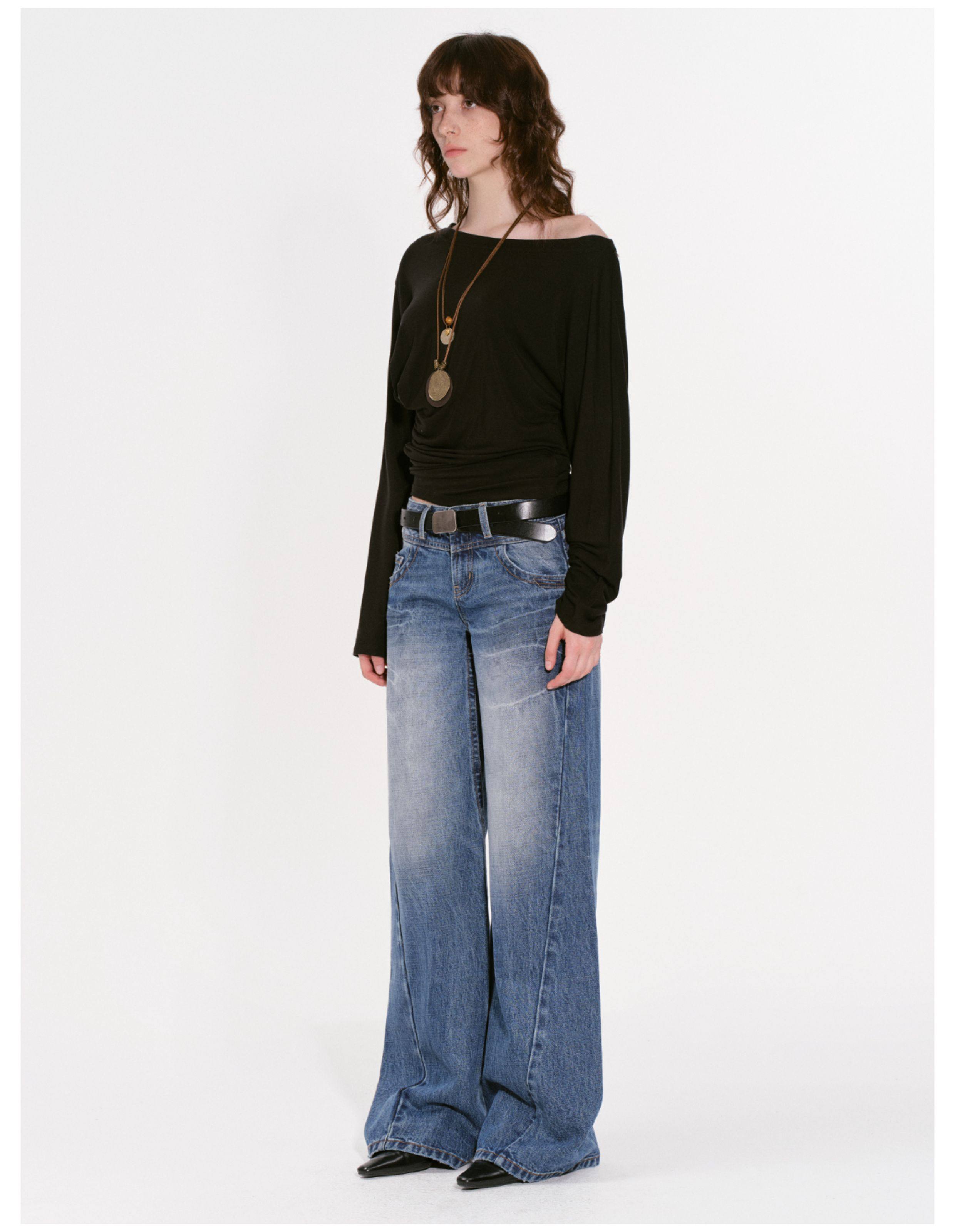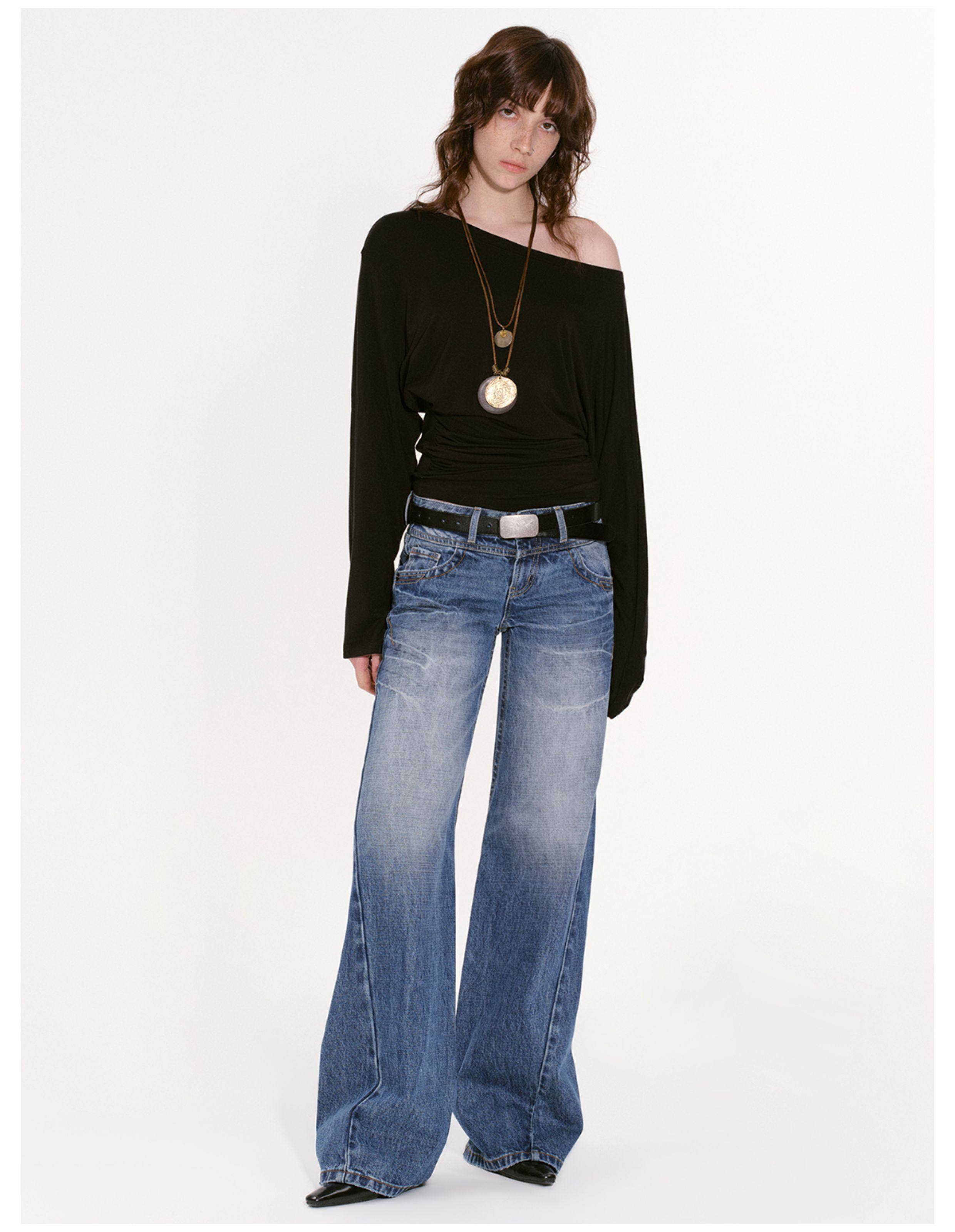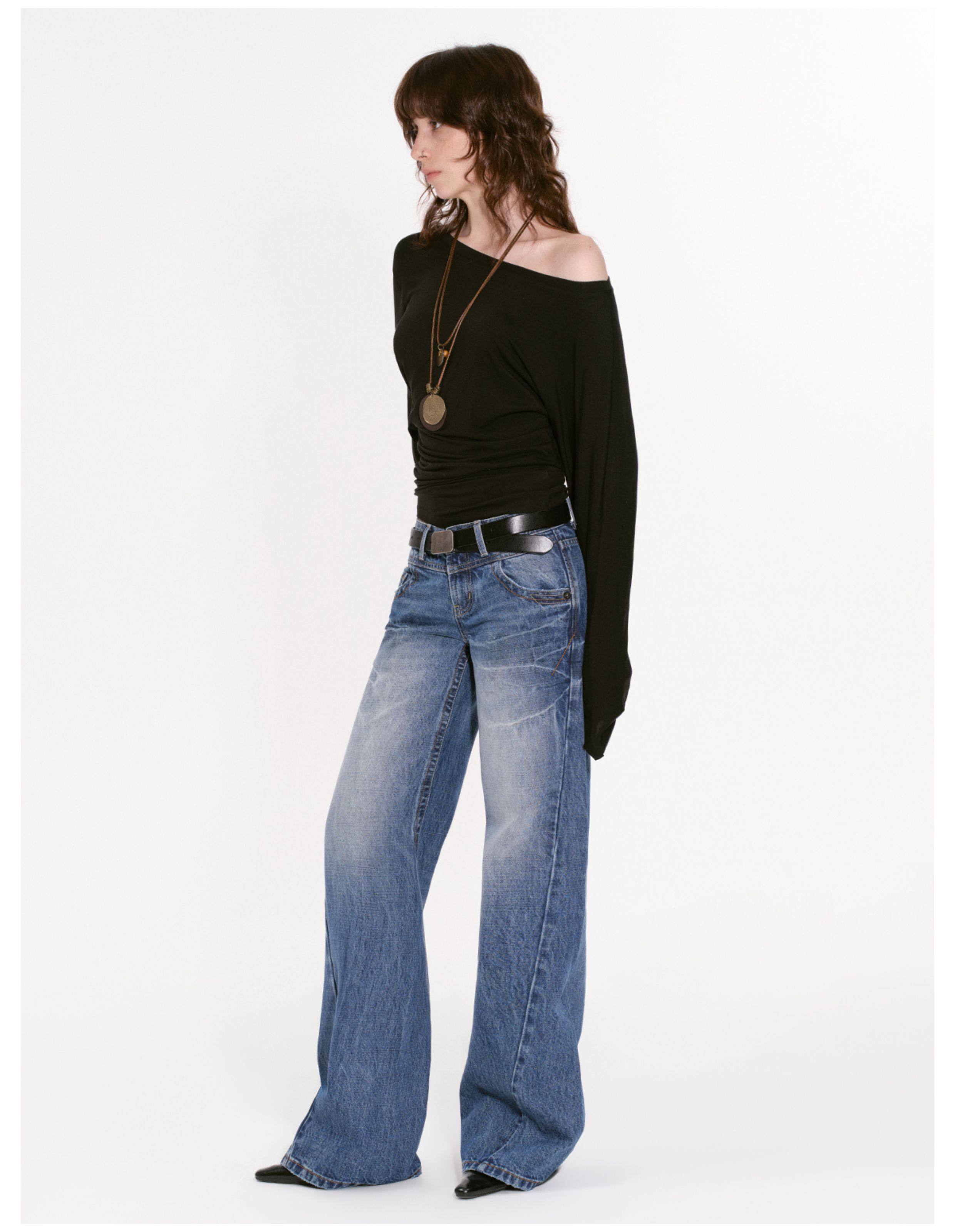 Escape from Chigang West Lyocell Tencel Long-Sleeve T-Shirt for Women with Irregular Pleats and Stacked Effect, Off-Shoulder and Asymmetrical Shoulder Top