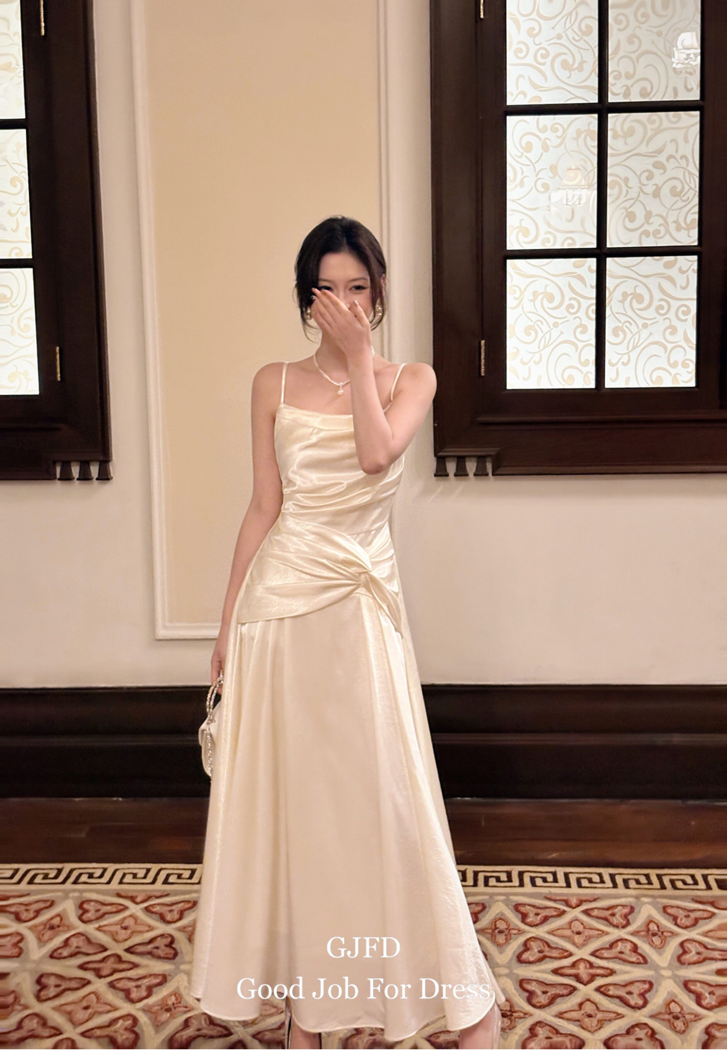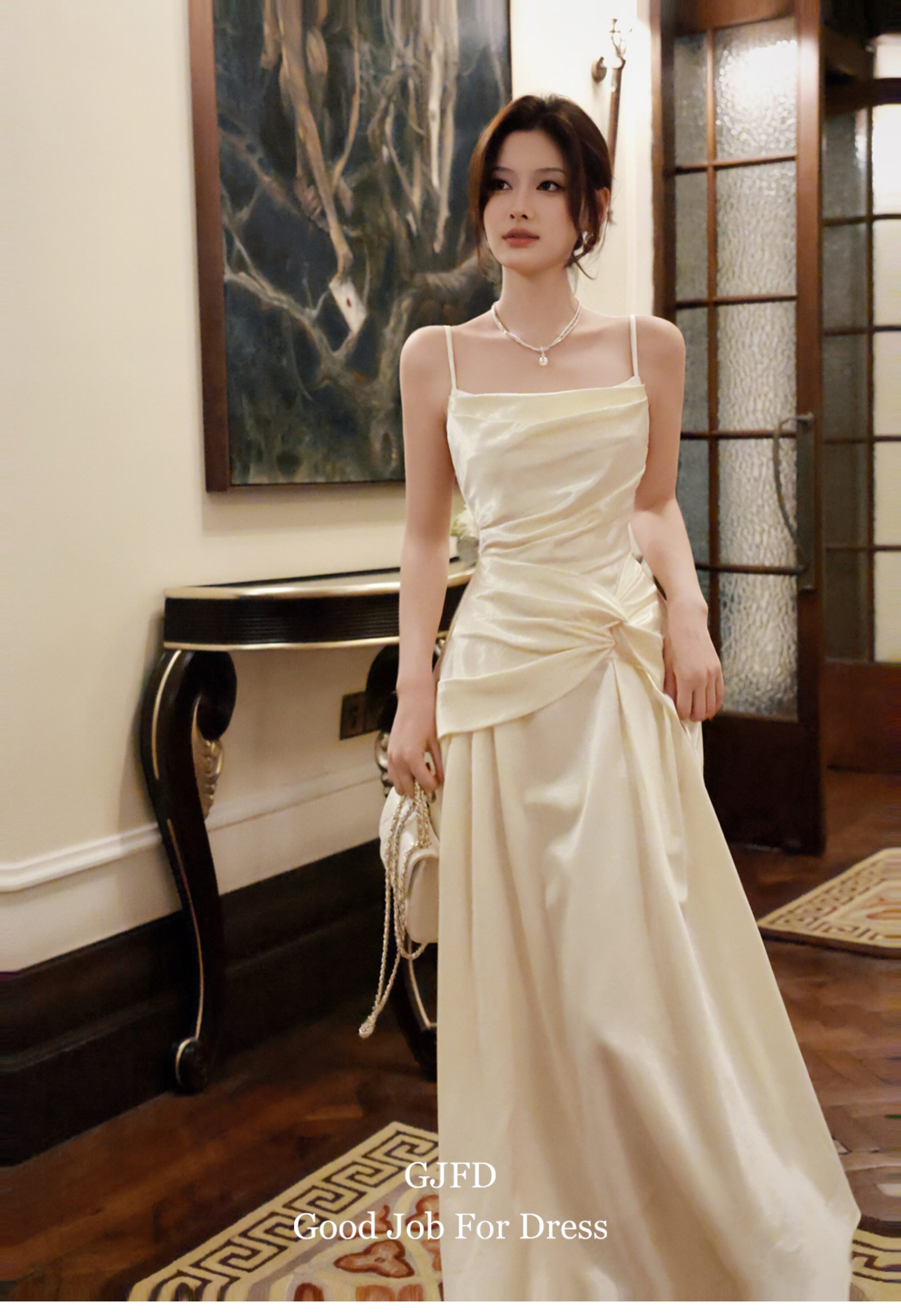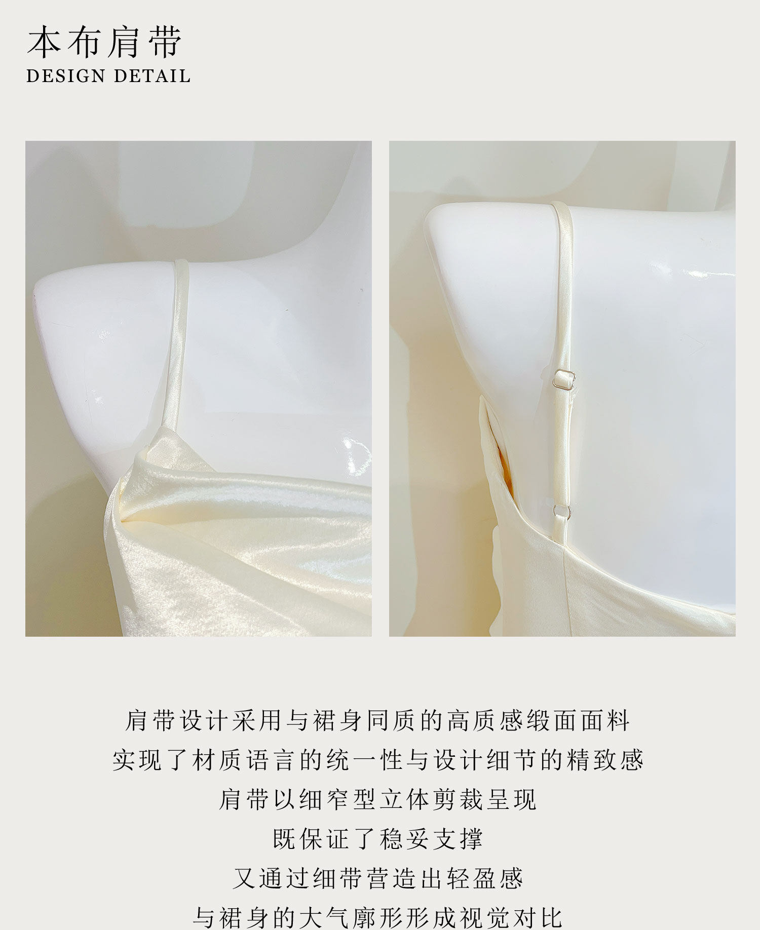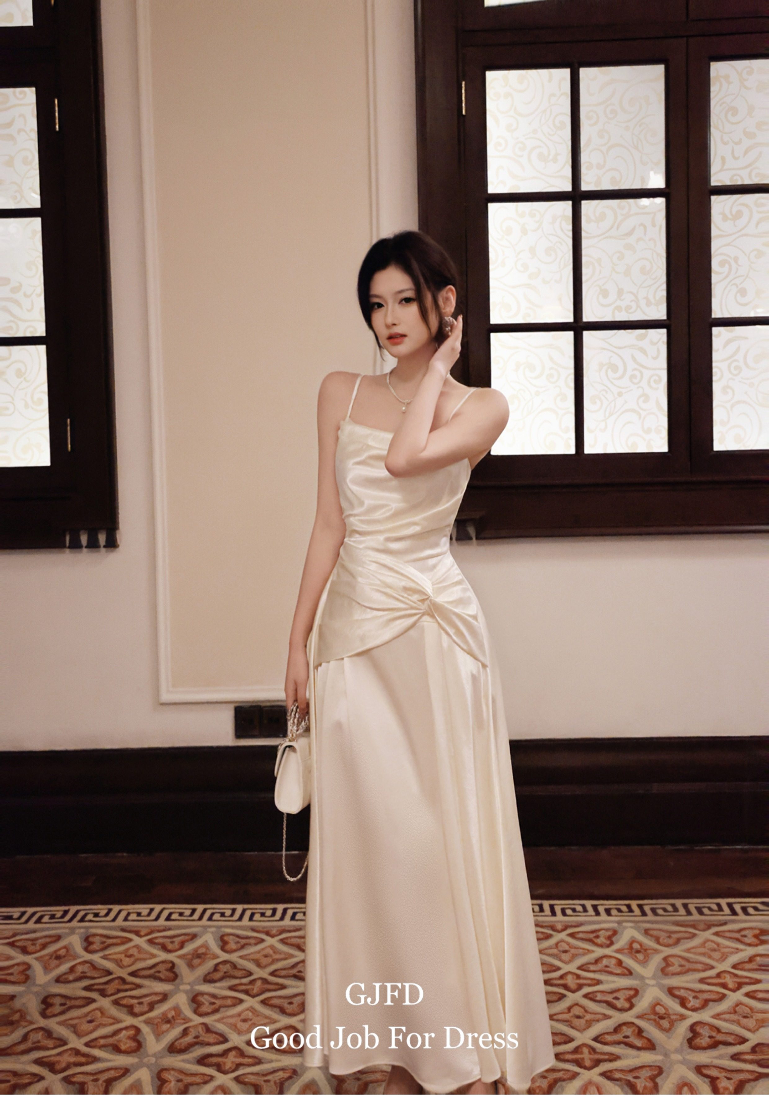 Good Job【Elegant Moran】French Satin White Spaghetti Strap Dress with Pleats and an Irregular Silhouette