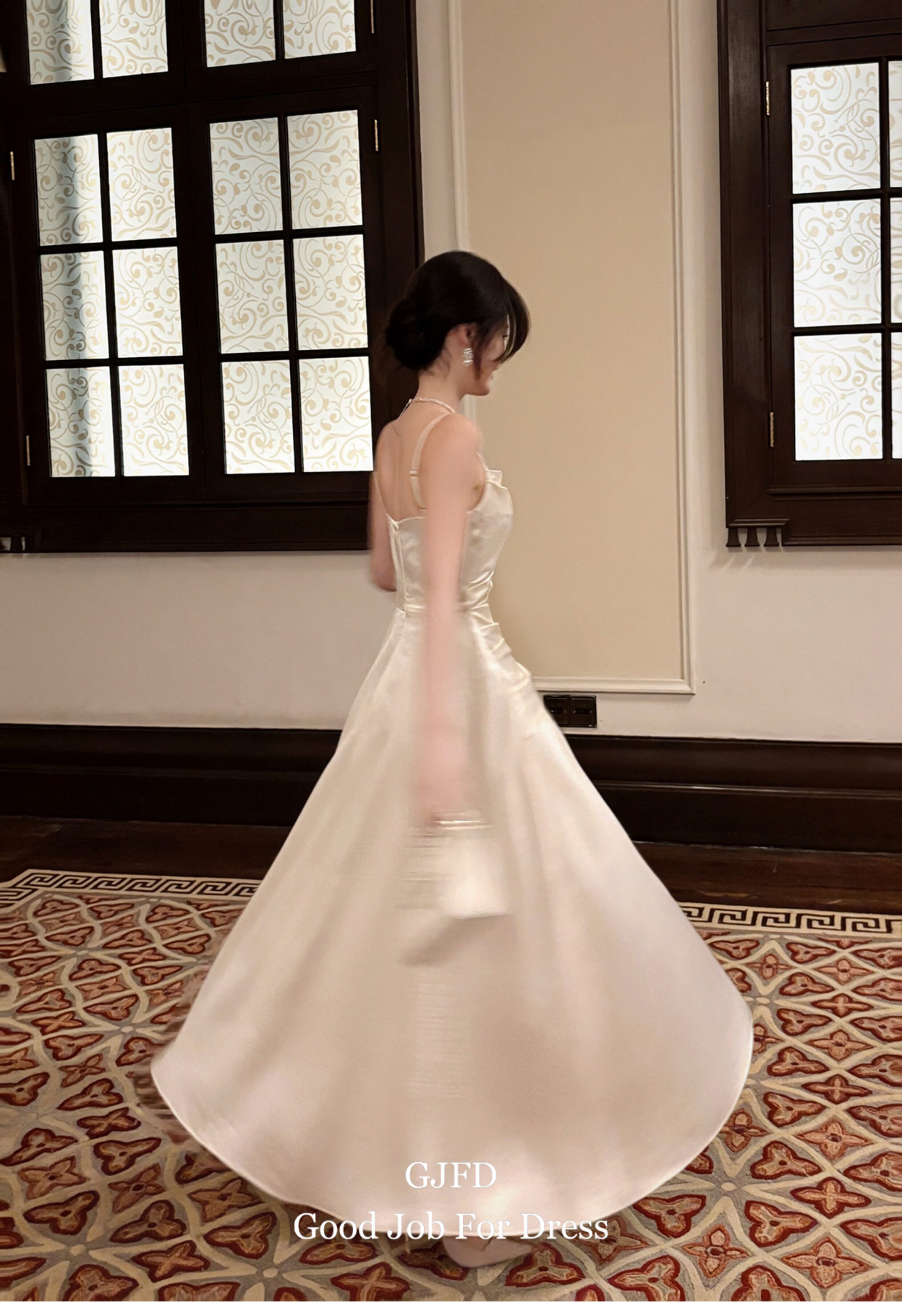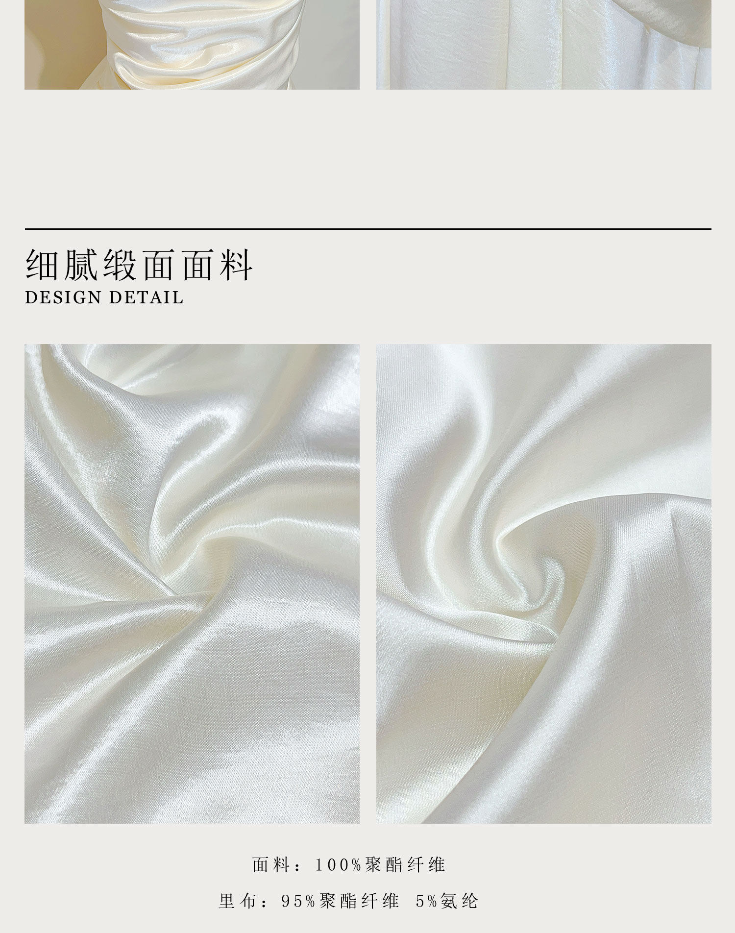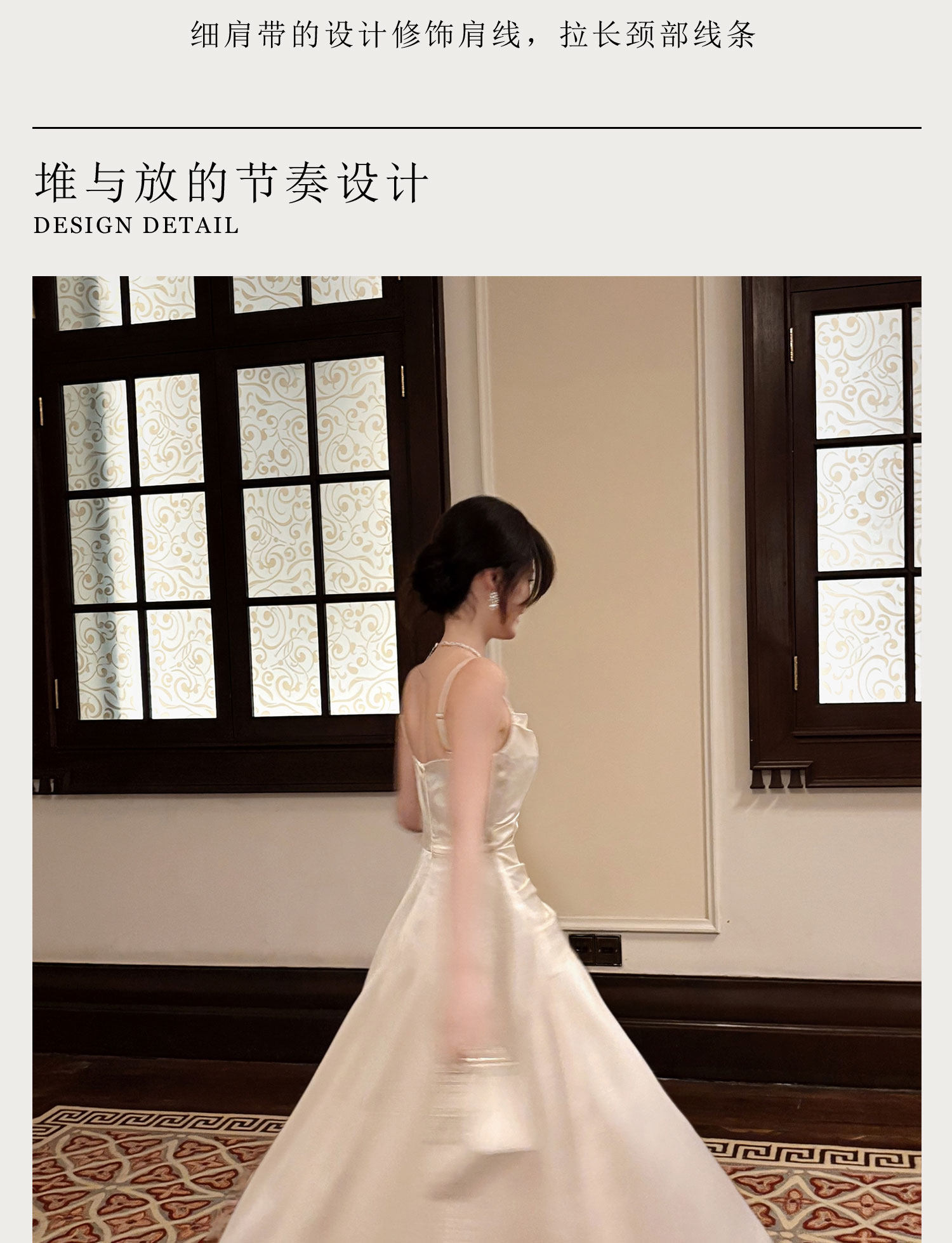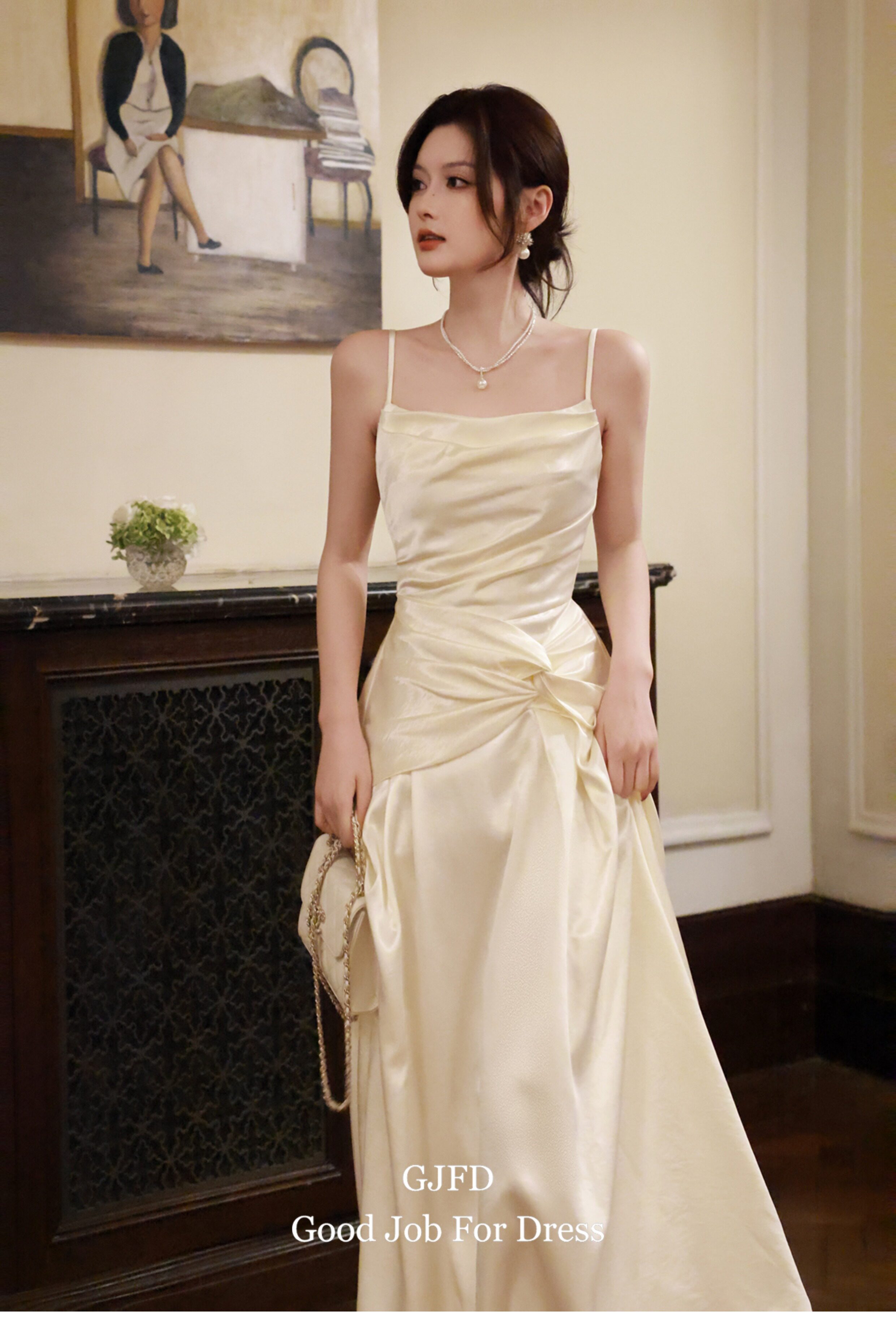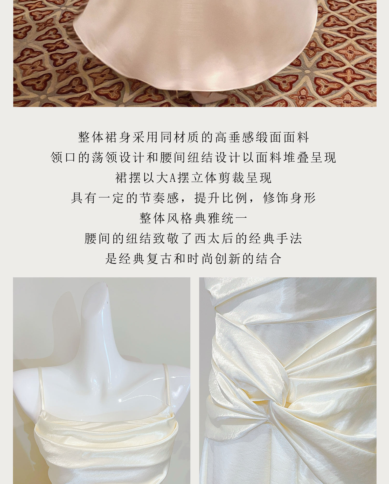 Good Job【Elegant Moran】French Satin White Spaghetti Strap Dress with Pleats and an Irregular Silhouette
