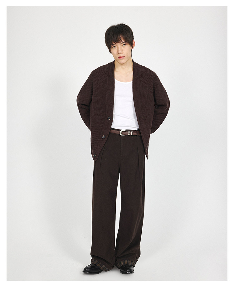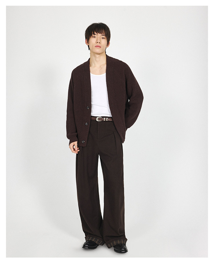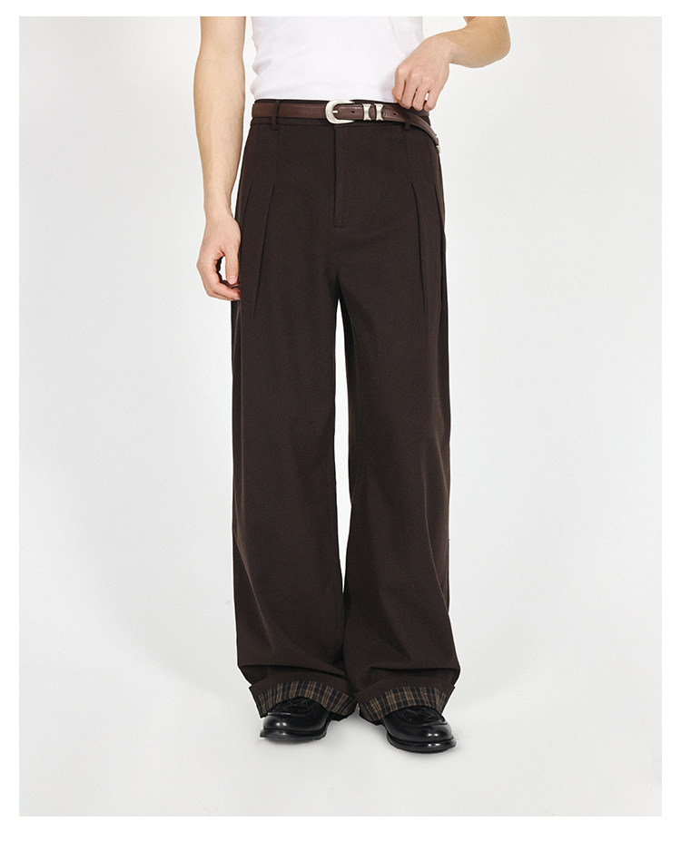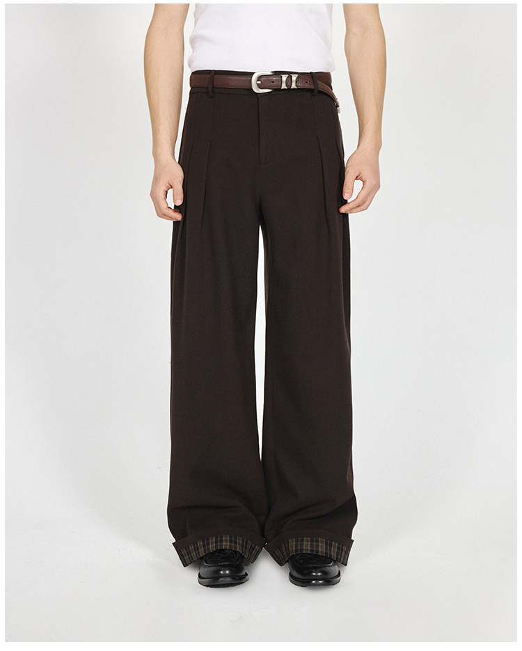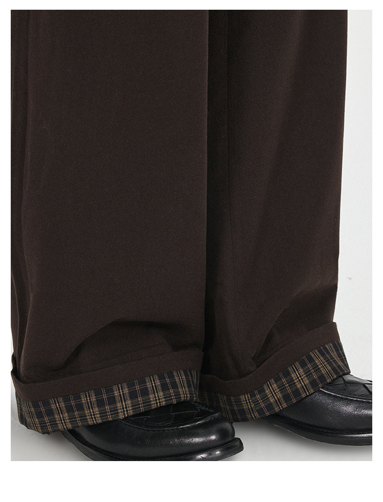 Stay the Night Woolen Plaid Trousers with Foldable Cuffs and A-Line Slightly Flared Trousers