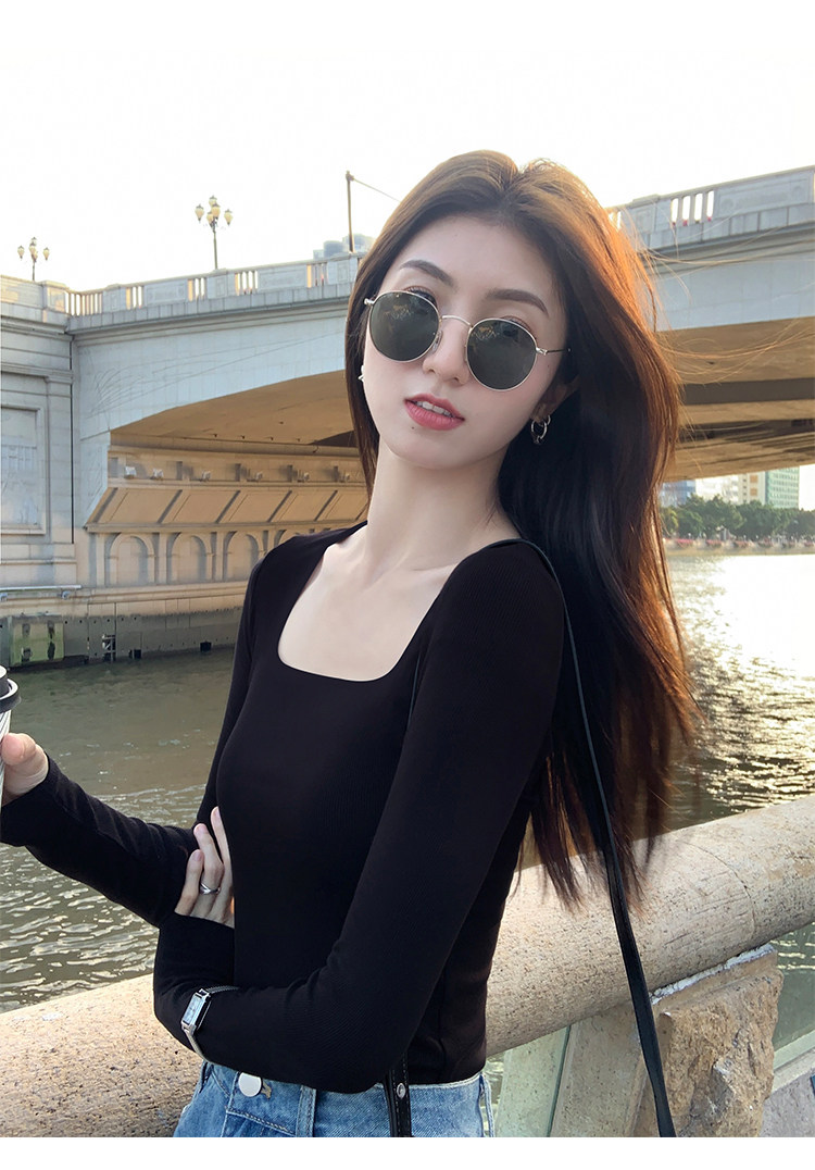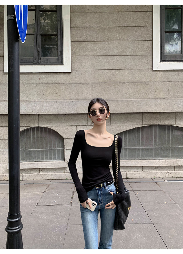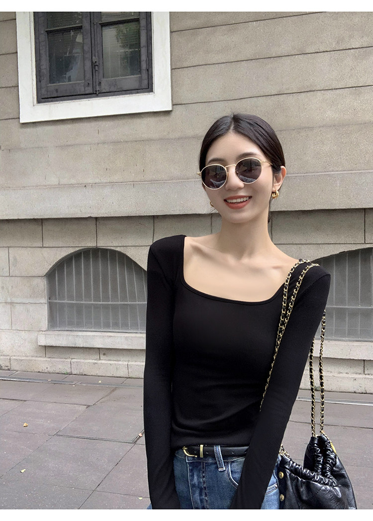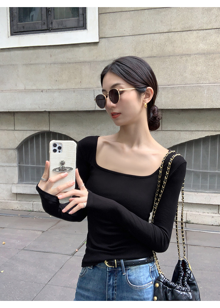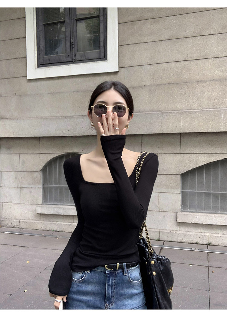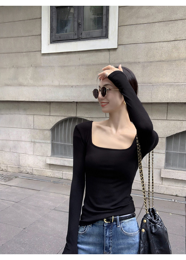 Mulvan Black Square-Neck Long-Sleeve Knit T-Shirt for Women, Autumn and Winter Slim Fit, Slimming, Inner Wear, Collarbone-Exposing Base Shirt Top